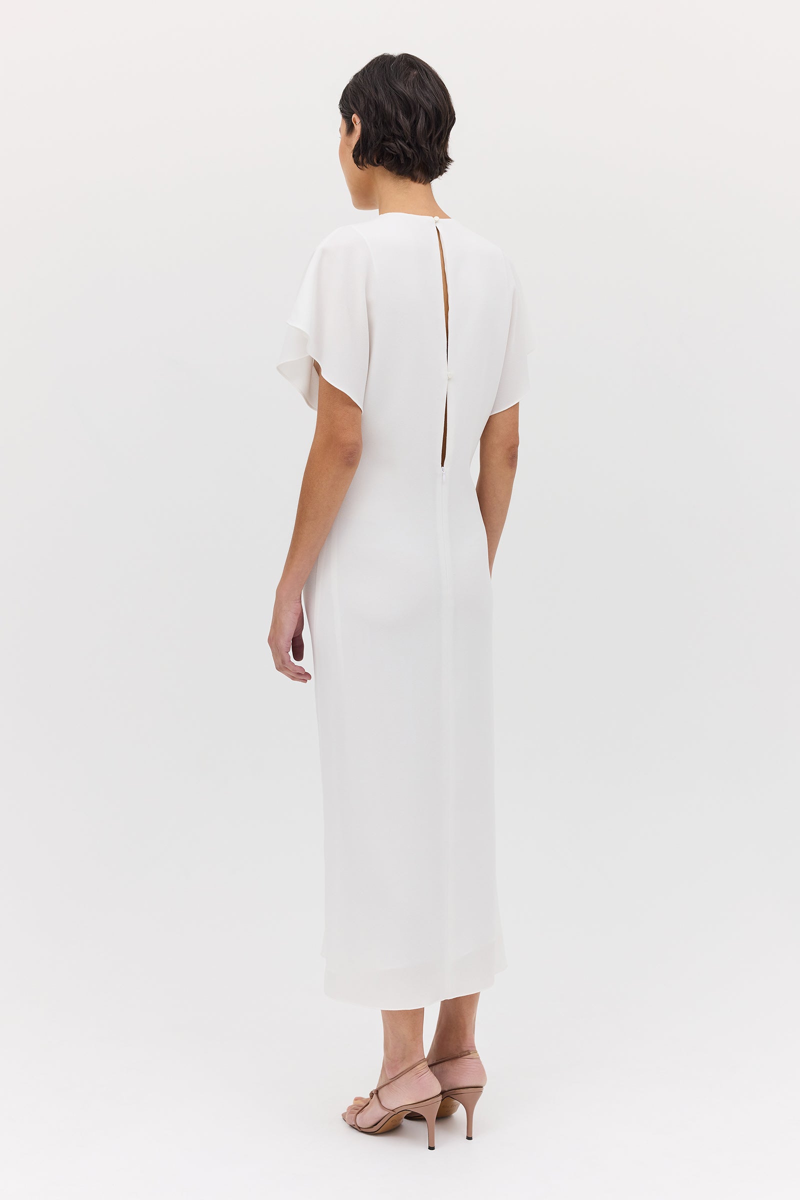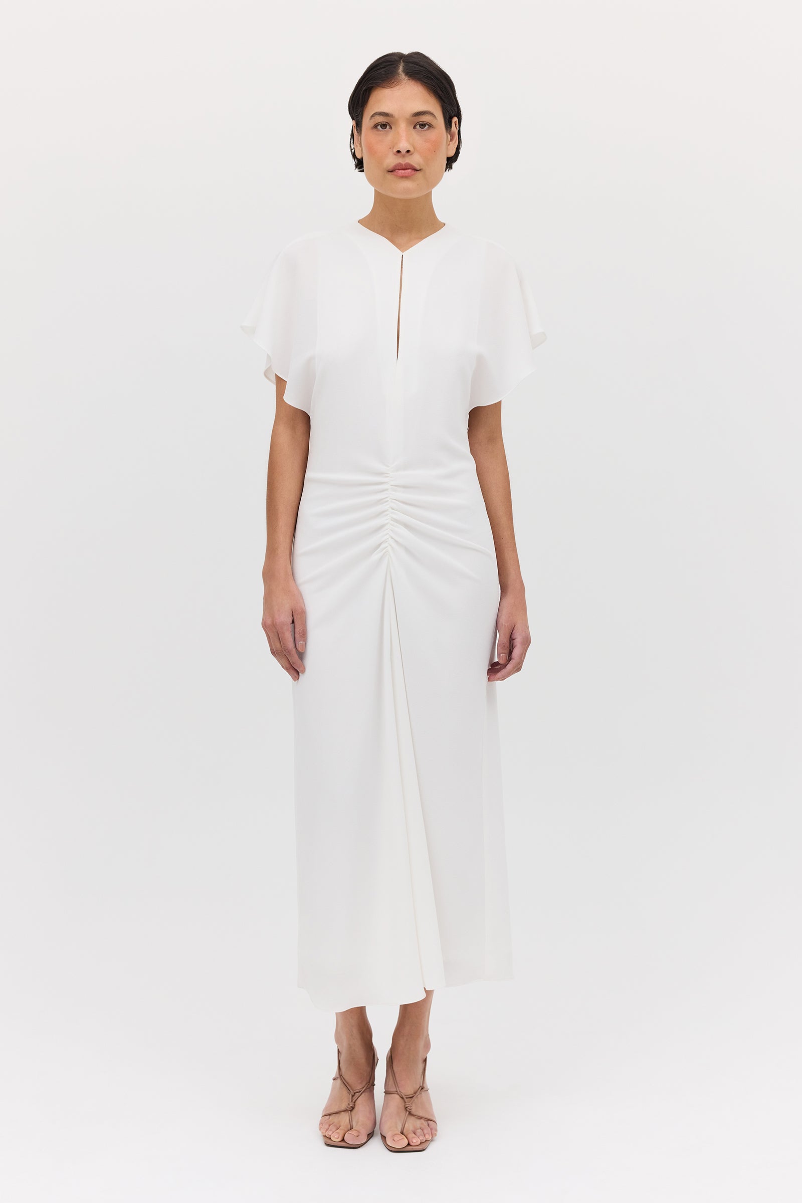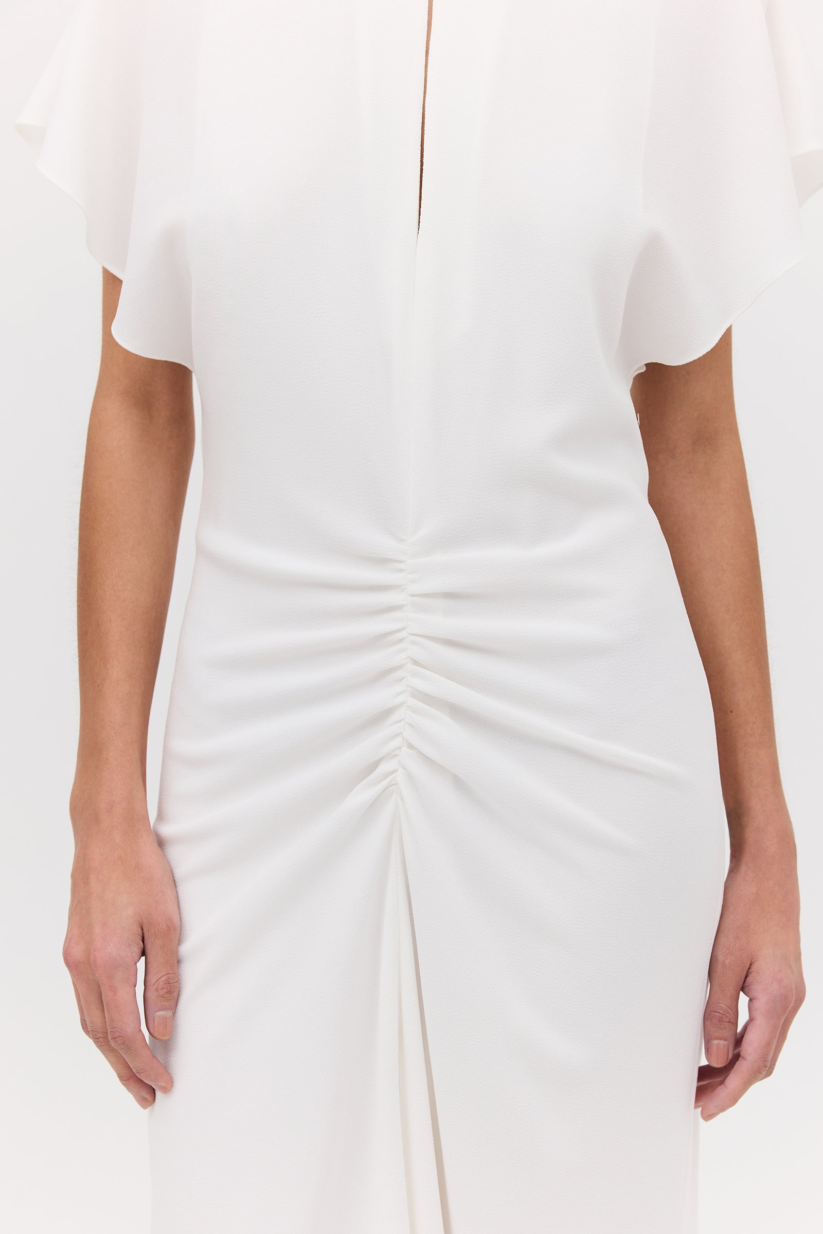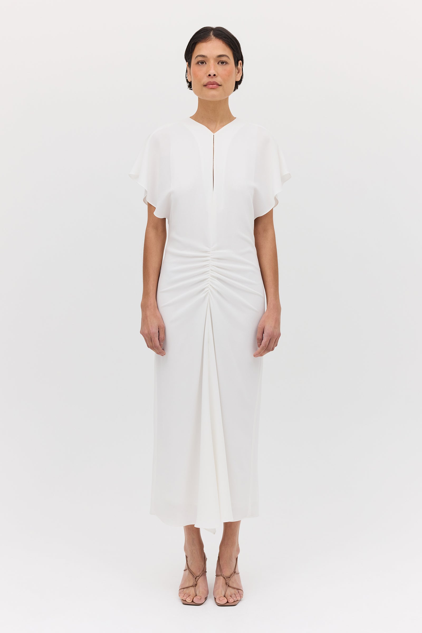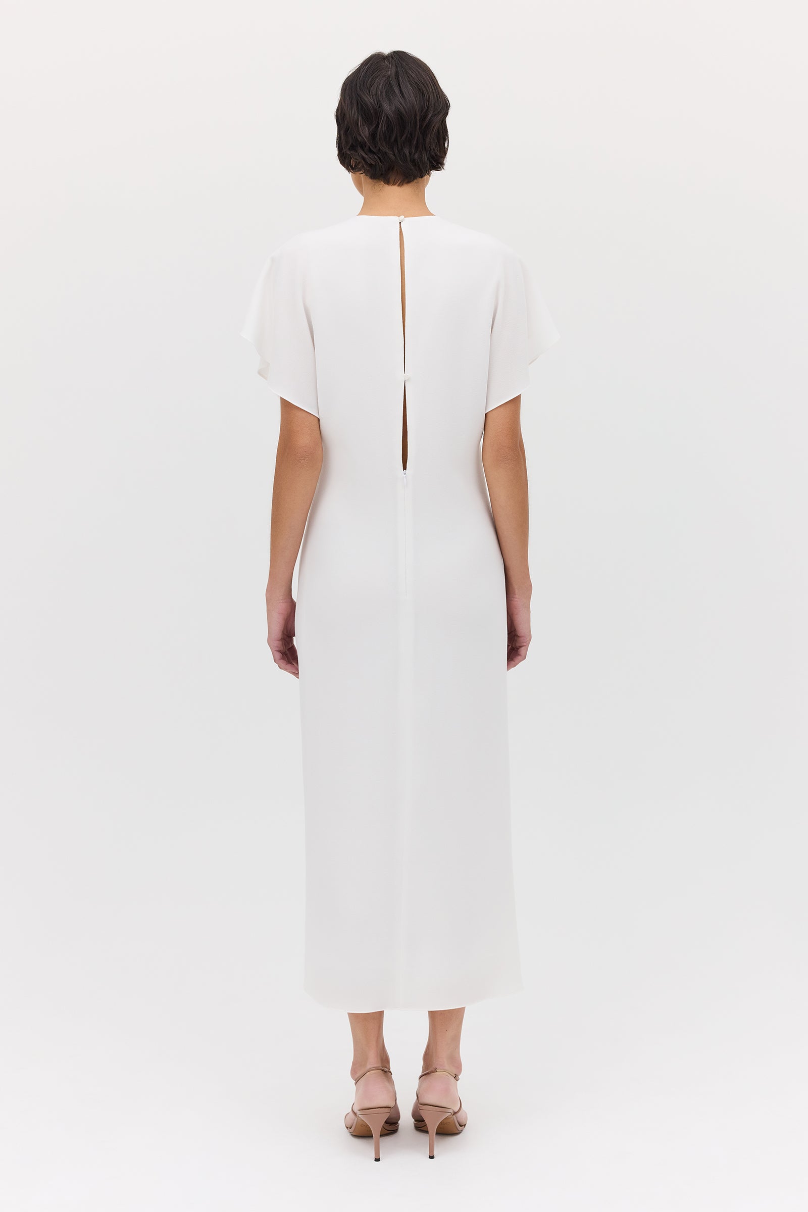 Introducing the Ivory Textured Yayoi Dress. Taking inspiration from design elements of some of our most-loved dresses and combining into one. The Yayoi Dress features a draped flutter sleeve similar to that of our Illusionist Dress, and a gathered, making it a chic and versatile addition to your wardrobe. Expertly hand-draped and fitted, with a focus on highlighting the form of the body.