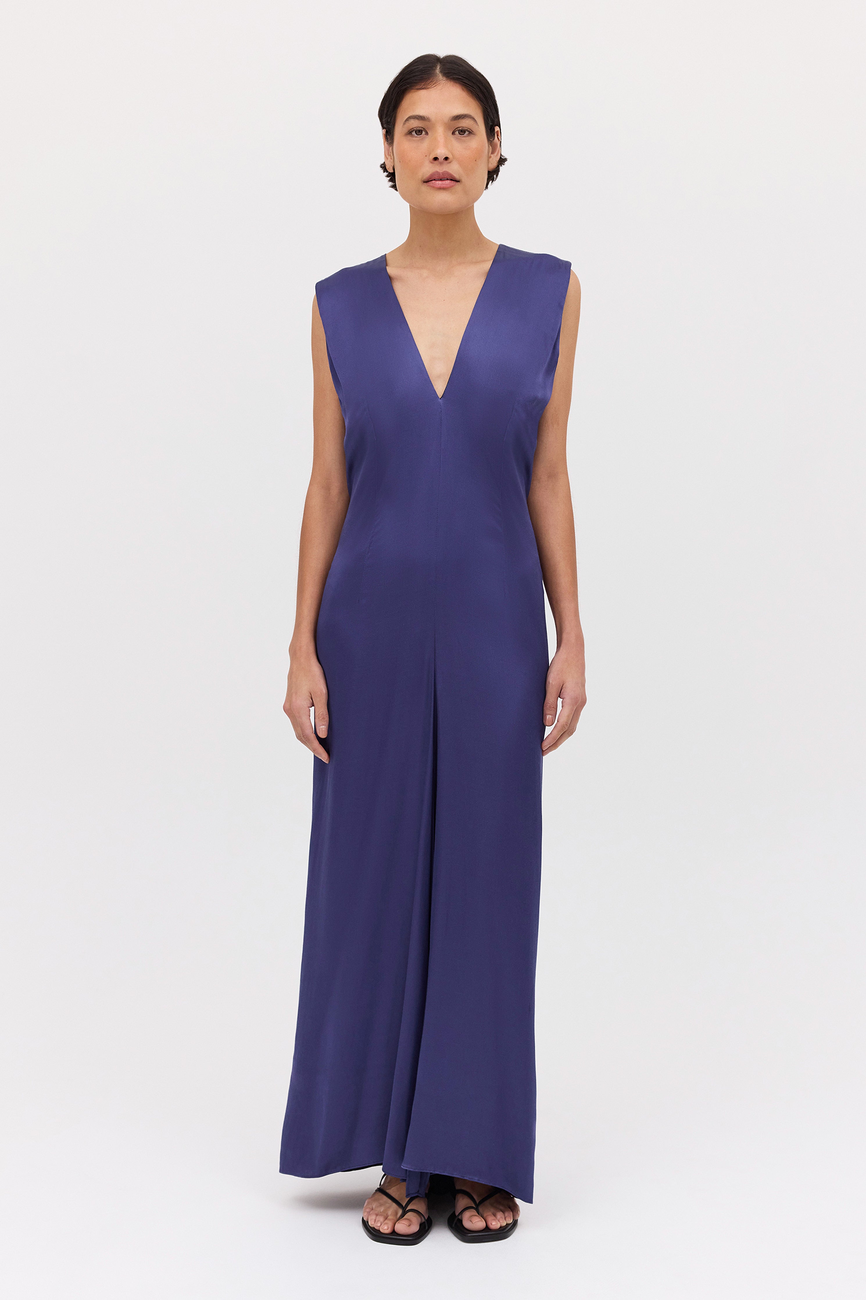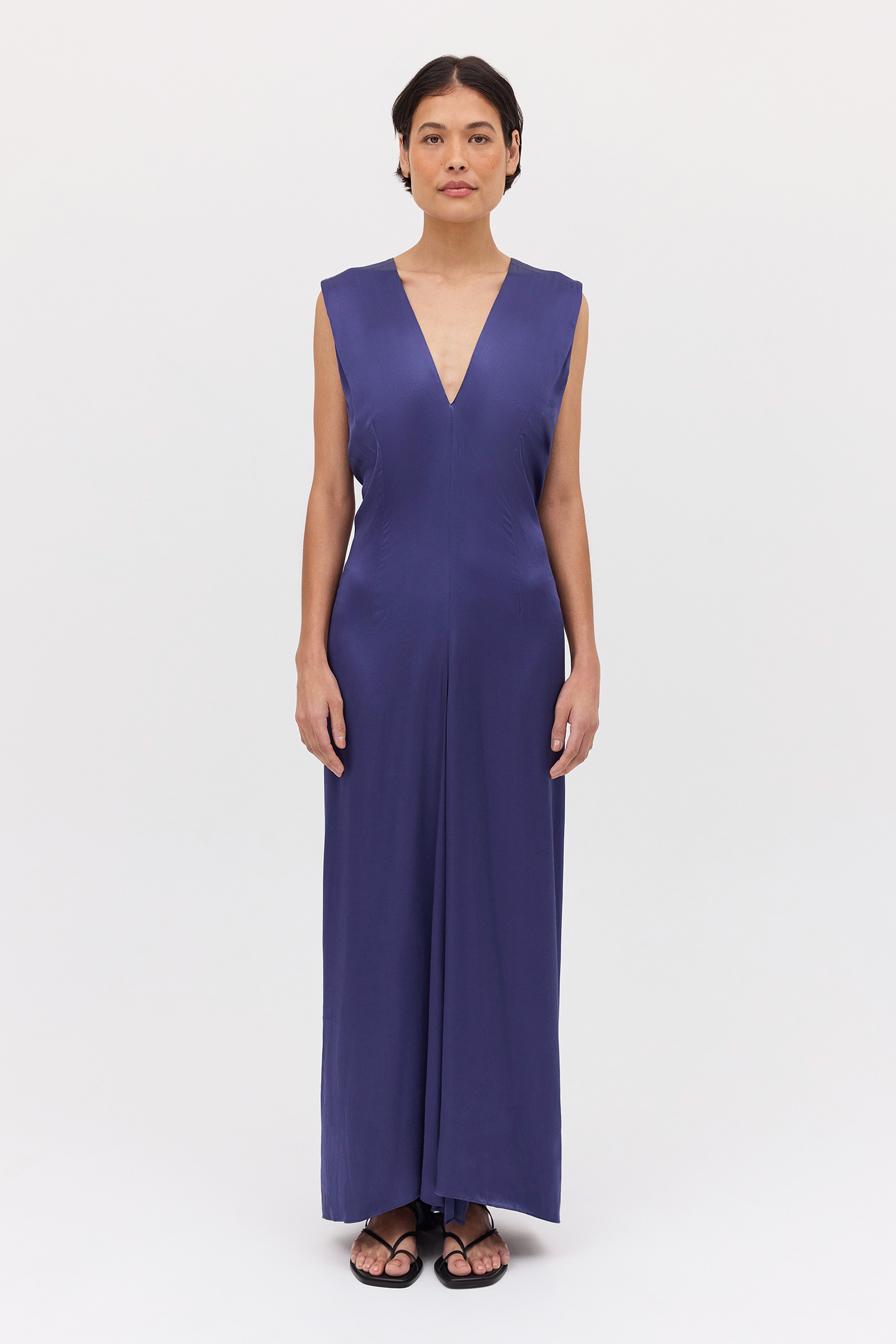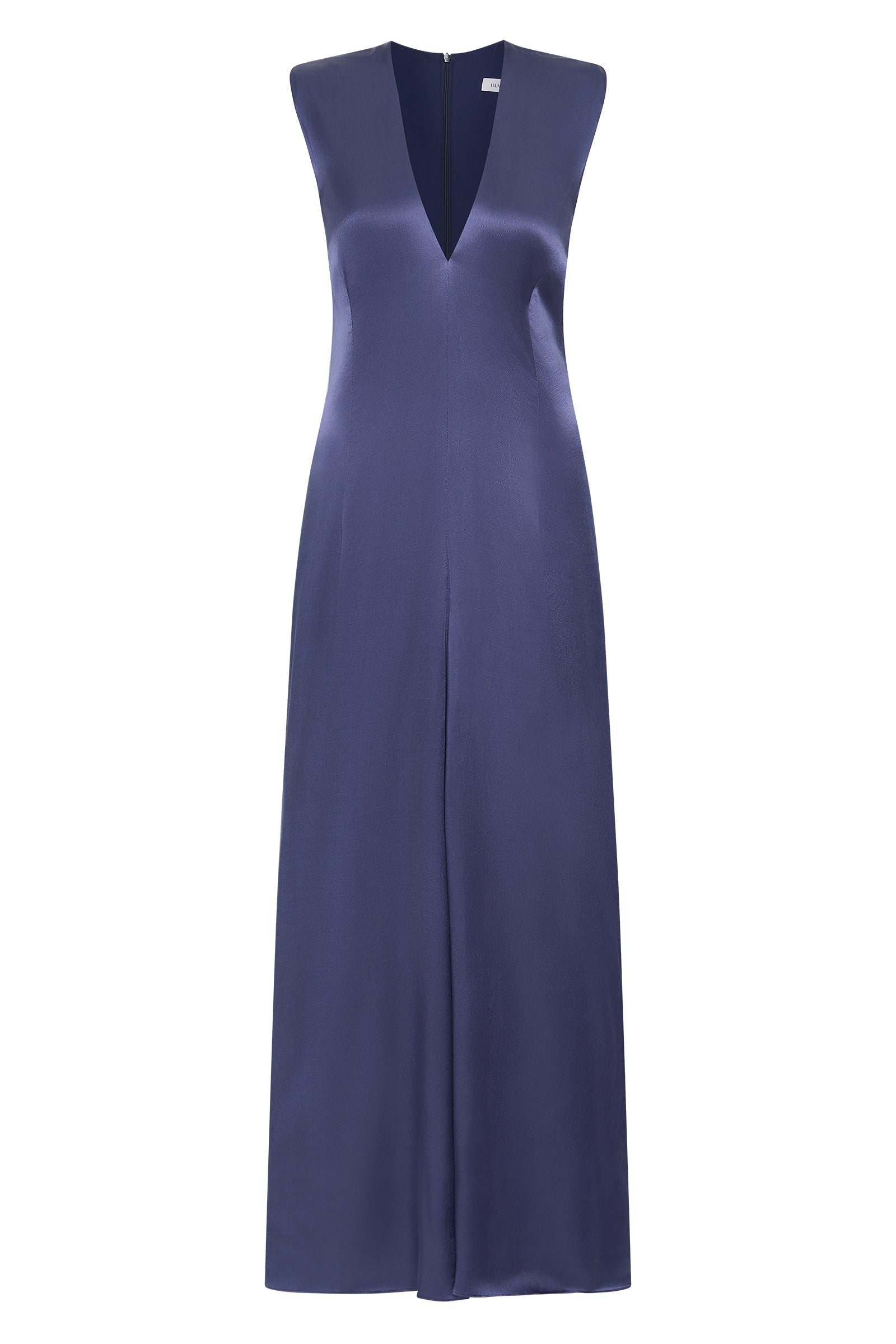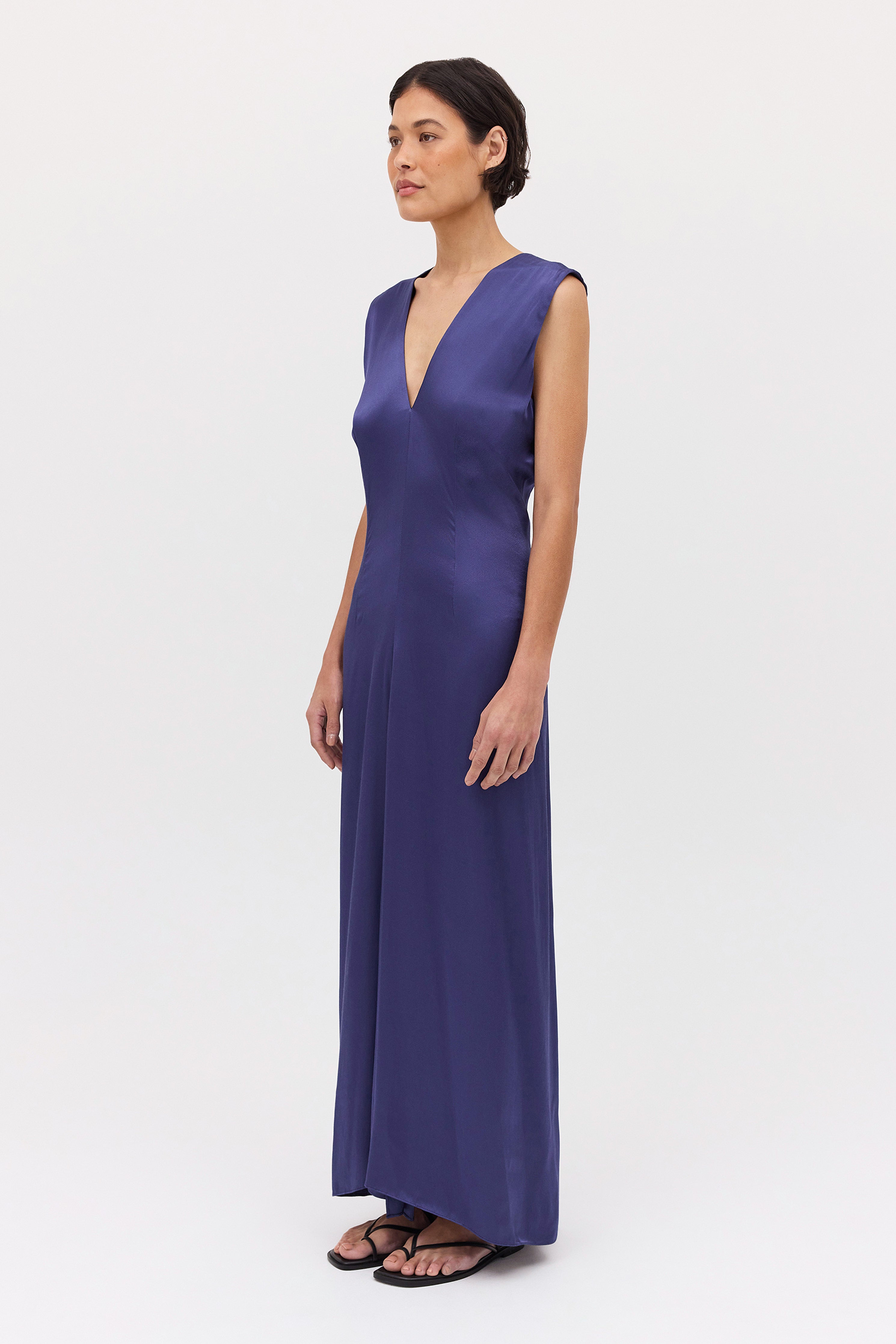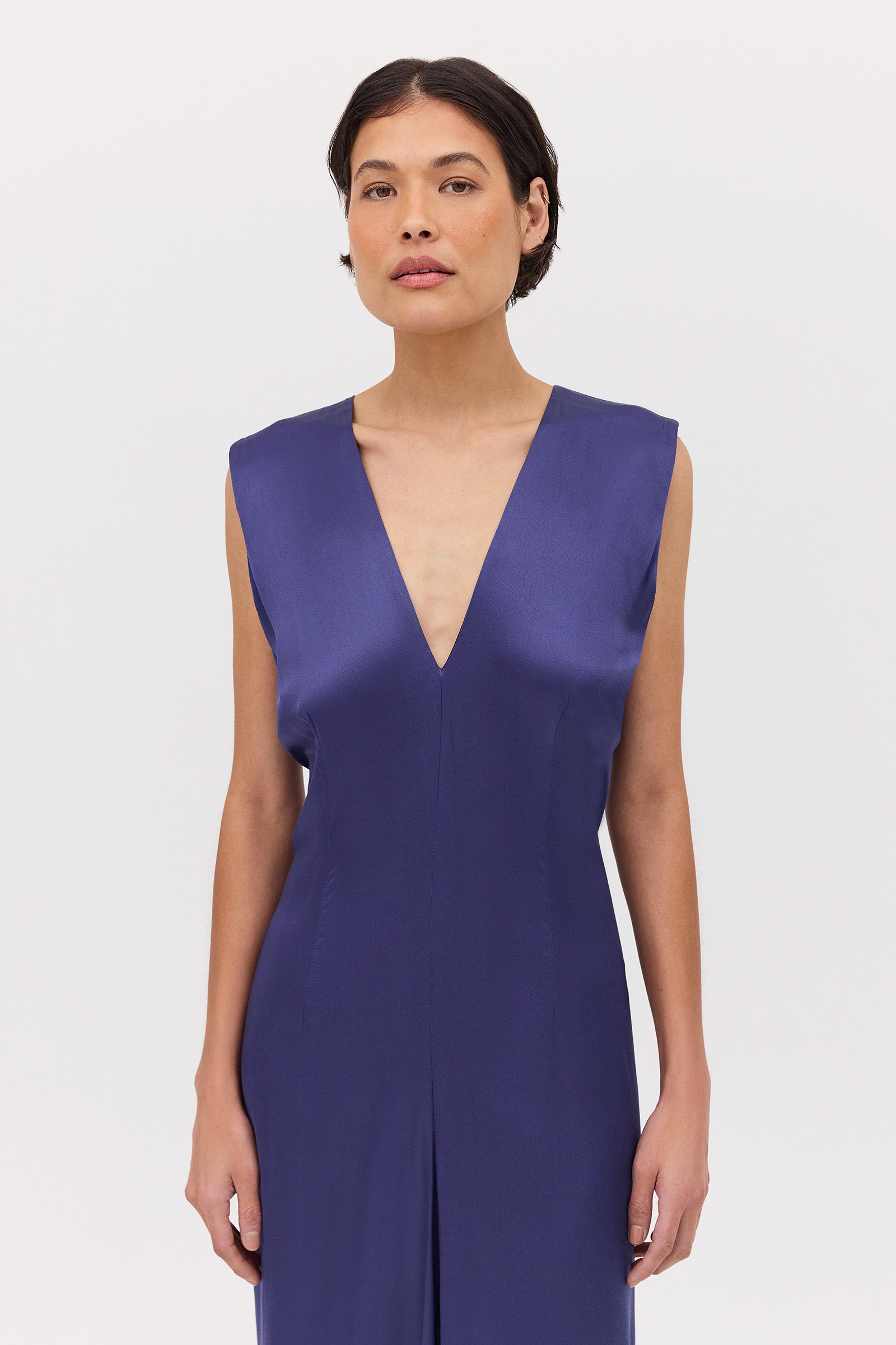 Introducing the Midnight Satin Splendour Dress. A clean silhouette that gently highlights the waist, bringing a sense of modernity and freshness to your wardrobe. Lightweight satin softly skims the body providing ease of movement. A deep V-neckline draws the eye down to follow the languidly fluid drape of the skirt.