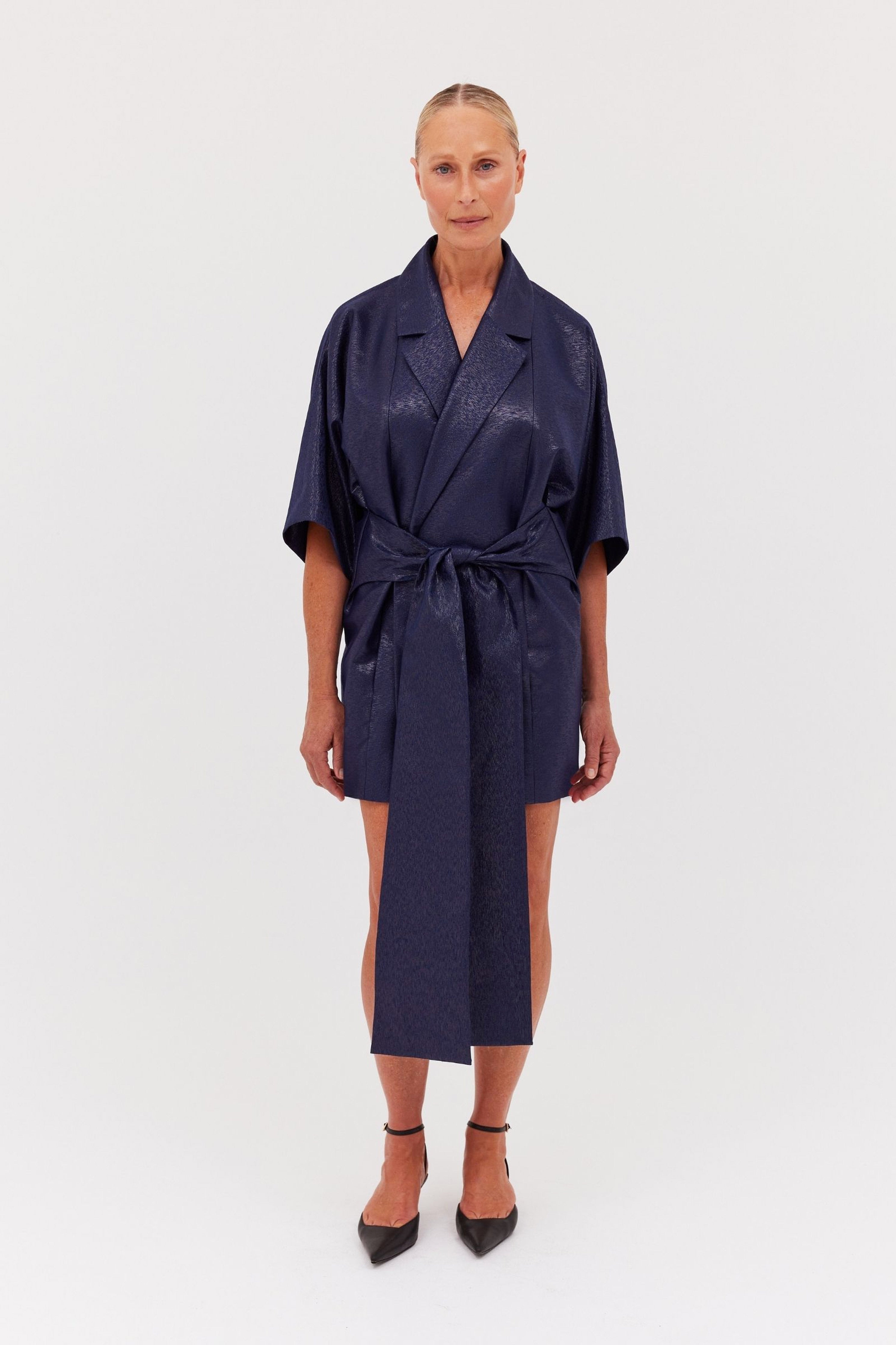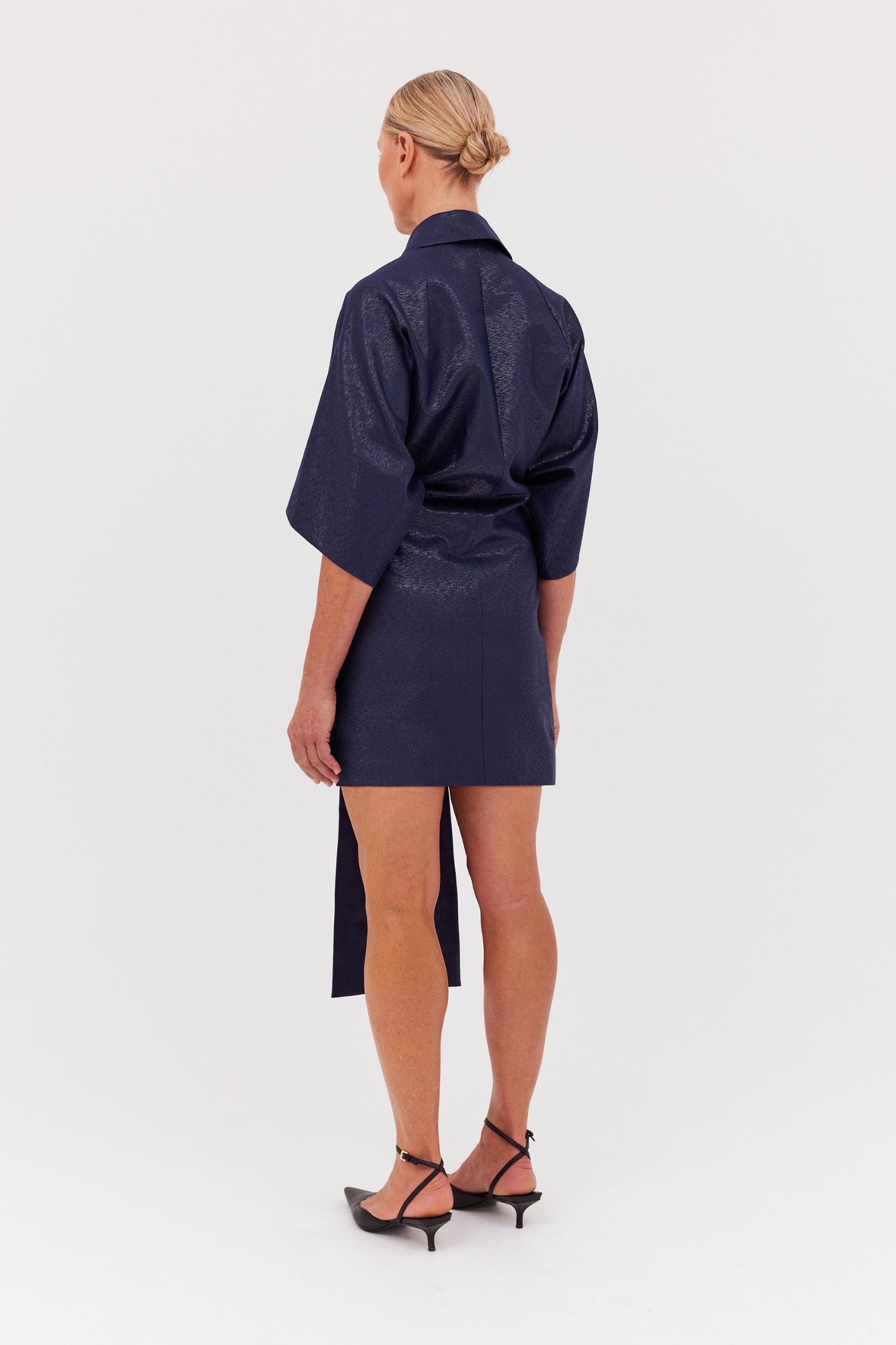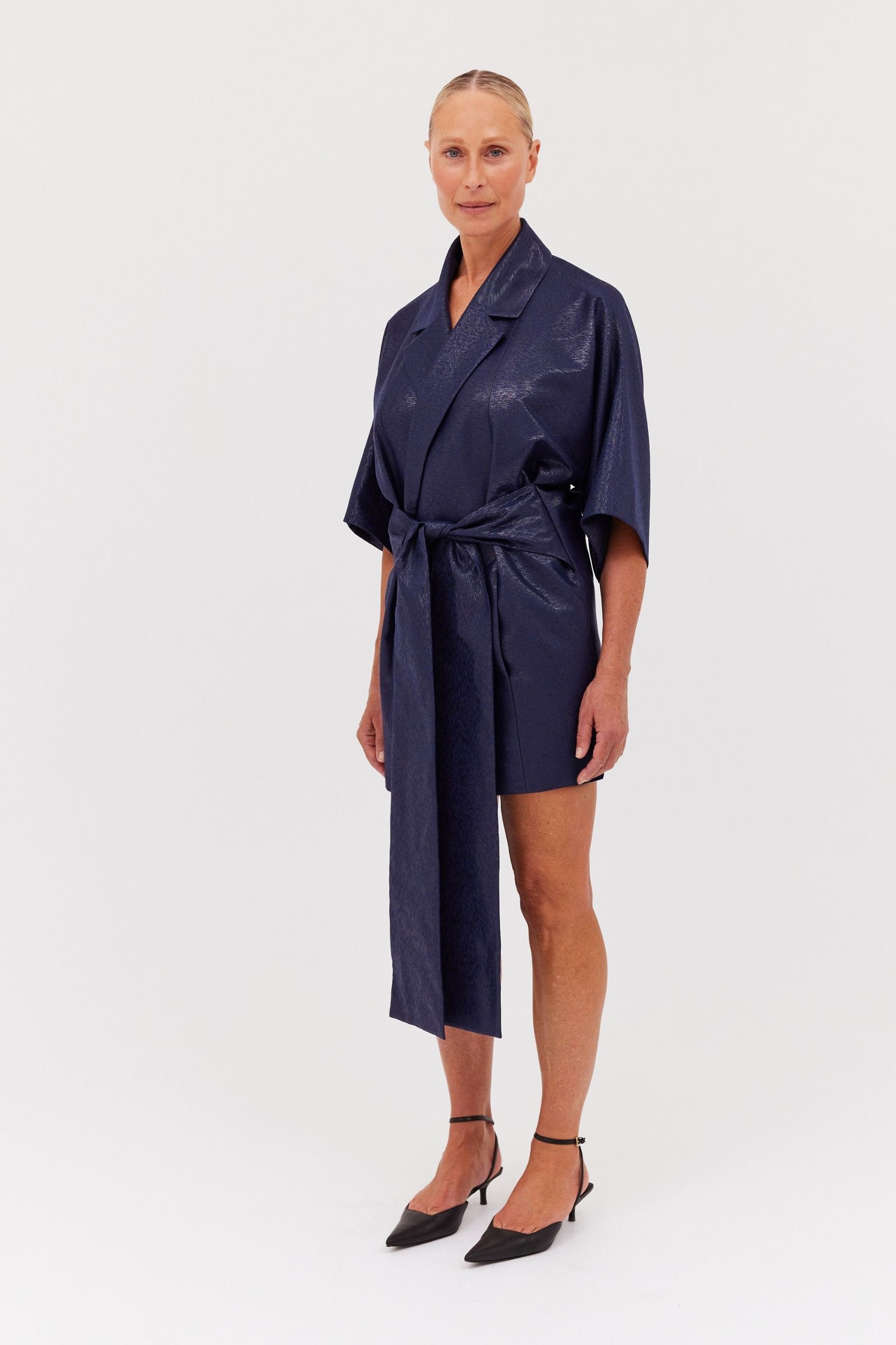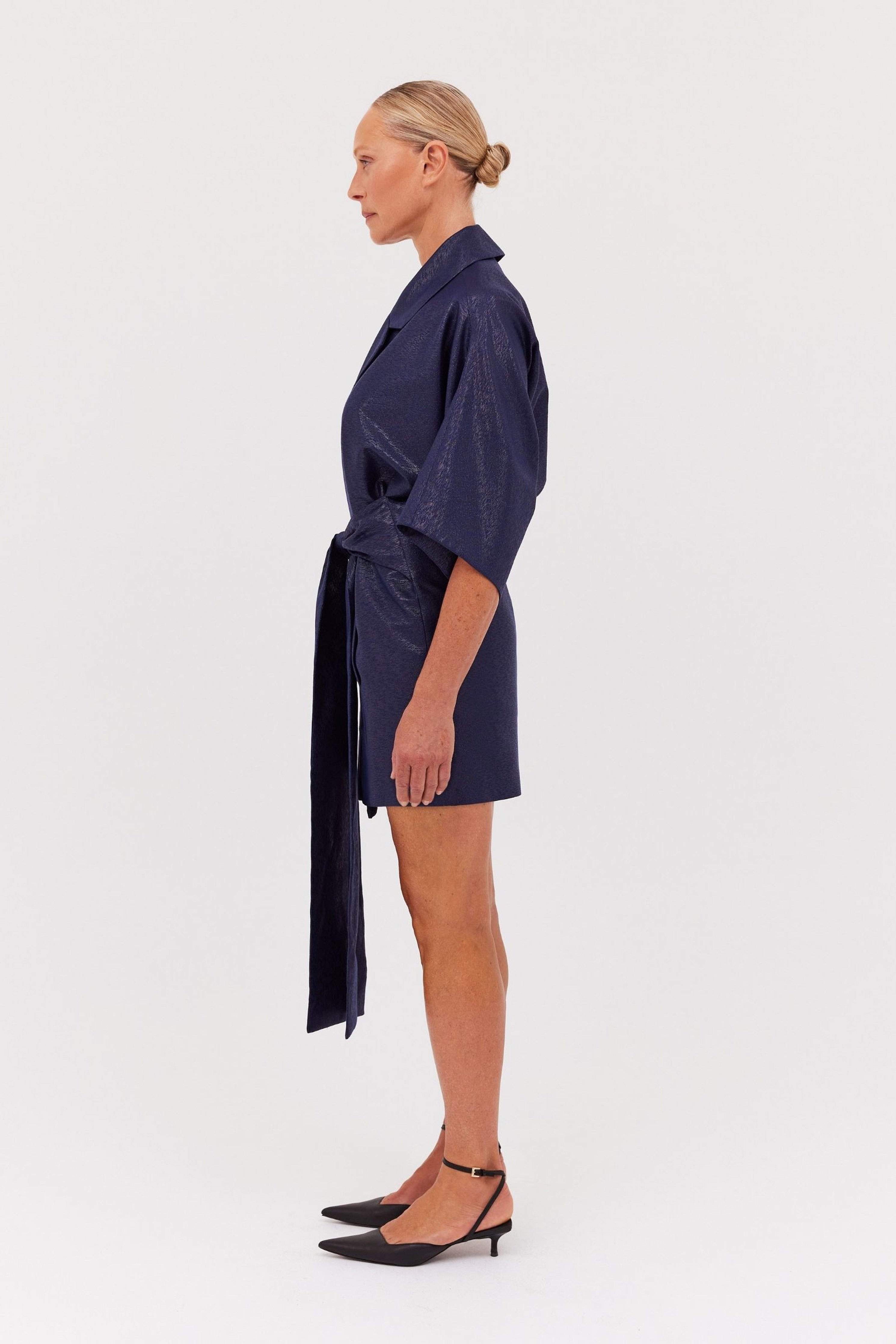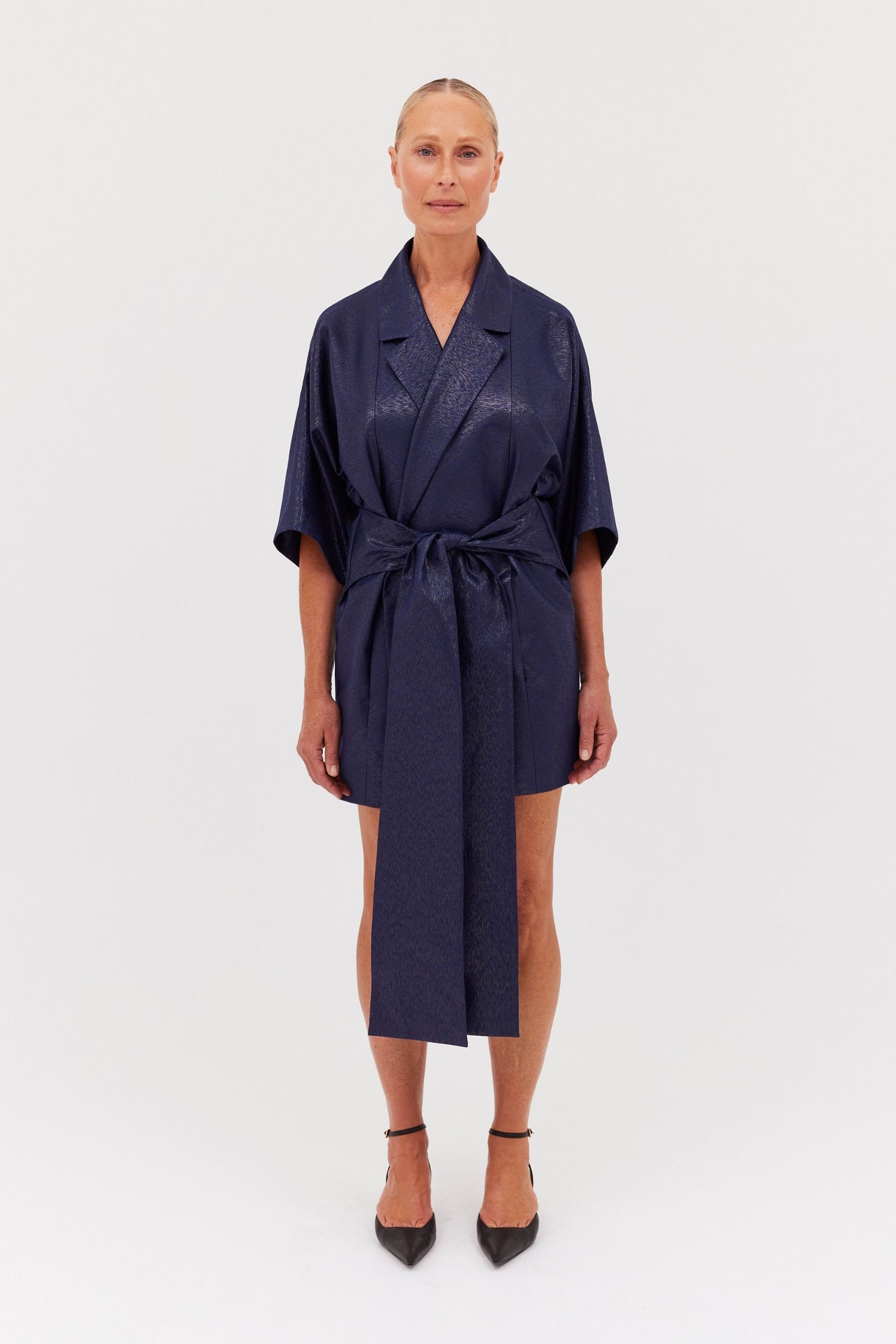 Versatile for day or occasion wear, this mini-length wrap dress is effortless in fit and form. The relaxed fit through the arm and body features an oversized tie that can be adjusted to cinch in at the waist.