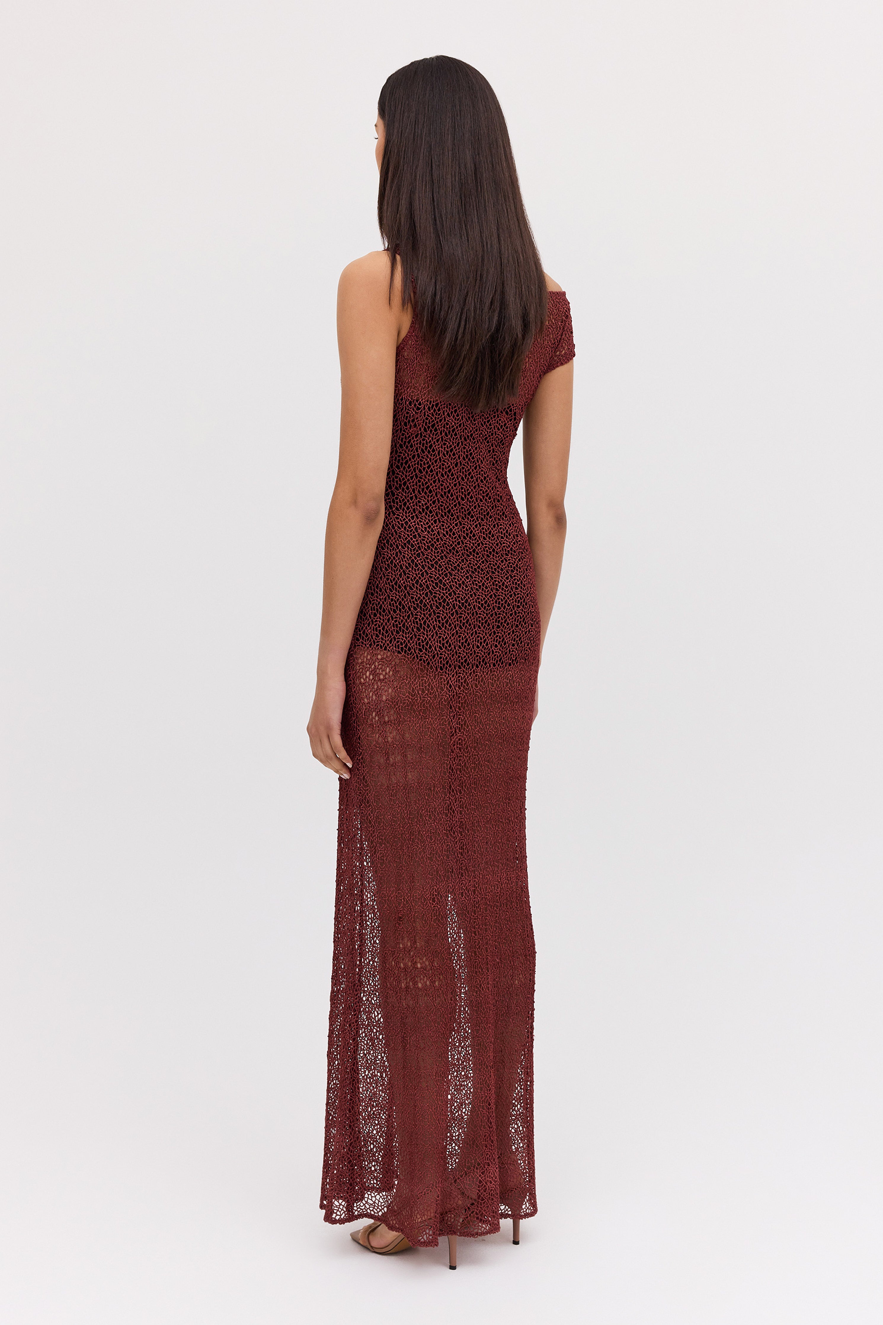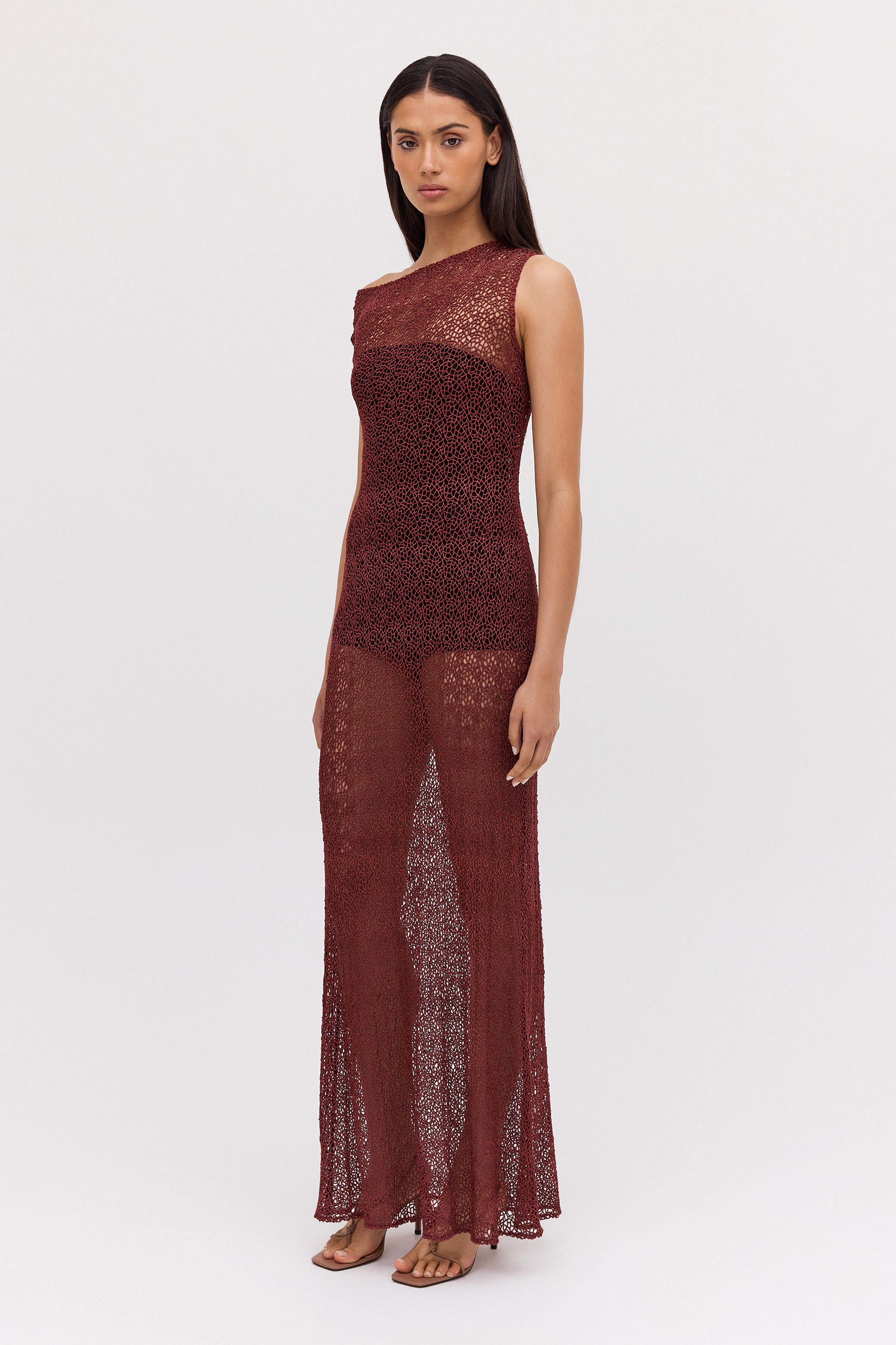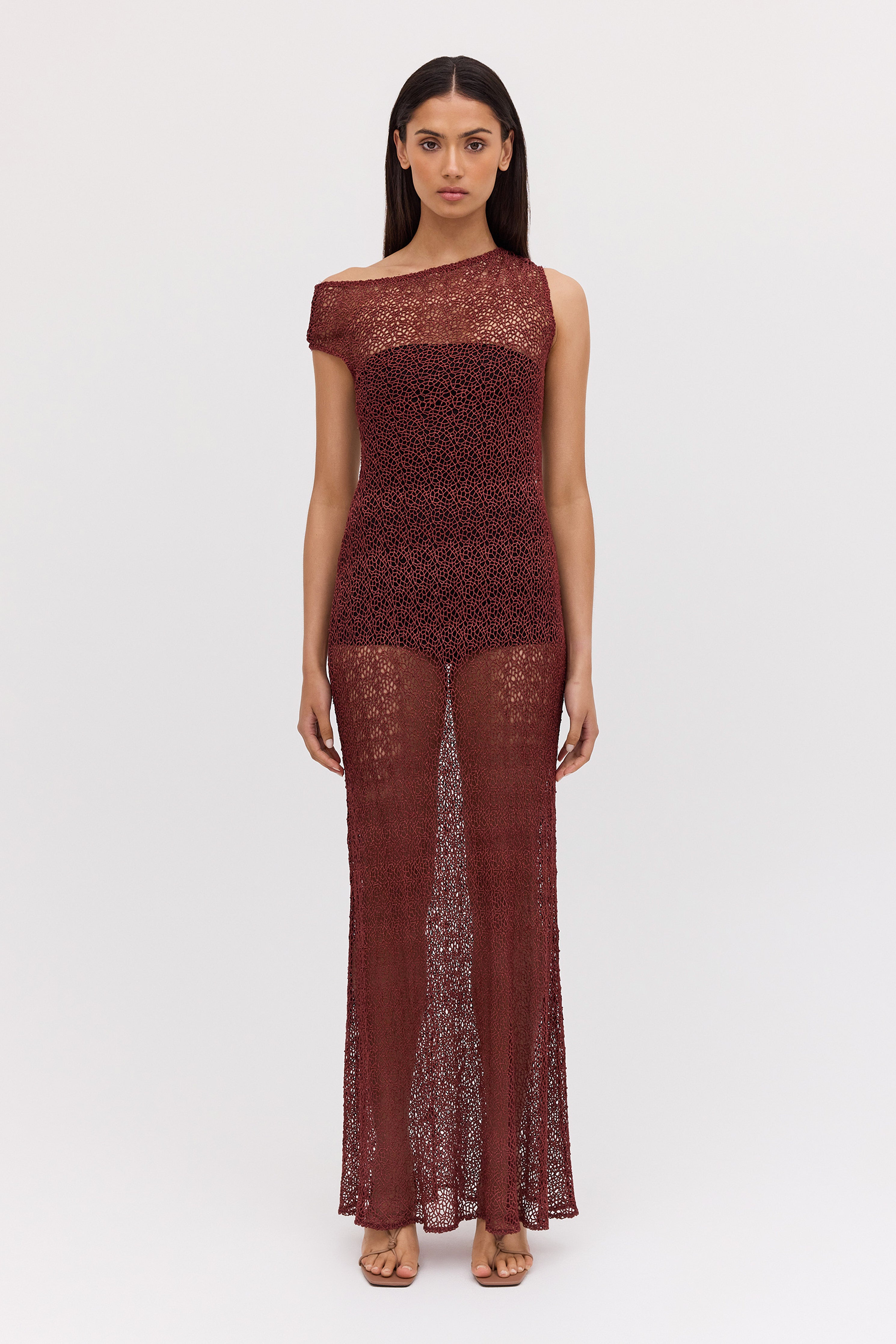 Introducing the Plum Lace Serene Dress. A modern silhouette that softly skims the body, highlighting the female form. The sheer lace outer layer featuring an asymmetrical neckline falls to a languidly draped floor-length skirt.
