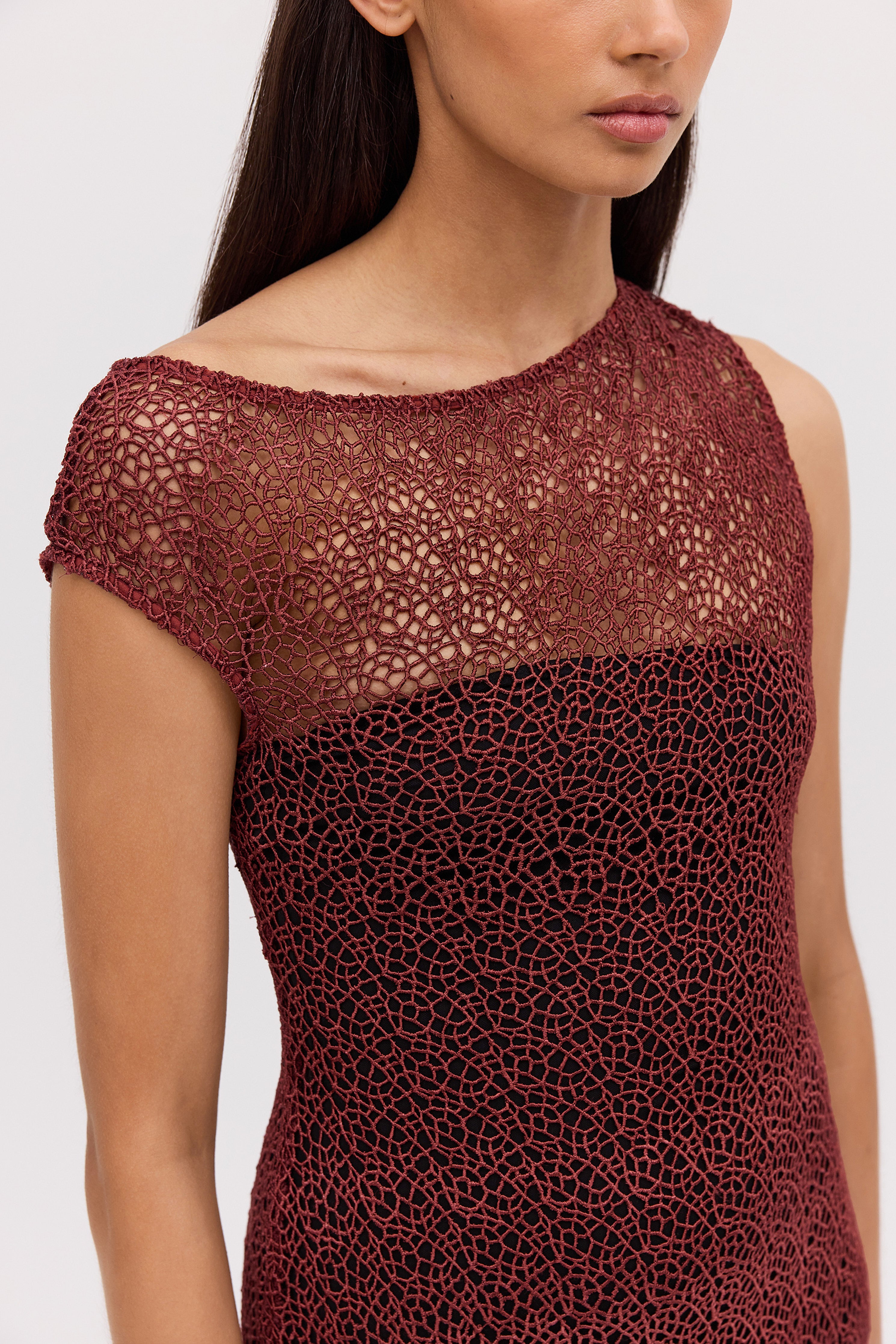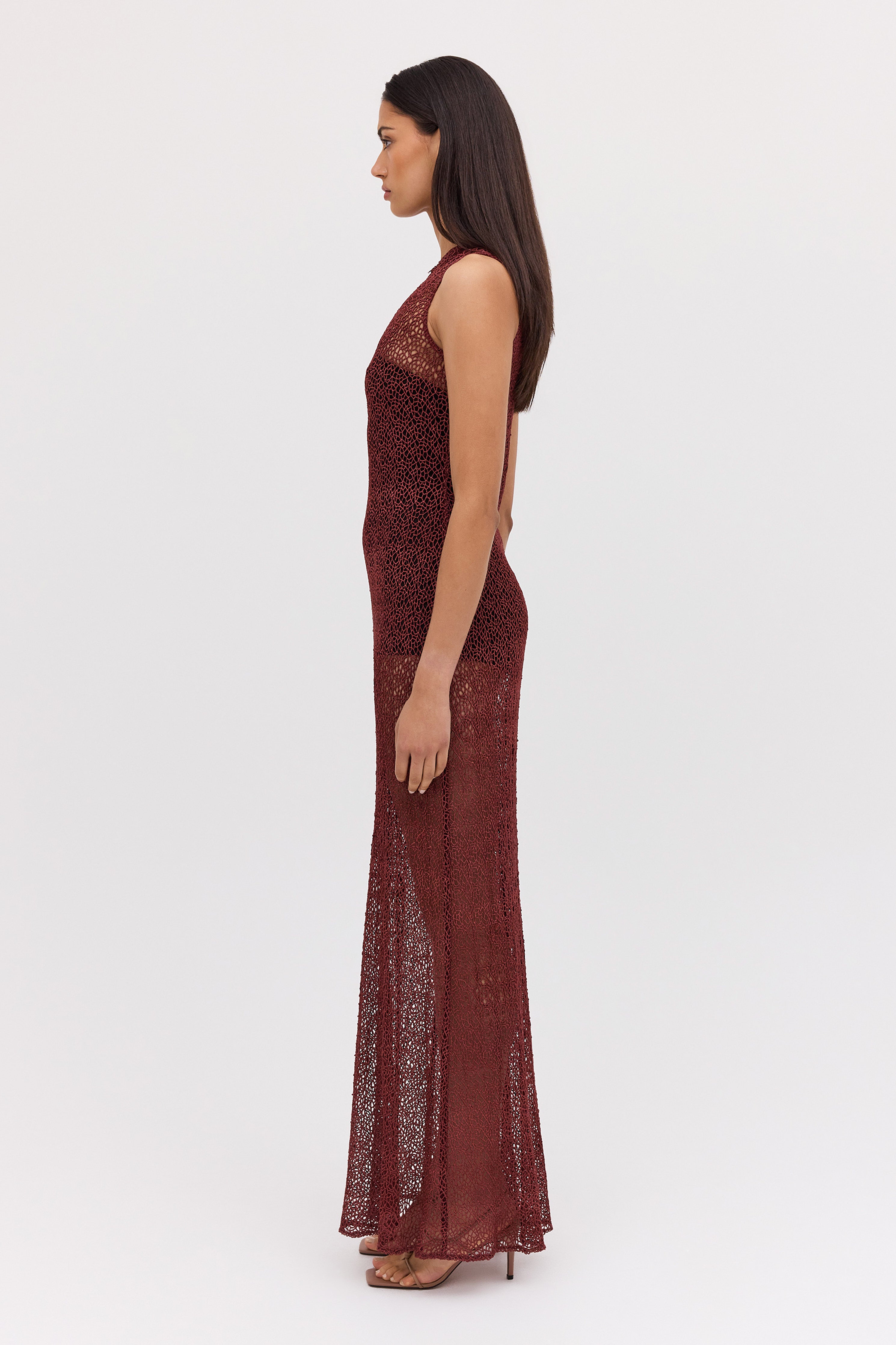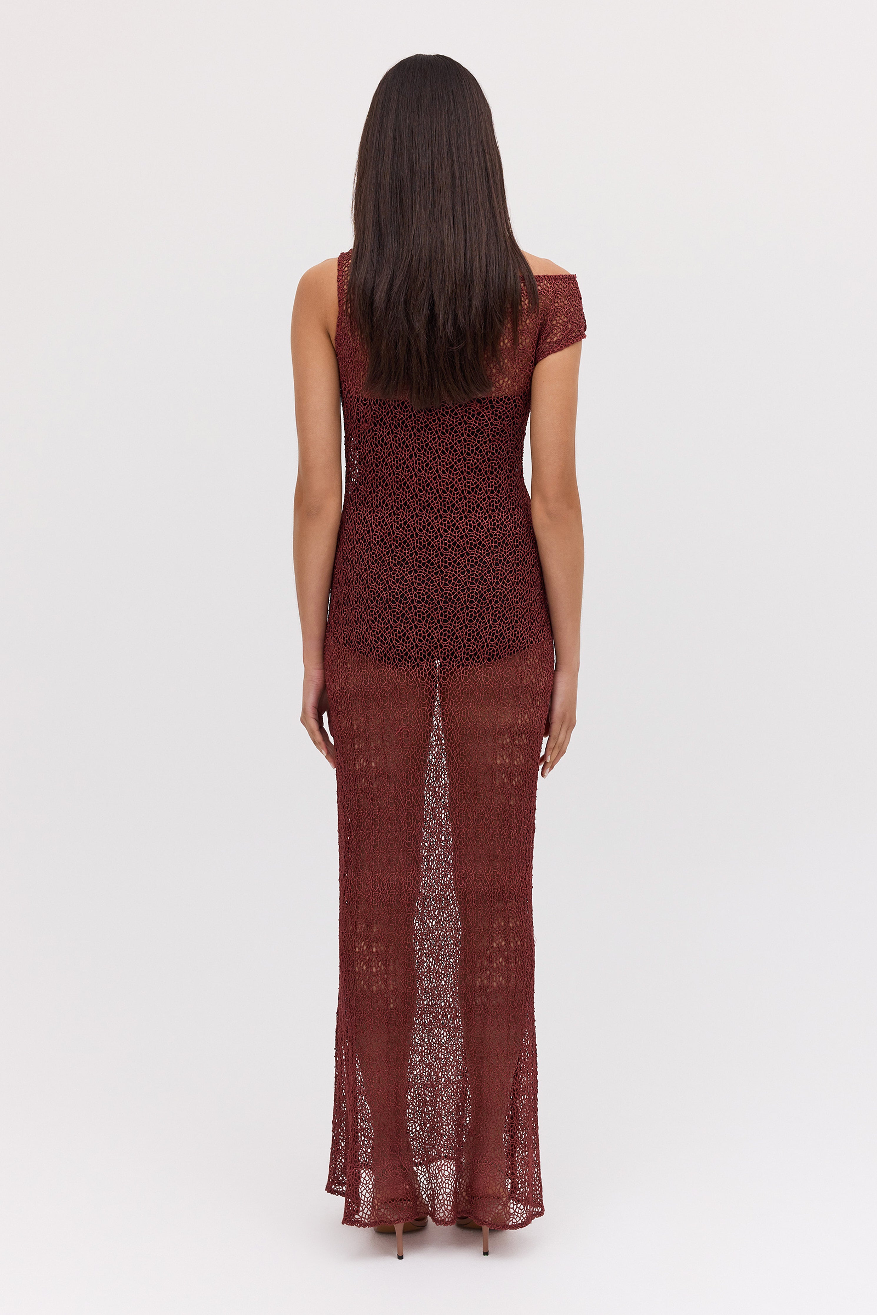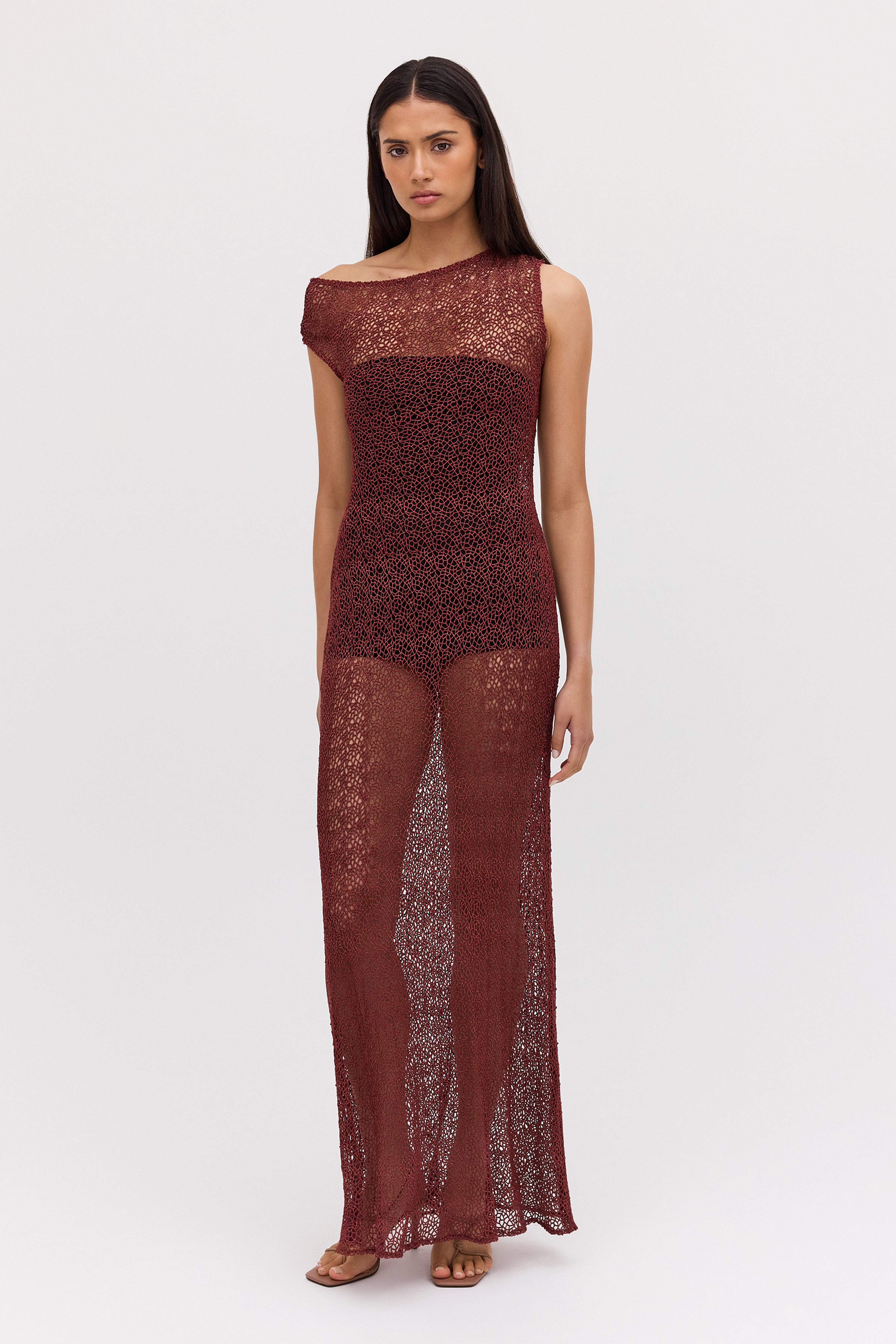 Introducing the Plum Lace Serene Dress. A modern silhouette that softly skims the body, highlighting the female form. The sheer lace outer layer featuring an asymmetrical neckline falls to a languidly draped floor-length skirt.