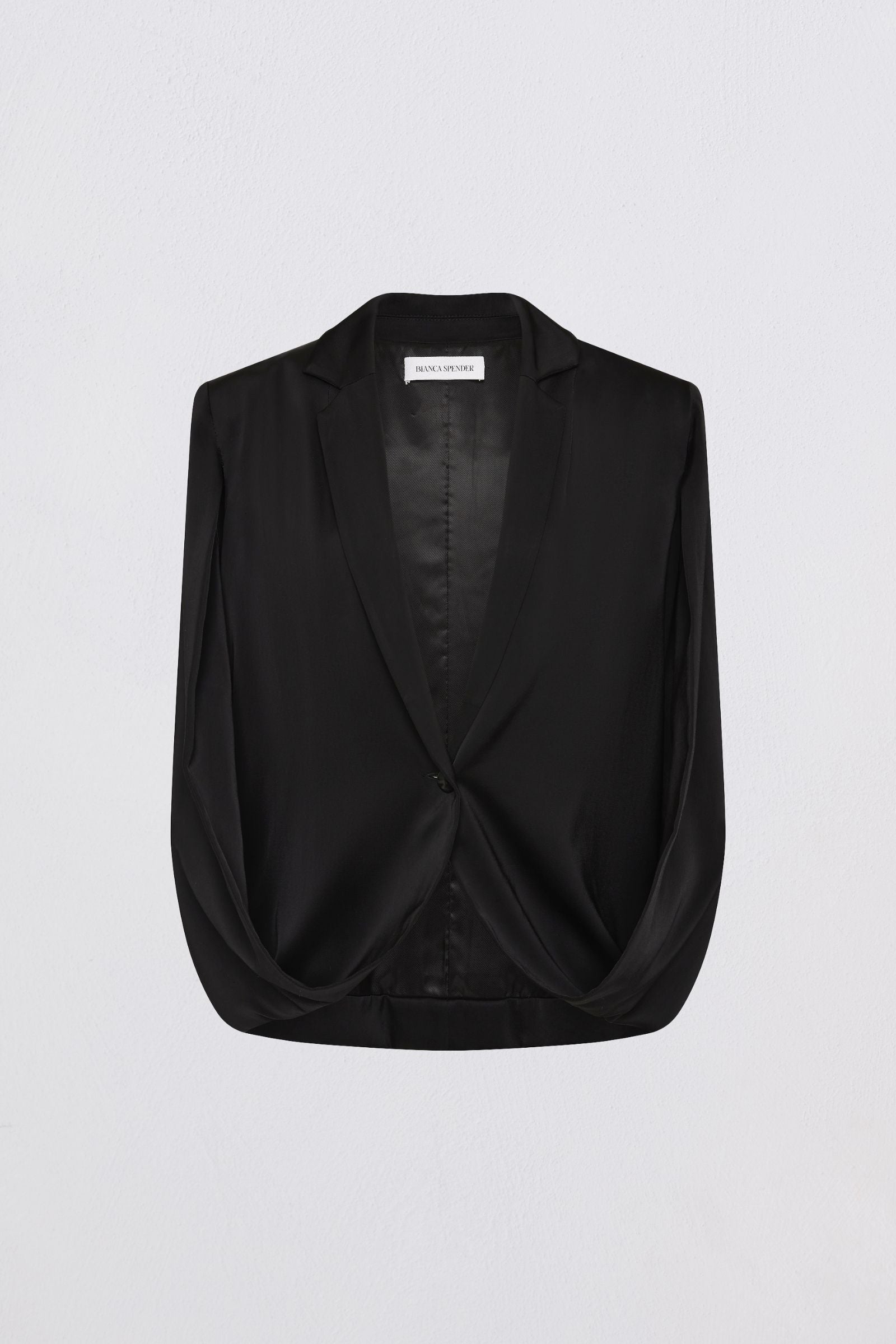 BLACK SATIN SUITING CURRENT CAPE JACKET