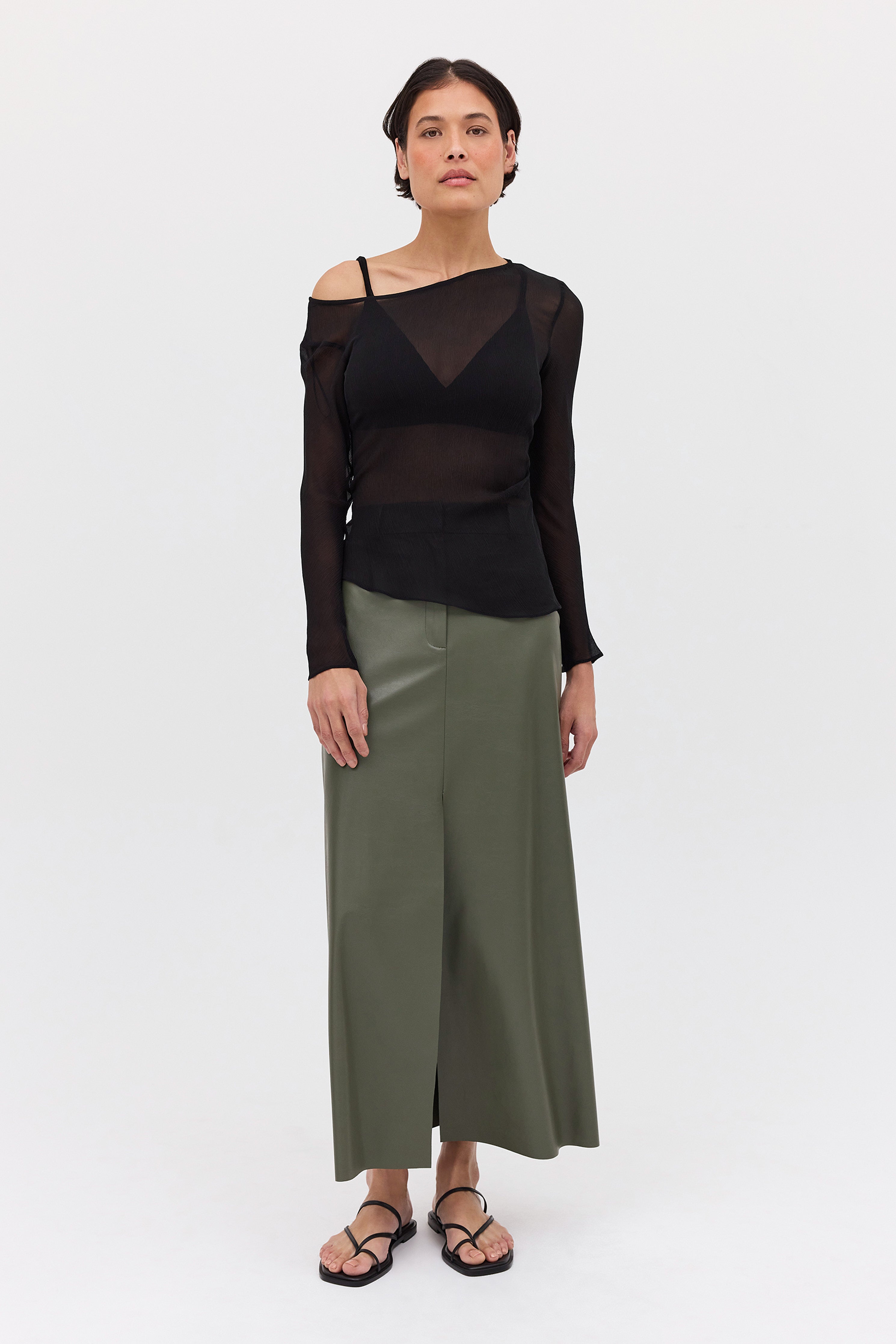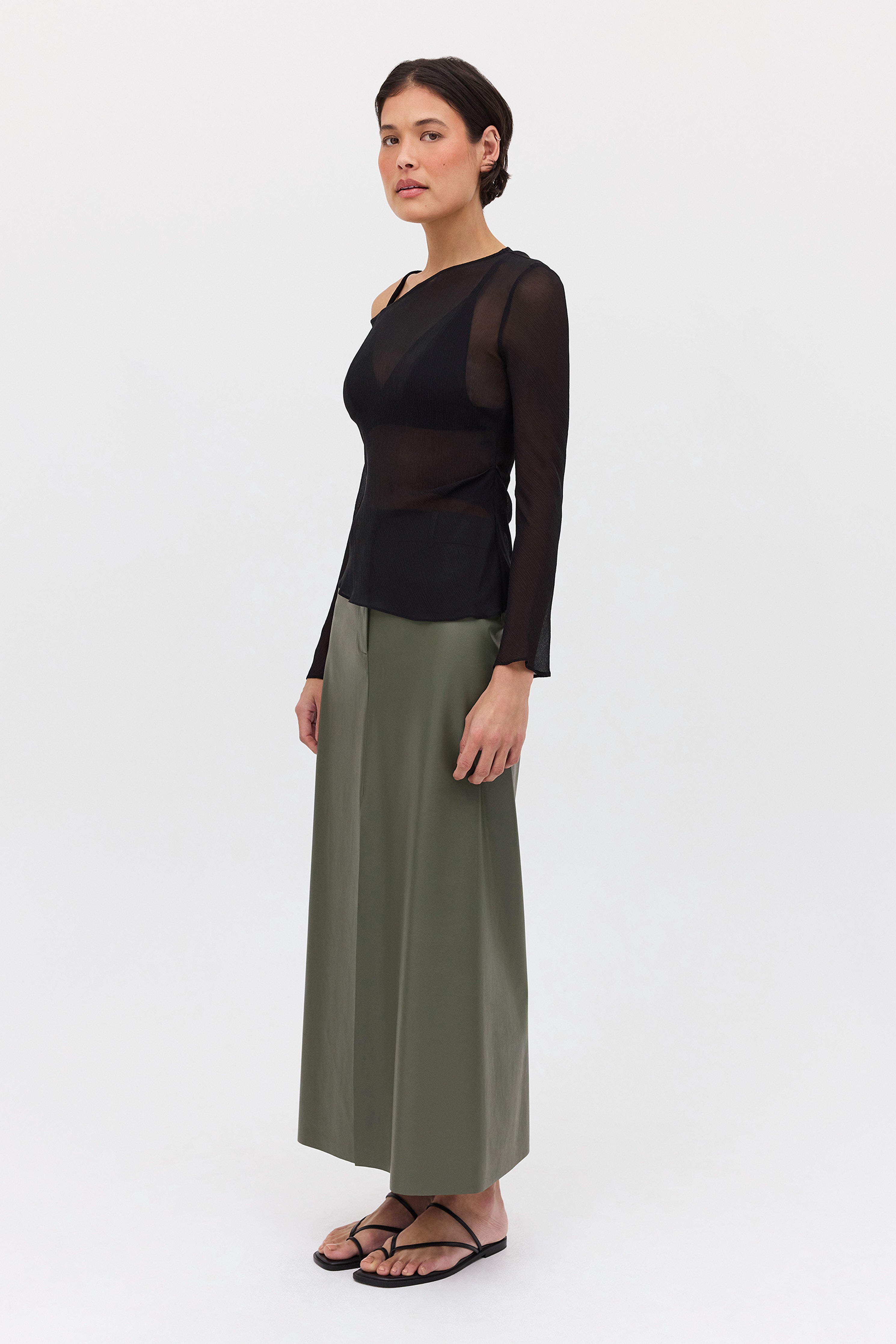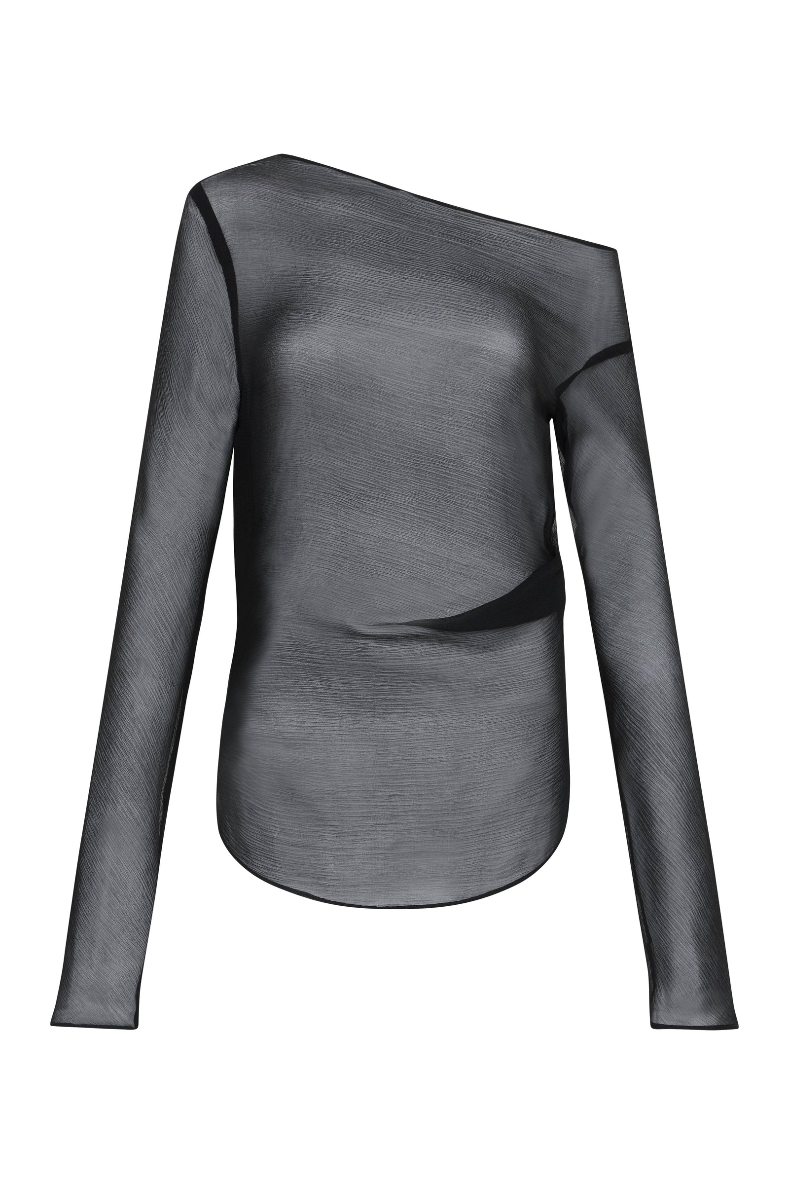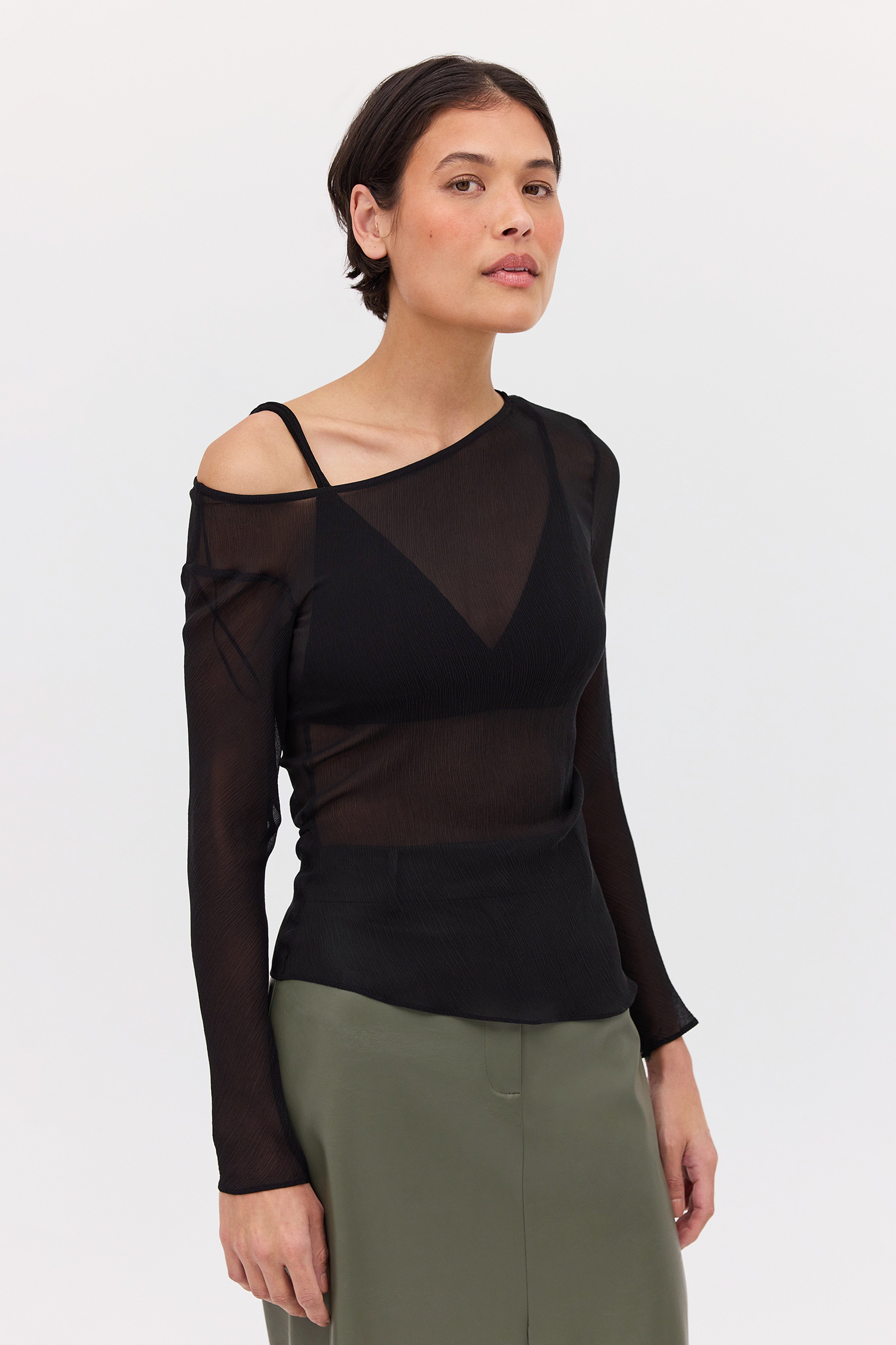 The Black Georgette Yonder Top is a chic, modern piece, that will add instant elevation to your wardrobe. Crafted from a sheer georgette fabric that allows air and movement to flow around the body, and an elegant asymmetrical neckline.