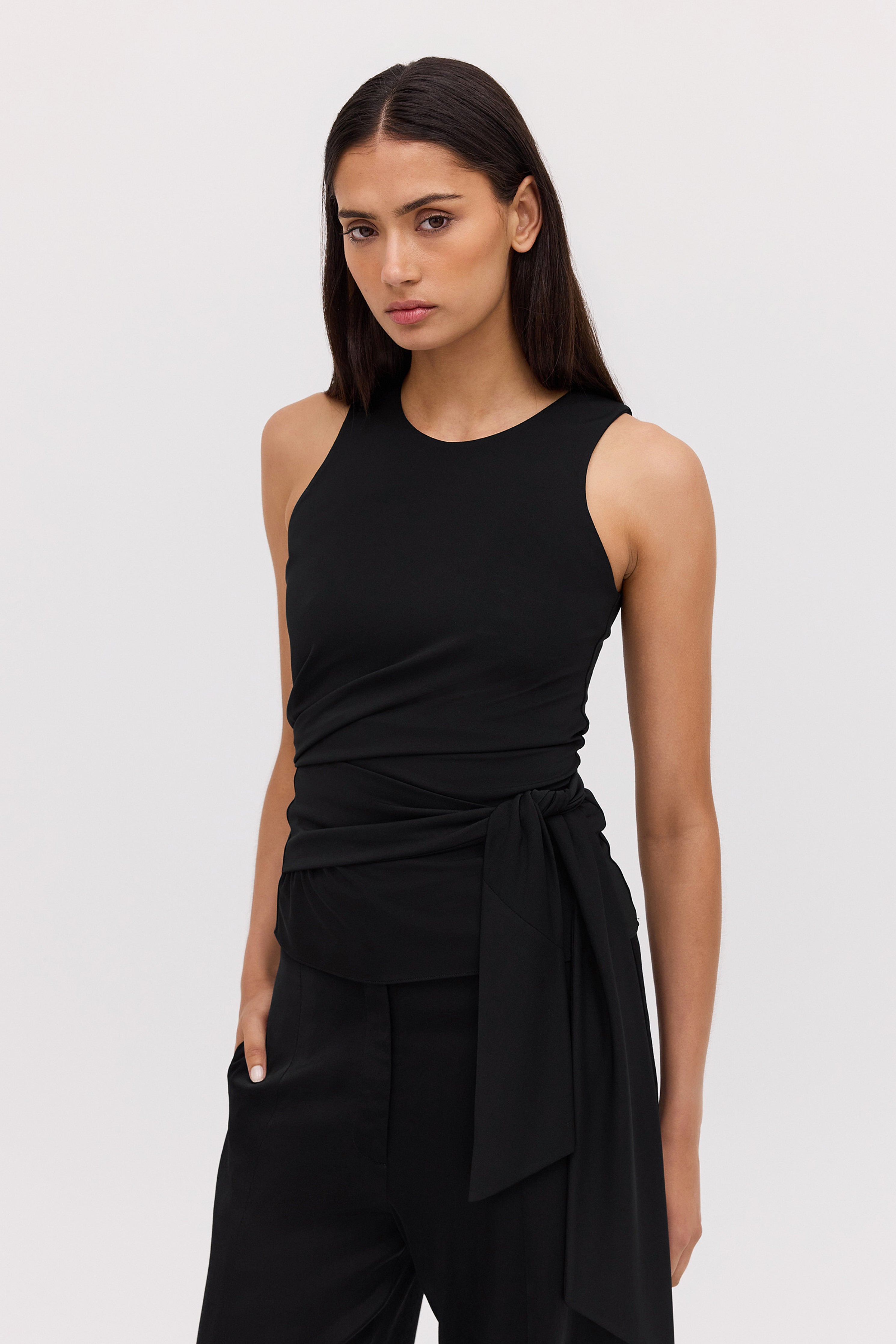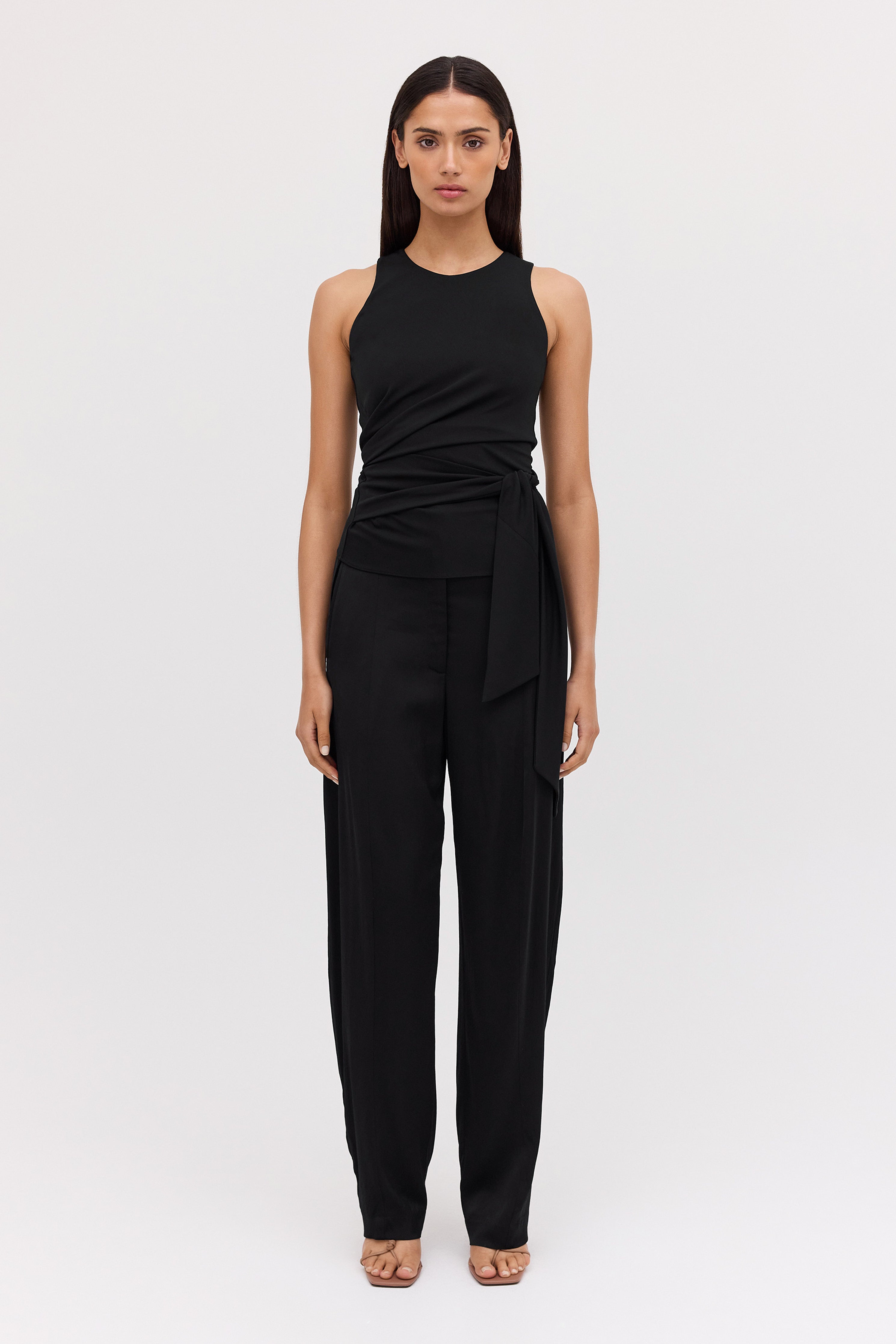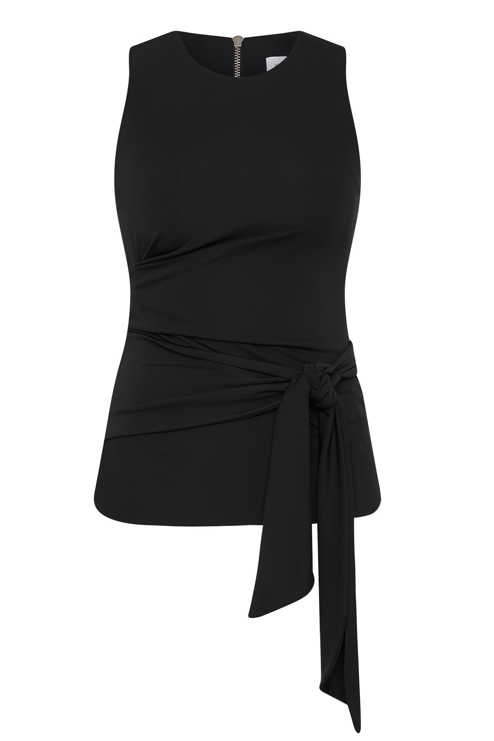 Building off winning elements from the Aesthete dress, with ties wrapping at flattering angles around the waist adding drama and distraction in elevated, easy wear and care, luxe Australian made jersey in a classic black hue. Fitted to the body, the top slips over the head with the ease of a short back neck zip.