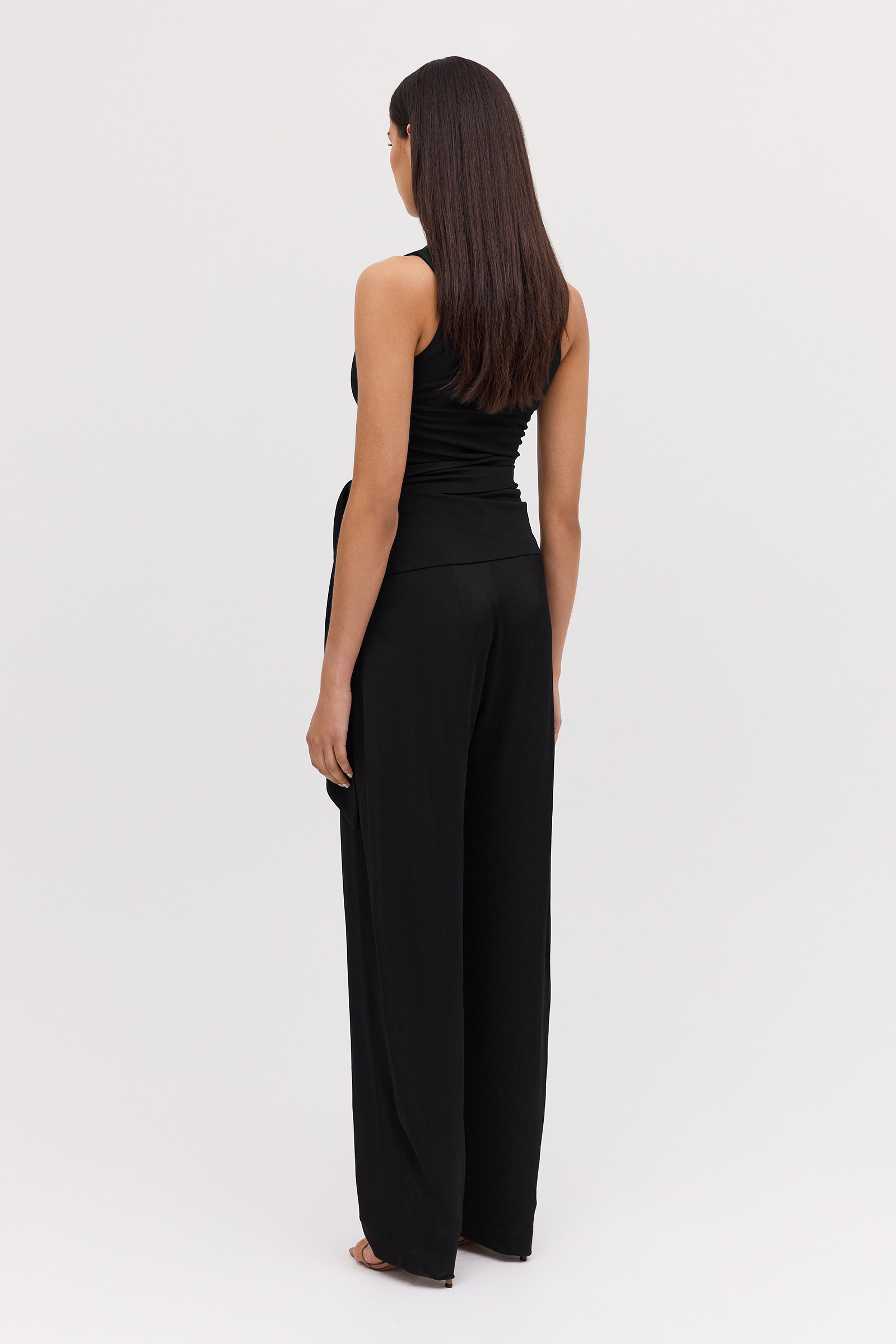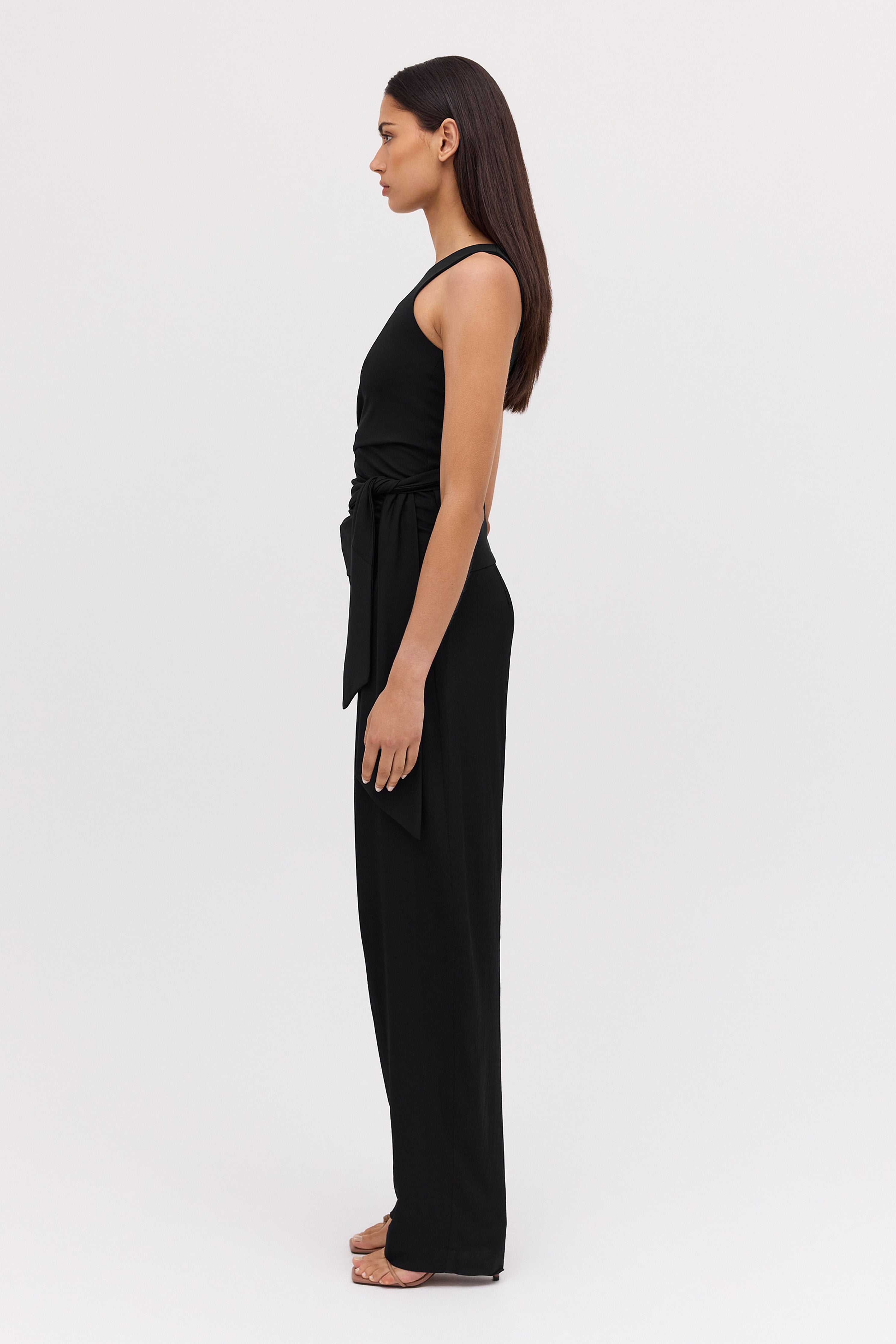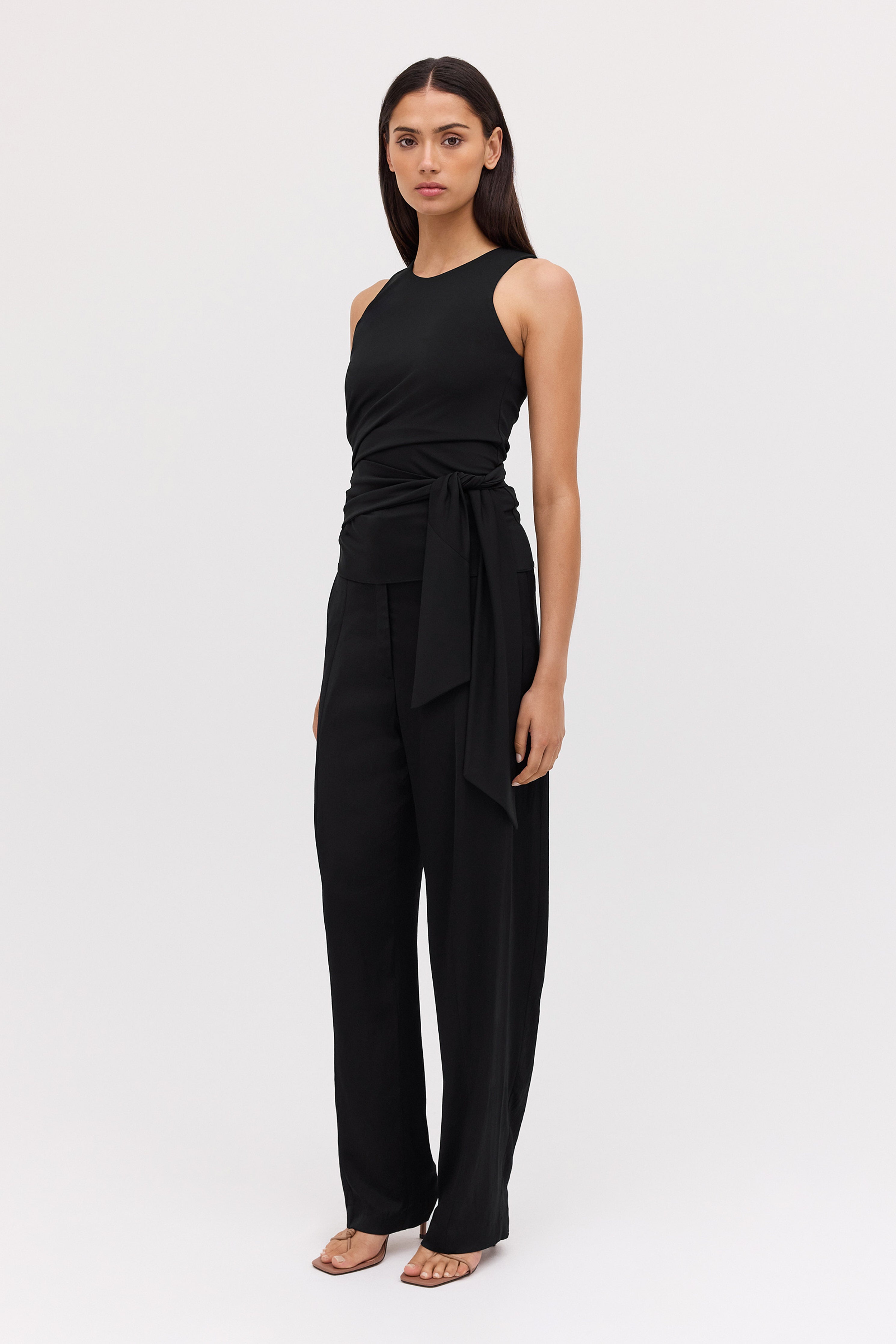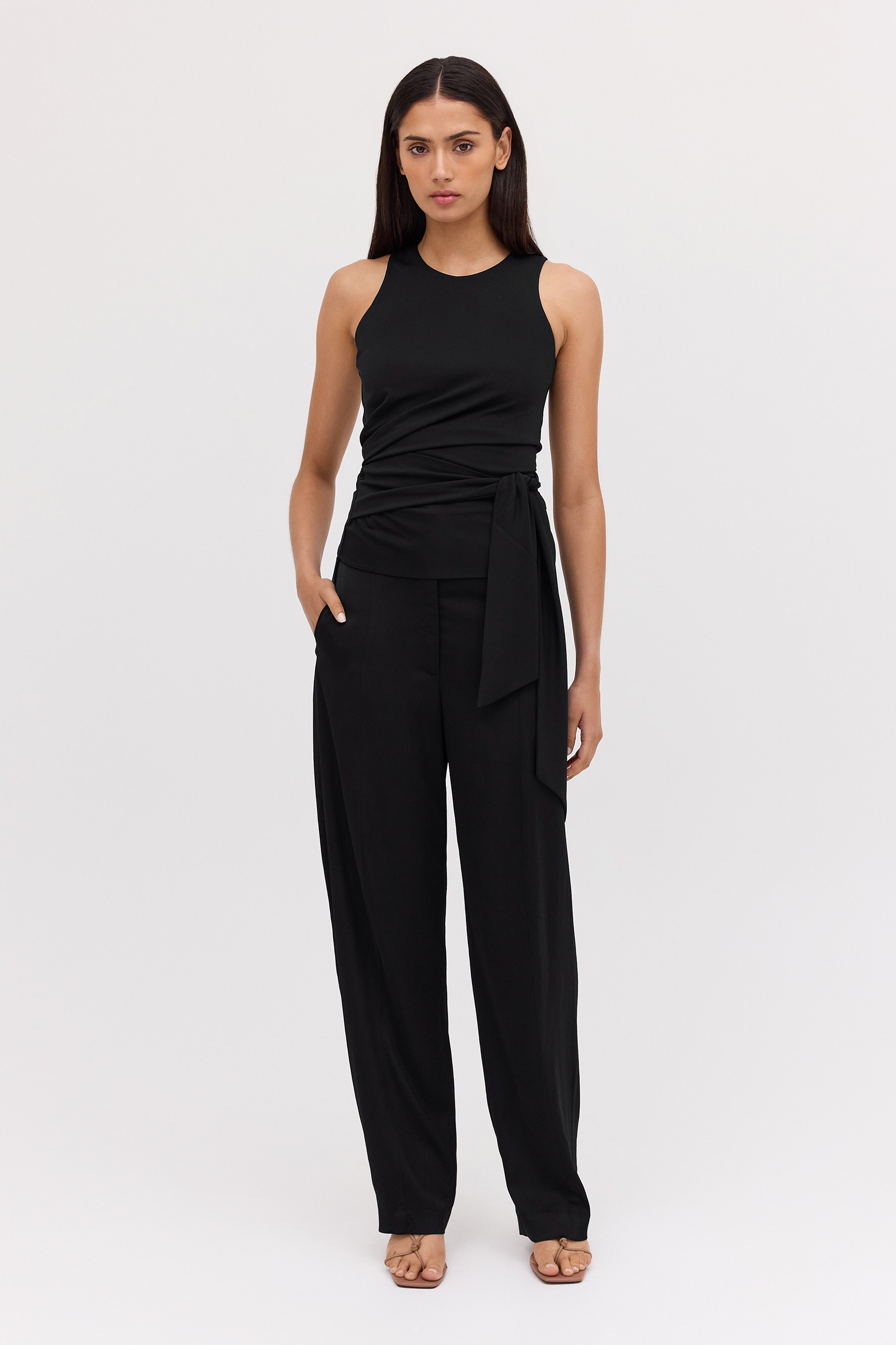 Building off winning elements from the Aesthete dress, with ties wrapping at flattering angles around the waist adding drama and distraction in elevated, easy wear and care, luxe Australian made jersey in a classic black hue. Fitted to the body, the top slips over the head with the ease of a short back neck zip.