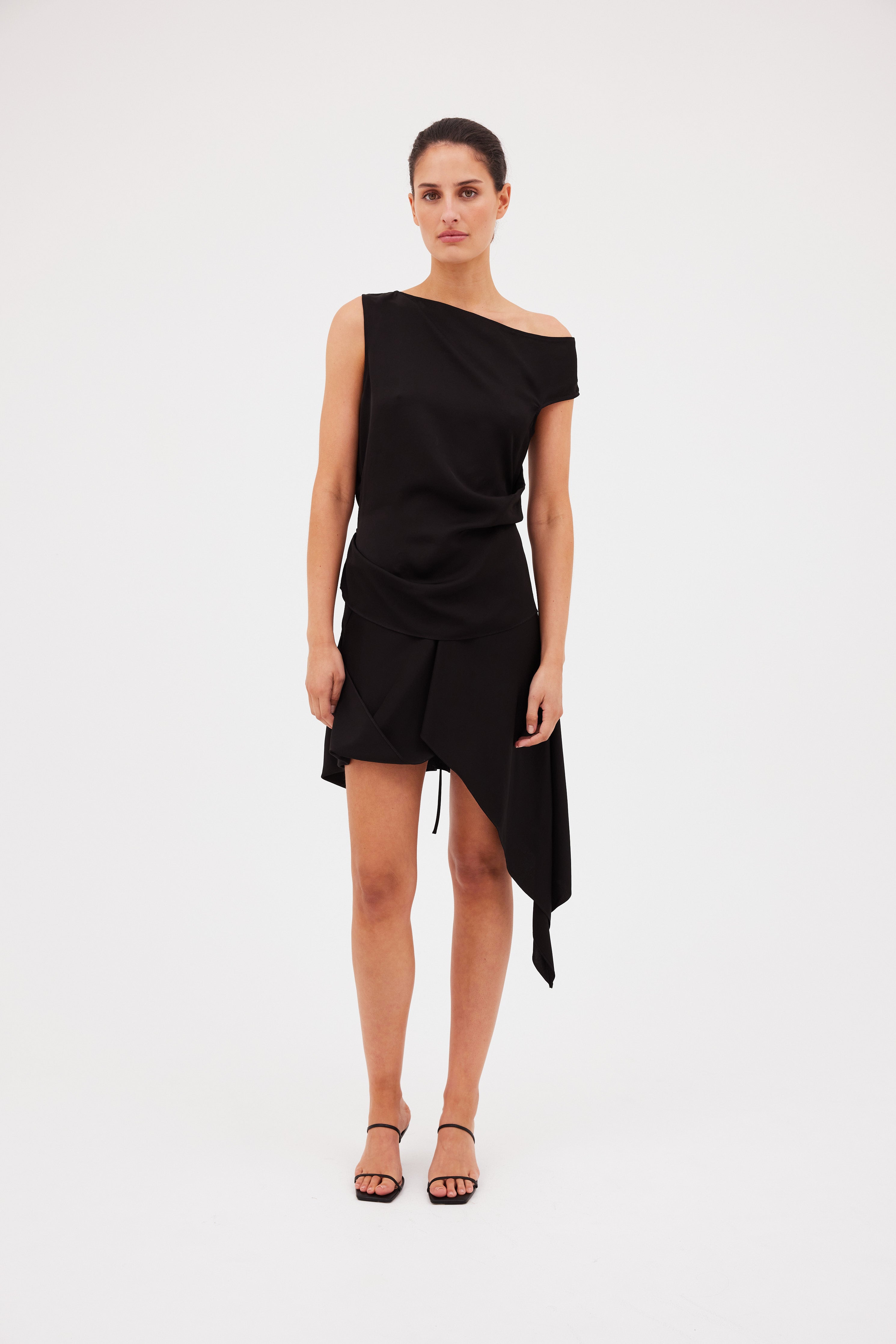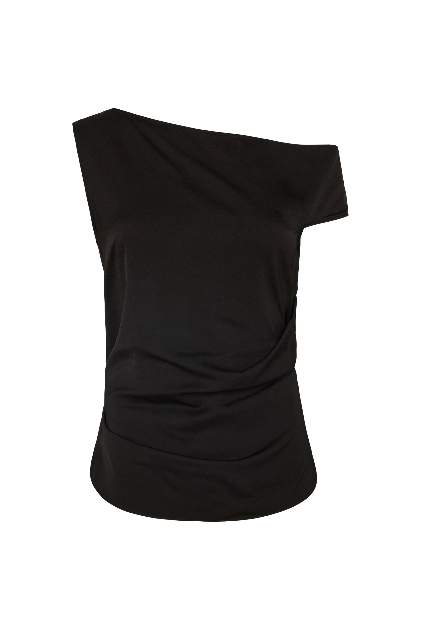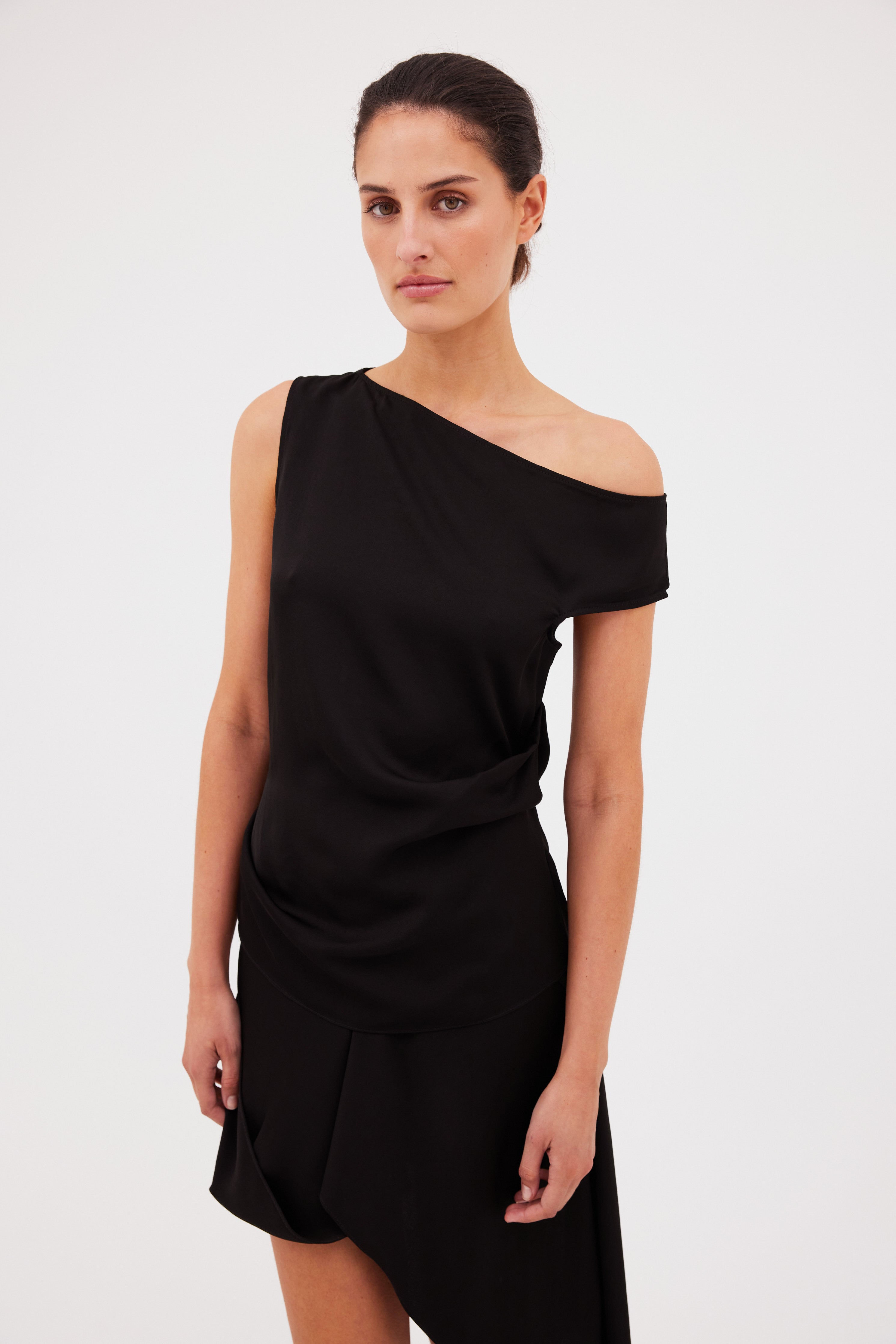 Introducing our Black Satin Crepe Vice Top, perfect for adding a touch of style to any outfit. Cut to elegantly contour figure, the top features a cowl neck, off-shoulder design, and ties at the back for an adjustable fit. Soft and feminine, this timeless piece is sure to become a wardrobe staple.