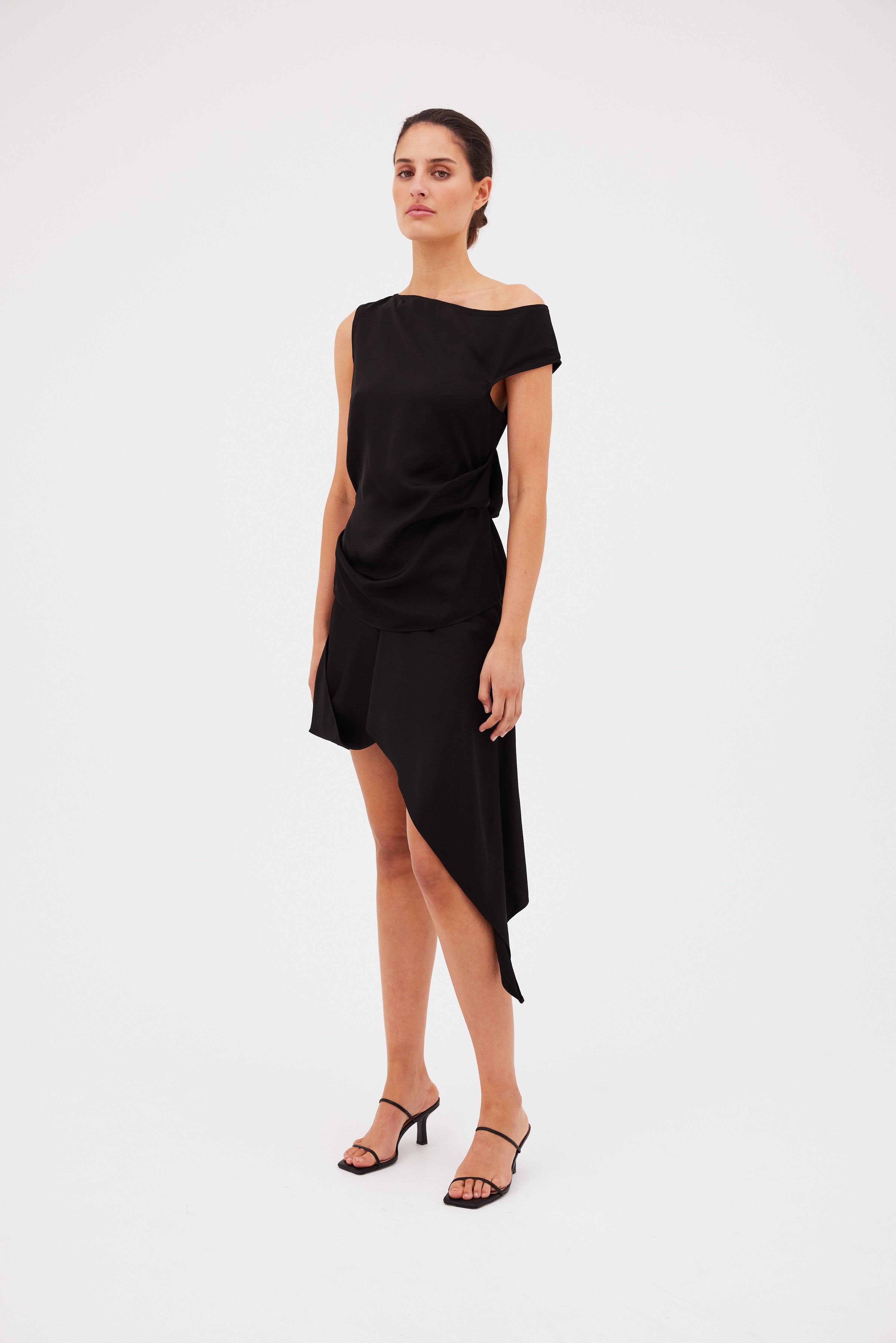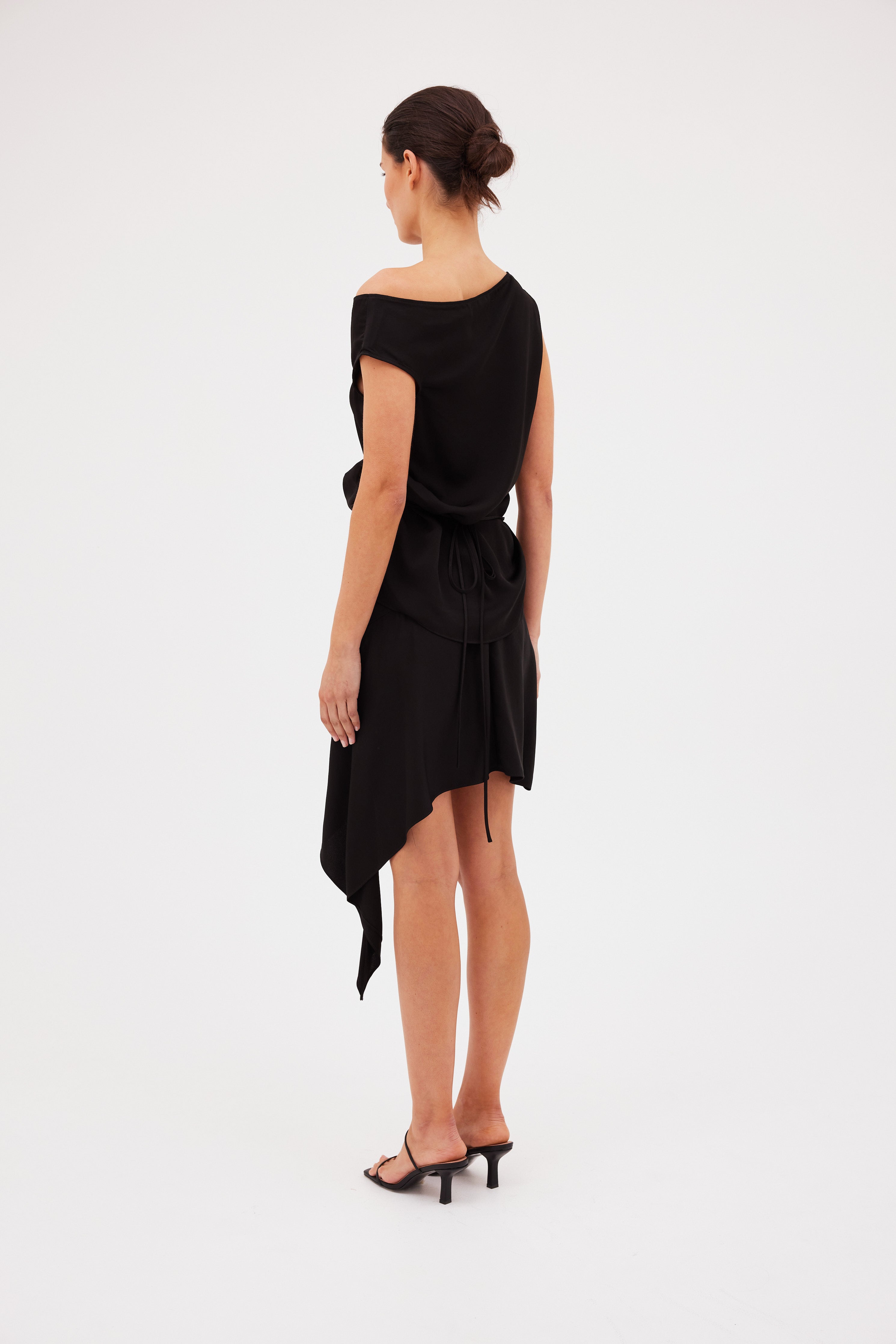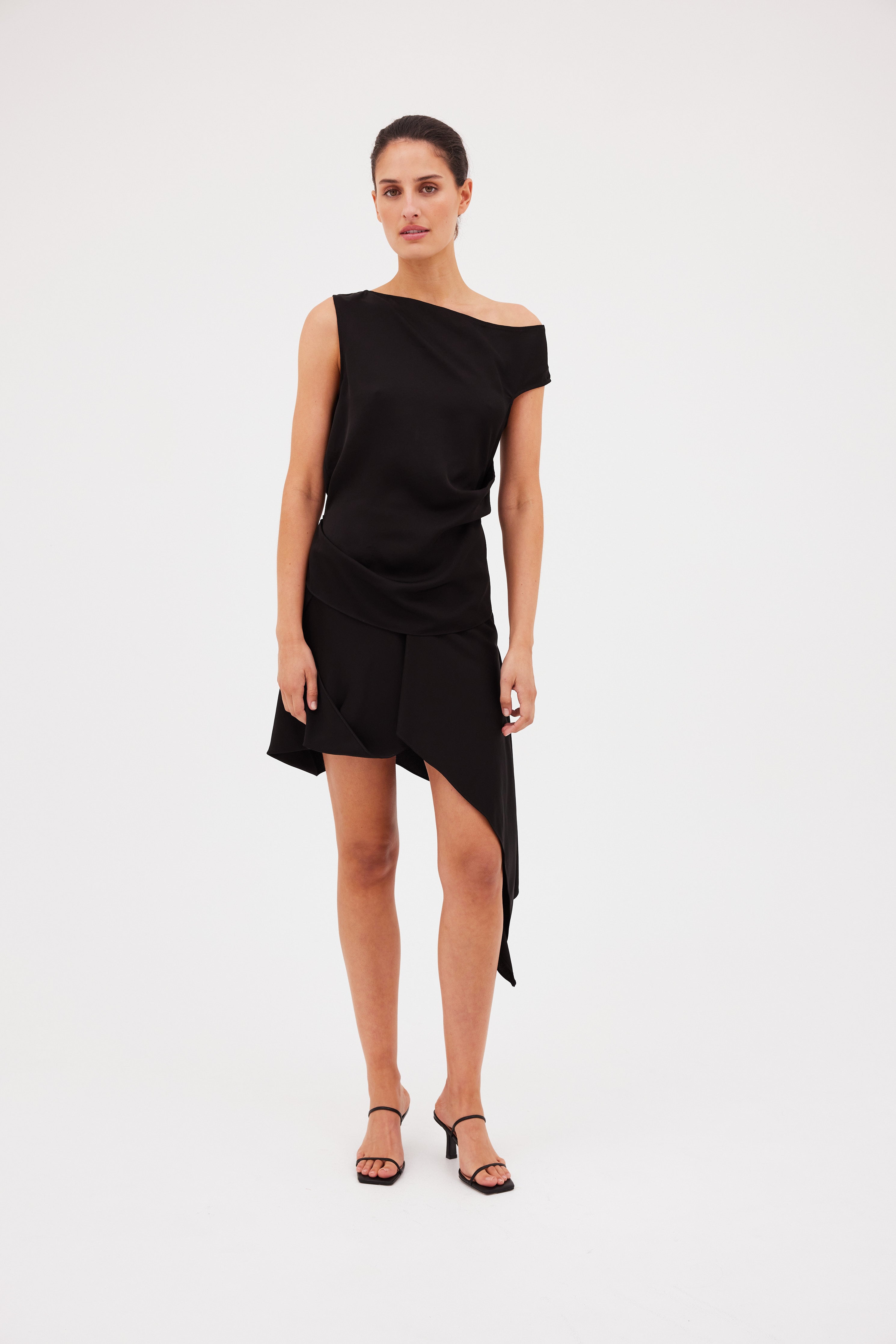 Introducing our Black Satin Crepe Vice Top, perfect for adding a touch of style to any outfit. Cut to elegantly contour figure, the top features a cowl neck, off-shoulder design, and ties at the back for an adjustable fit. Soft and feminine, this timeless piece is sure to become a wardrobe staple.