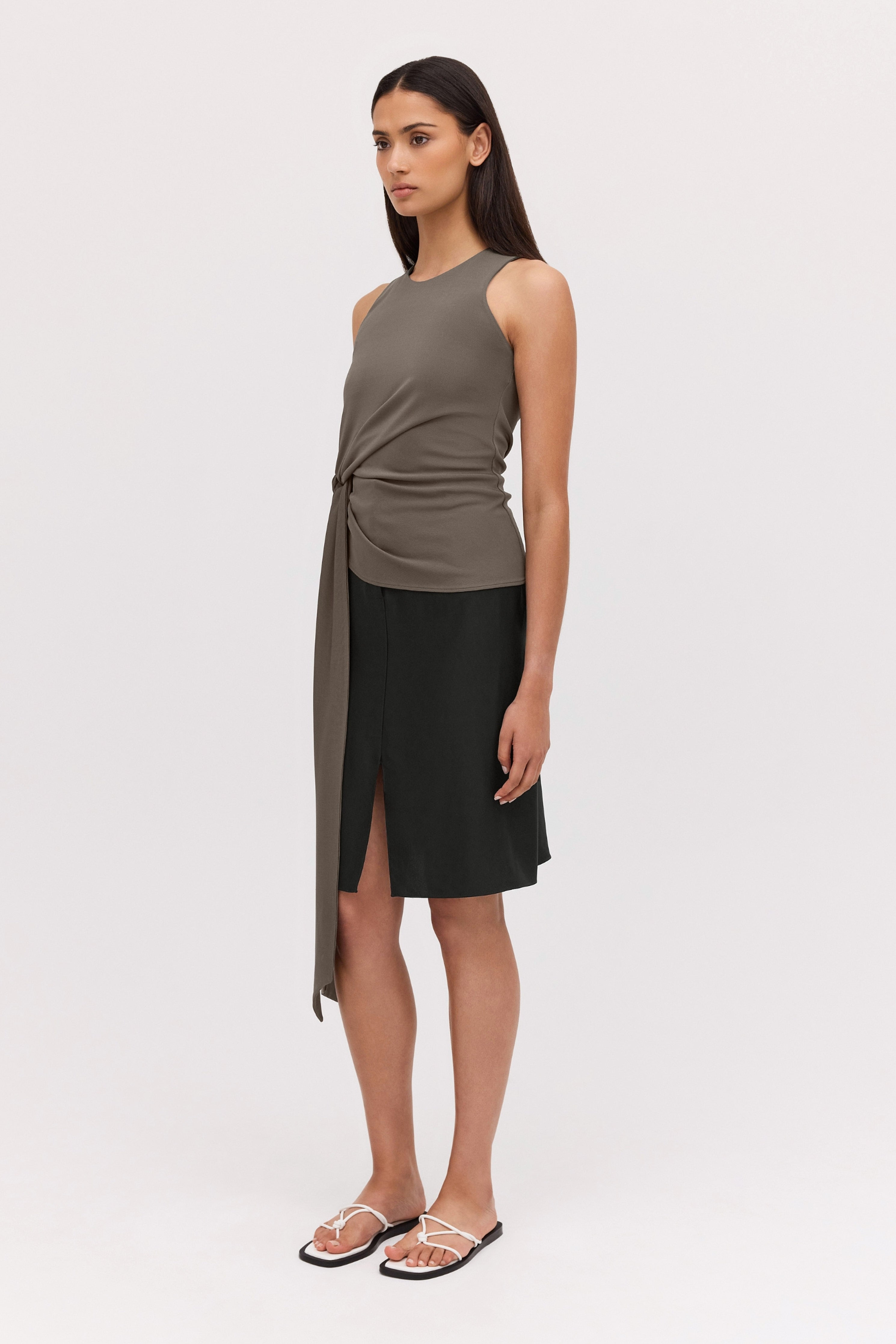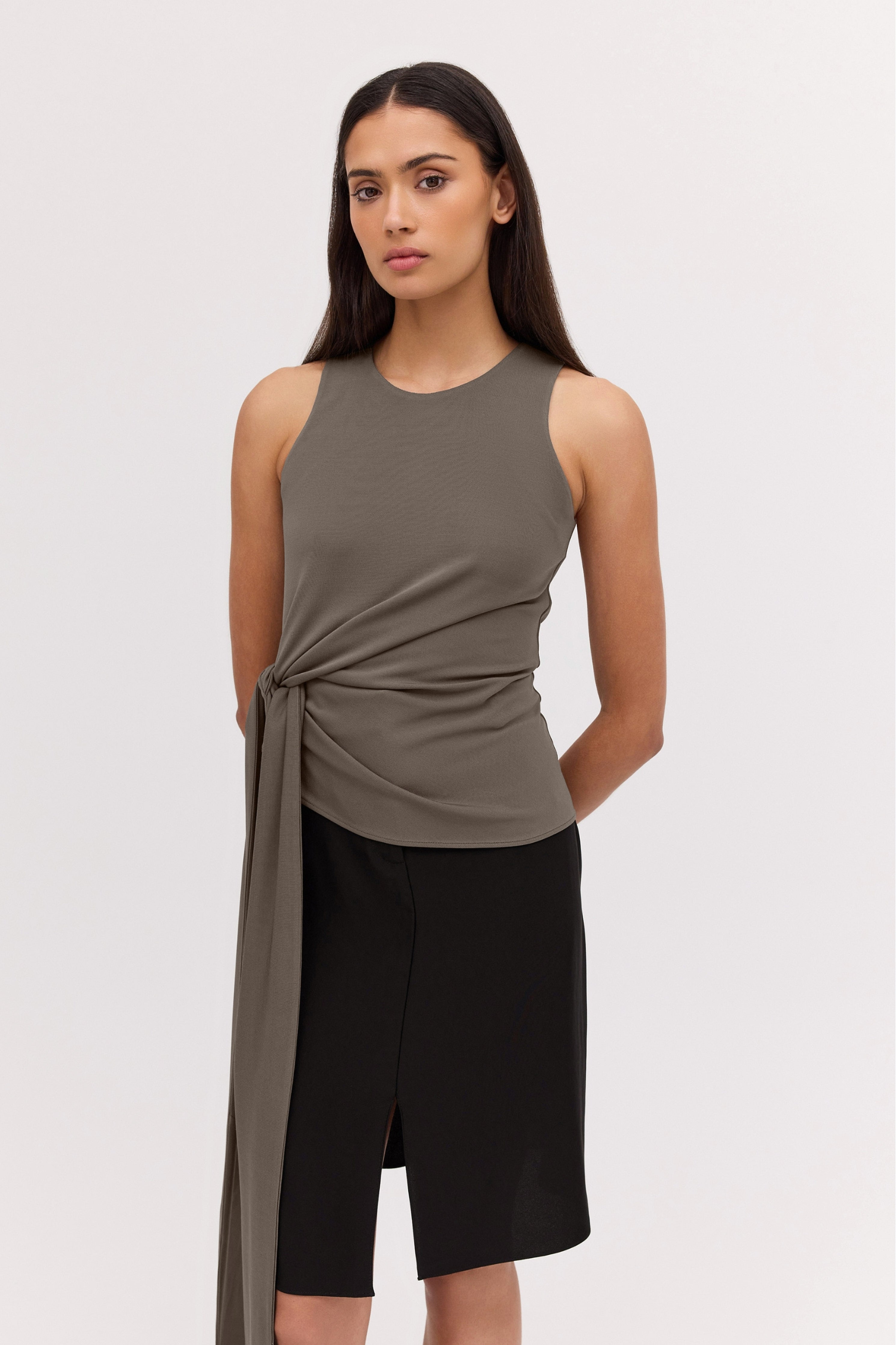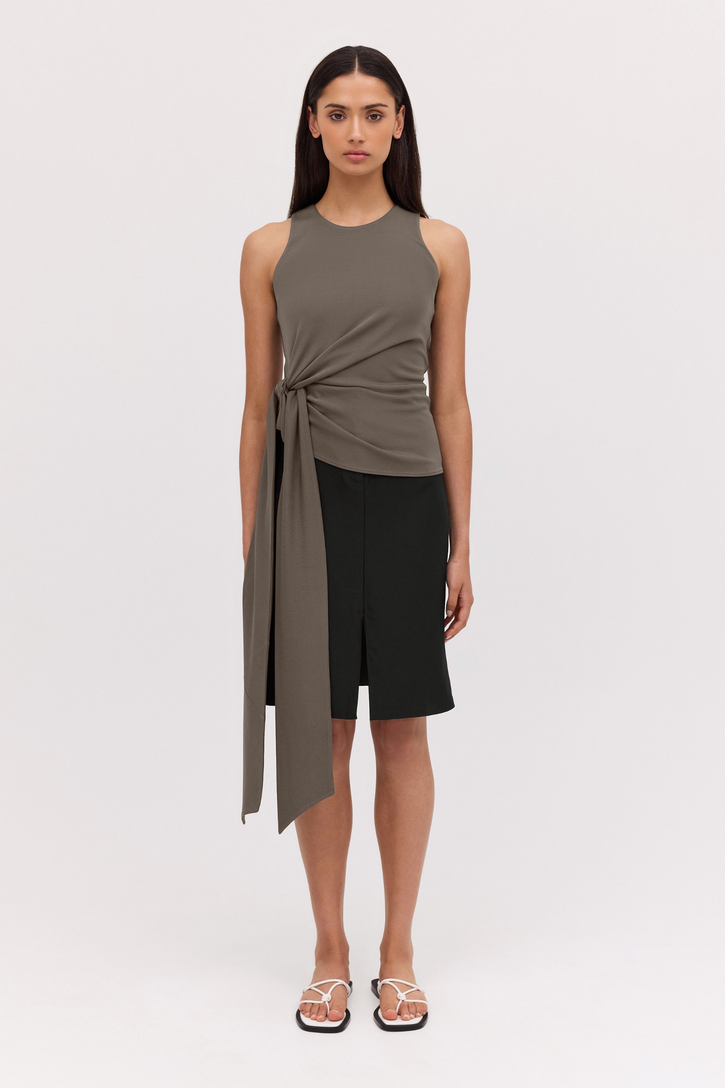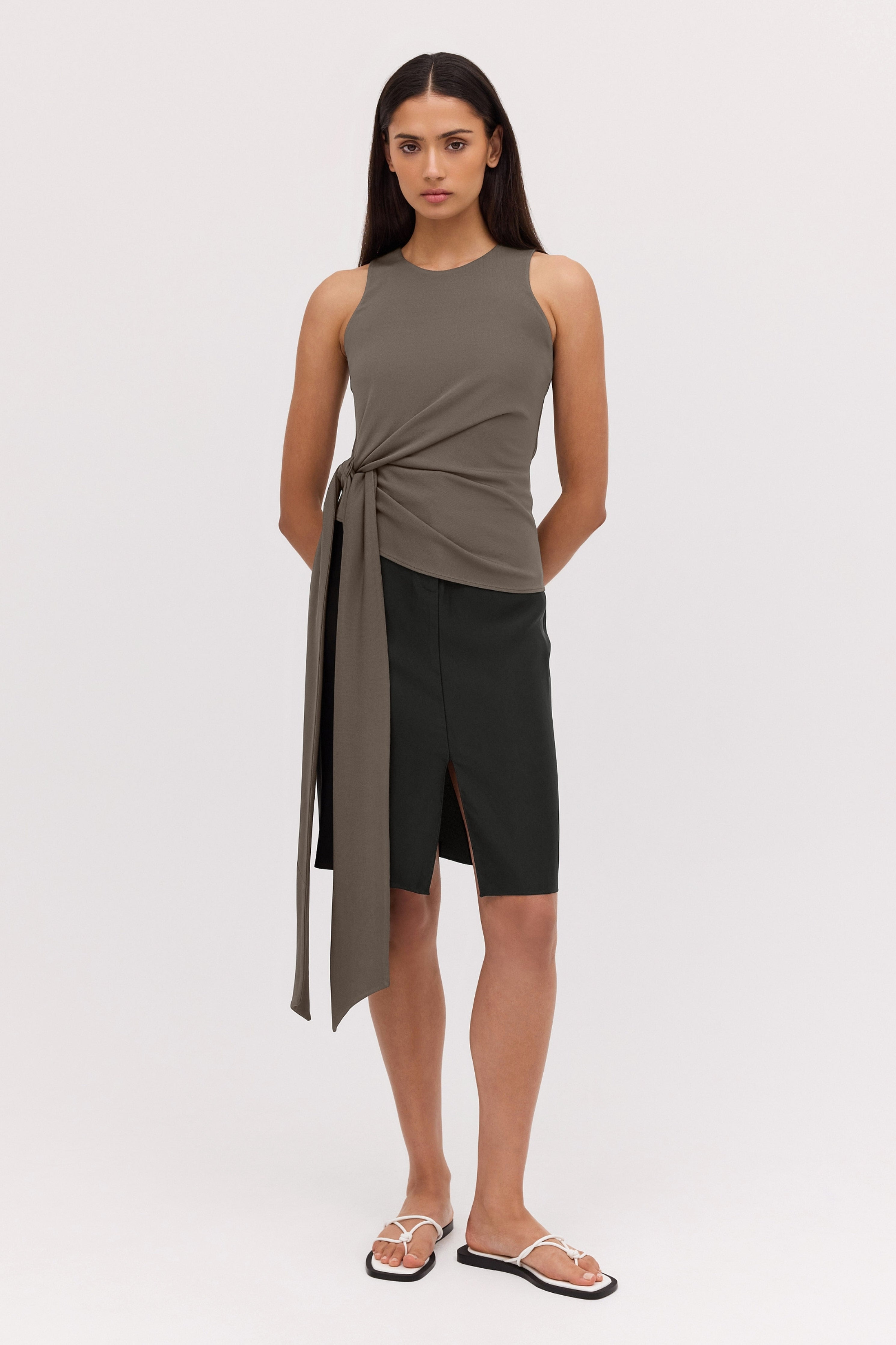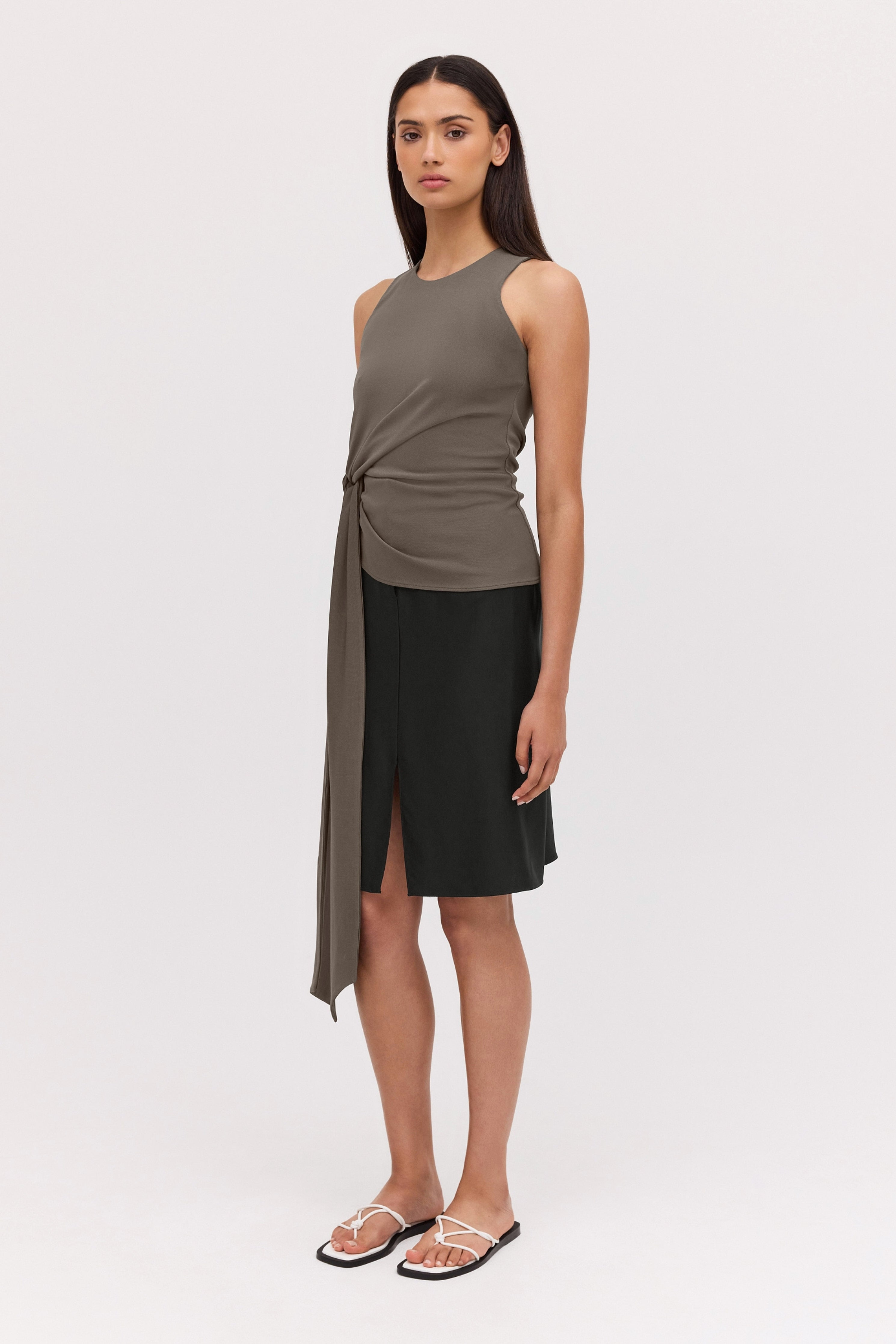 Building off winning elements from the Aesthete dress, with ties wrapping at flattering angles around the waist adding drama and distraction in elevated, easy wear and care, luxe Australian made jersey in a versatile sage hue. Fitted to the body, the top slips over the head with the ease of a short back neck zip.