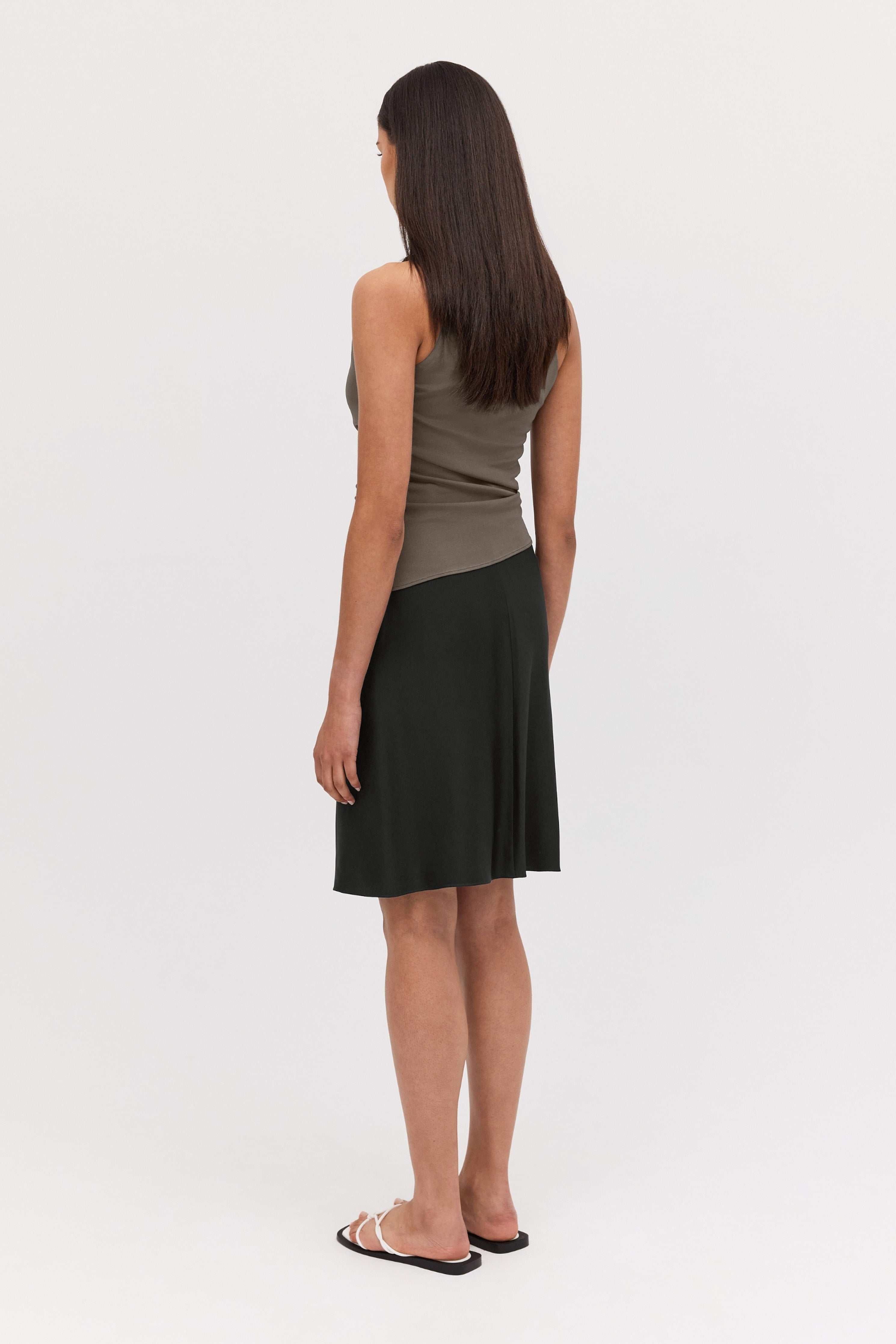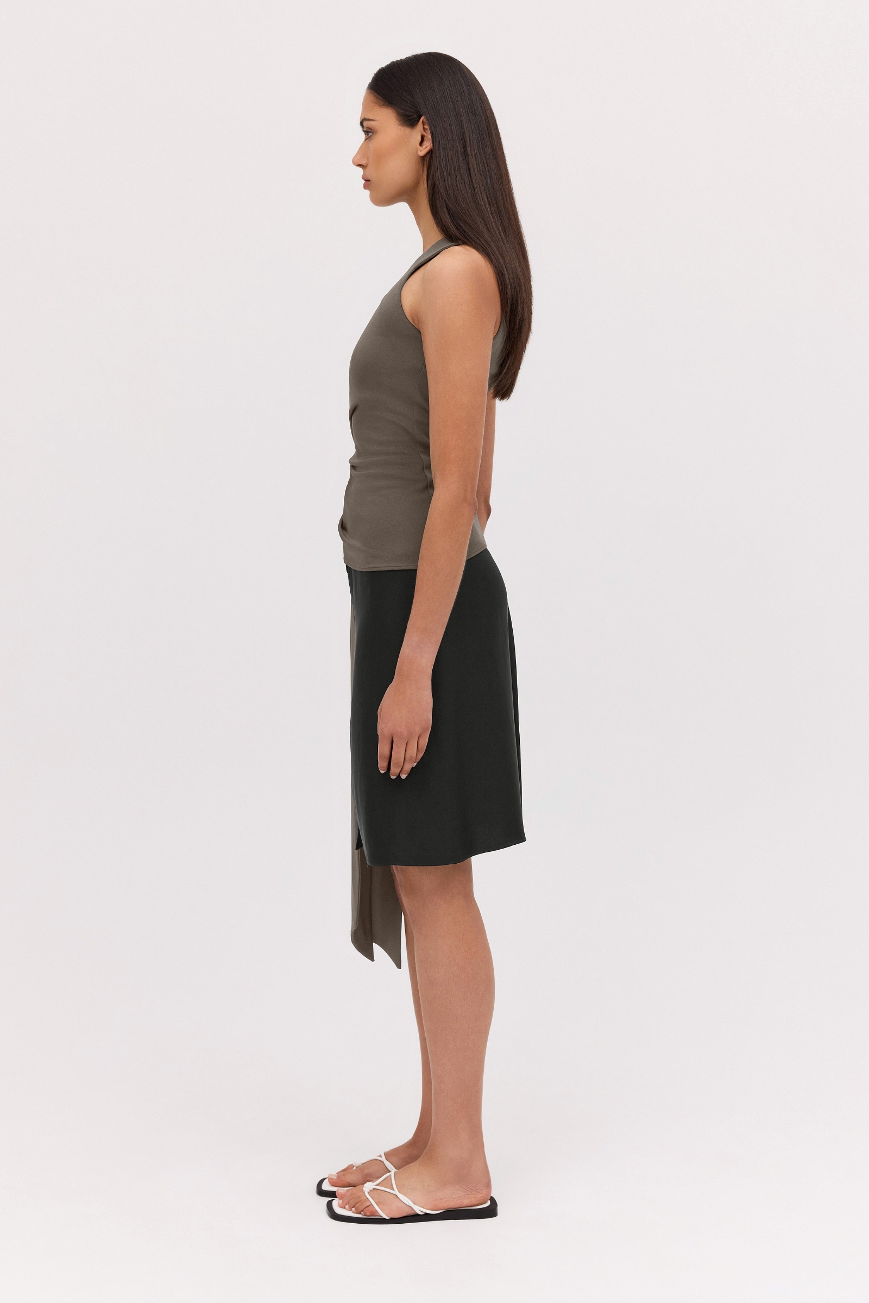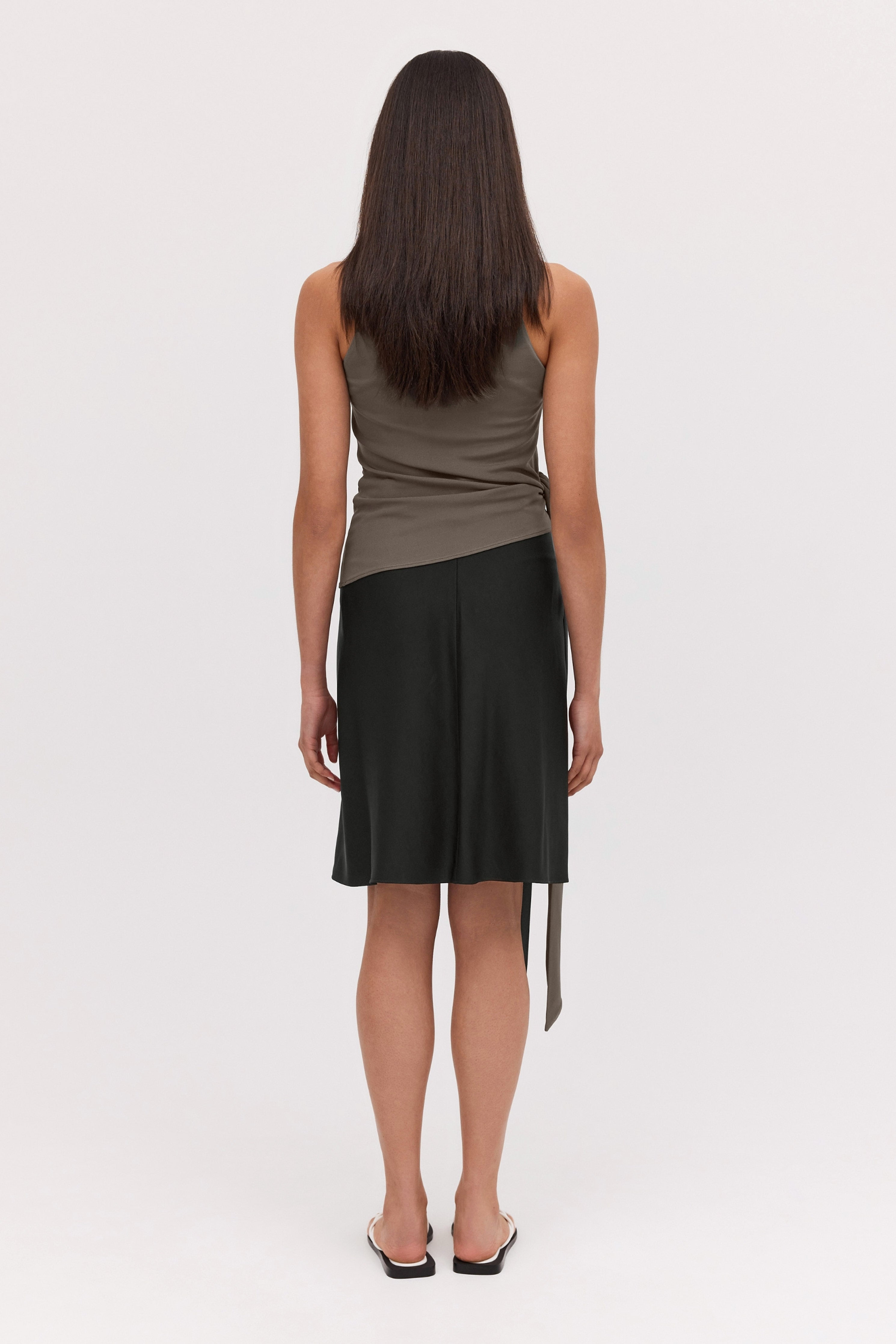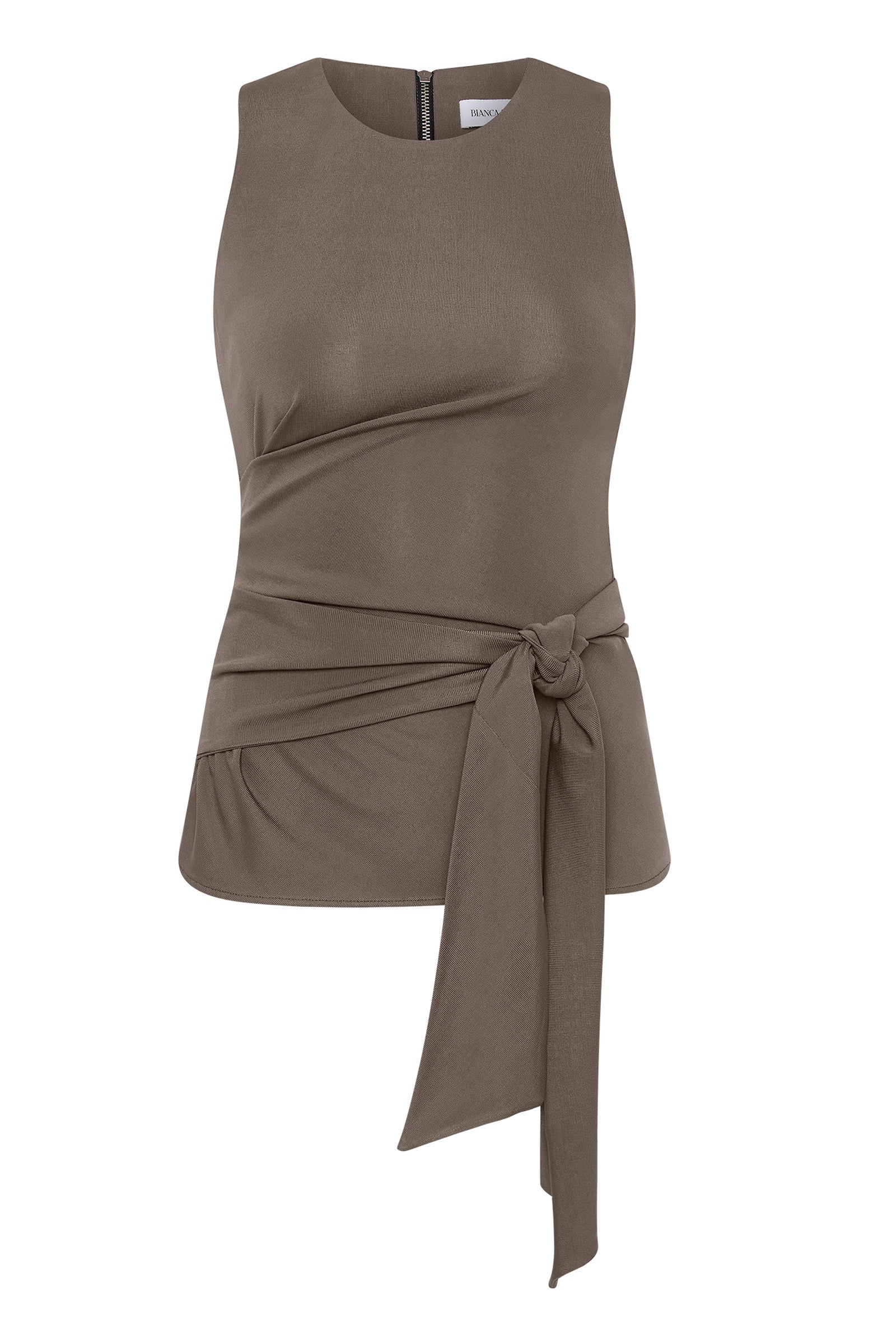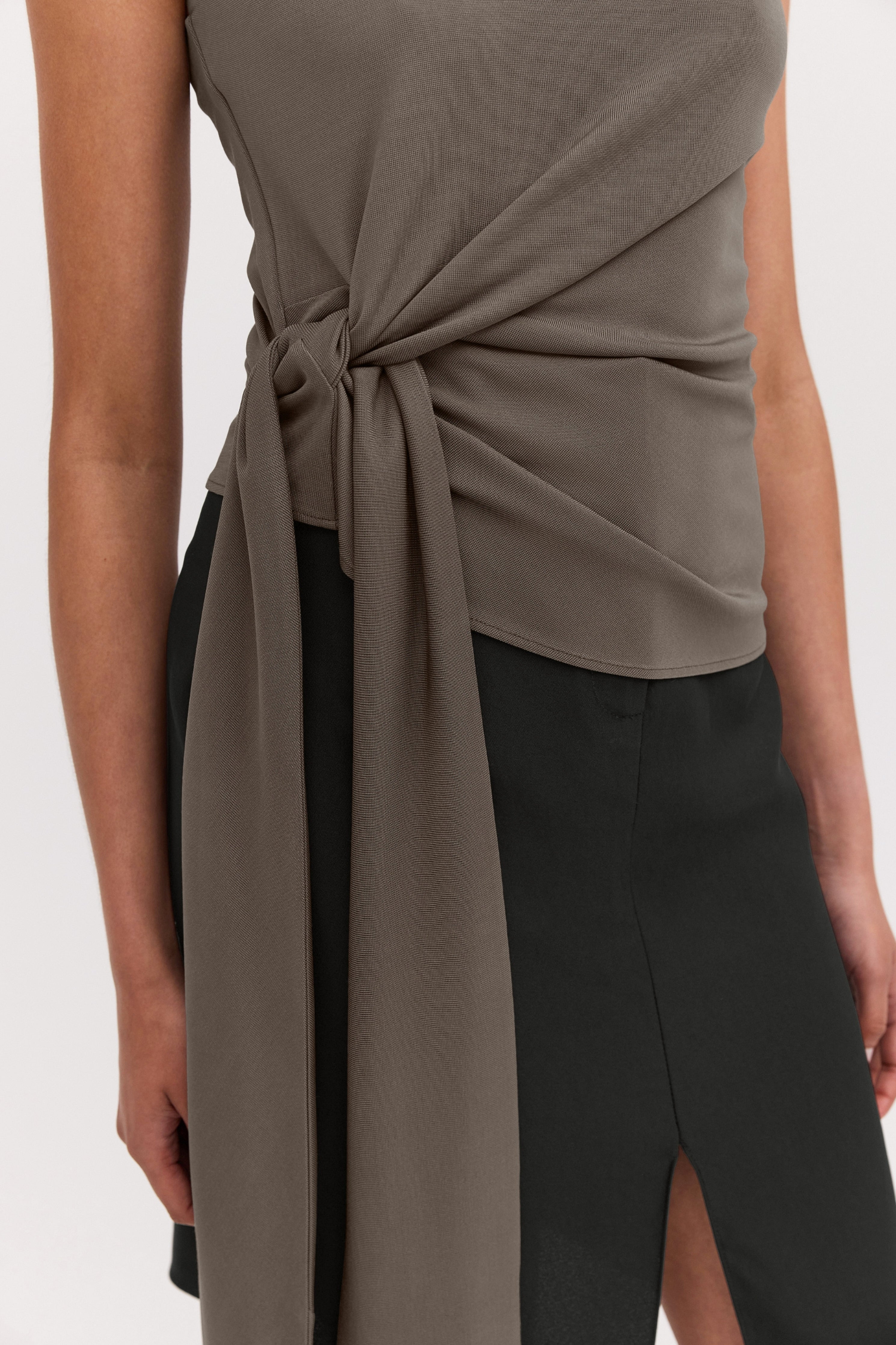 Building off winning elements from the Aesthete dress, with ties wrapping at flattering angles around the waist adding drama and distraction in elevated, easy wear and care, luxe Australian made jersey in a versatile sage hue. Fitted to the body, the top slips over the head with the ease of a short back neck zip.