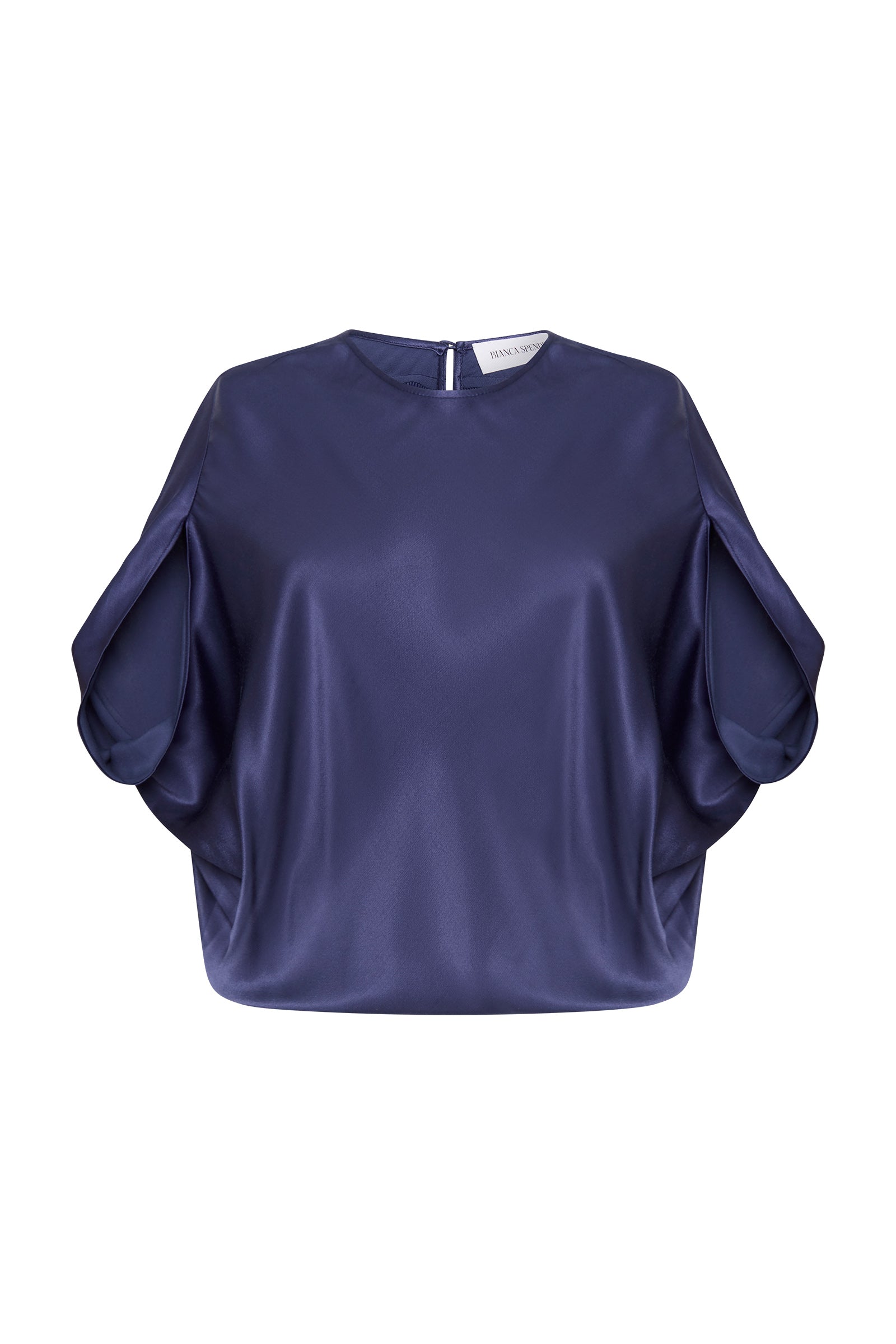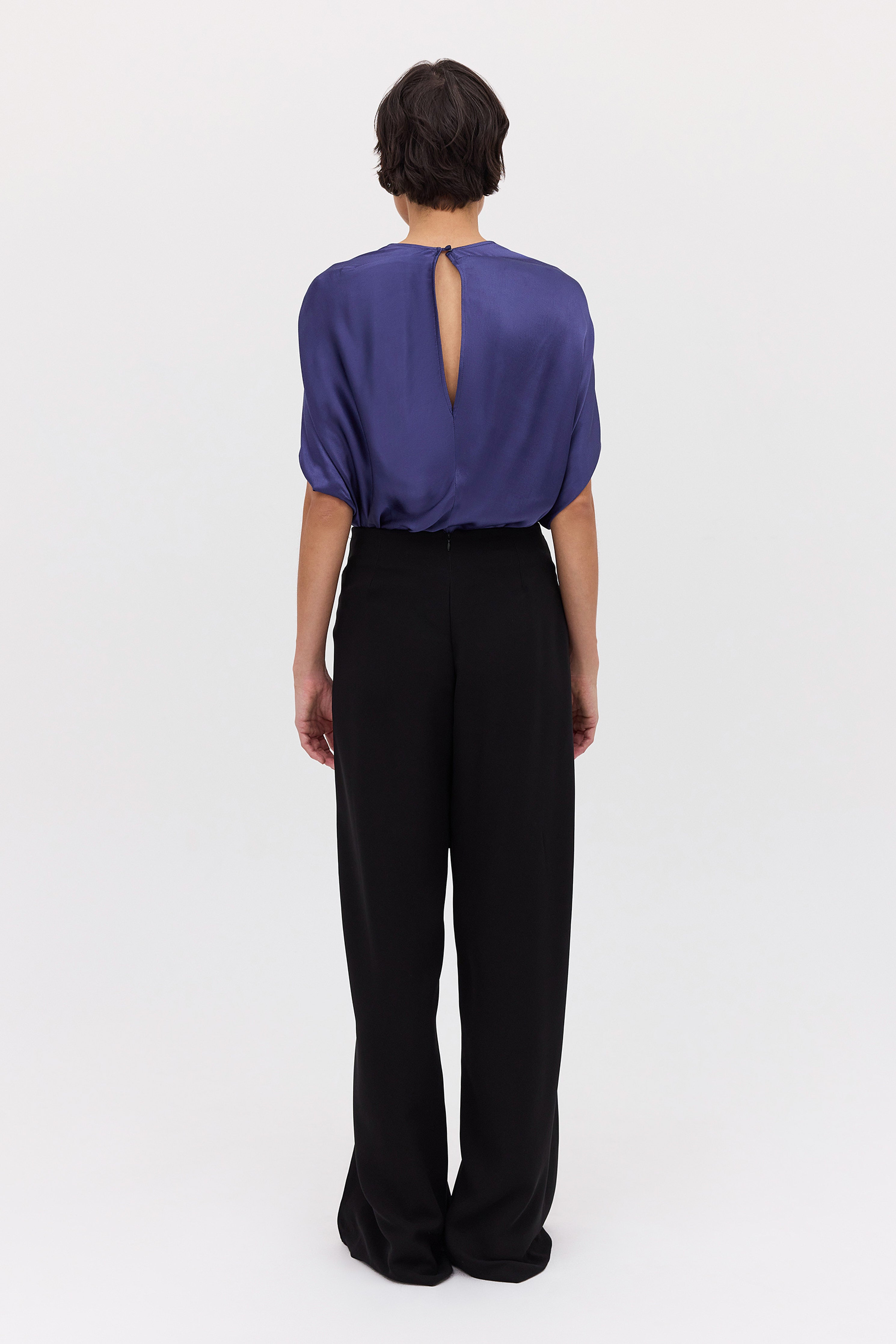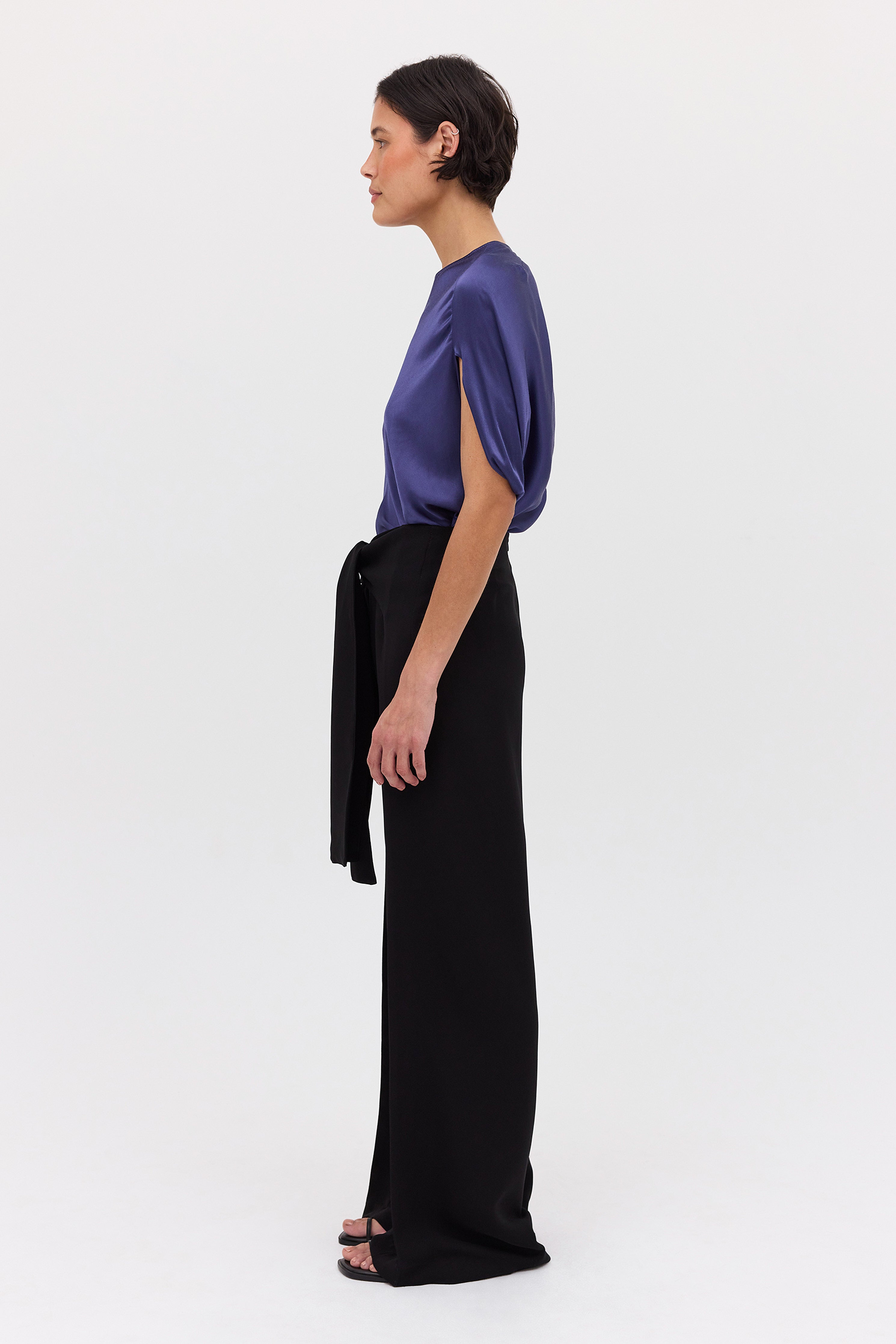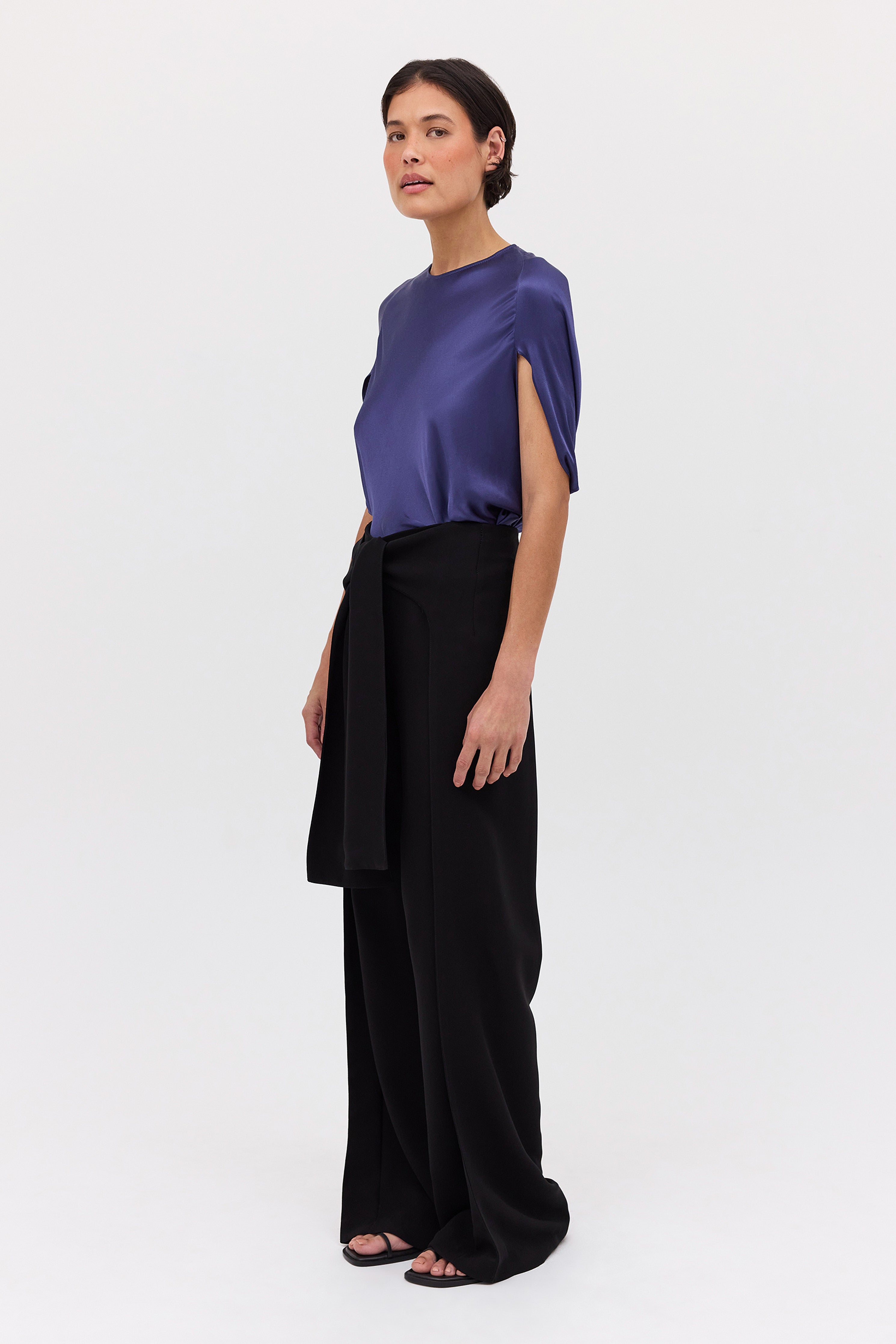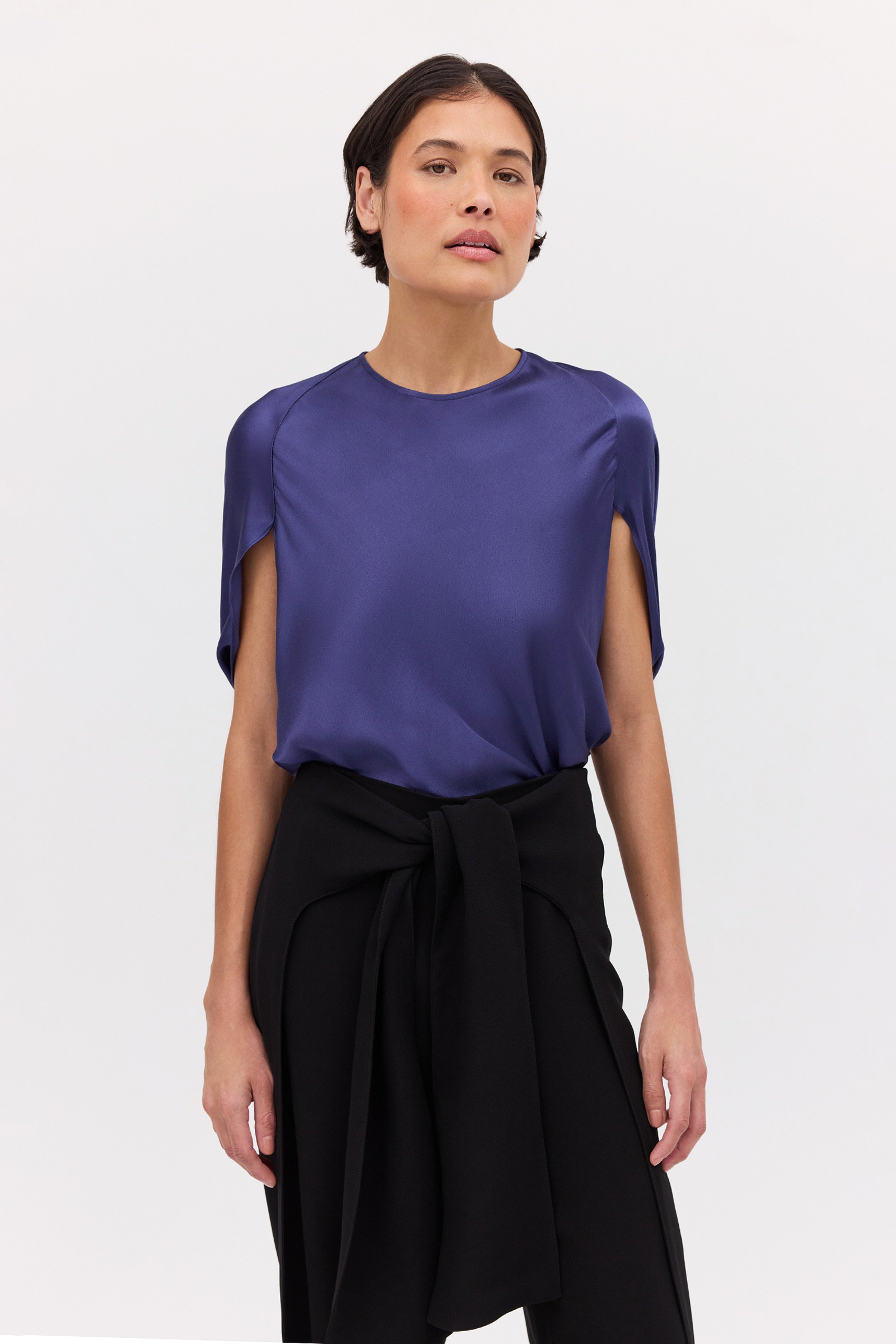 Subtly subversive, the Midnight Satin Crawford top is an elegant expression of the Bianca Spender T-shirt. The perfect style to pair back with everything in your wardrobe. Slit cut-out sleeves that drape down to the back of the elbow, fastened with a single button at the back of the neck. Designed to fall just above the hip.