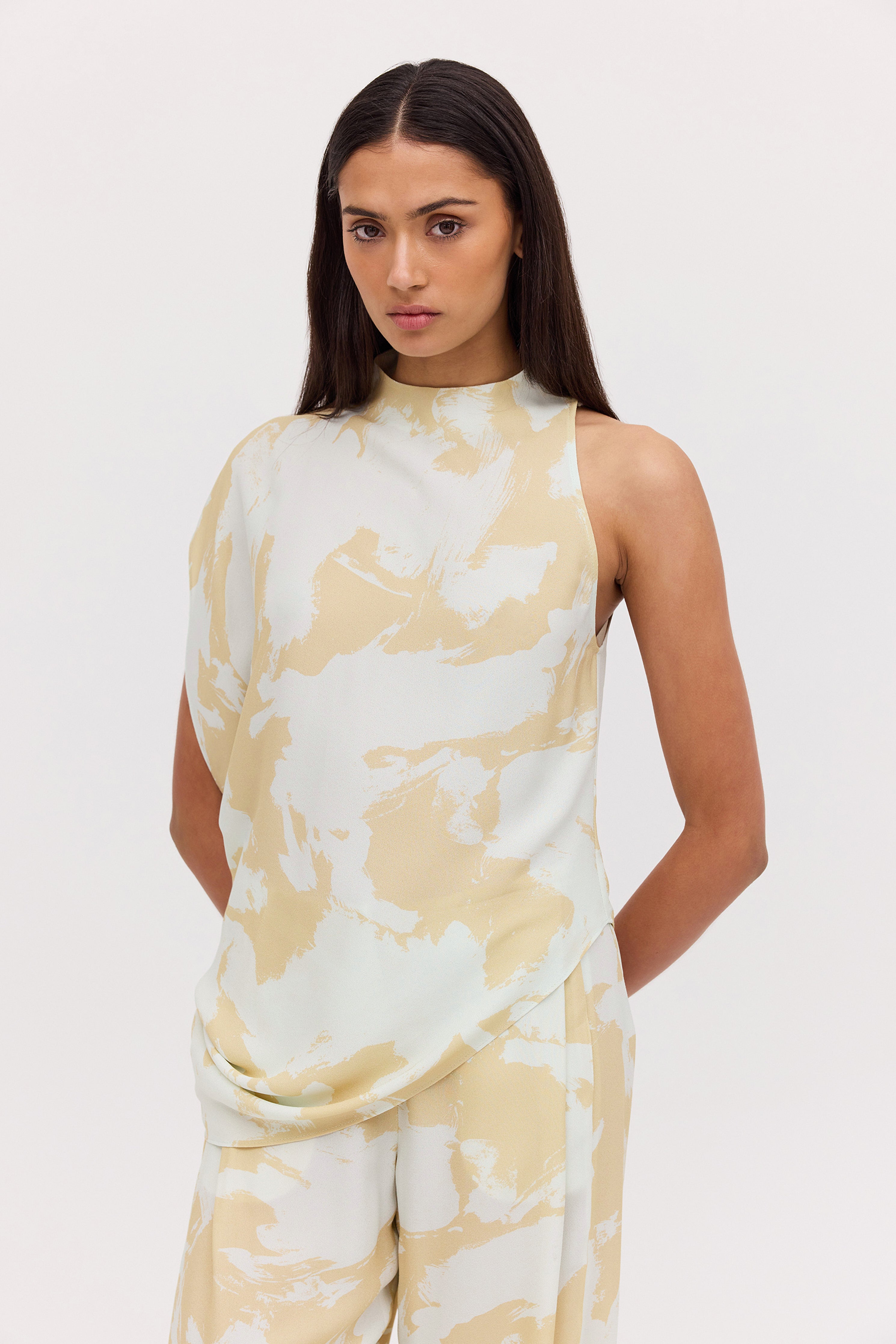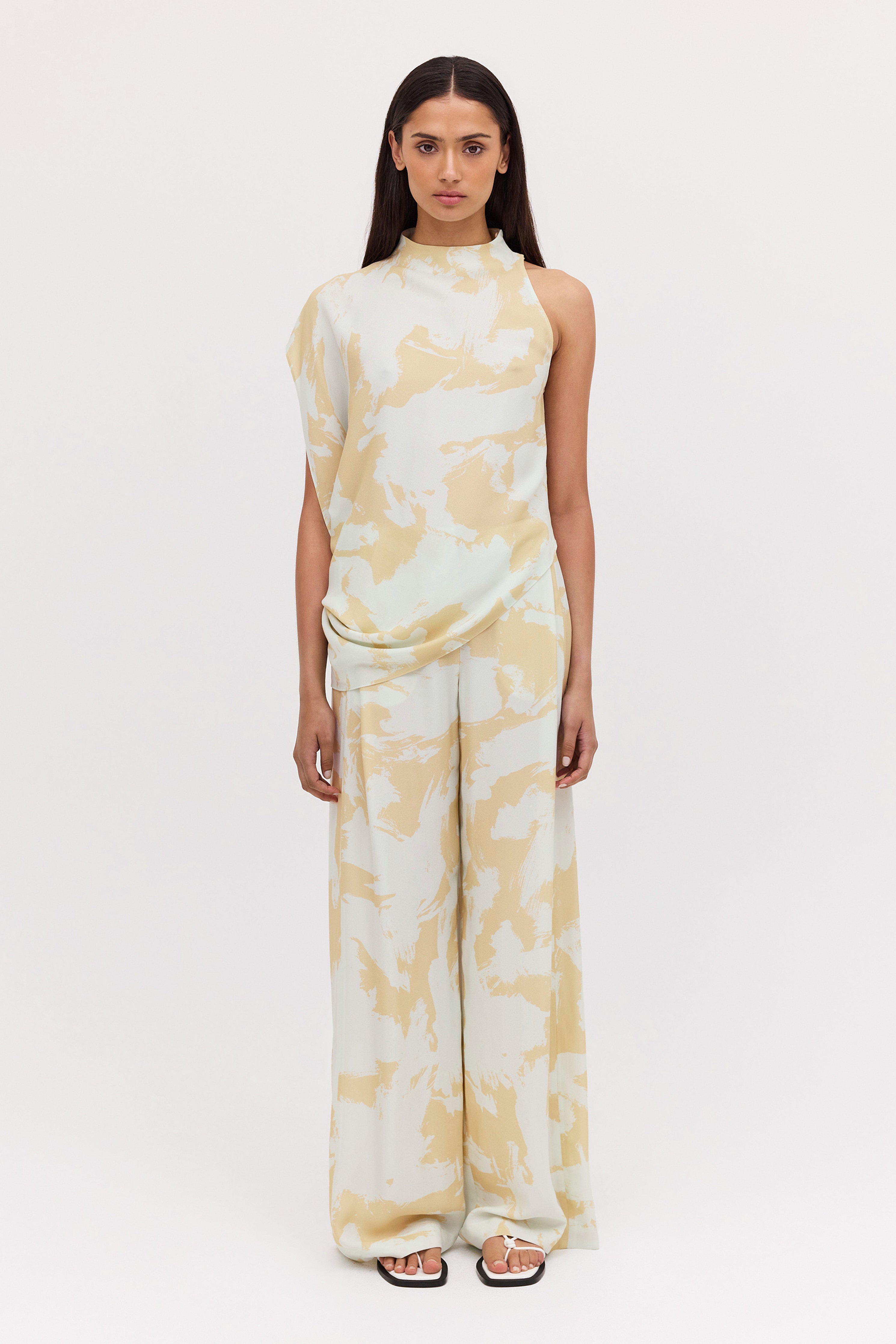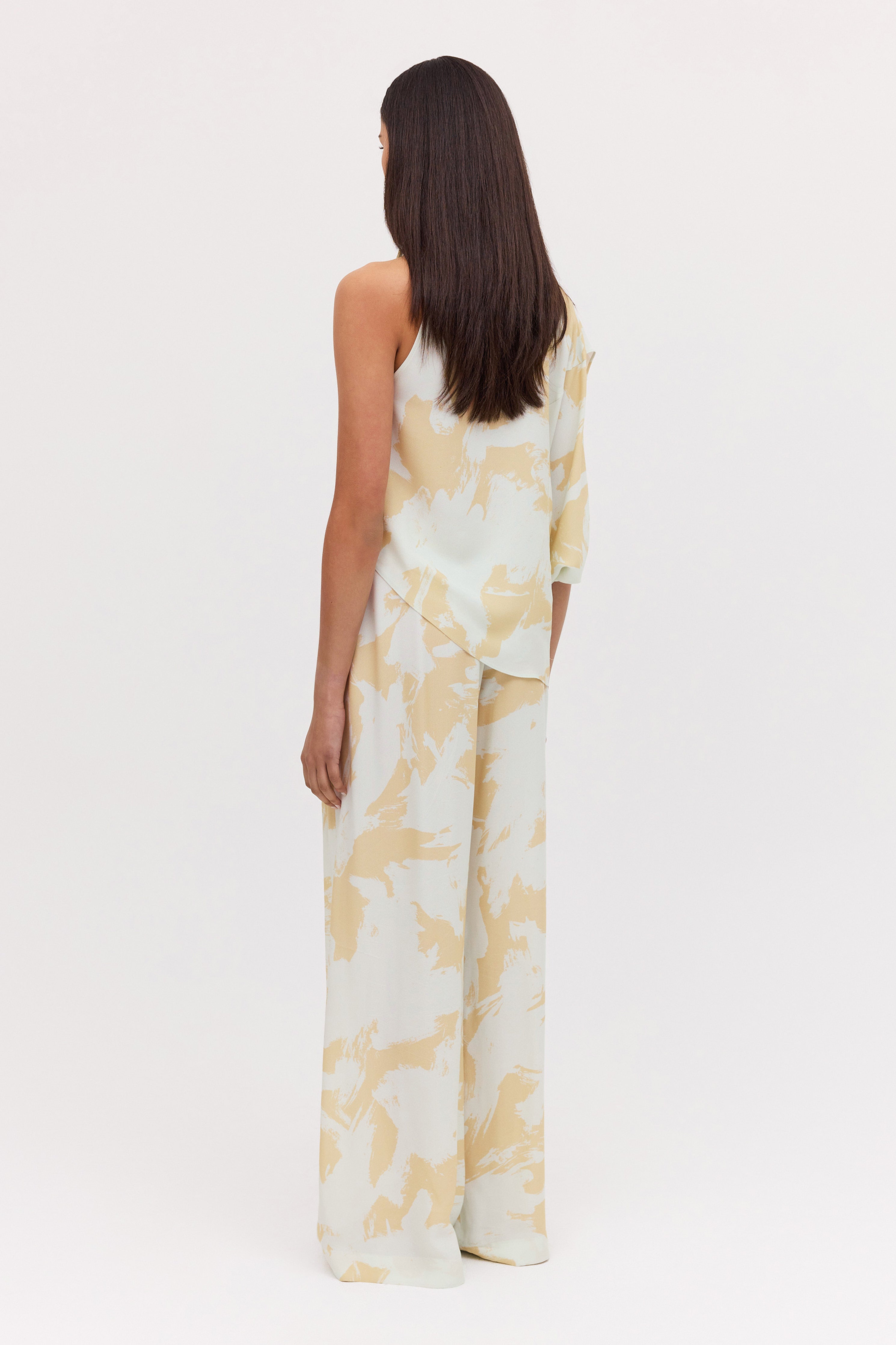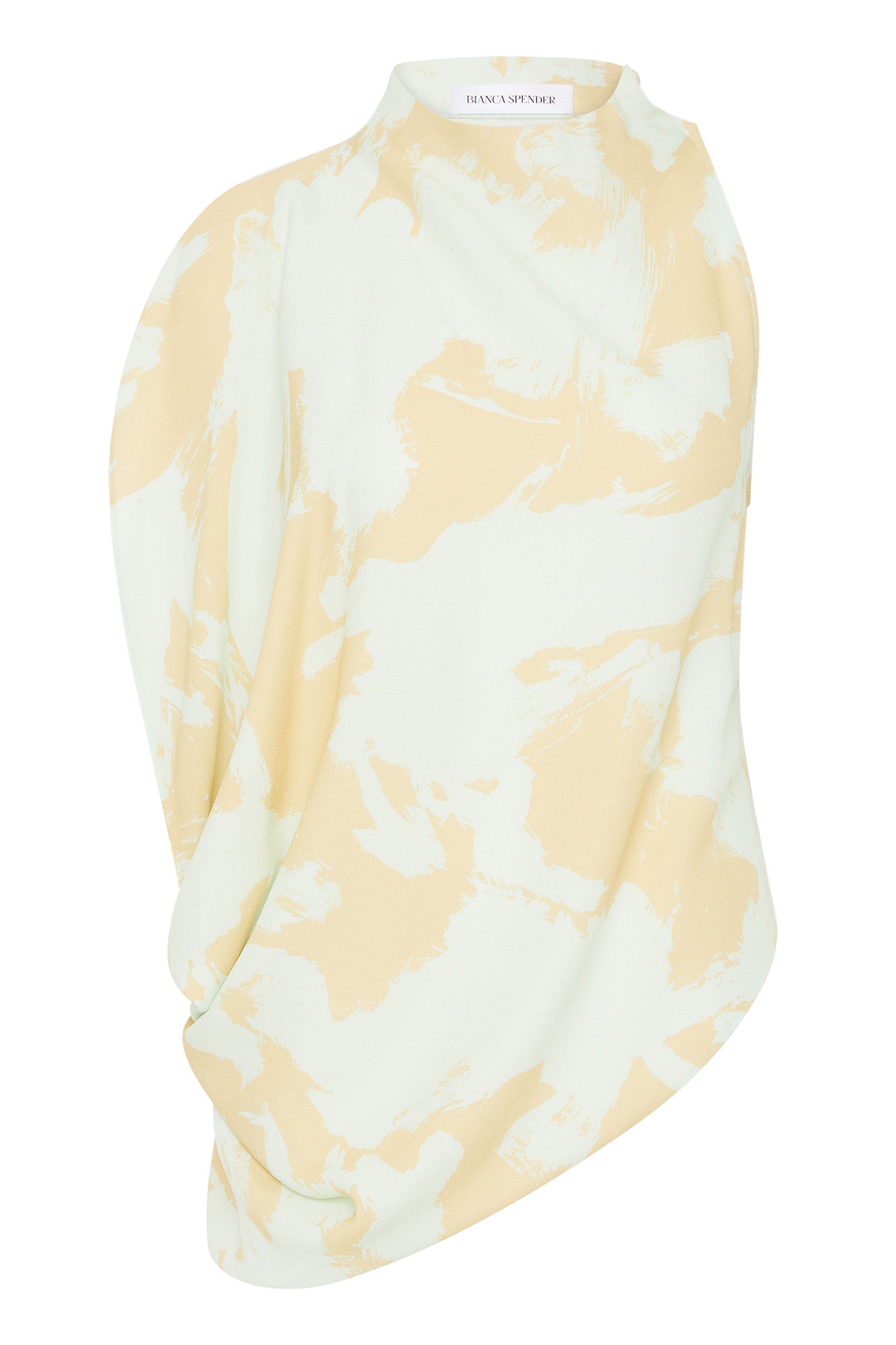A modern classic. The Mint Bloom Crepe Infinite Top is a fresh take on the timeless t-shirt. Featuring an asymmetrical one-shoulder design, that fluidly drapes into an asymmetrical hemline, giving a relaxed, effortlessly chic appearance. Covered buttons on the right shoulder add the final touch, showing that chic is all in the details.