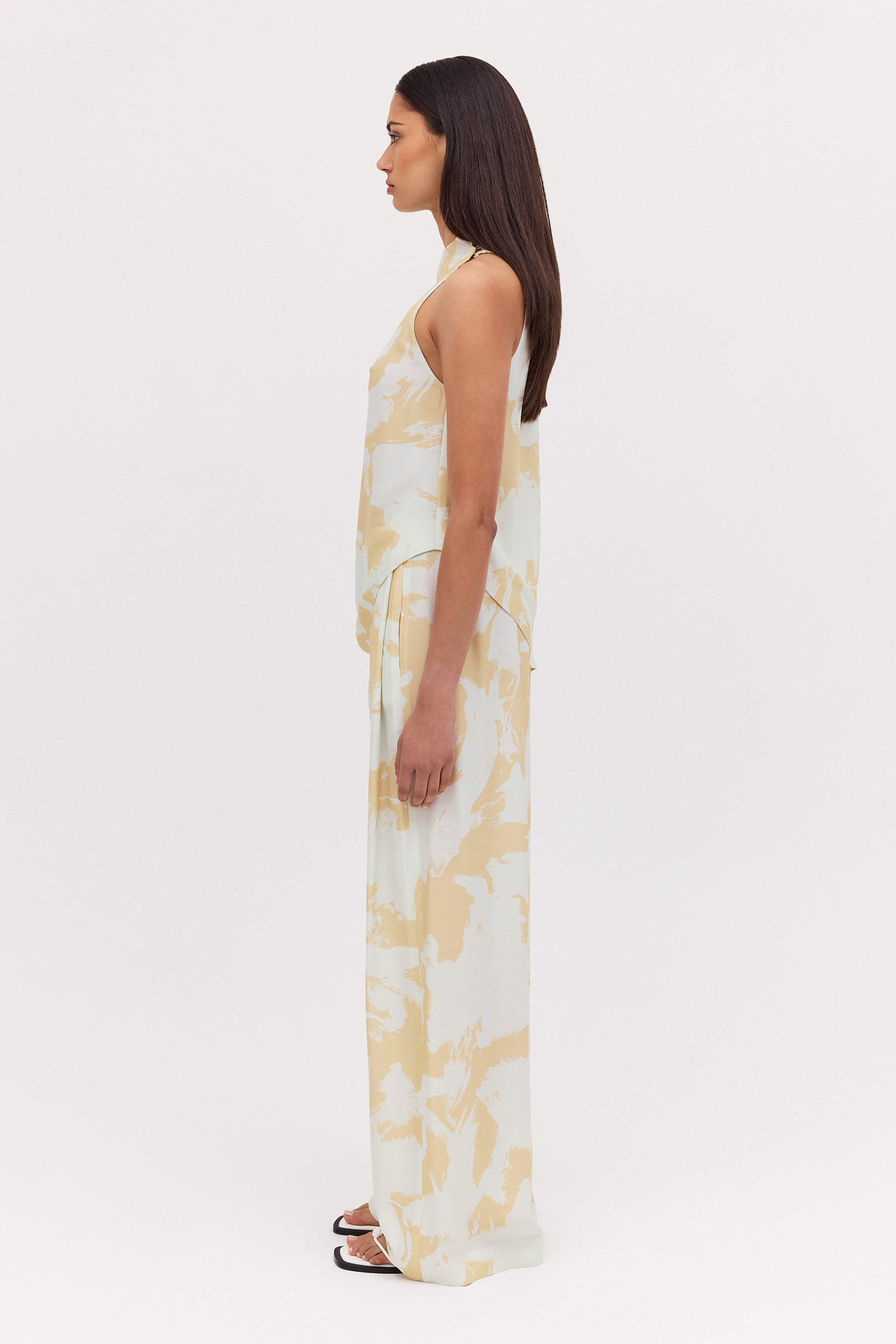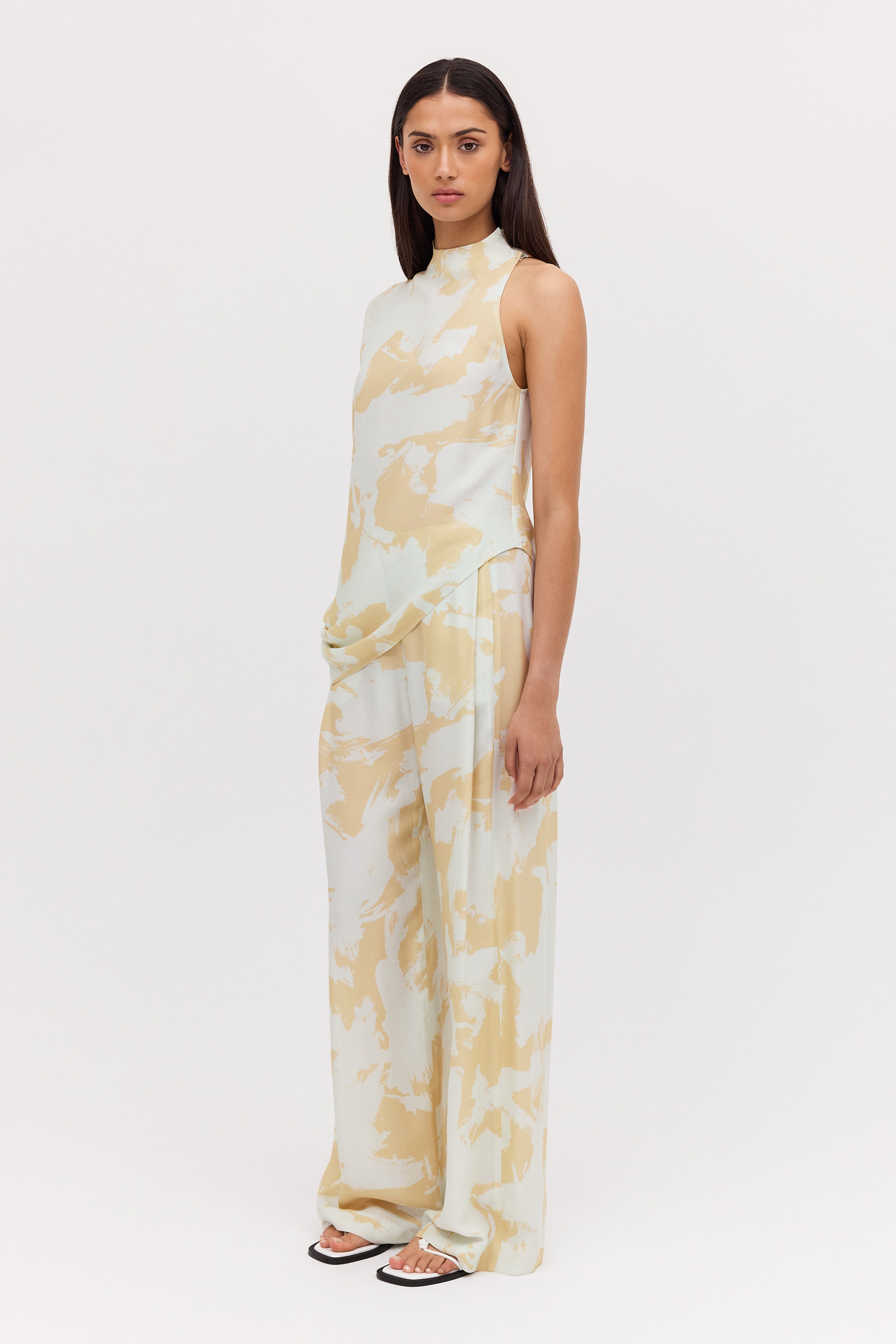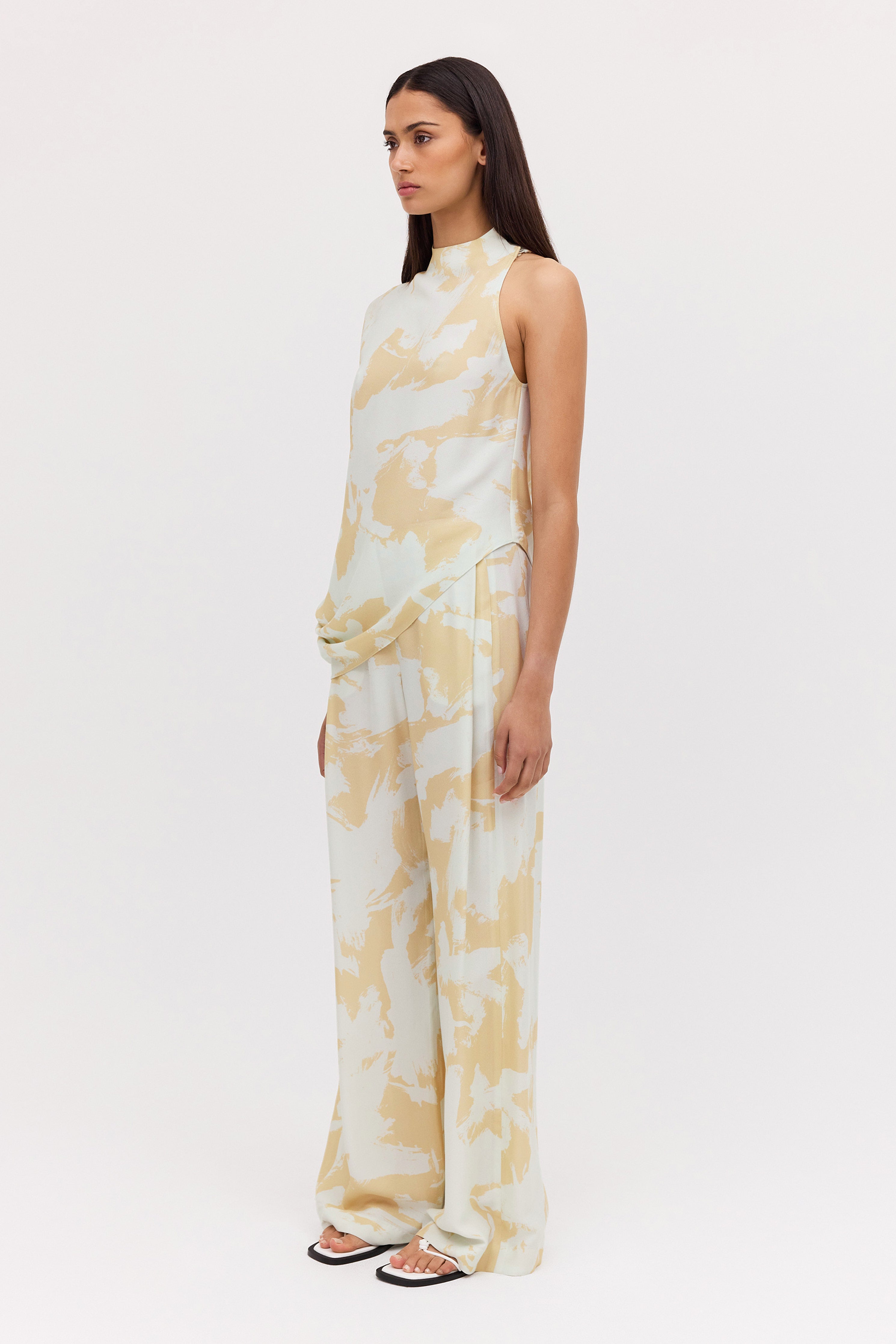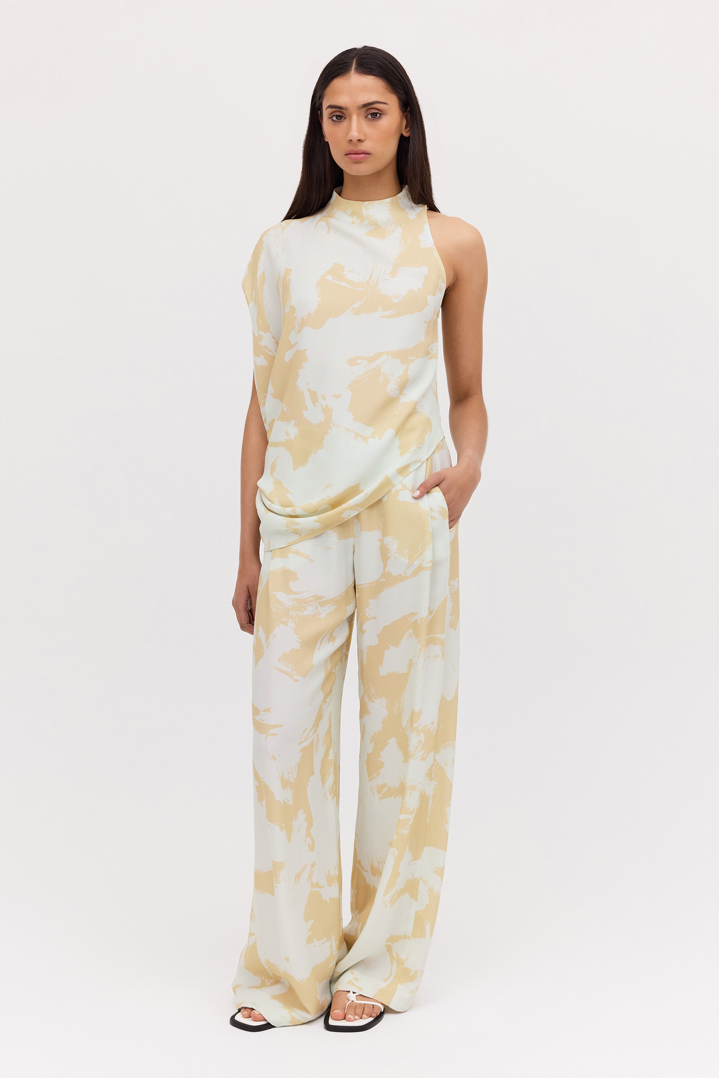 A modern classic. The Mint Bloom Crepe Infinite Top is a fresh take on the timeless t-shirt. Featuring an asymmetrical one-shoulder design, that fluidly drapes into an asymmetrical hemline, giving a relaxed, effortlessly chic appearance. Covered buttons on the right shoulder add the final touch, showing that chic is all in the details.