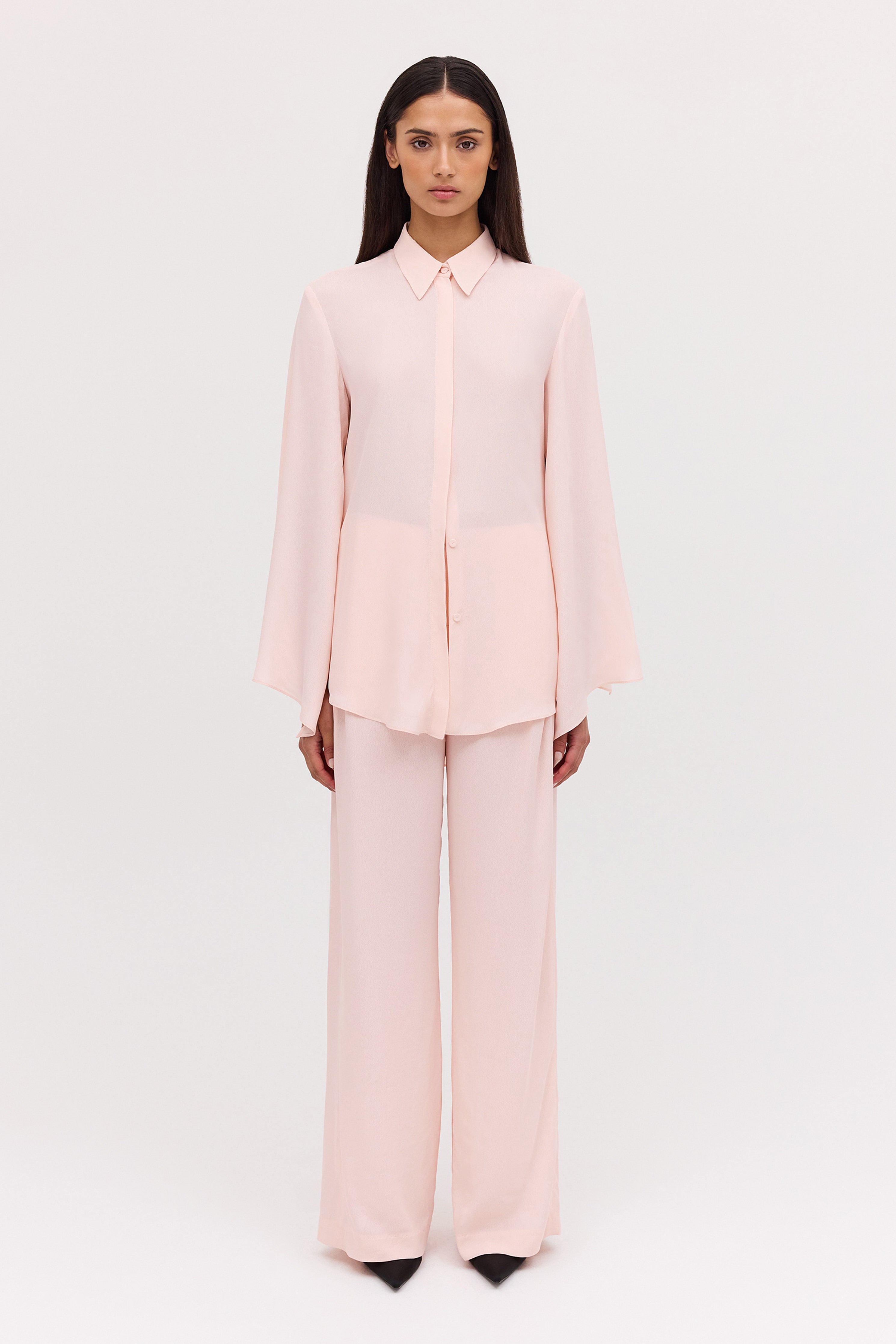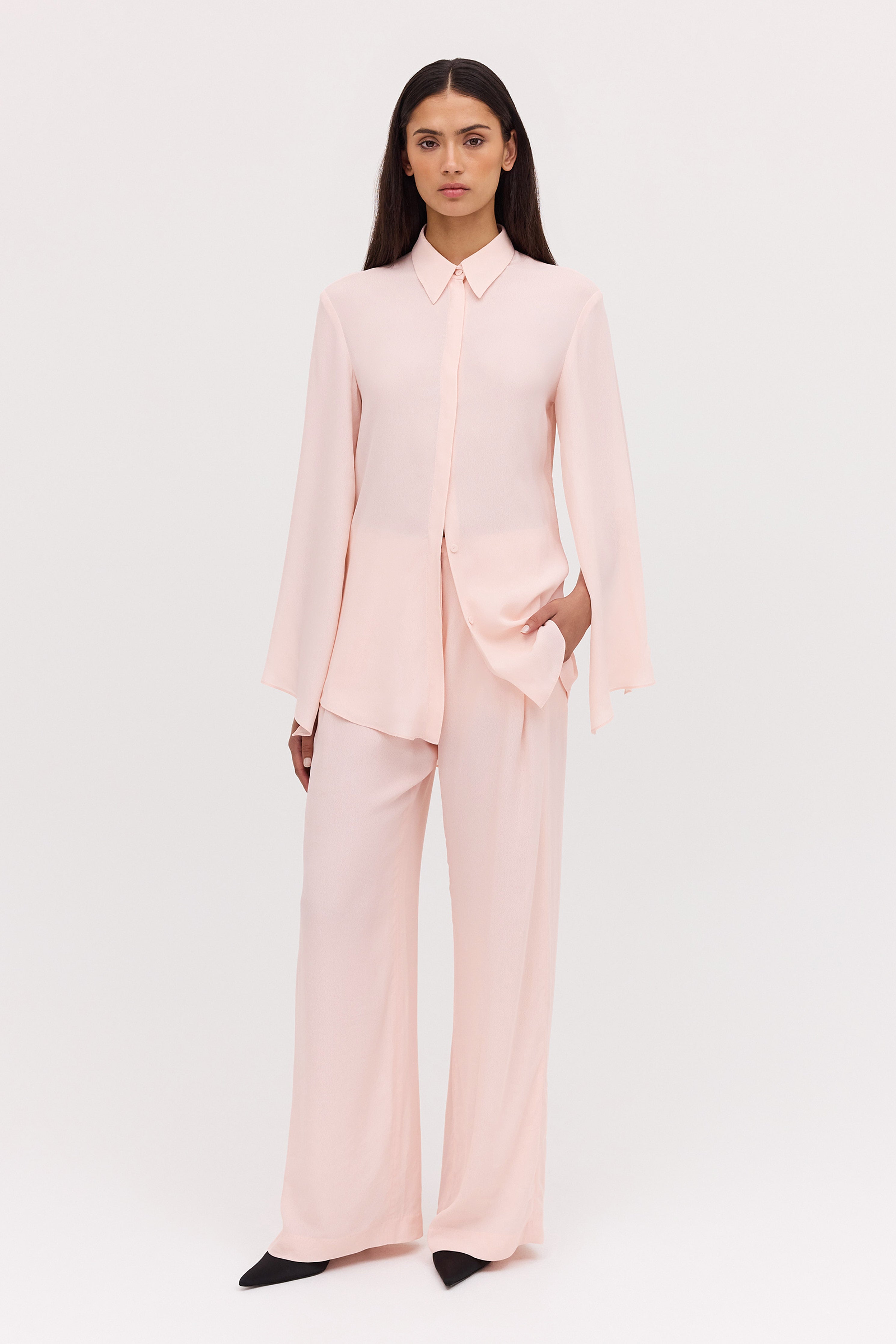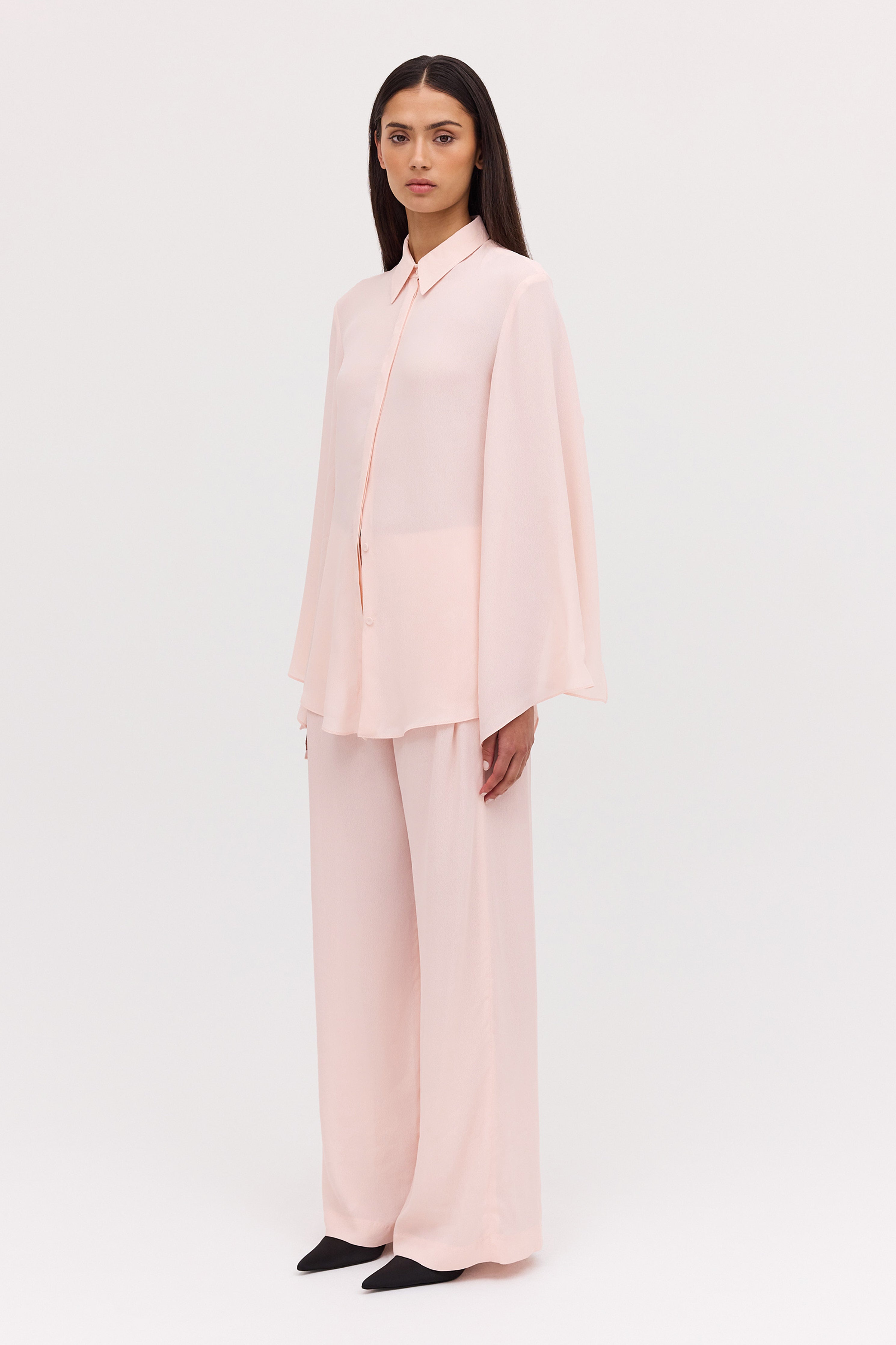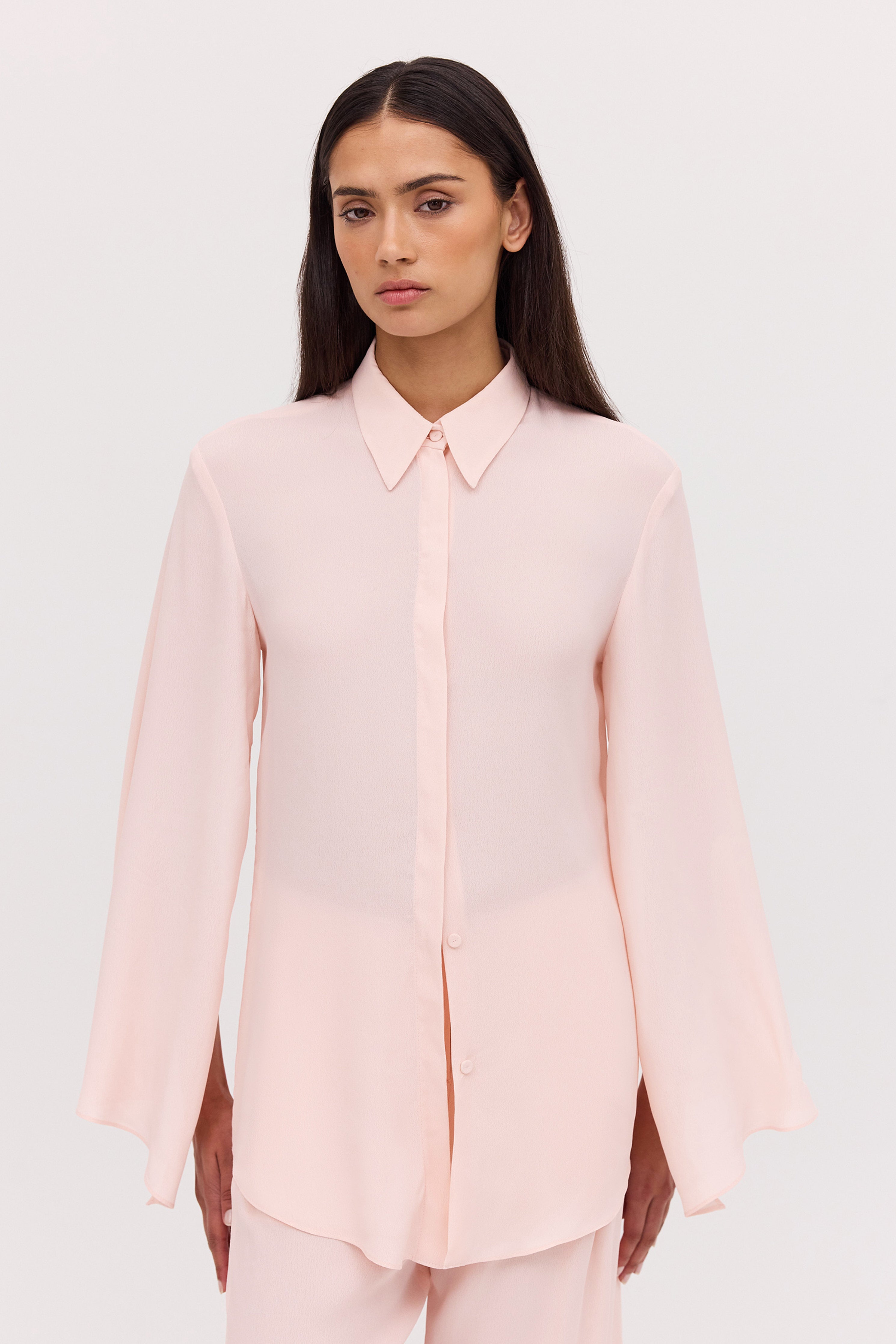 Elevate the everyday with the Pink Crinkle Crepe Absolute Shirt. A modern take on the classic white shirt, designed to take you through the changing seasons effortlessly. Crafted from a crisp, low-maintenance viscose, with soft gentle drape and splits through the sleeve, giving a cape-like feel and allowing a sense of air and movement around the body.