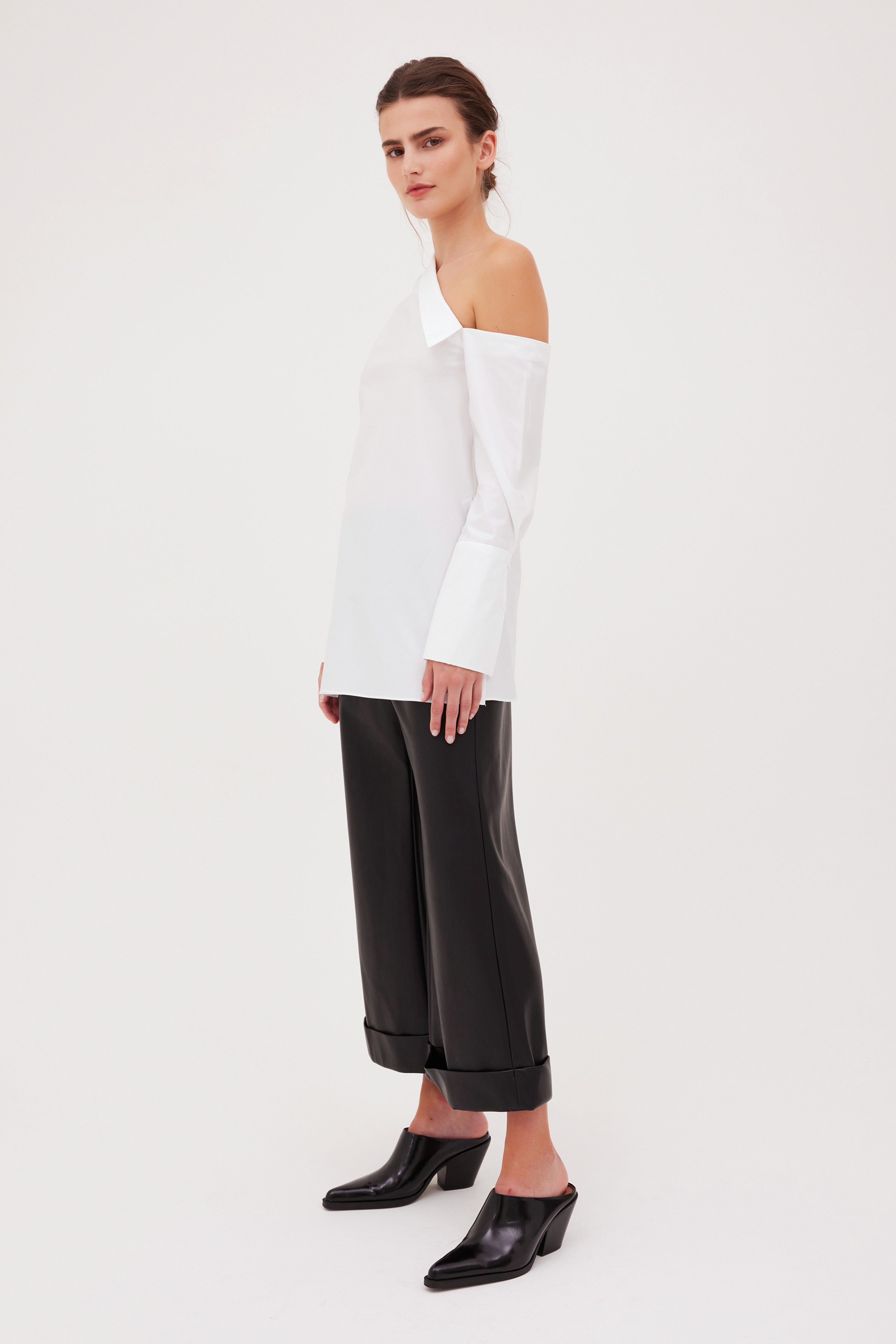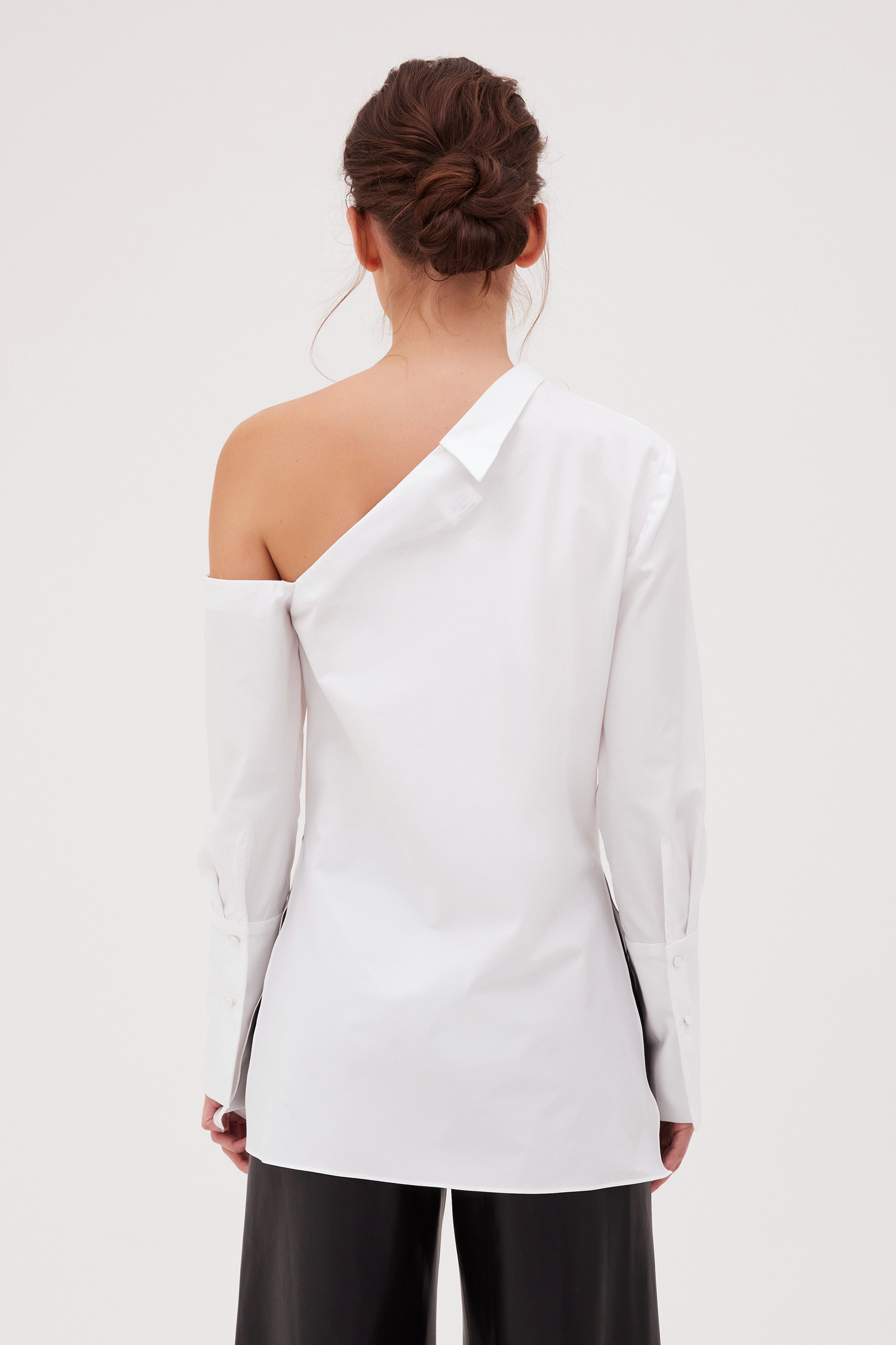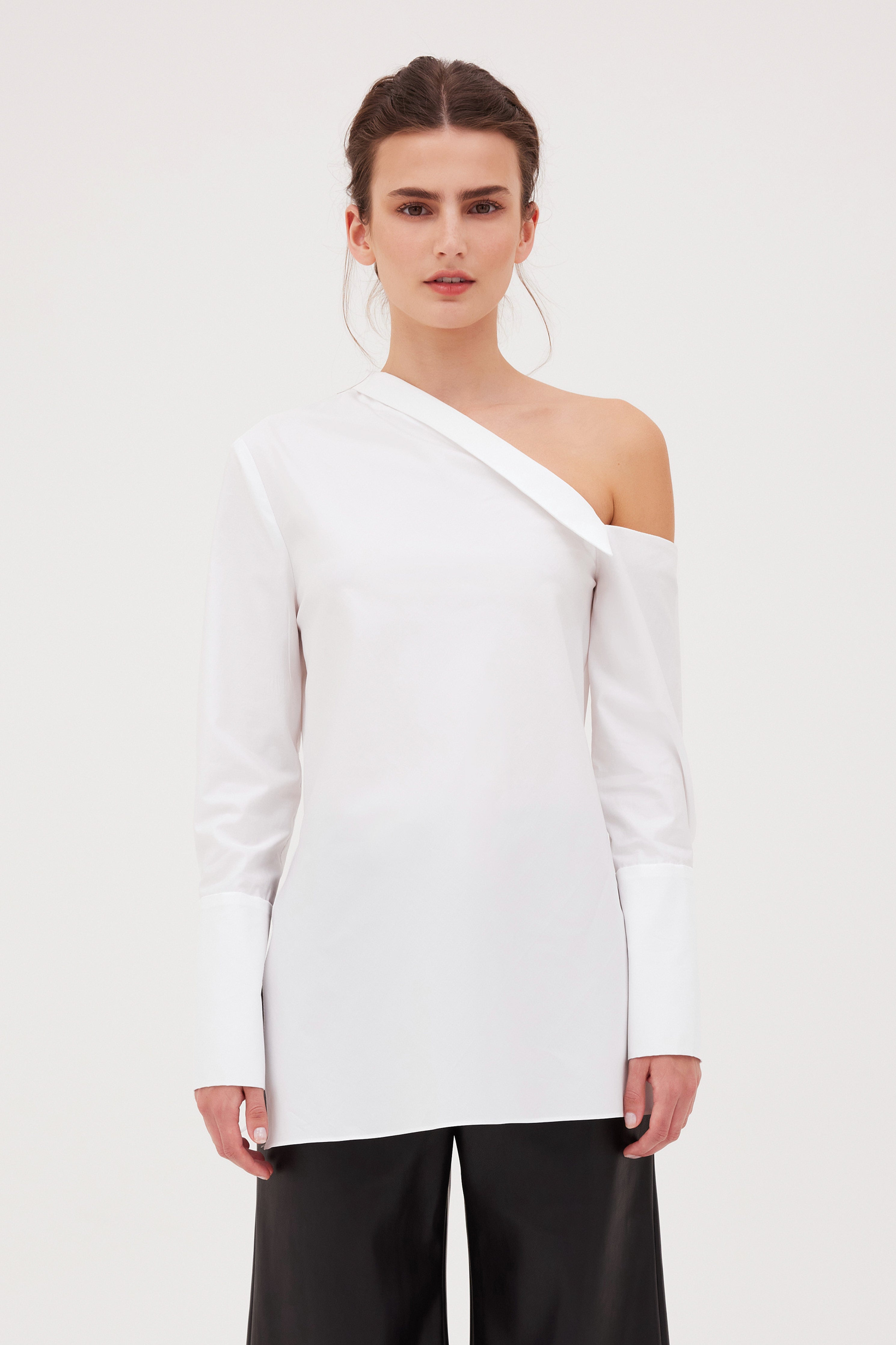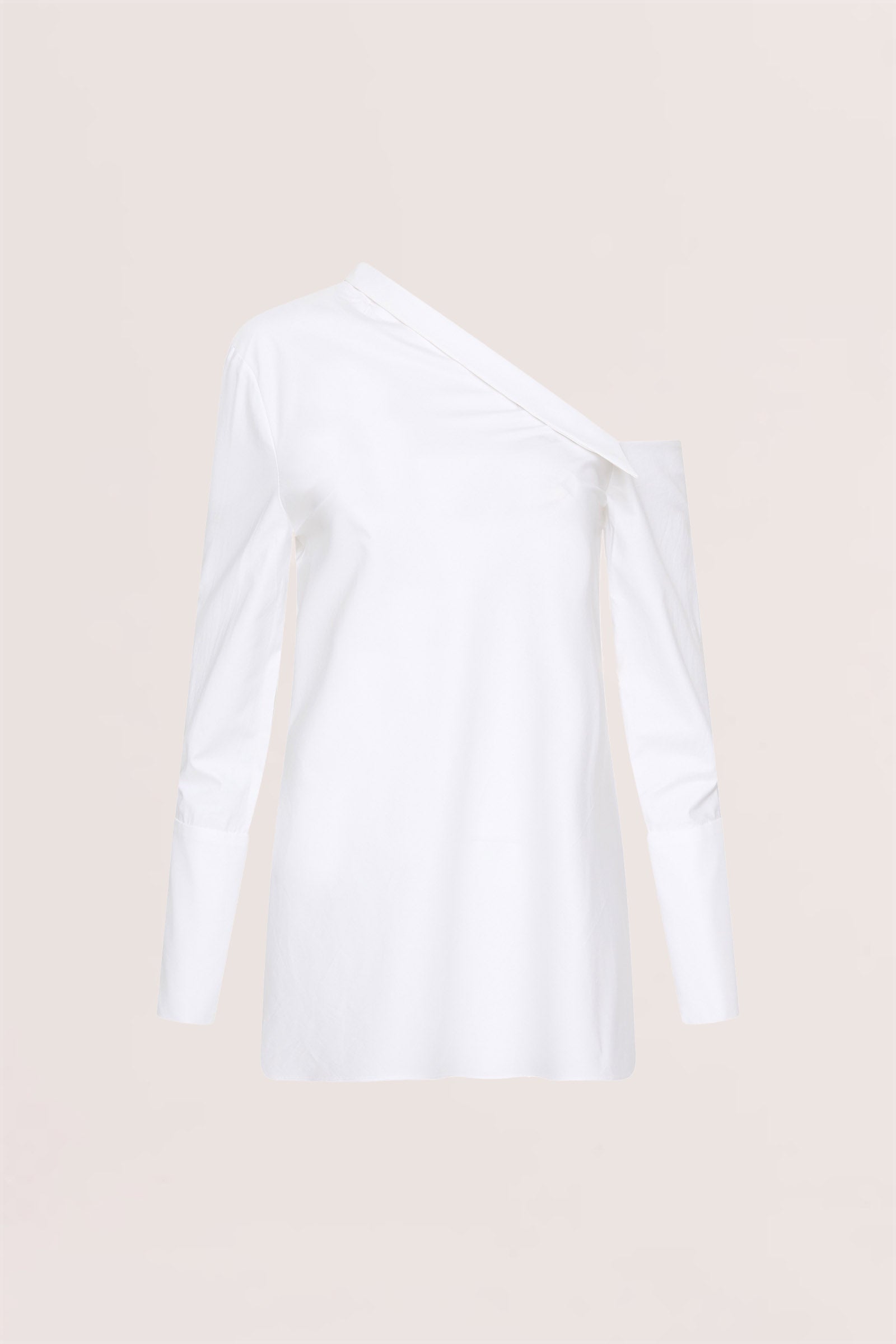 The Andre Shirt is a stylised white cotton shirt. A straight fit through the body, one shoulder asymmetrical with a collar and stand details. This shirt is perfect for day-to-night wear.