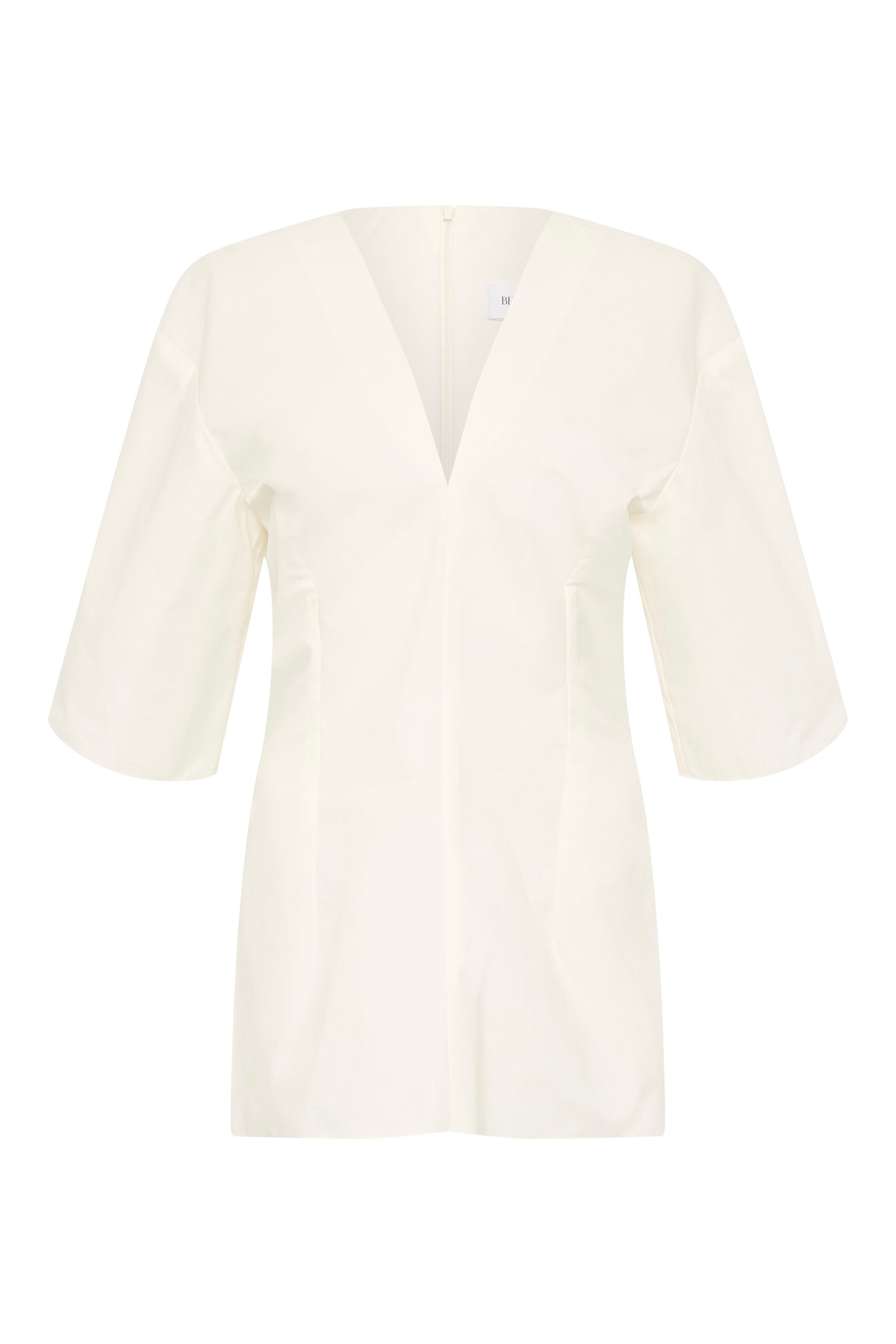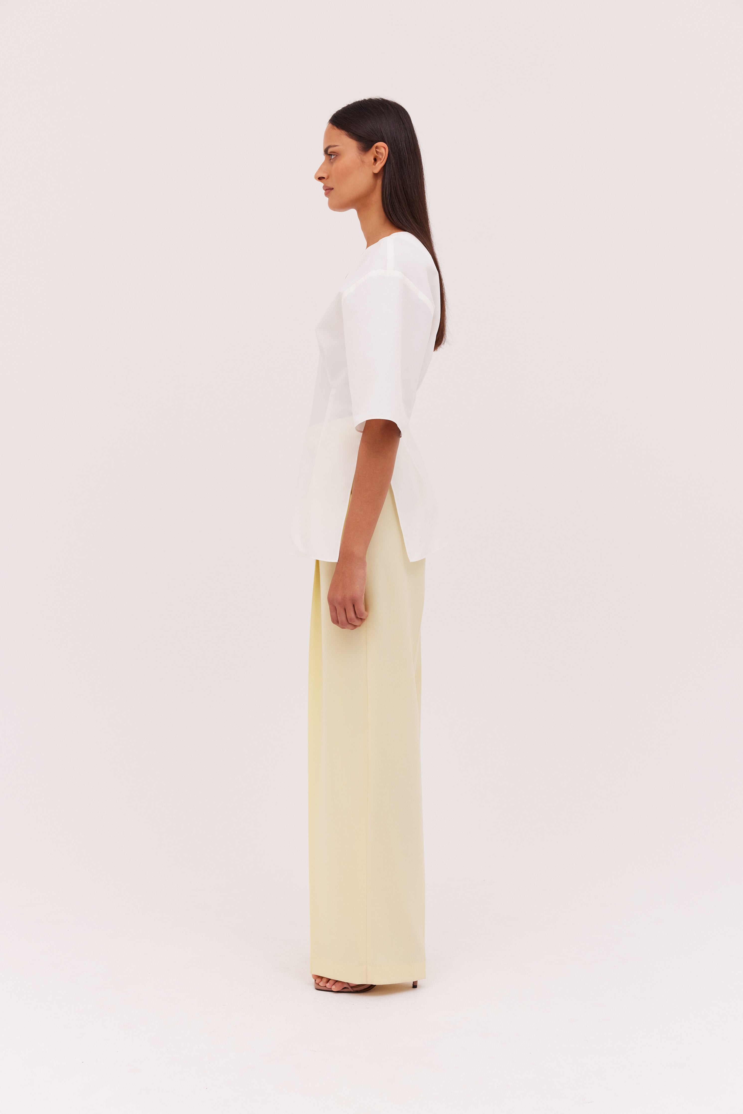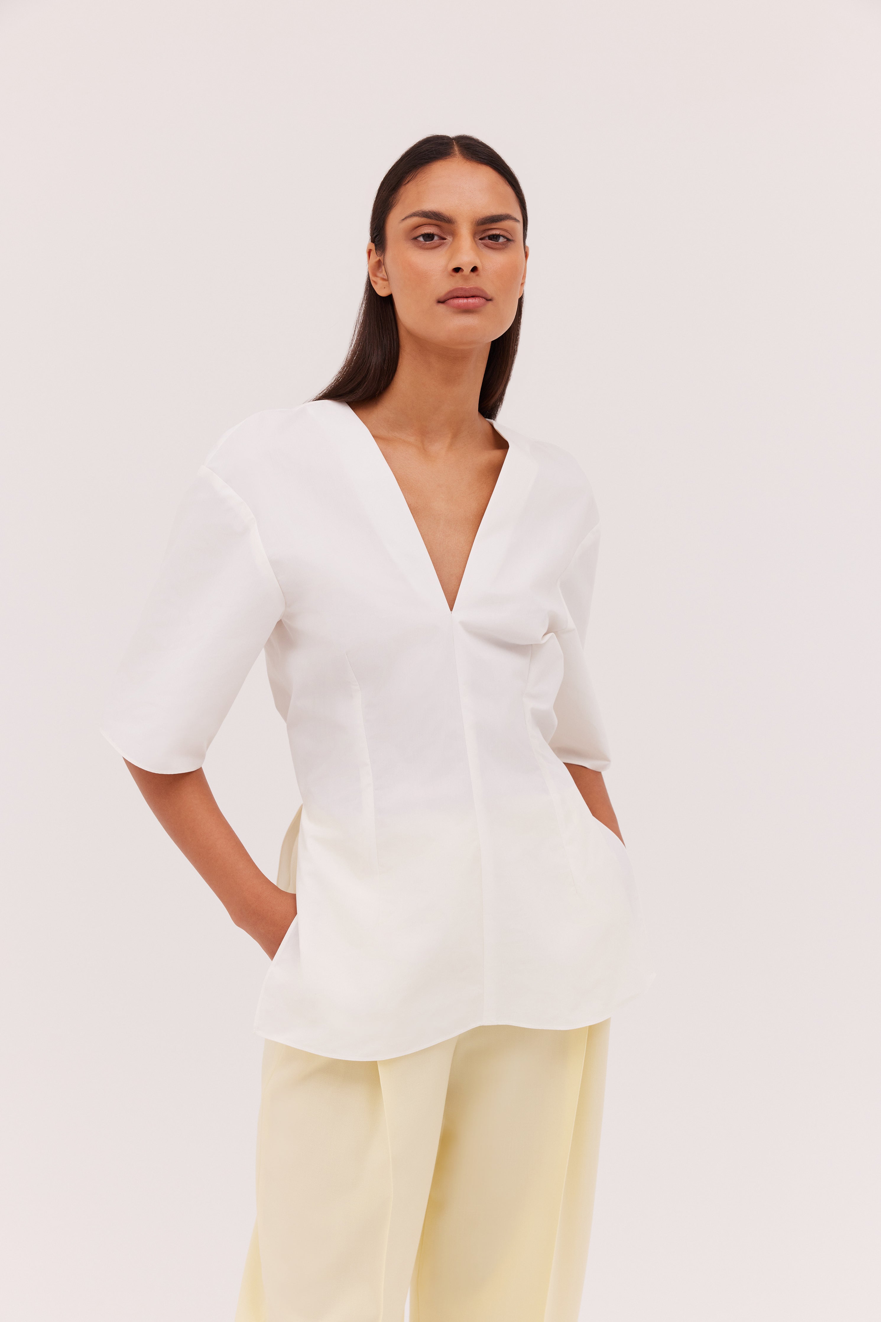 The White Cotton Stephanie Top evokes a sense of ease, with softly rounded curves that harmoniously follow the form of the body. Volume, reminiscent of motion, pauses for the quietly refined details of the gentle pleating, and clean lines of the plunging neckline.