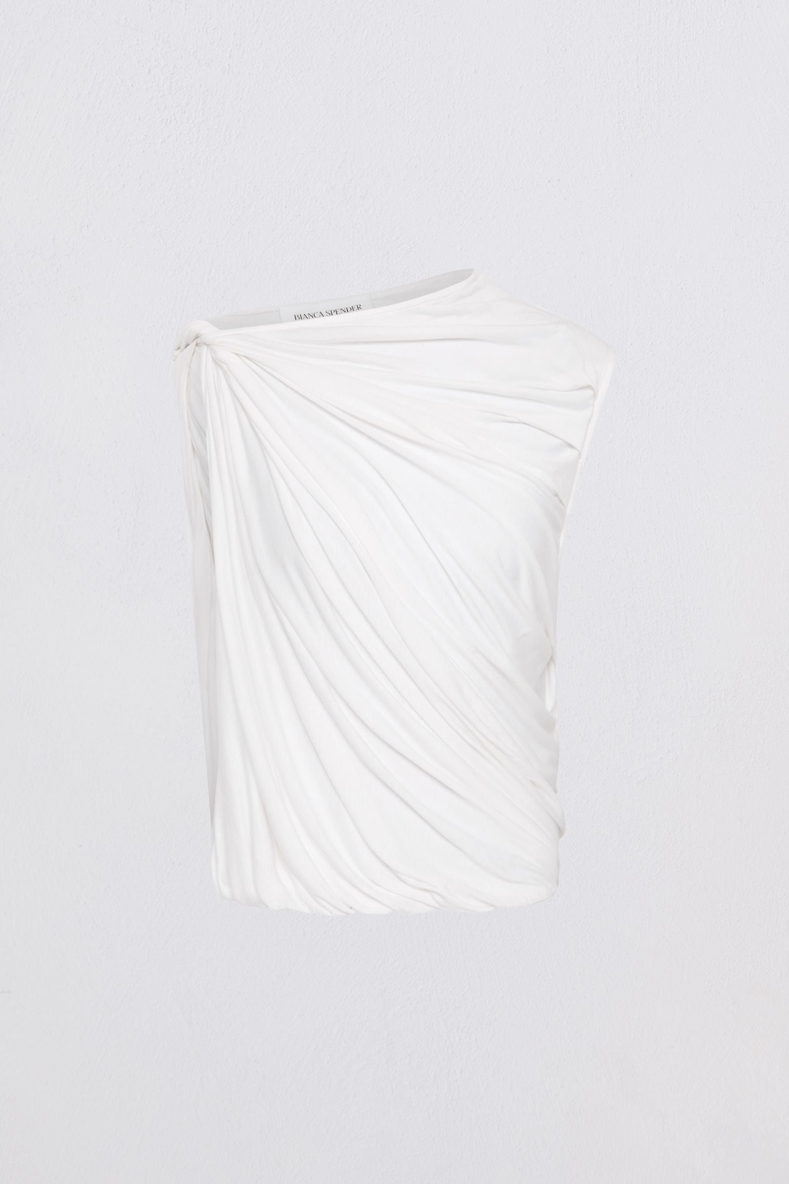 The Tumble Top returns as a key silhouette of the season, redefined in soft white jersey. Designed with a round neckline and sleeveless cut, this style features a signature twist at the shoulder that creates gentle volume and drape through the bodice. The stretch fabrication offers comfort and fluidity, making it an ideal piece for both layering and stand-alone styling. Elegant, versatile and easy to wear, the Tumble Top lends modern softness to everyday dressing.