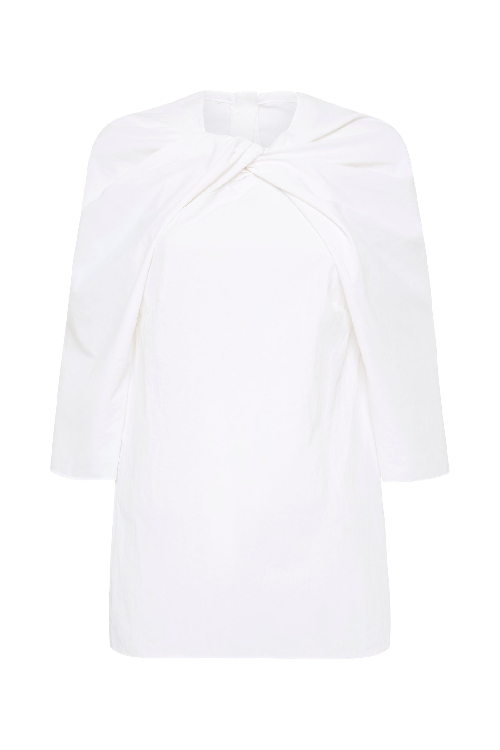 Introducing our White Nylon Satin Template Top. A quintessential Bianca Spender piece, featuring our signature twists and folds at the neckline. A modern take on classic white shirting, the Template Top was designed with modernity front of mind. Featuring a twisted neckline that folds into an elbow-length sleeve, the crisp cotton fabrication adds a sense of lightweight structure.