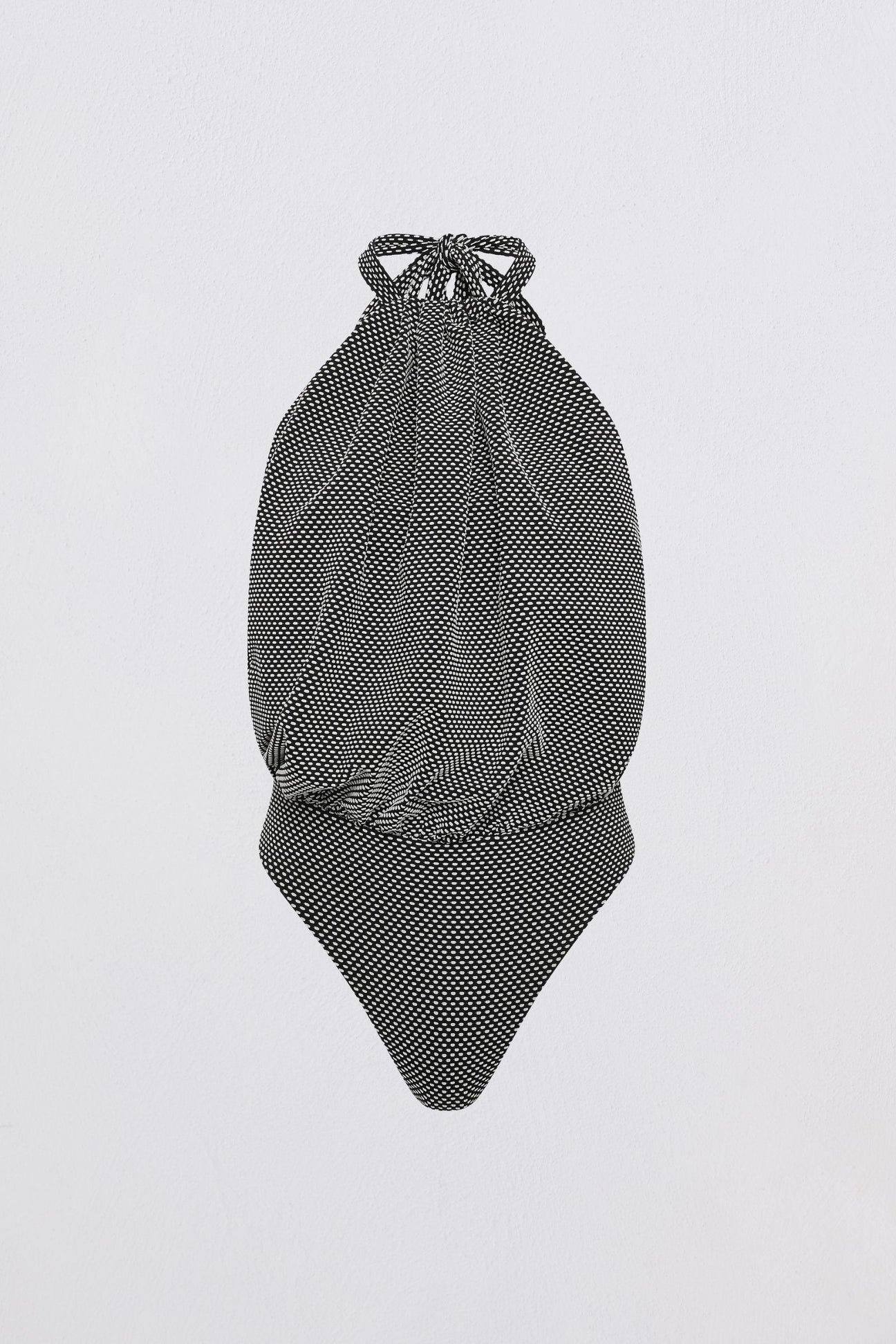 The Hazel One Piece is crafted in stretch lycra with a softly bloused bubble top, echoing one of our most-loved ready-to-wear silhouettes. Designed with an adjustable halter neck tie, low back and moderate coverage, the style balances sculptural volume with ease. Rendered in black spot jacquard, it transitions effortlessly from swim to resort — worn as a swimsuit or styled as a bodysuit within your wardrobe rotation.