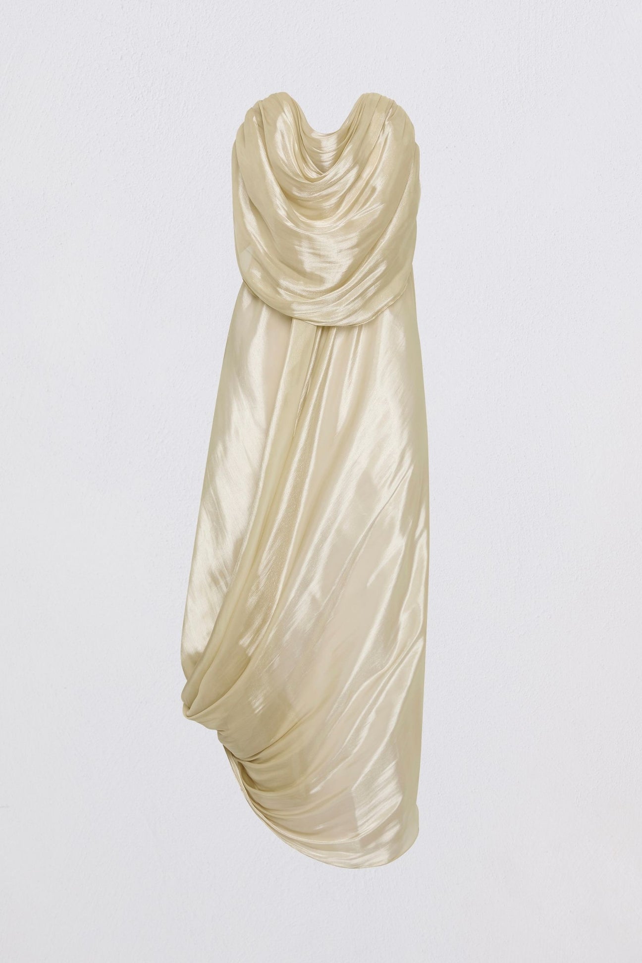 Gracefully architectural, the Tidal Bustier Dress in Champagne is designed to move with quiet drama. Crafted from sheer liquid organza and softly lined for comfort, it features a built-in stretch corset that sculpts and supports beneath the flowing silhouette. The strapless neckline falls into a fluid cowl that frames the décolletage, while the looped skirt gathers gently to create natural volume. An elevated occasion piece that balances structure and softness in perfect harmony.