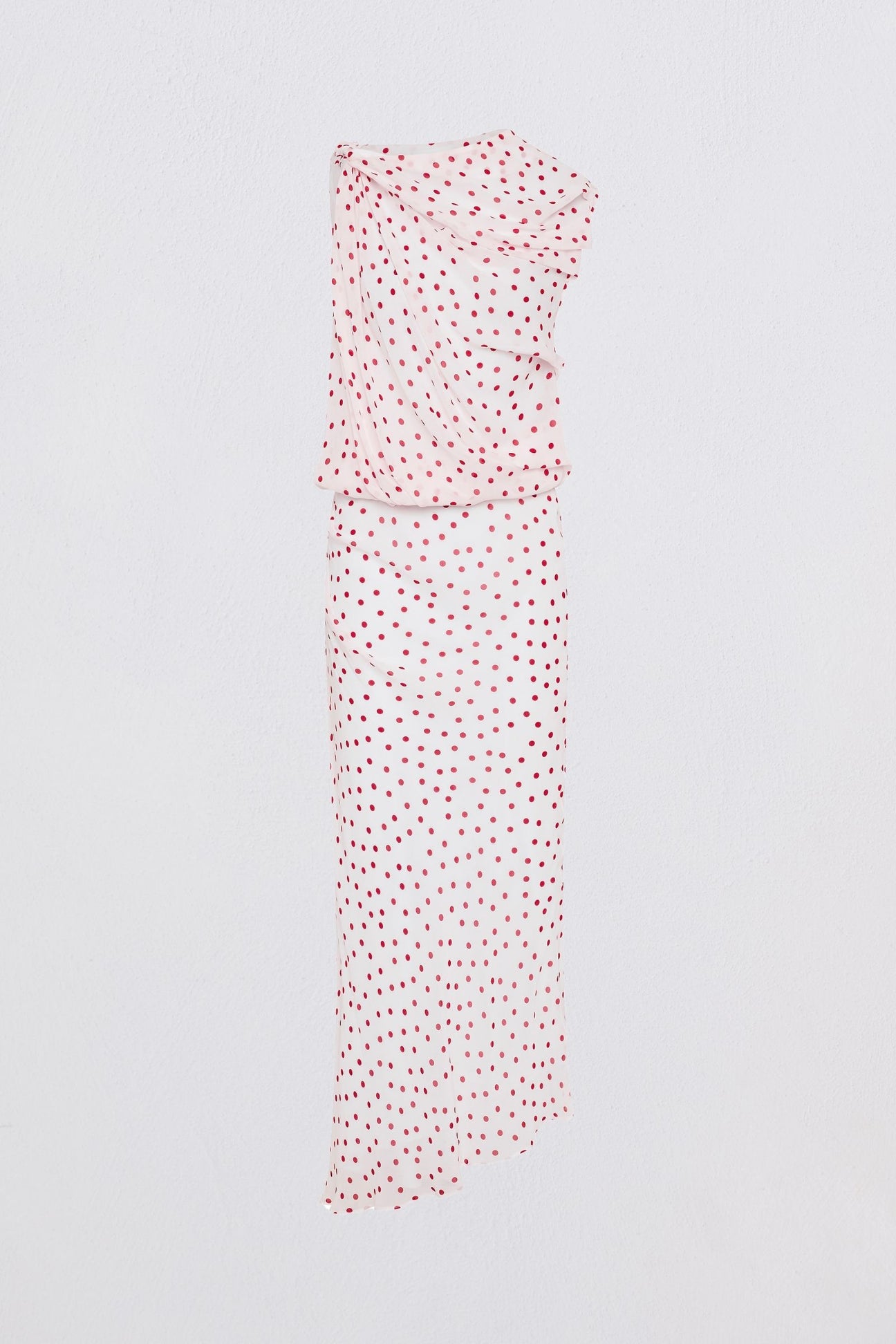 Our signature Tumble shape, now reimagined in a dress. Crafted in lightweight red polka dot chiffon, this silhouette is defined by its sculptural drape and fluid movement. A soft twist detail at the shoulder flows into cascading folds that fall through the body, finishing at the ankle. A subtle side split enhances ease of movement and adds a glimpse of skin.