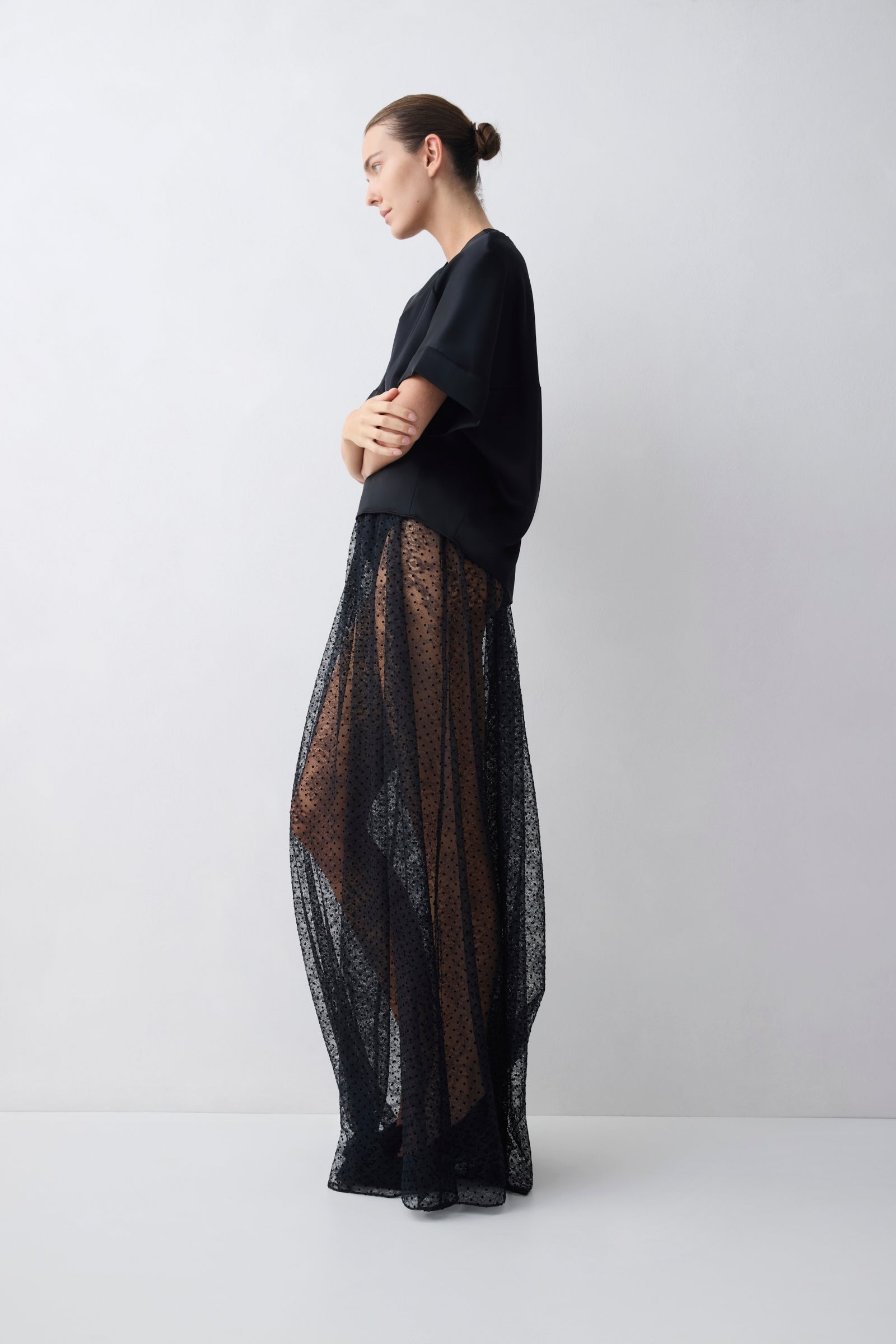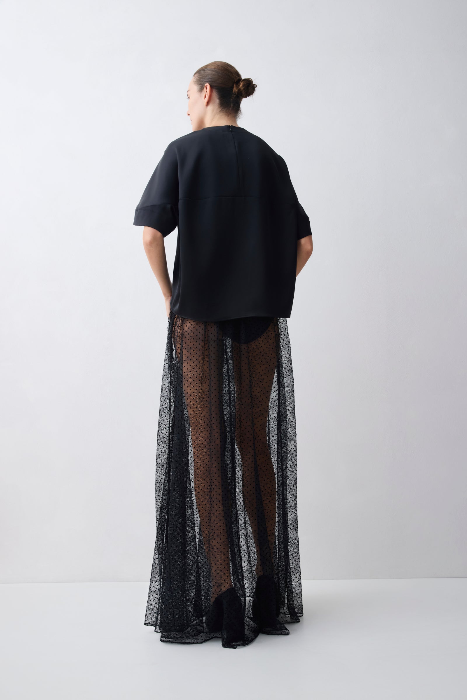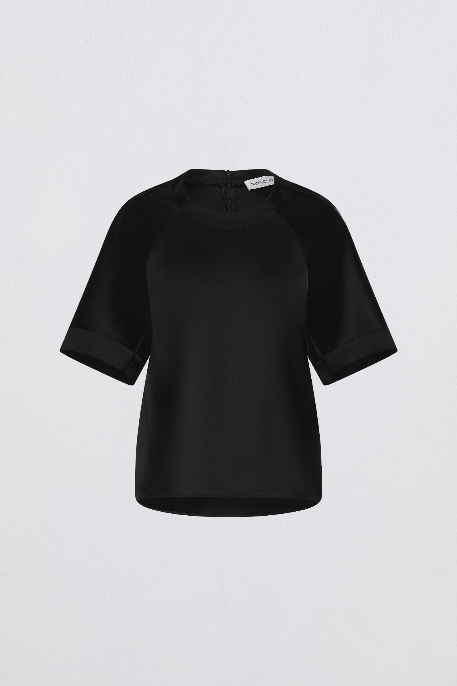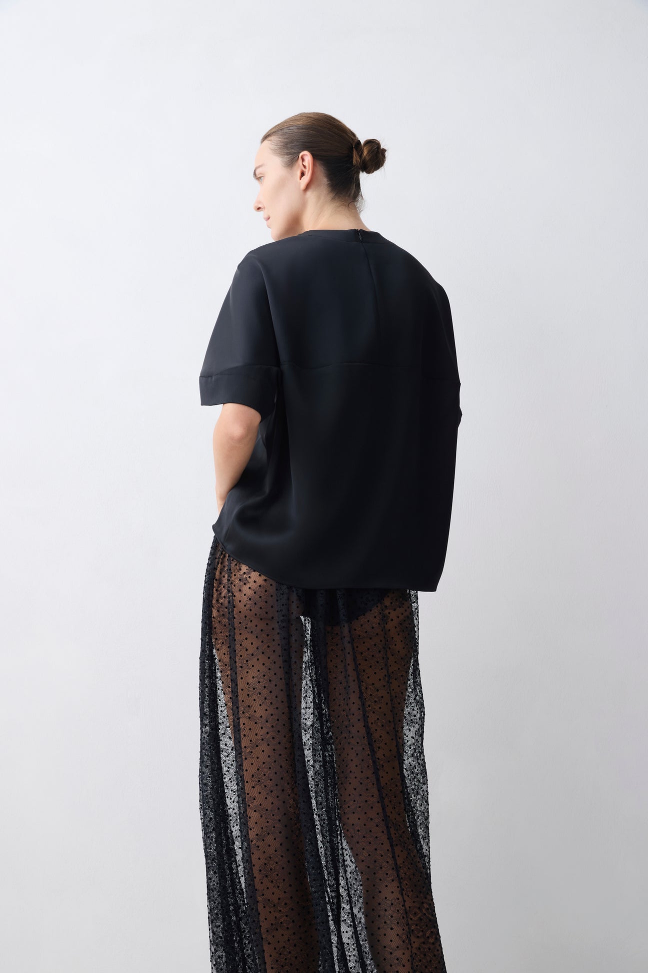 The Black Satin Evolve Top offers a refined interpretation of the classic T-shirt, elevated through fluid satin with a soft, understated sheen. Clean lines through the body are balanced by subtle volume at the sleeve, creating a silhouette that feels both relaxed and considered.
