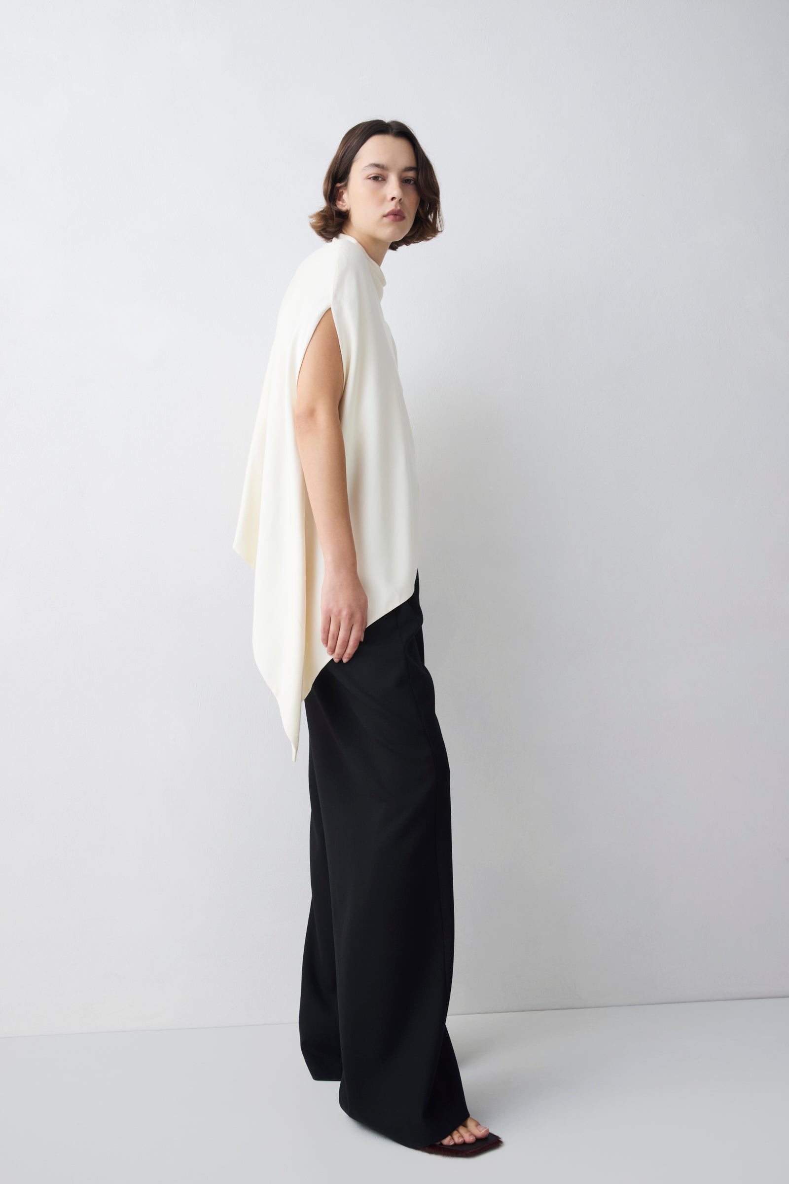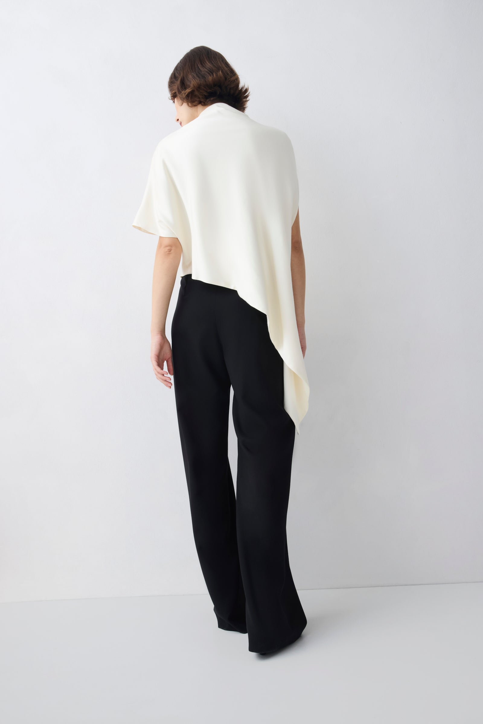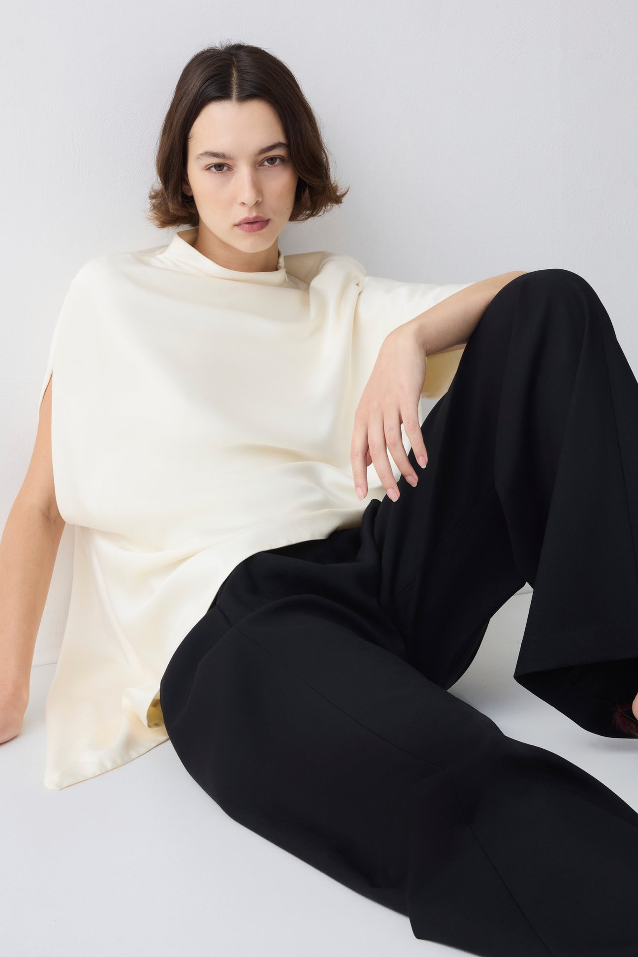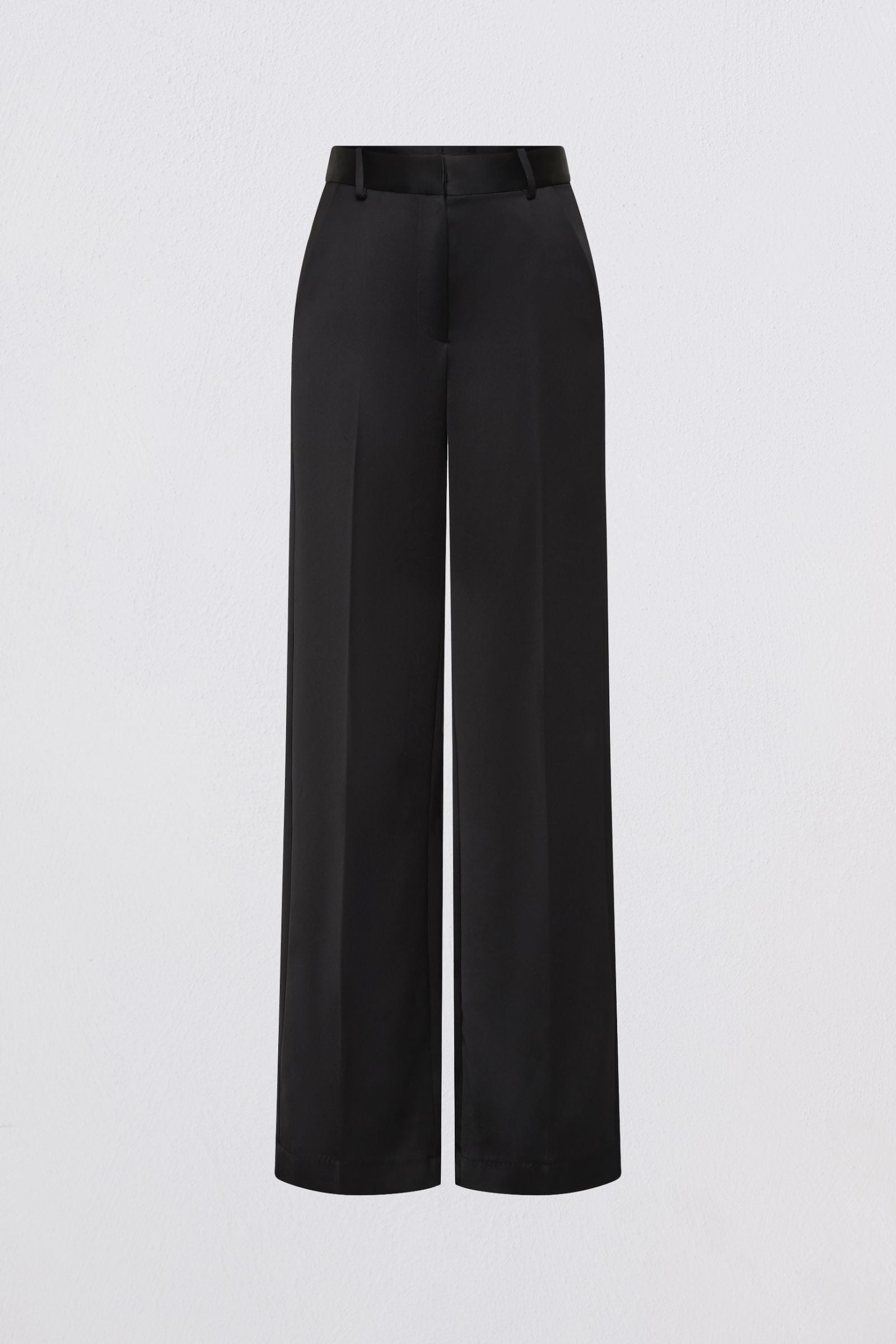 Fluid and softly lustrous, the Black Satin Pulse Pant is cut in a smooth satin with a subtle sheen. The wide-leg silhouette falls cleanly through the leg, creating an elongated line with natural movement. A refined waistband provides a polished finish, balancing fluidity with structure.