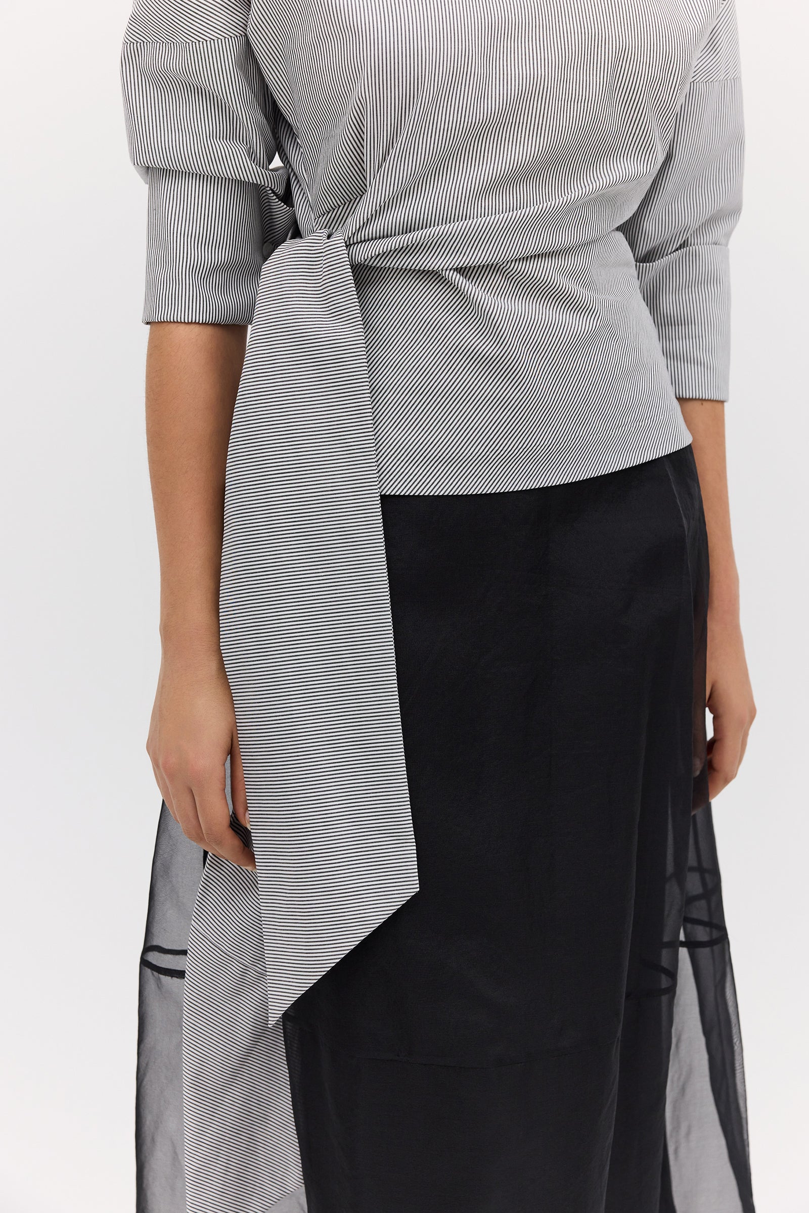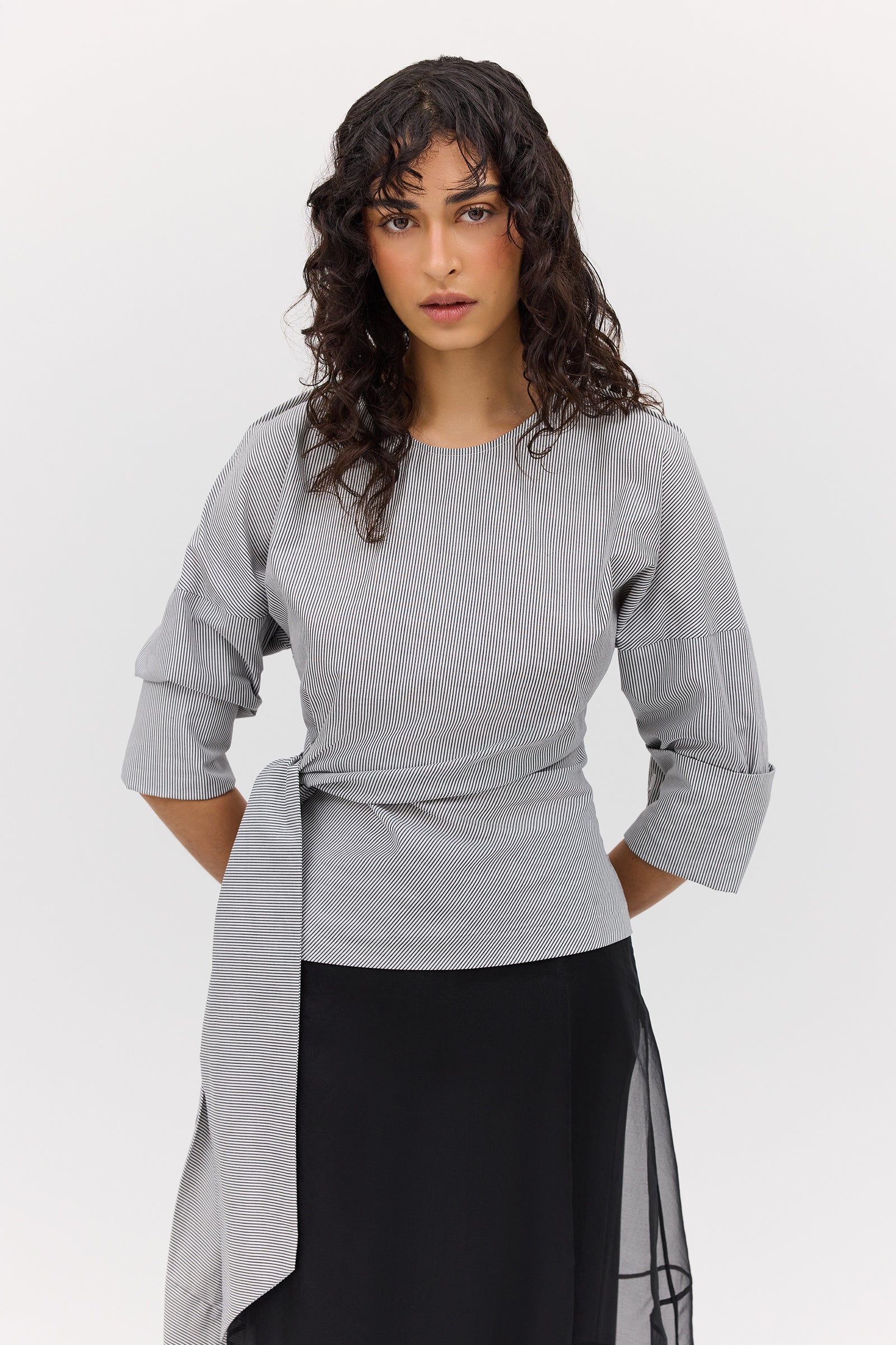 The Black Stripe Enthral Top is a classic with a twist, quite literally. A chic 100% cotton sleeved top, with signature Bianca Spender tie detailing at the waist, for an adjustable fit, that may be worn loose or cinched close to the body.