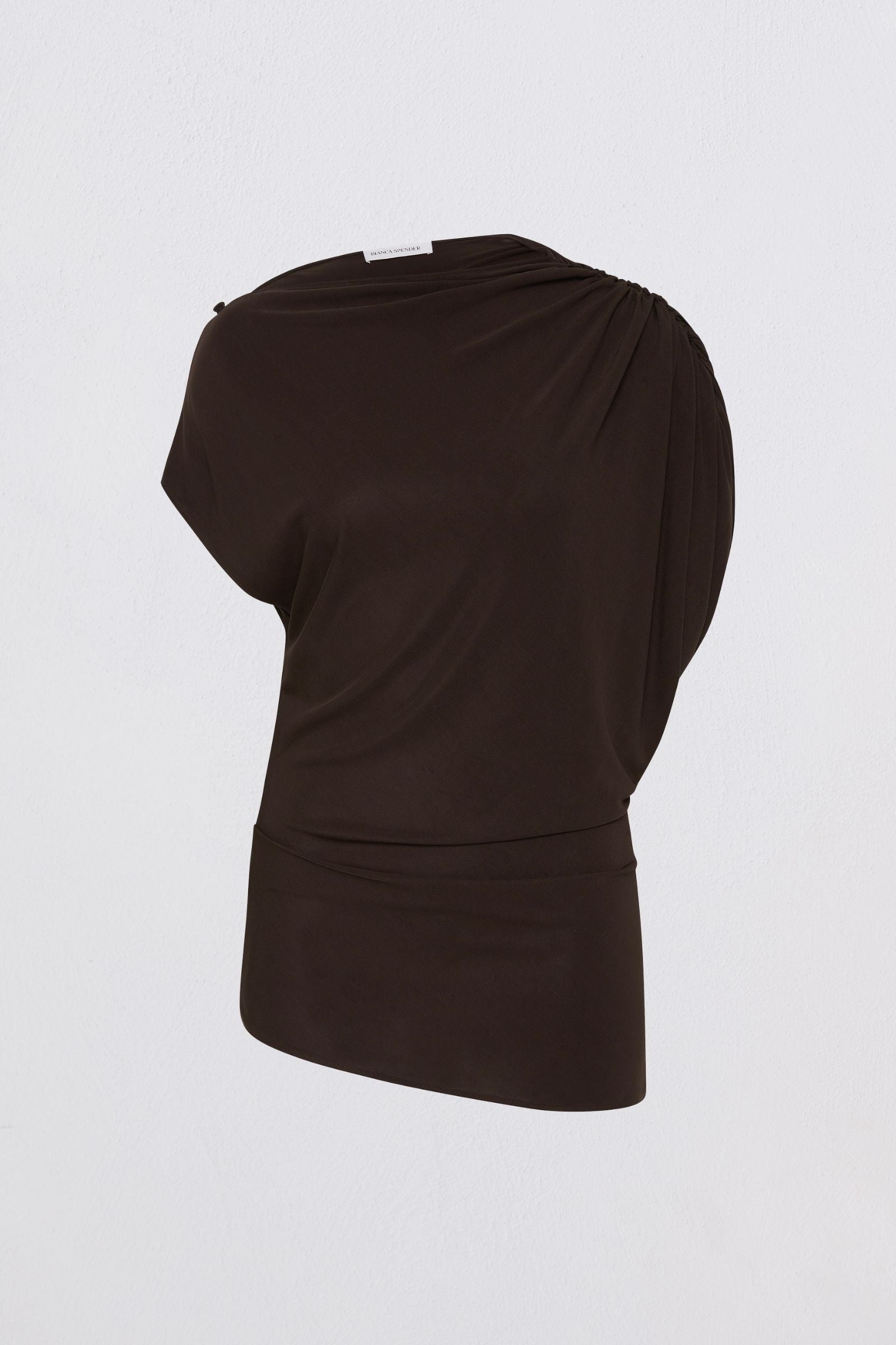 The Chocolate Jersey Decode Top reimagines the brand’s bestselling Decode silhouette in fluid chocolate jersey. The asymmetrical neckline introduces a subtle tension between reveal and restraint, softly draped to skim the body with ease. Sculptural folds move through the shoulder and bodice, creating a refined interplay of structure and fluidity.