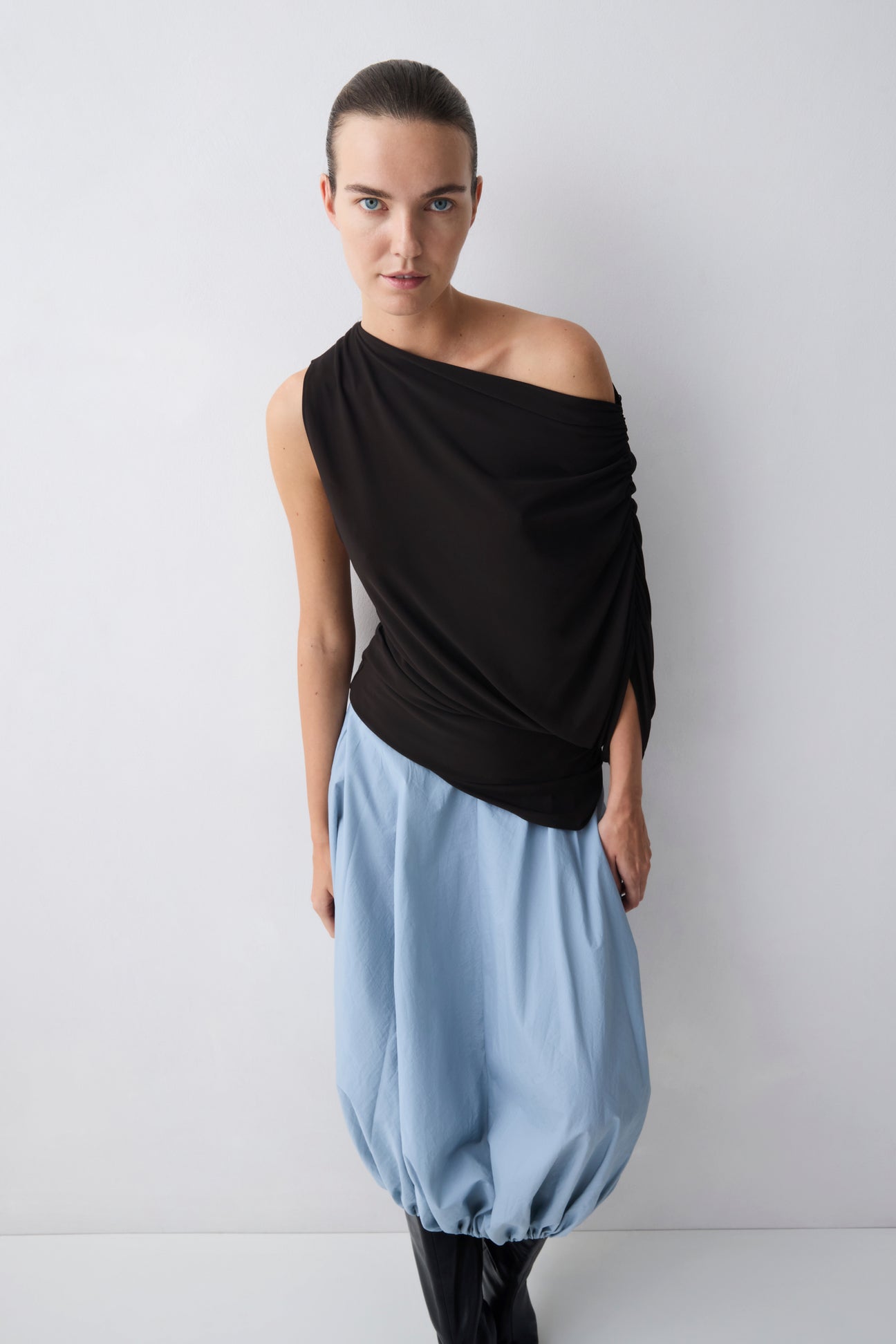 Lightweight and sensuous to the touch, the jersey falls effortlessly, offering an elevated expression of modern drape. Style with the Chocolate Satin Surrender Pant and Mutual Jacket for a considered, elongated look, or wear alone as a sculptural statement.
