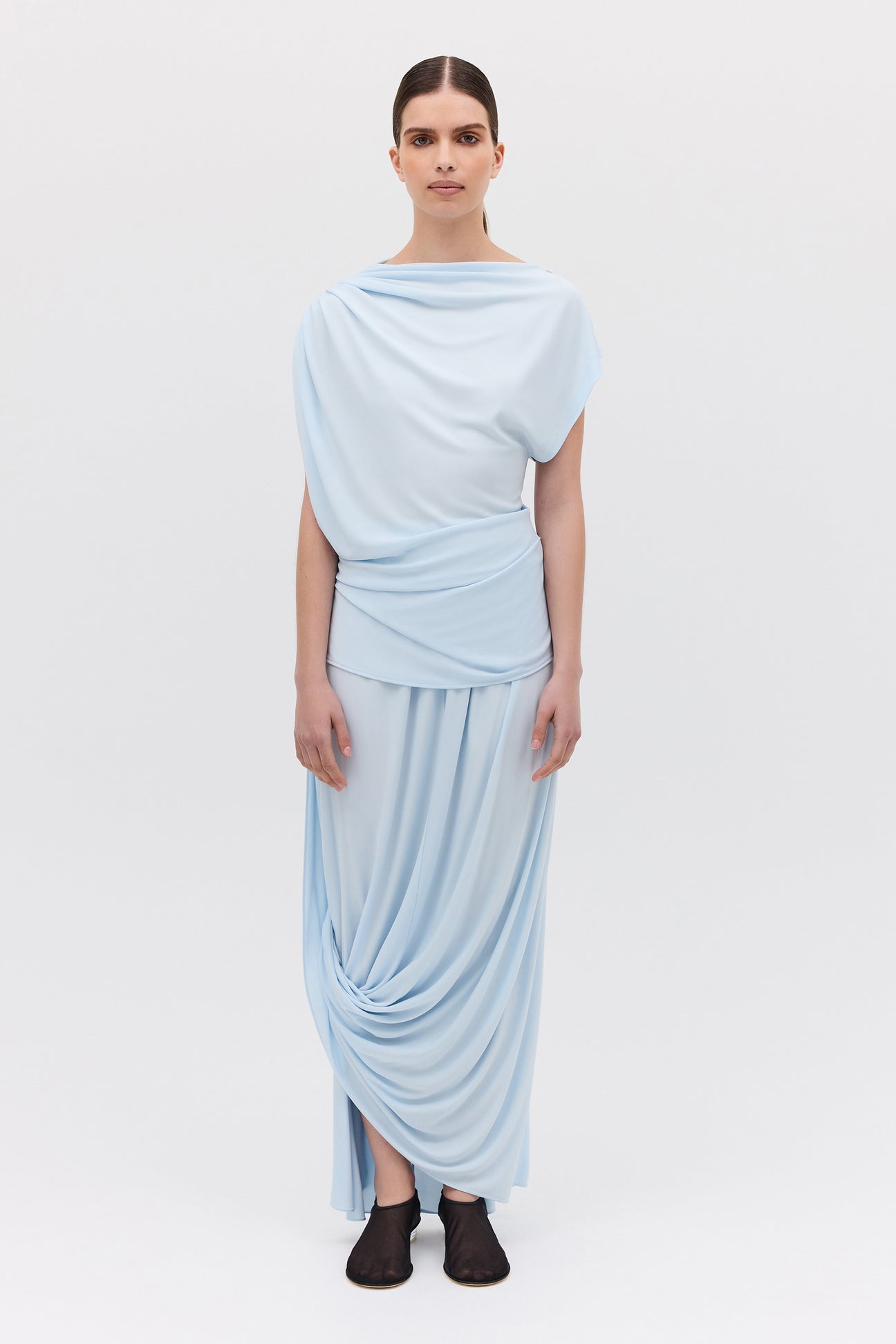 Effortless movement meets sculptural form in the Cloud Jersey Ripple Skirt, reimagined in a soft, fluid cloud jersey. Designed to fall gently from an elasticated waistband, the silhouette gathers and loops through the hem, creating natural drape and quiet dimension. An asymmetrical length and subtle side split enhance movement, allowing the fabric to flow with the body. Lightweight and sensuous, the liquid-like jersey skims the form with ease, offering comfort without compromise.