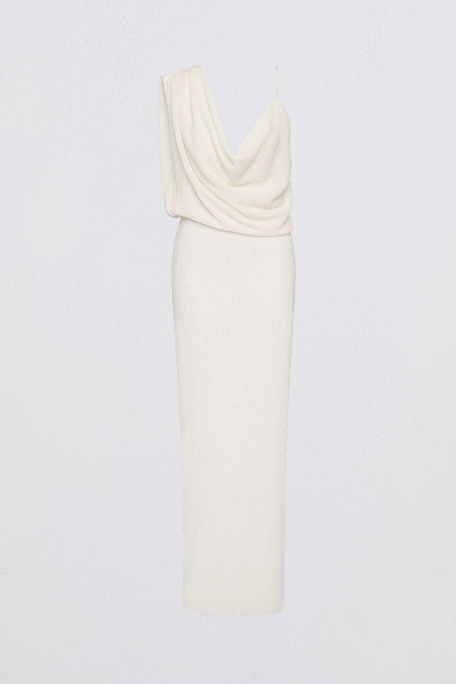 A new interpretation of our bestselling Liquid silhouette, now reimagined as a full-length dress in lightweight Japanese crinkle. Sculptural drape and soft asymmetry define the form - the cowl neckline falls effortlessly across the body, while the single strap and fluid folds create a sense of quiet drama.
