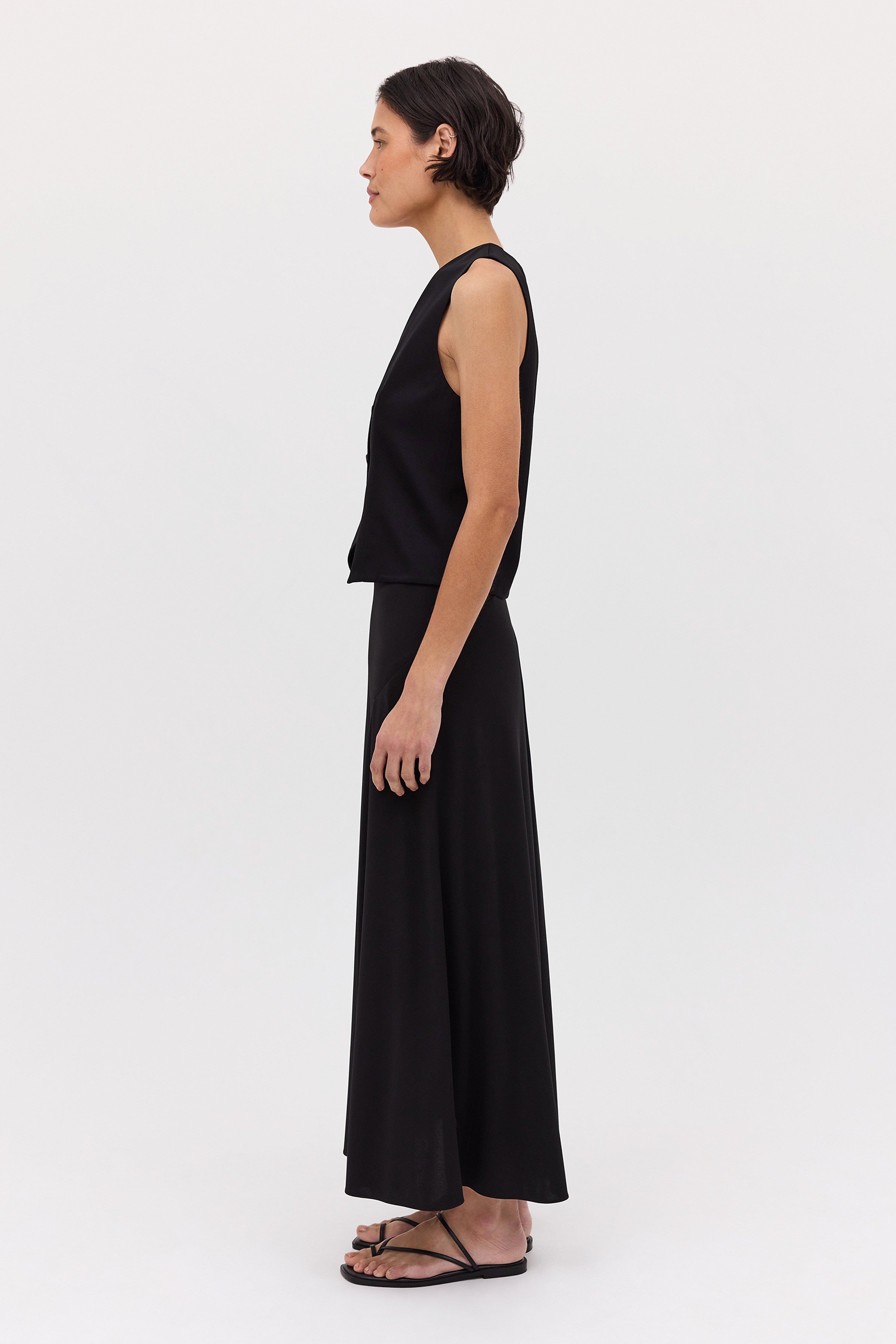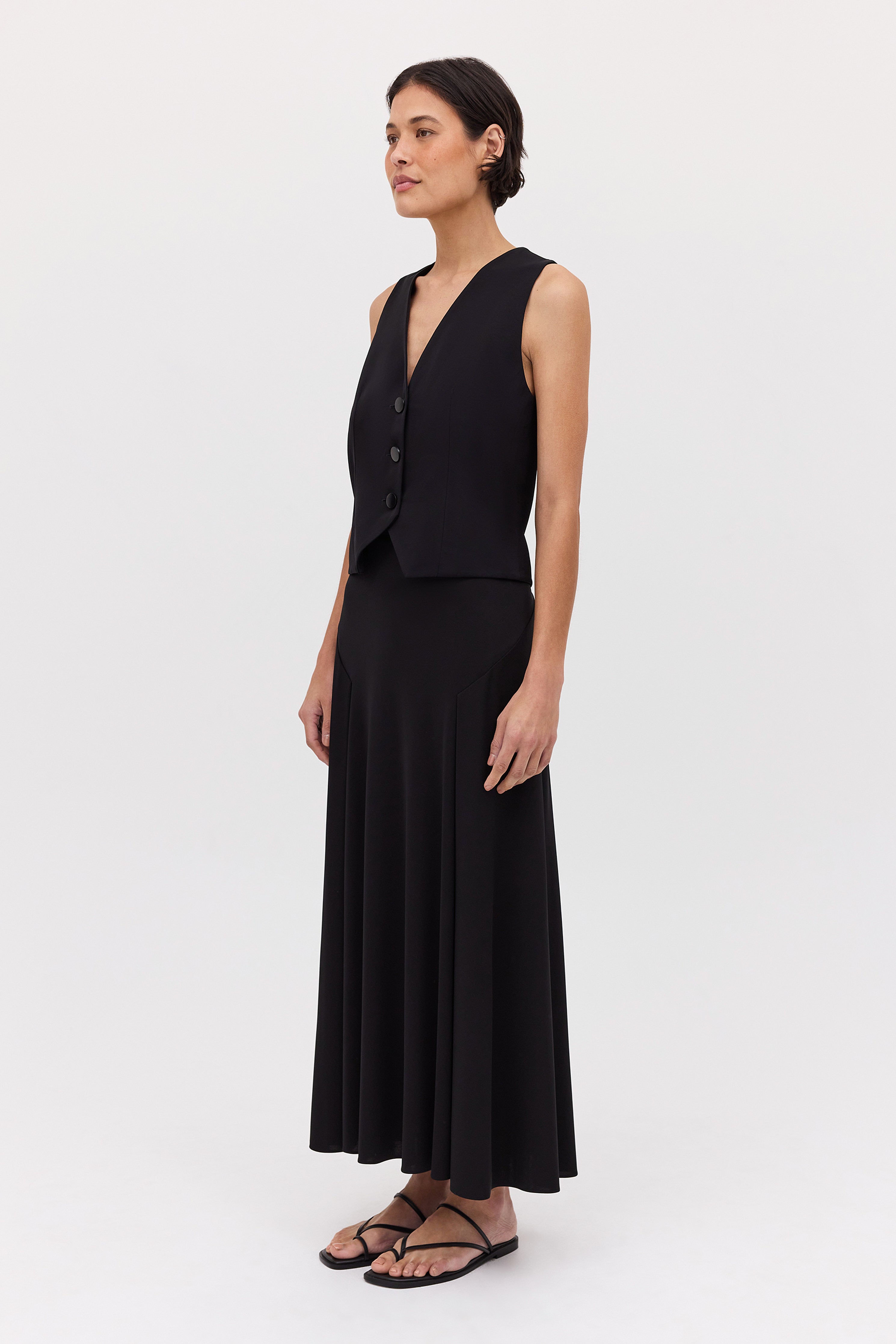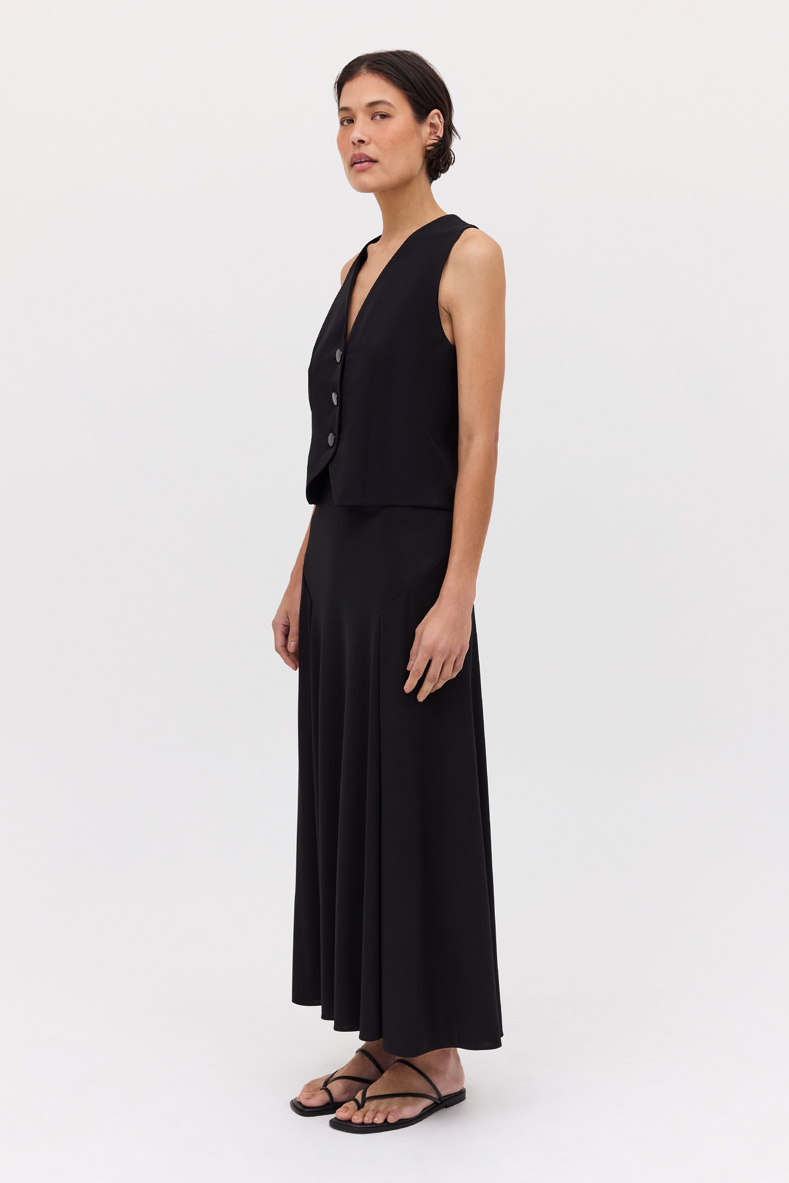 Inspired by the traditional waistcoat, Bianca Spender puts a new twist on an old classic. Fabricated in black satin crepe, the Evoke Waistcoat features a V-neck, three-button fastening, and finishes just below the waistline.