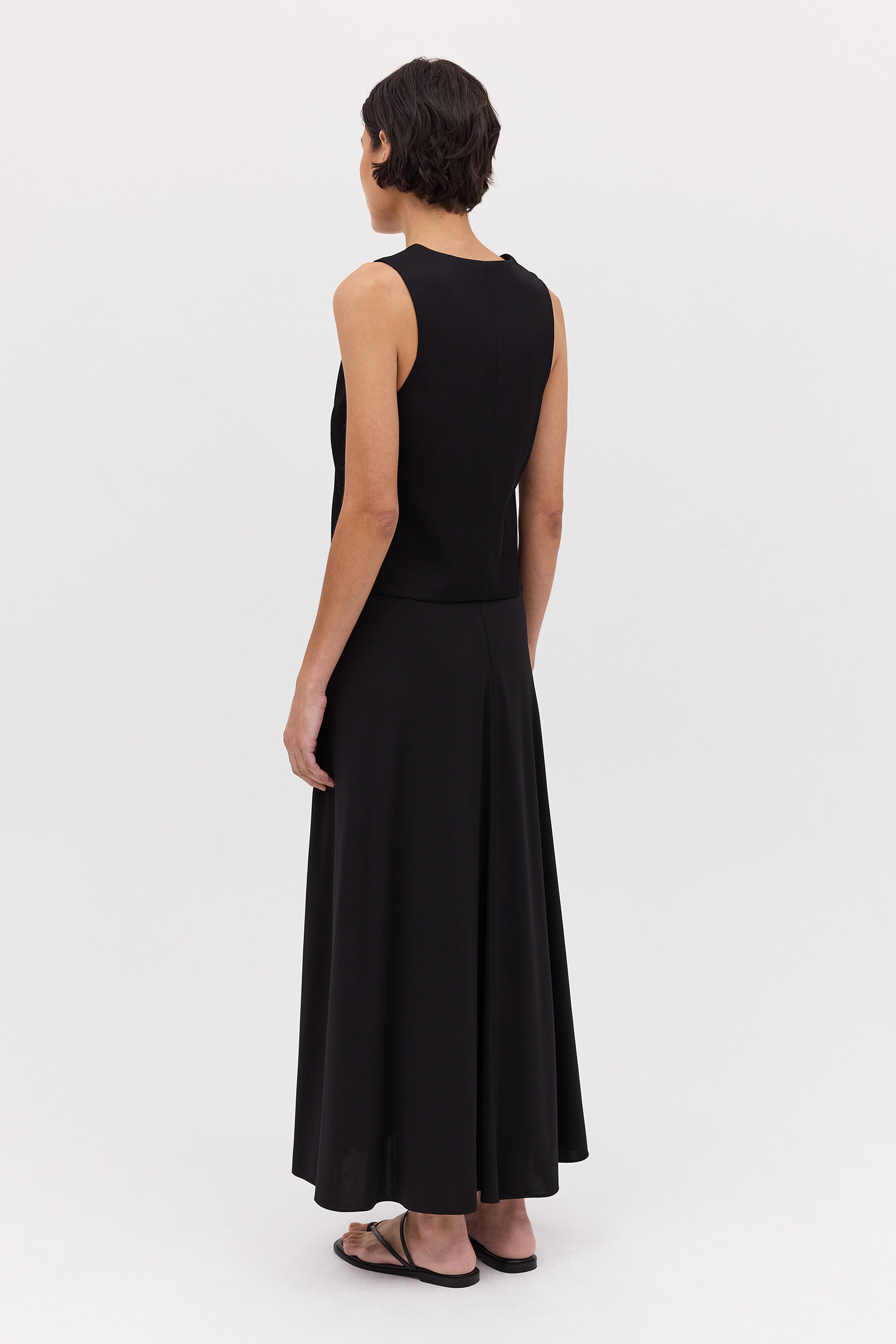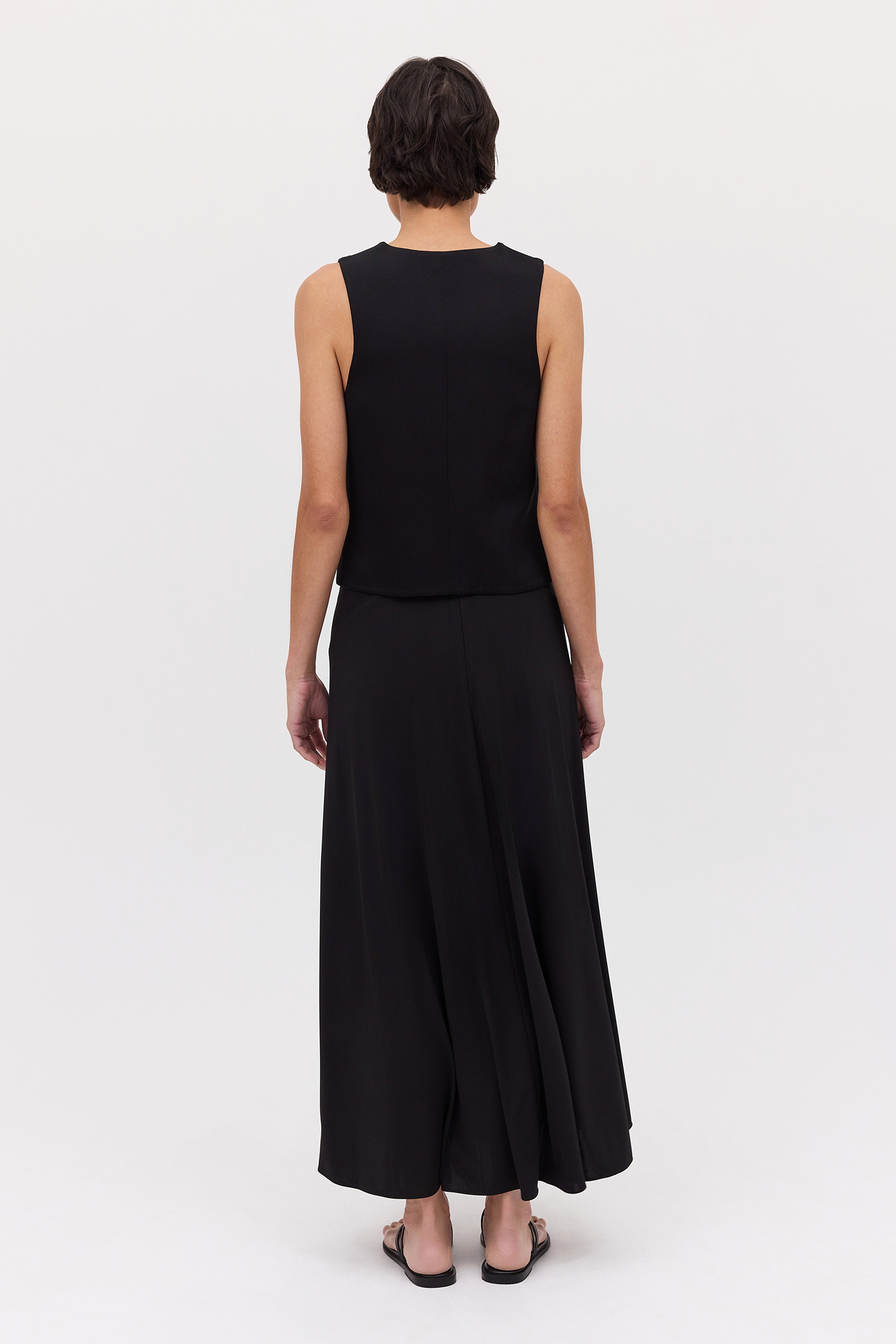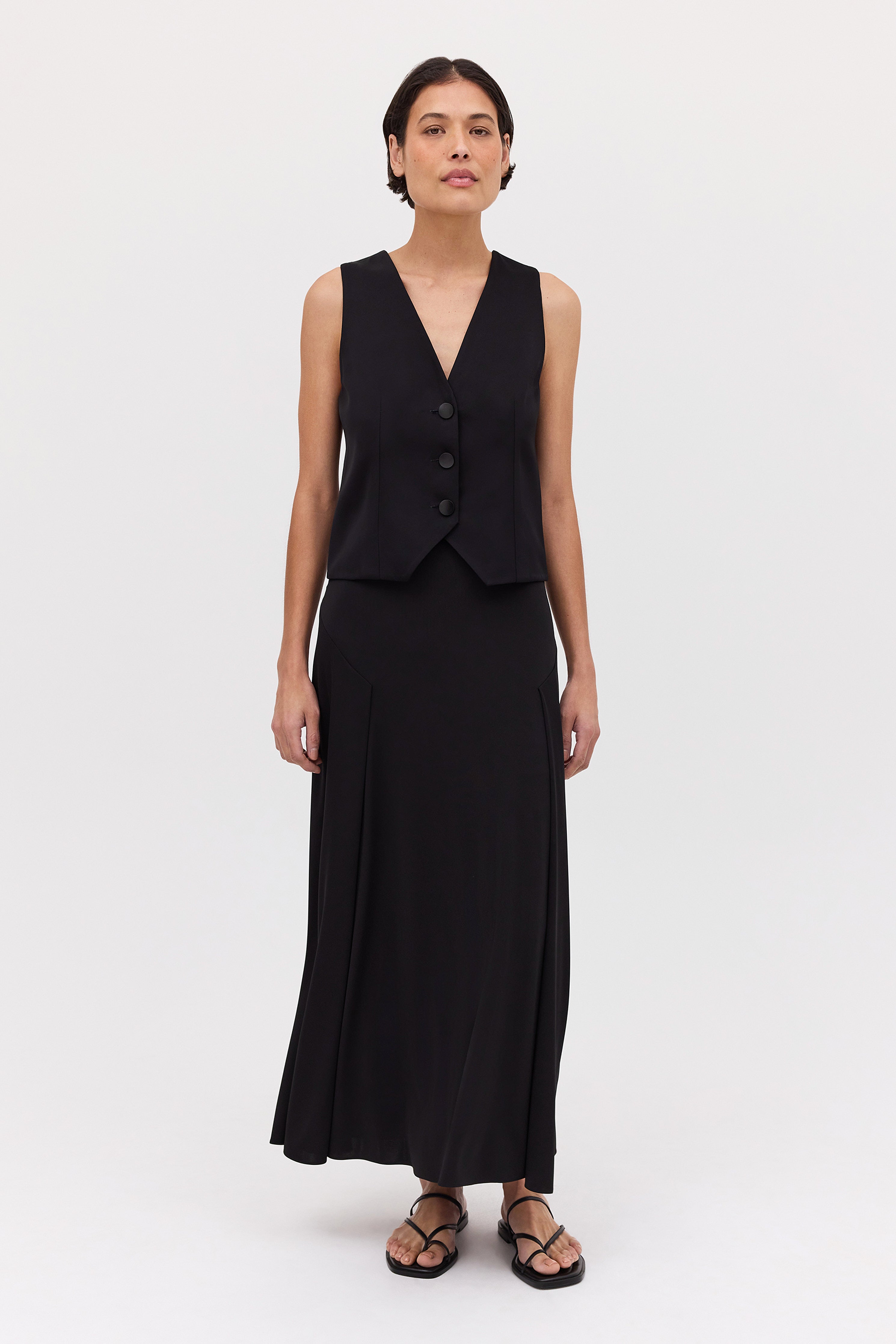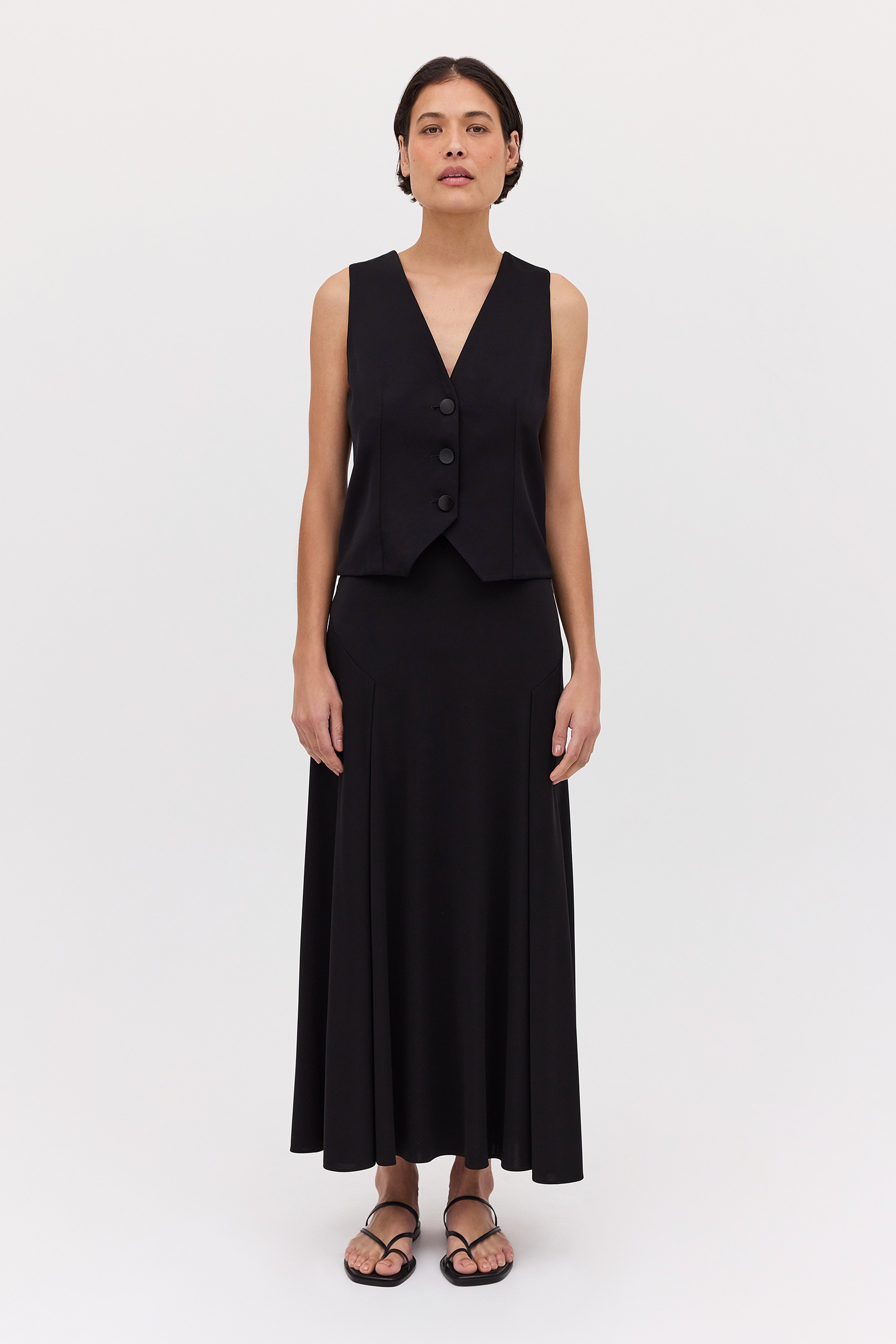 Inspired by the traditional waistcoat, Bianca Spender puts a new twist on an old classic. Fabricated in black satin crepe, the Evoke Waistcoat features a V-neck, three-button fastening, and finishes just below the waistline.