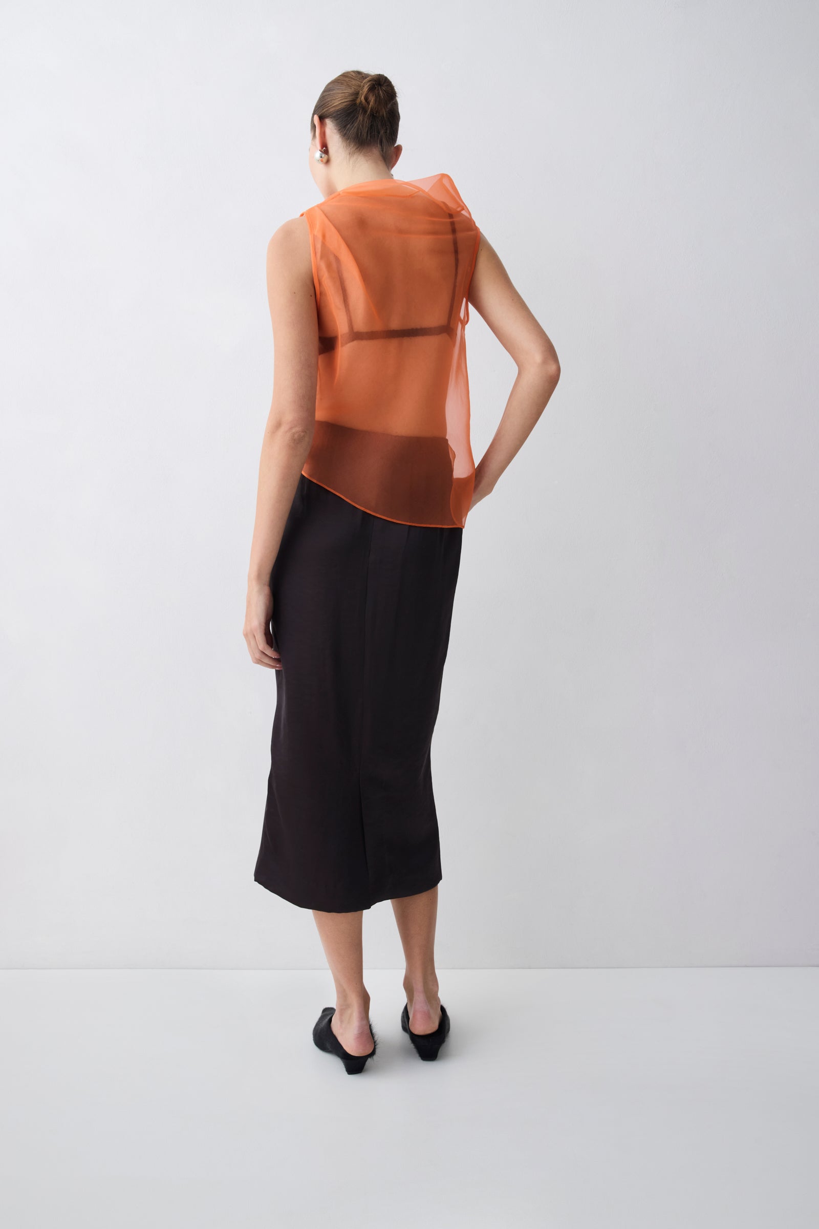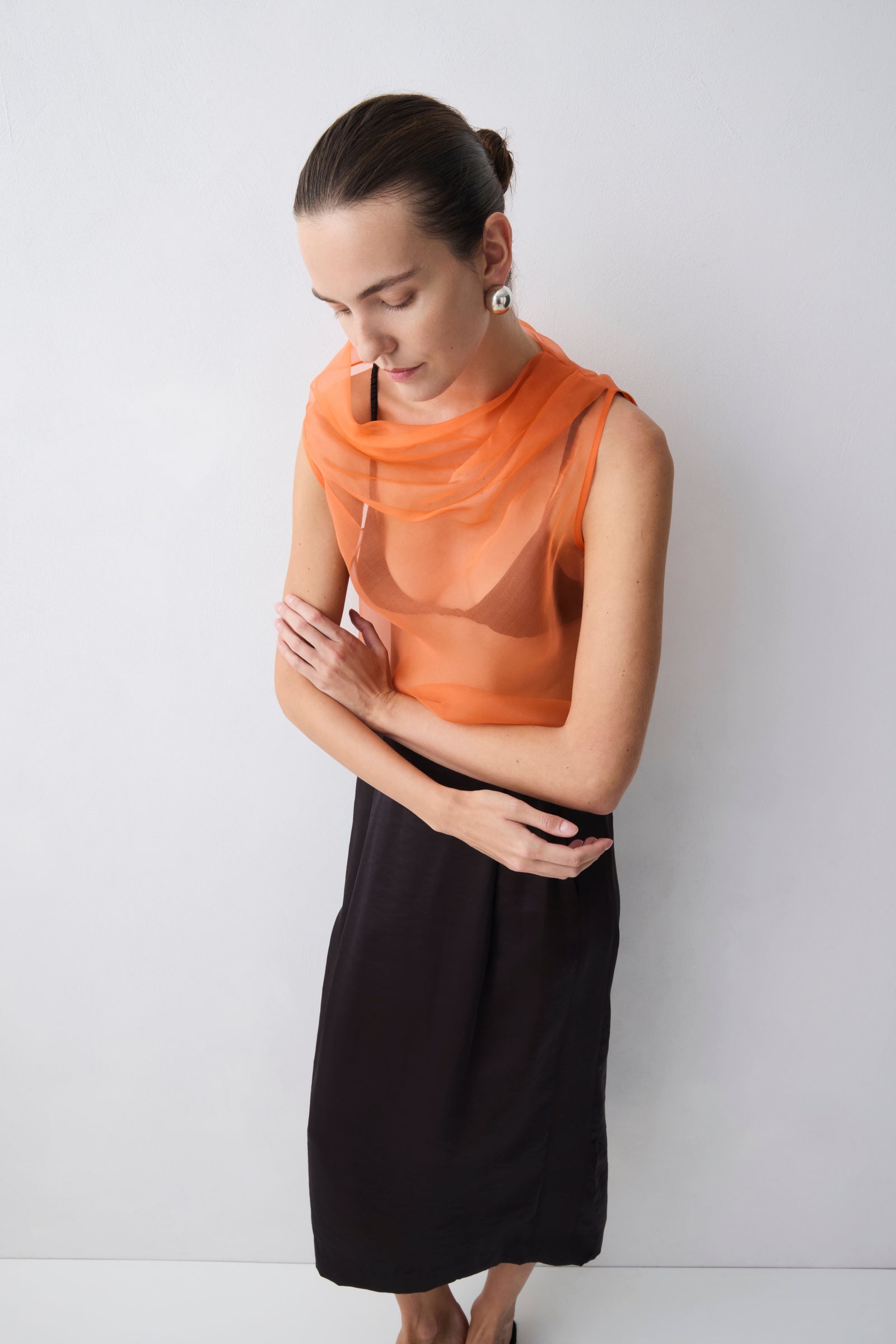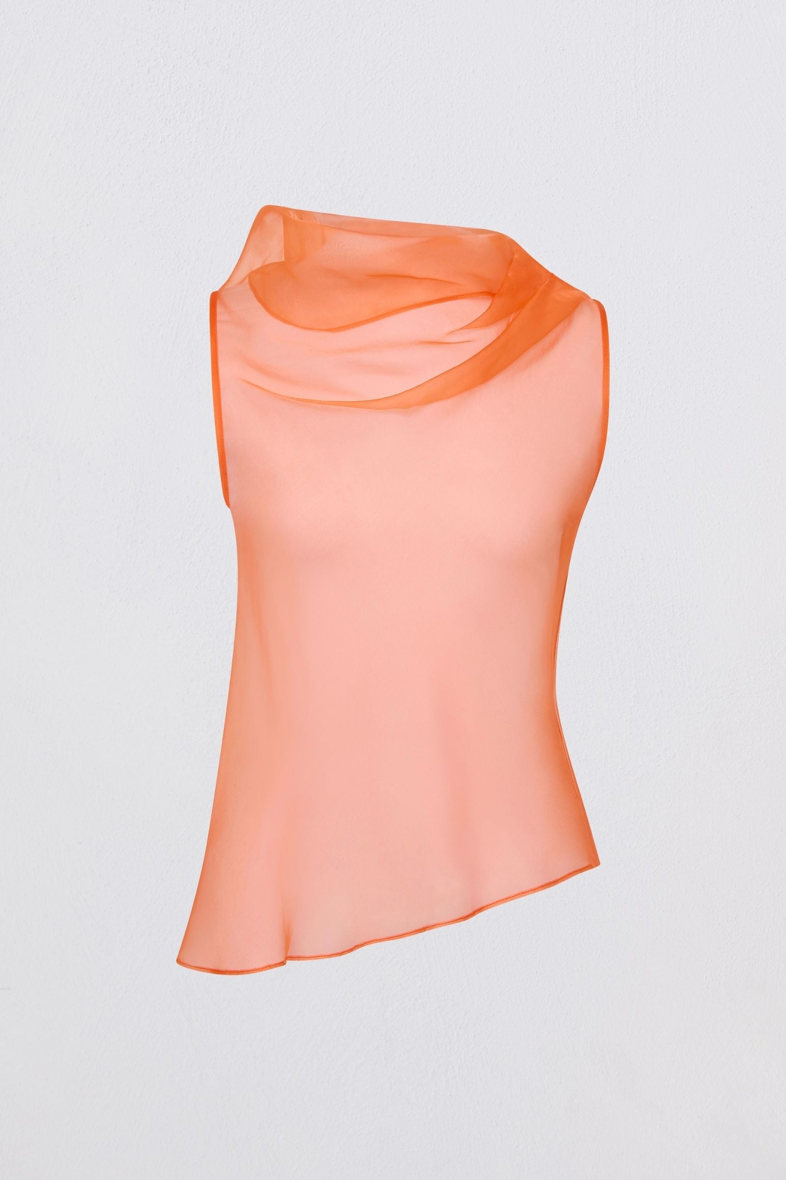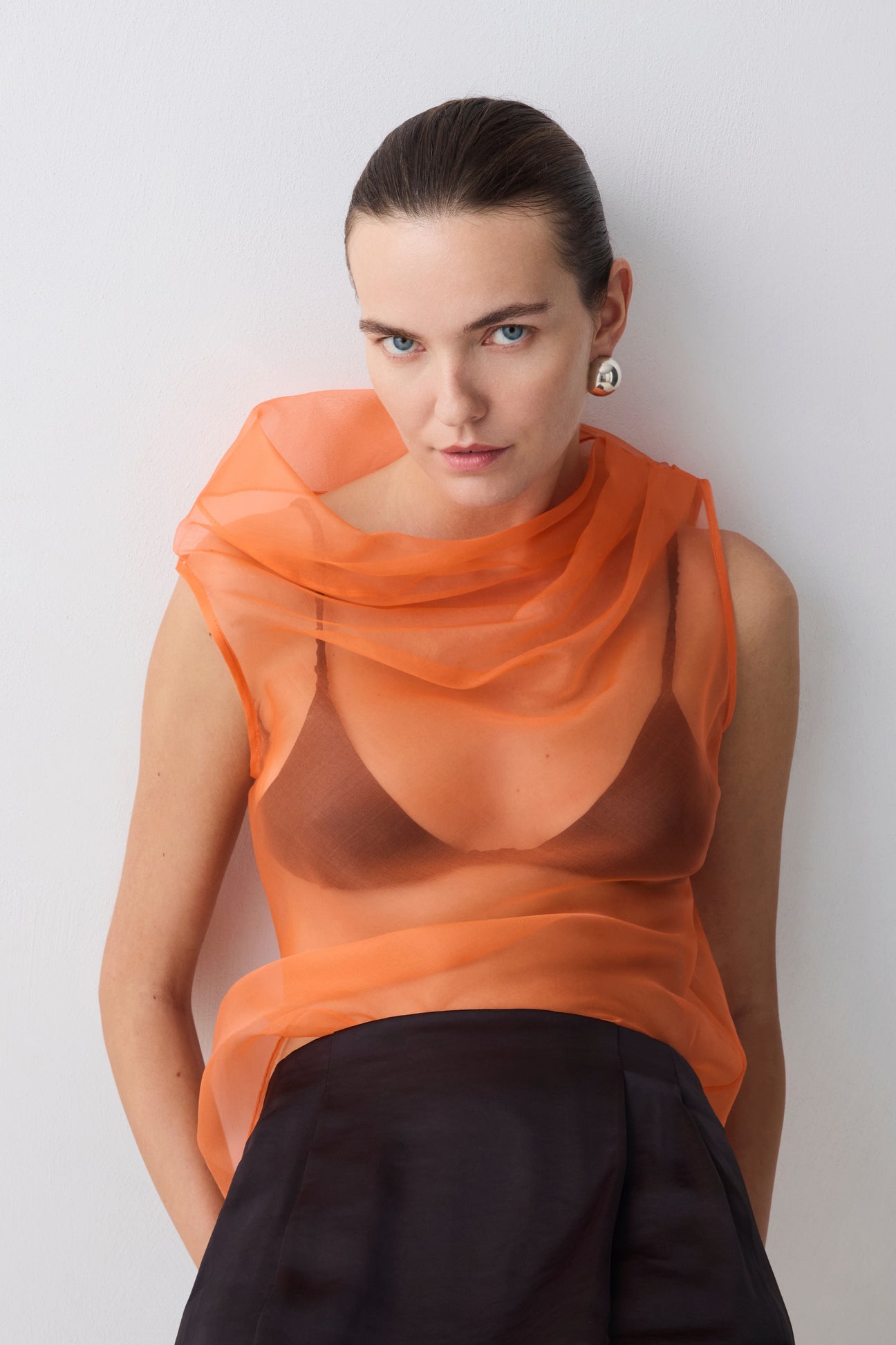 The Mandarin Organza Cezanne Top reimagines our bestselling Cezanne silhouette in a bold, luminous new hue. Crafted from sheer silk organza, the featherlight fabrication drapes fluidly over the body, creating soft movement with an ethereal finish. The signature cowl neckline and asymmetrical shoulder detail bring a sculptural quality to the form, refined through delicate French seams.