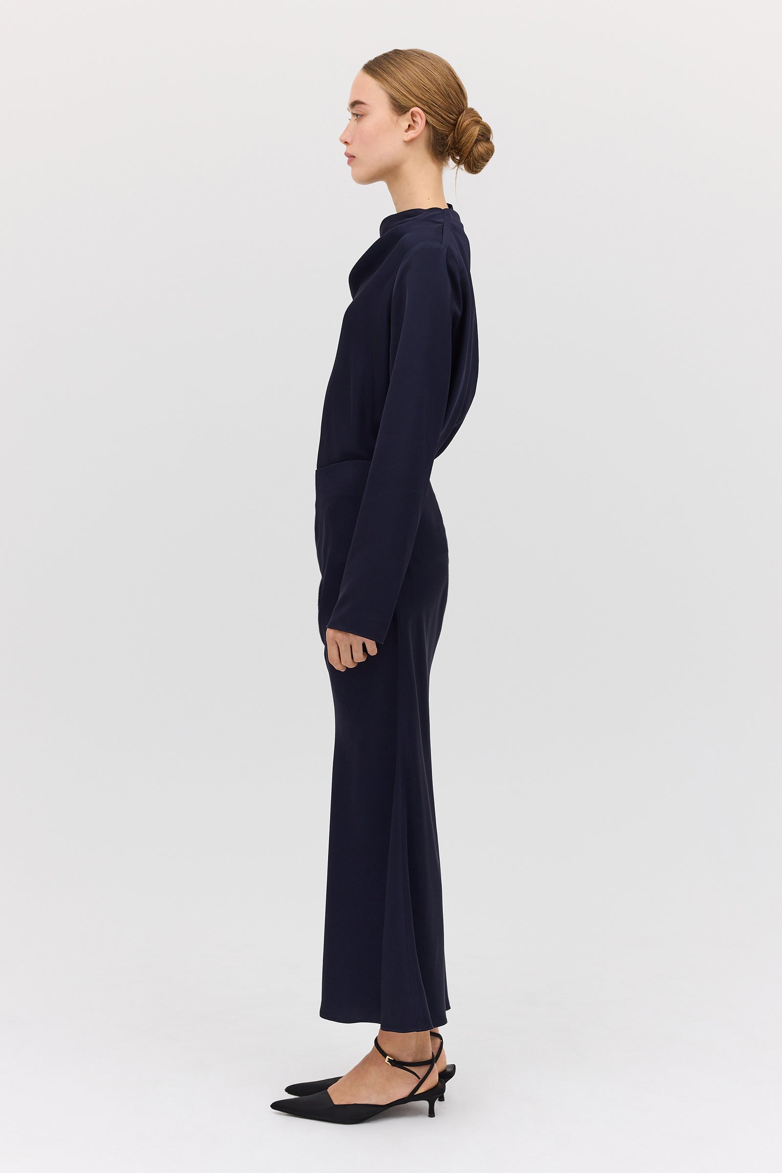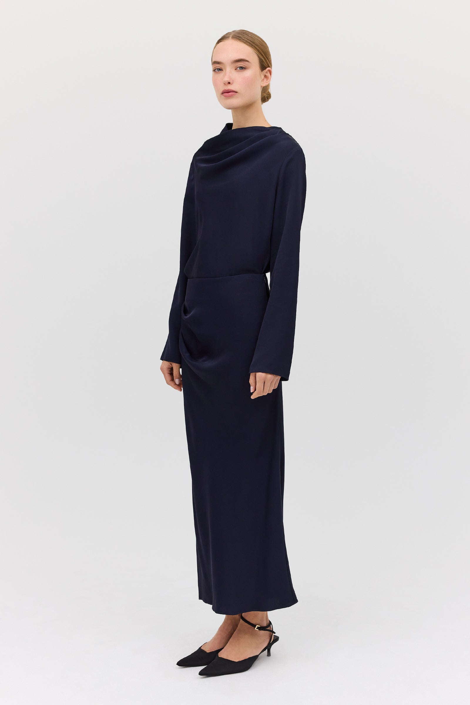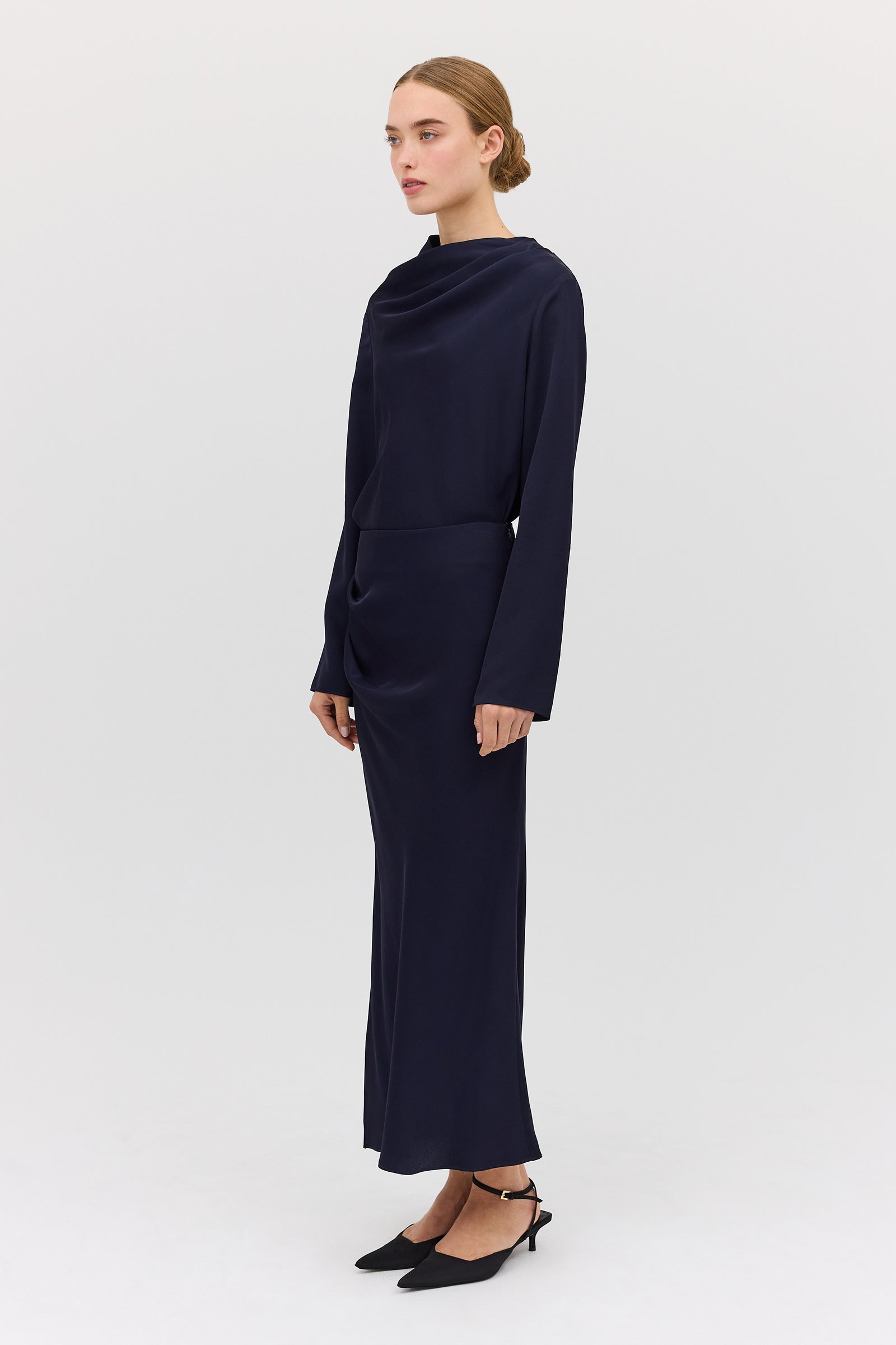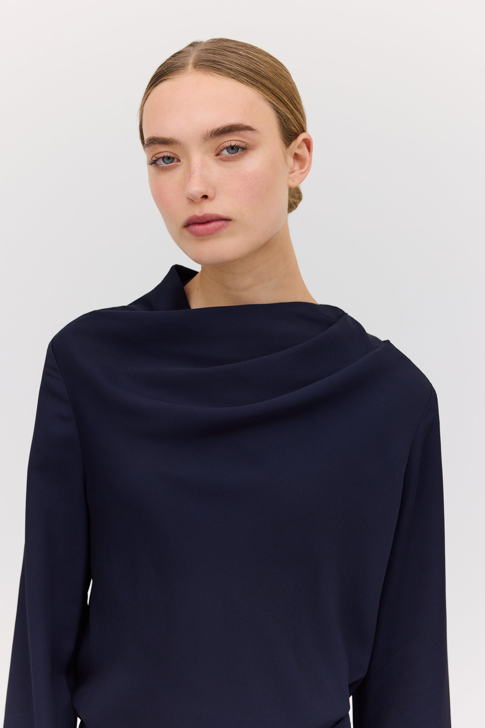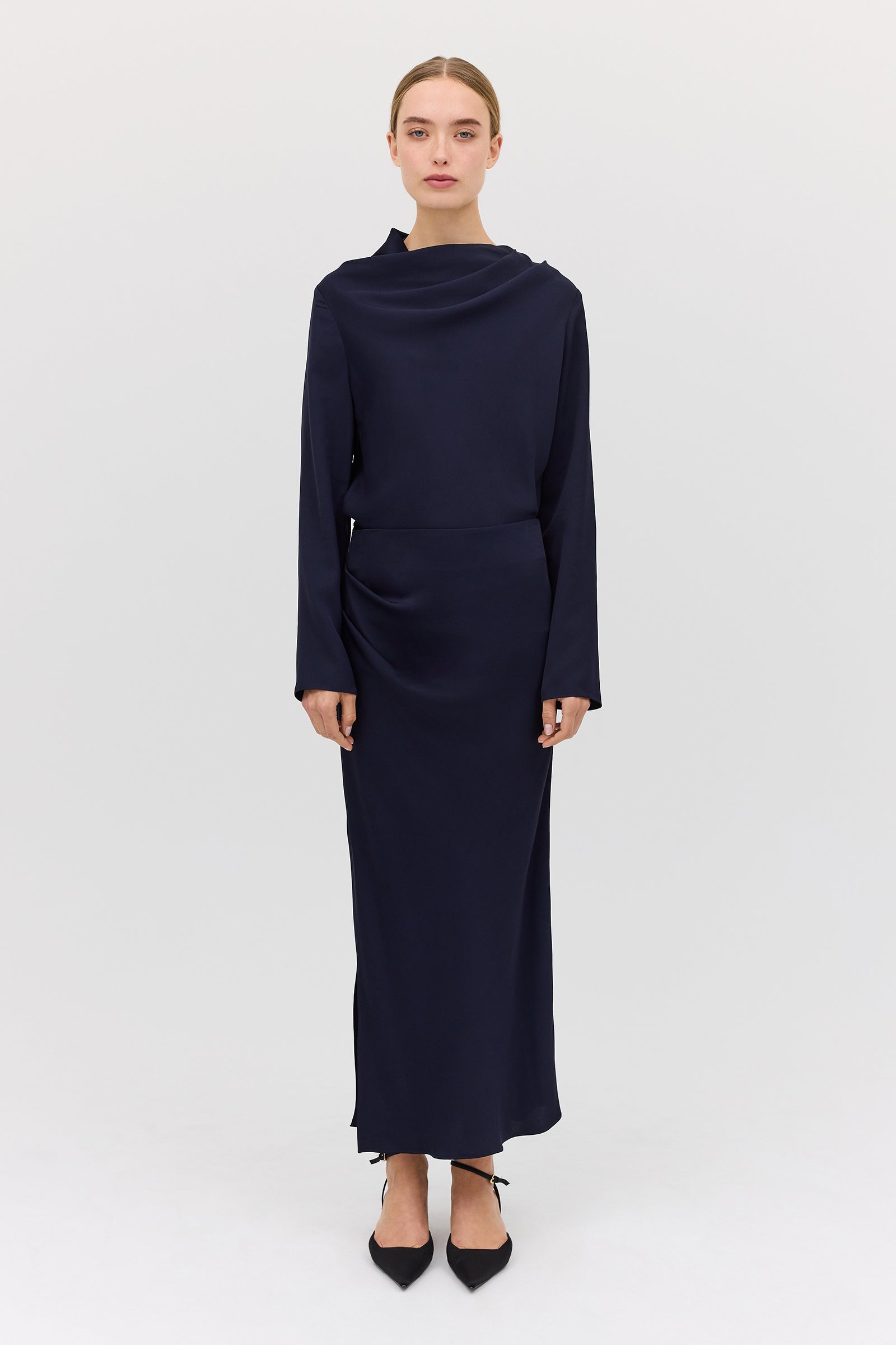 A masterclass in effortless draping, designed with ease in mind, the Navy Satin Crepe Cezanne Top is crafted from delicate satin, soft and lightweight to the touch. Featuring a relaxed fit, designed to float and move with you, the Cezanne Top is designed as an upgrade on the everyday cotton shirting, easily elevating your look from day to night.