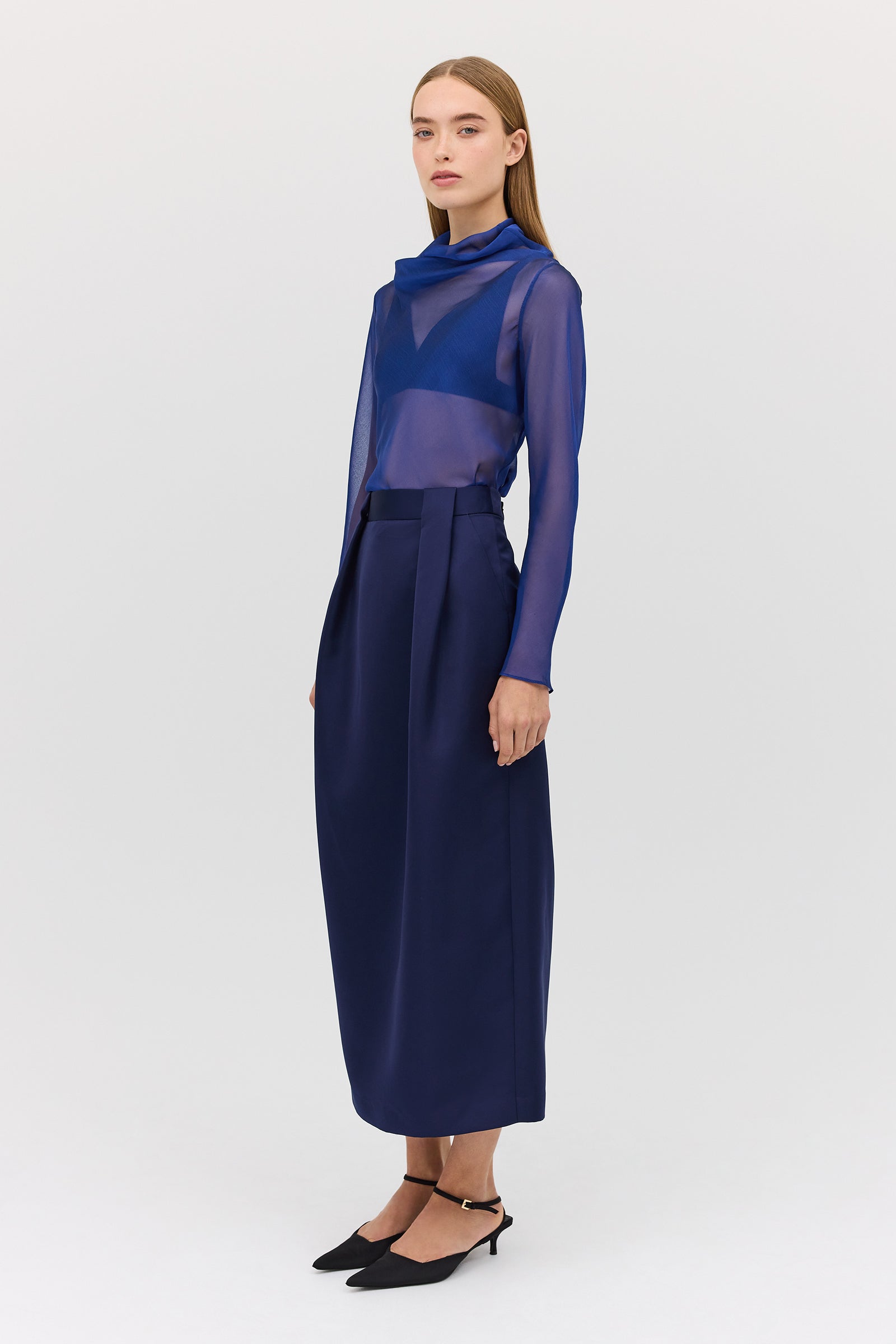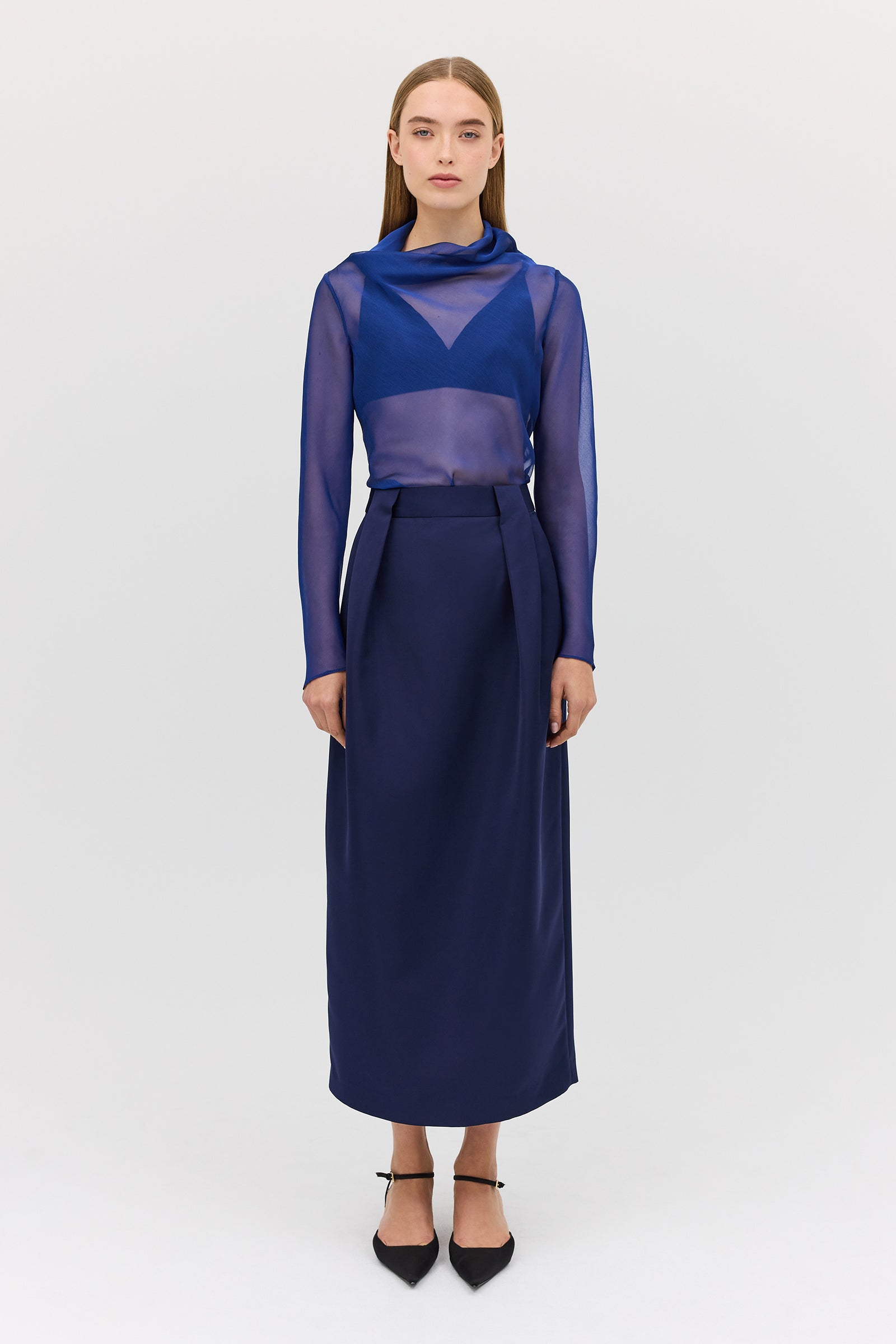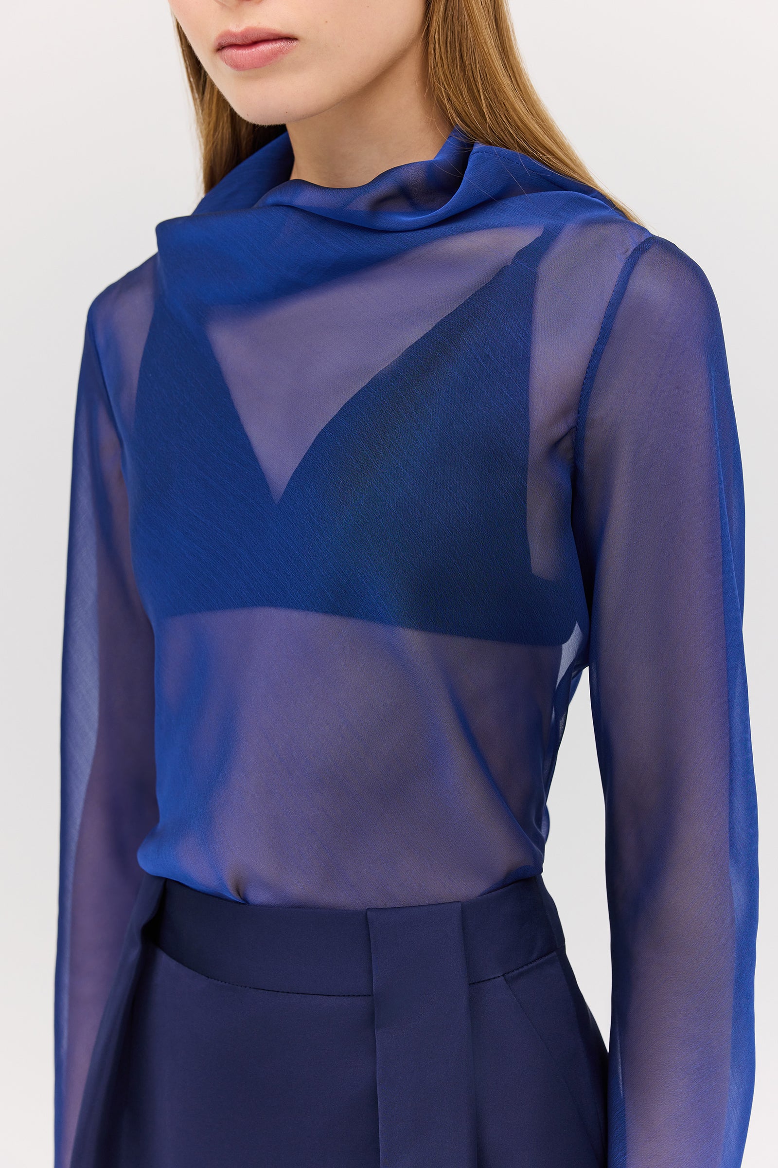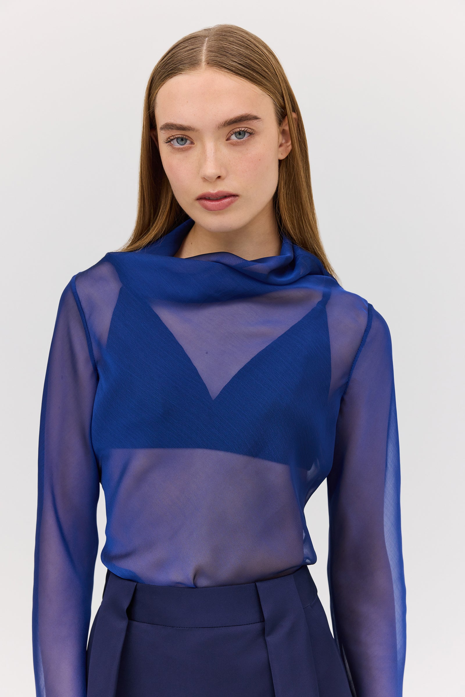 Your most-loved Tatiana Top is back, re-imagined for a new season, in our striking Royal Chiffon colourway. Long-sleeved yet sheer in nature, the Tatiana Top plays into the notion of concealment and revelation that underpins the theme of intimacy this season. Featuring a gently draped cowl neckline, and cut from our signature lightweight chiffon, this piece is intended to glide over the body, softly skimming the form.