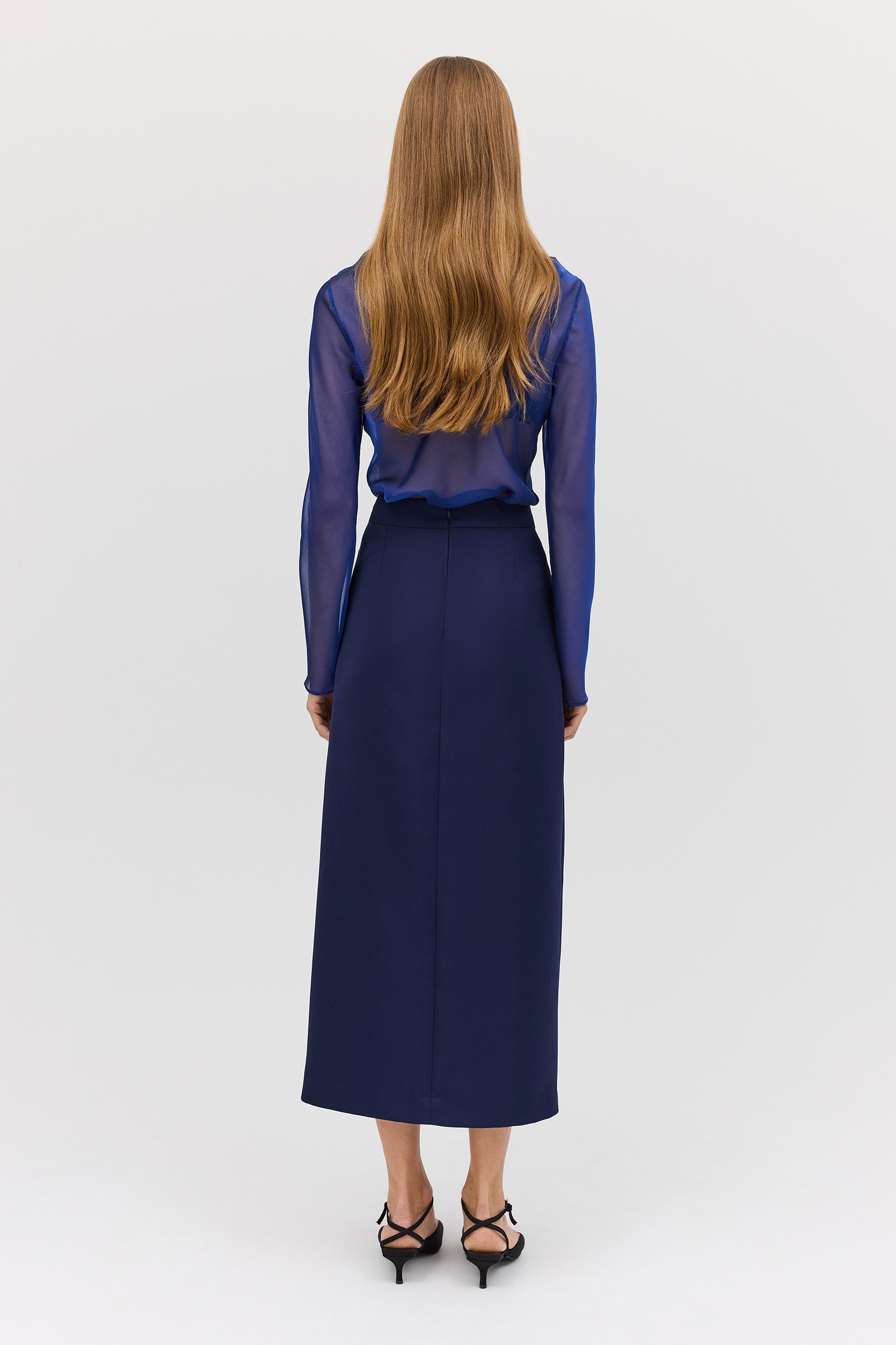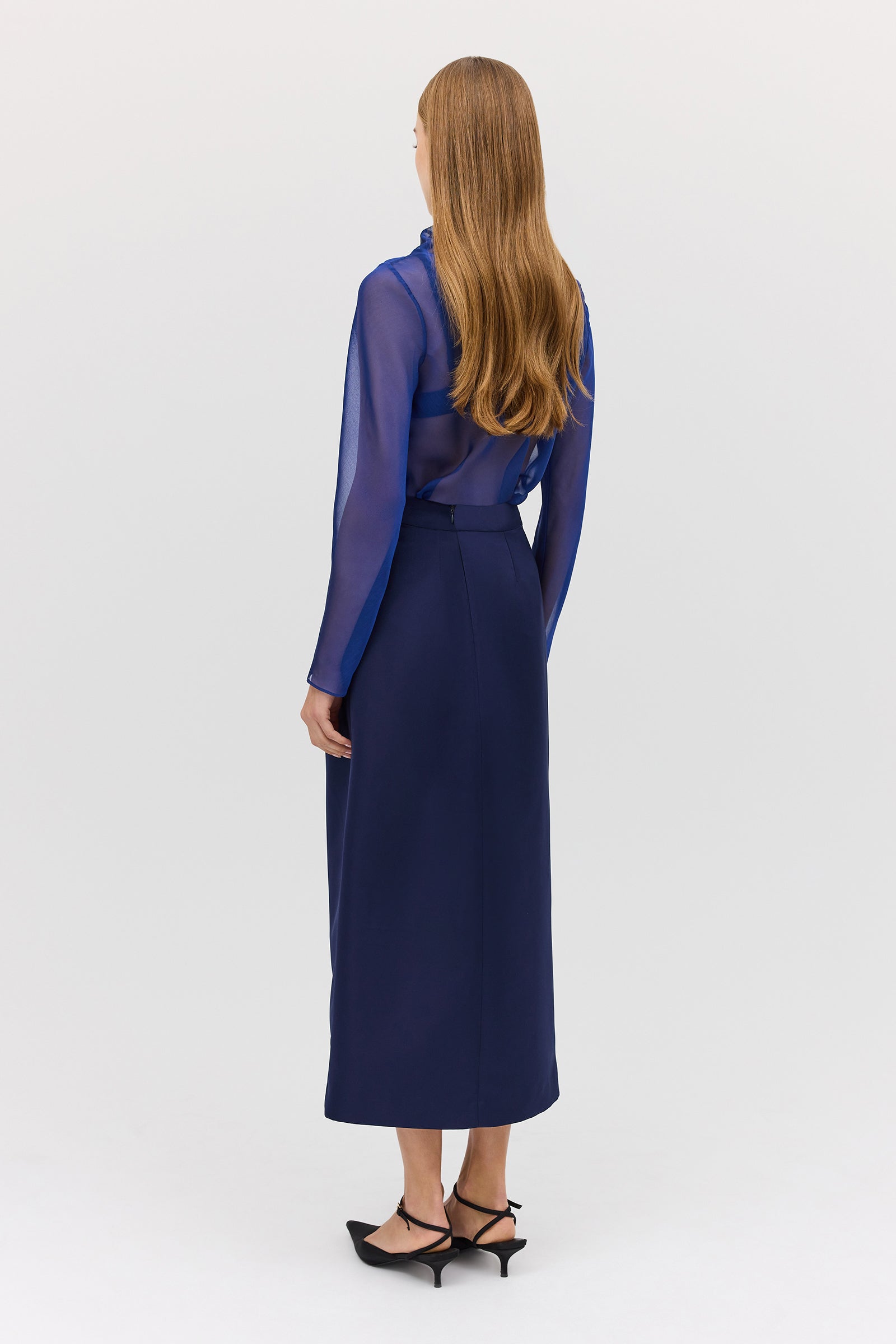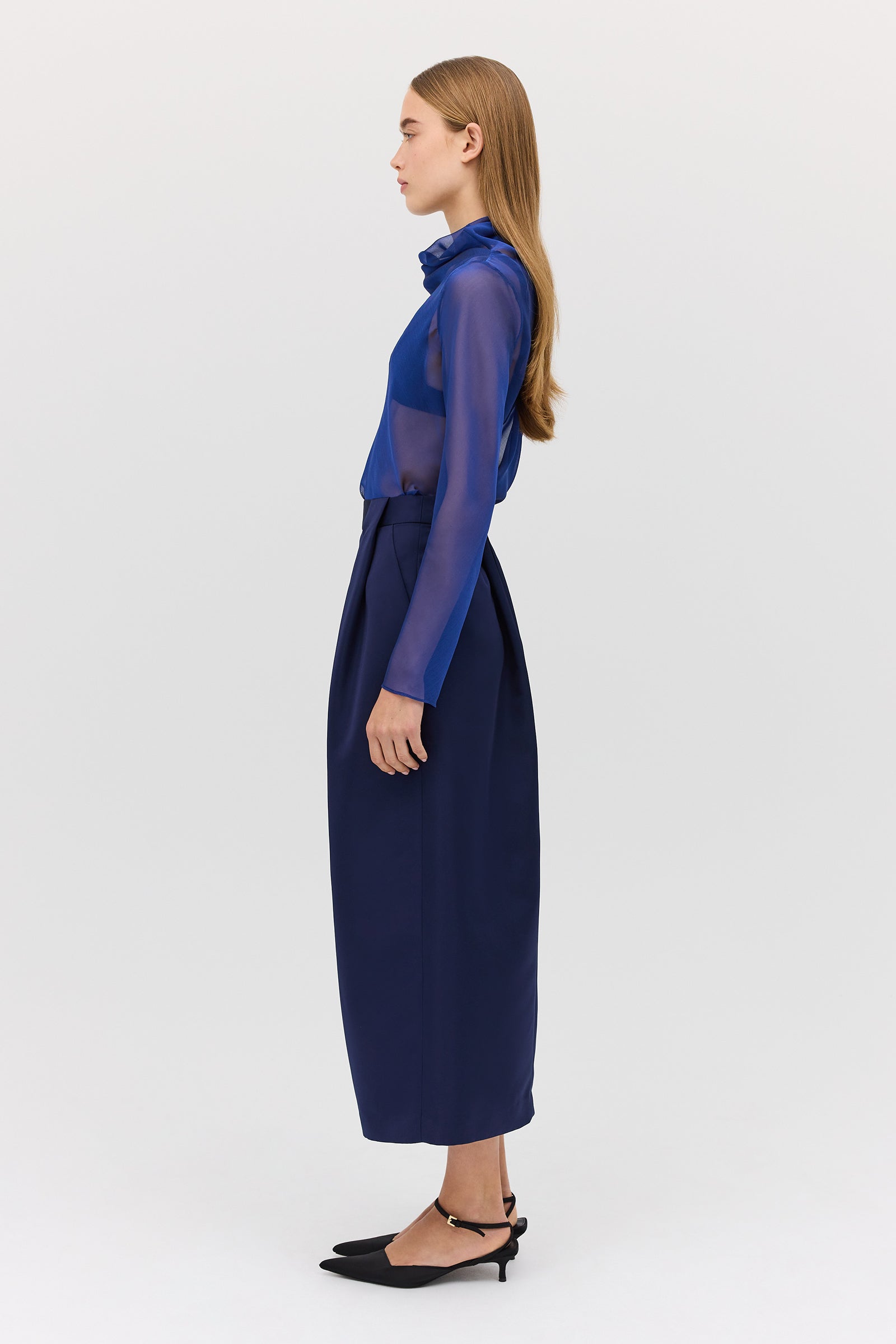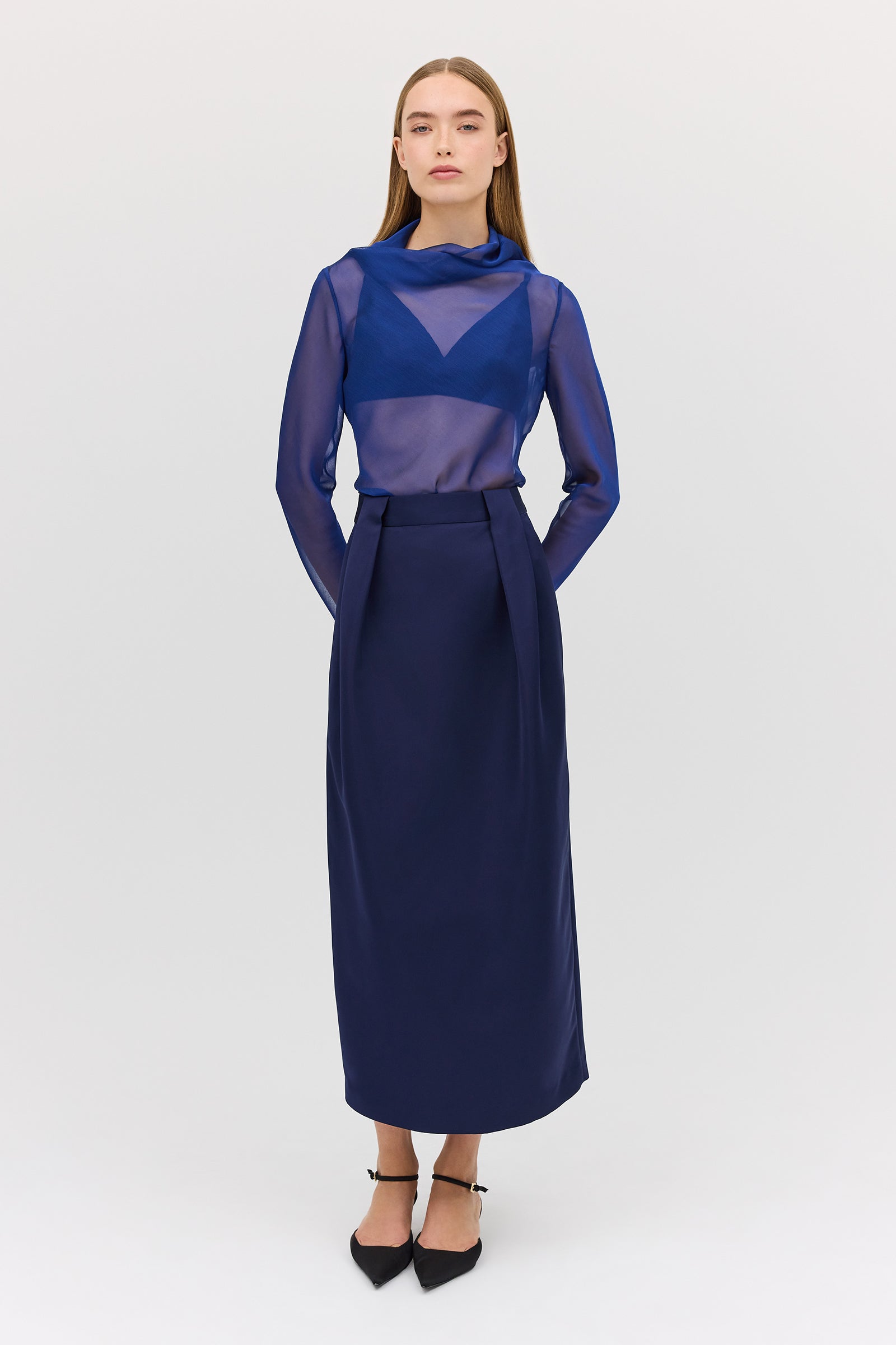 Your most-loved Tatiana Top is back, re-imagined for a new season, in our striking Royal Chiffon colourway. Long-sleeved yet sheer in nature, the Tatiana Top plays into the notion of concealment and revelation that underpins the theme of intimacy this season. Featuring a gently draped cowl neckline, and cut from our signature lightweight chiffon, this piece is intended to glide over the body, softly skimming the form.