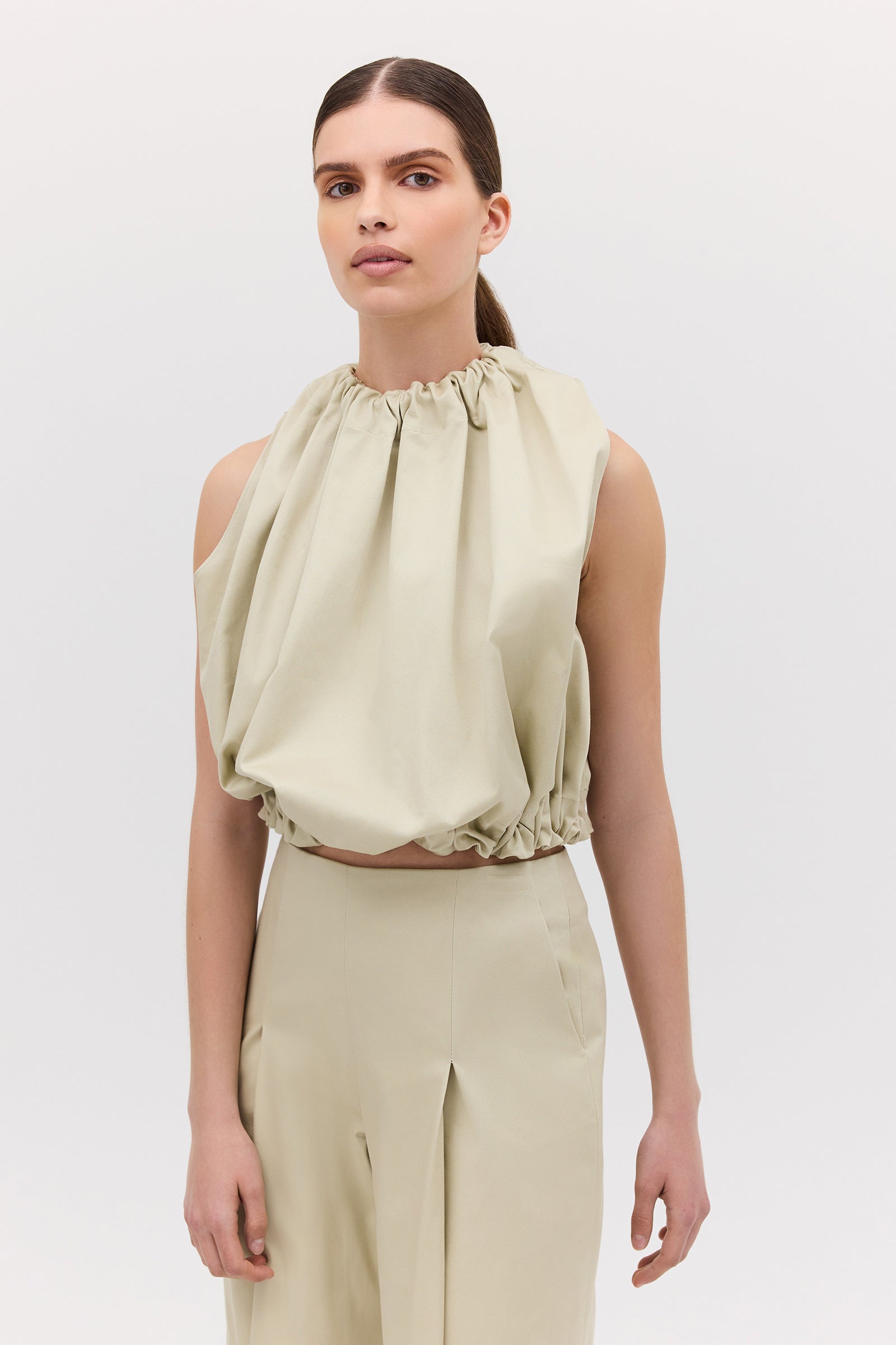 The most-loved Emerge silhouette returns, now reimagined in structured cotton for a more sculptural interpretation. Defined by a high gathered neckline and voluminous form, the shape creates soft architectural folds that hold their form while still allowing movement and lightness.