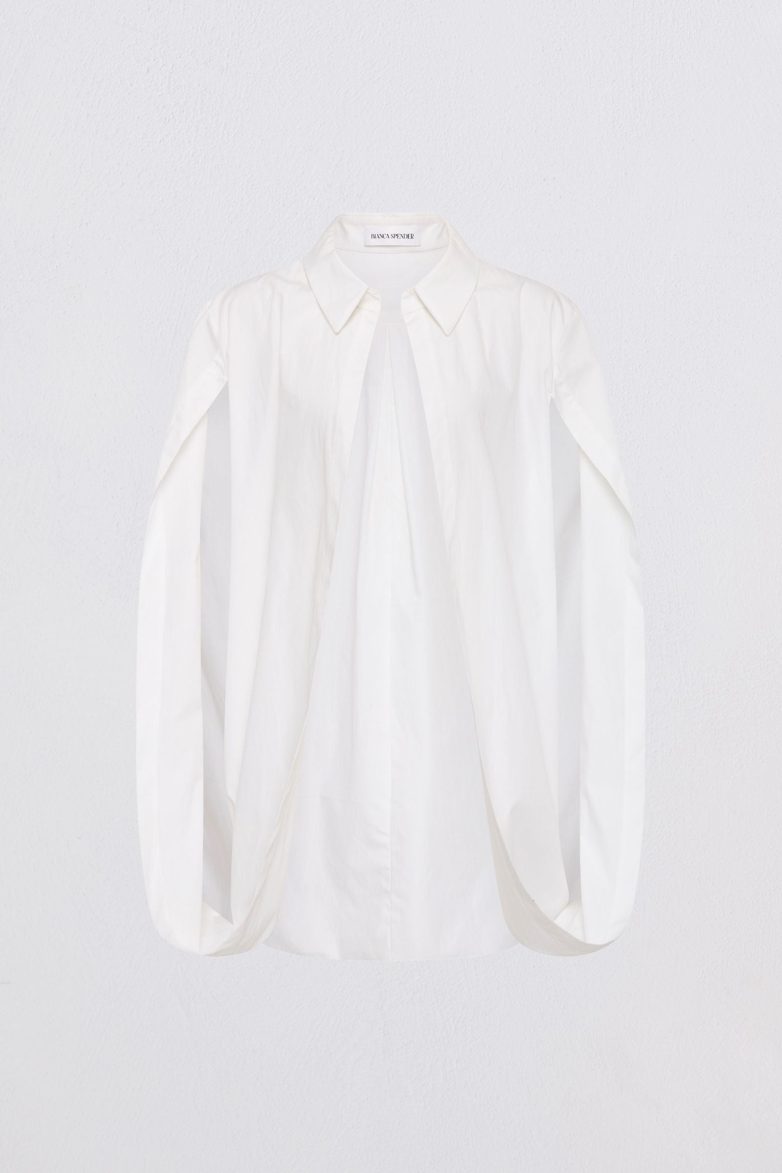 As seen on the AFW runway, the Abandon Shirt is a dramatic reimagining of classic shirting. Cut in crisp white cotton, this resort-ready piece features a structured lapel collar and flowing open sleeves that fall into soft cape-like panels.