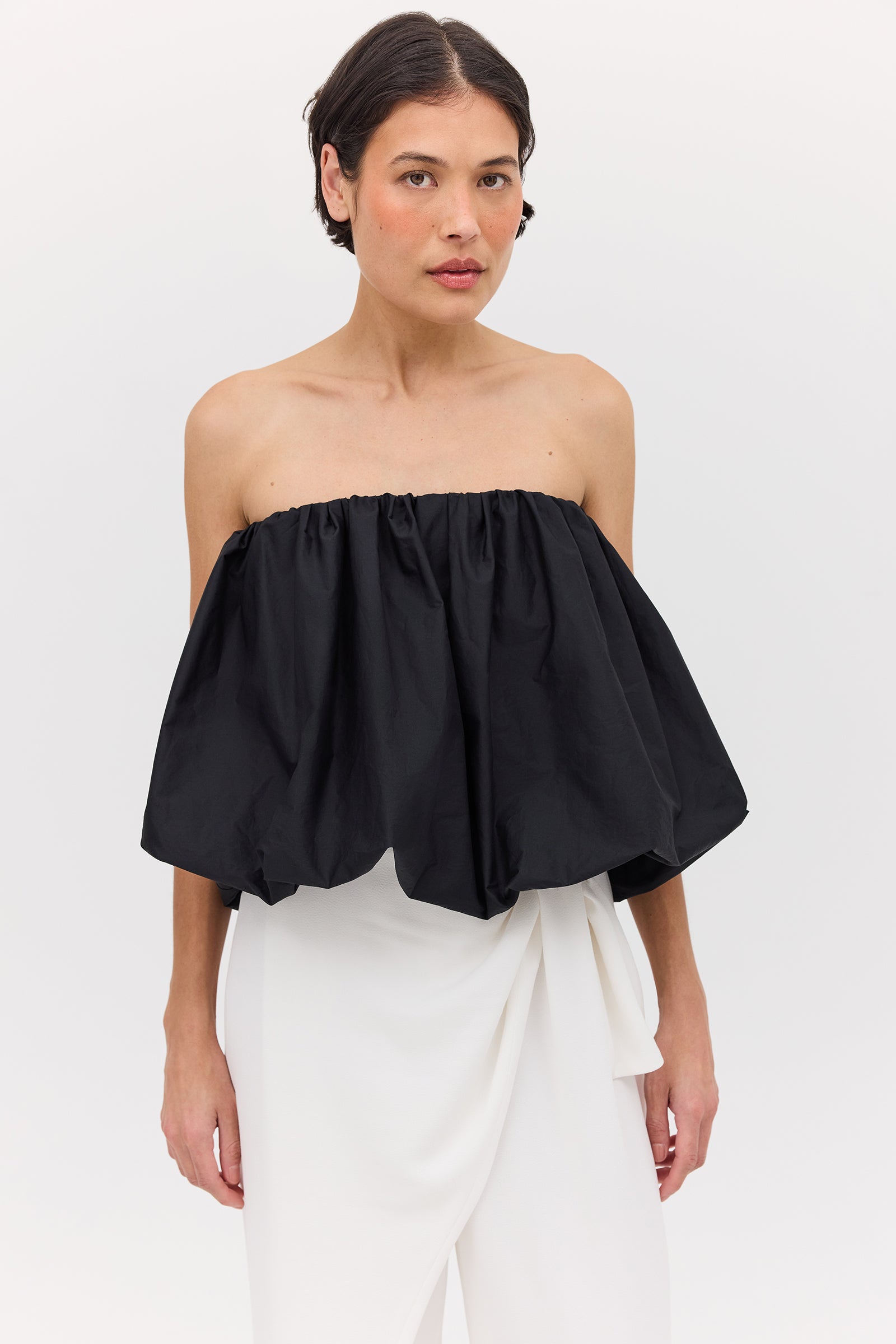 Introducing the Black Cotton Hazel Top, our take on the bubble shape. Designed to be worn multi-way to give you multiple outfit options with just one piece of clothing. The Hazel Top, crafted from an encompassing black cotton poplin, features a knitted under-layer to hold you in and eliminate the need for a bra.