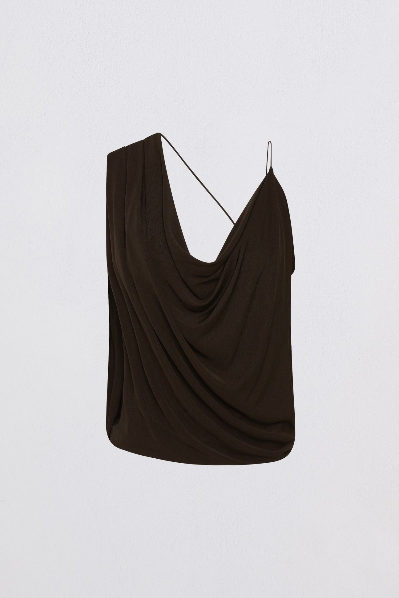 Sculptural drape and sensual softness define the Liquid Top in Chocolate. Crafted from stretch jersey and fully lined for a smooth fit, the silhouette falls into a soft cowl neckline with fluid asymmetry. The open back adds a subtle reveal, while the front gathers into architectural folds that skim the body with ease. A refined evening option or elevated daywear staple, it captures the essence of quiet drama and understated elegance.
