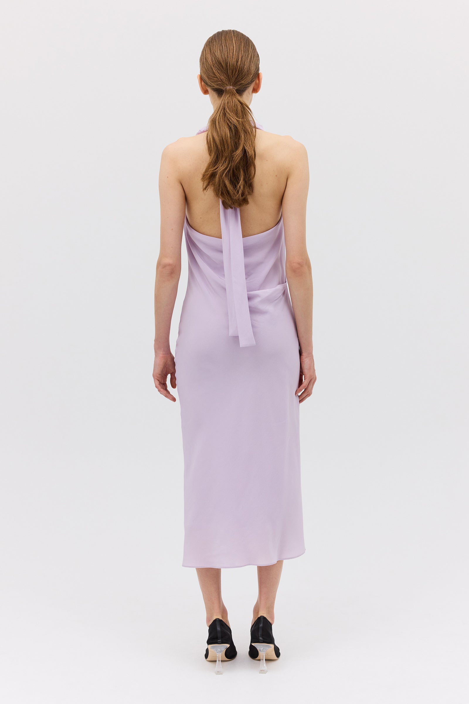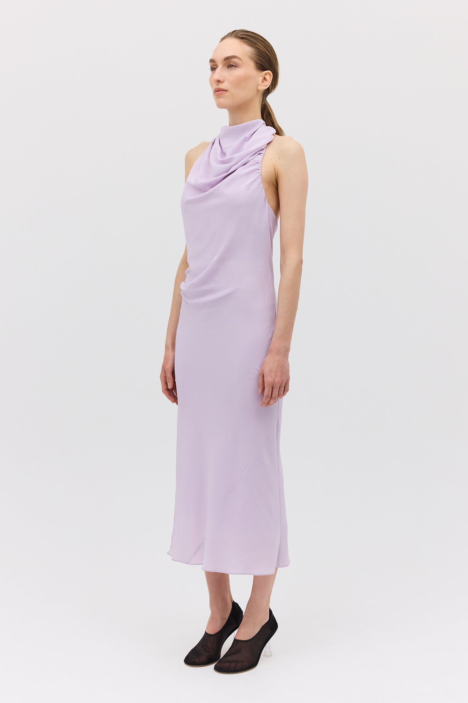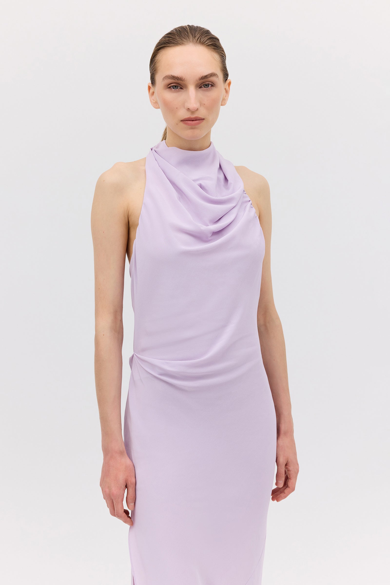 A study in fluidity and form, the Sublimate Dress returns in a new lilac colourway—an ethereal, light-catching hue that celebrates softness. Crafted in pure silk CDC, this silhouette skims the body with a gentle bias cut that creates natural movement. The high draped neckline softly folds across the collarbone, contrasted by a plunging low back that reveals the skin with quiet elegance.