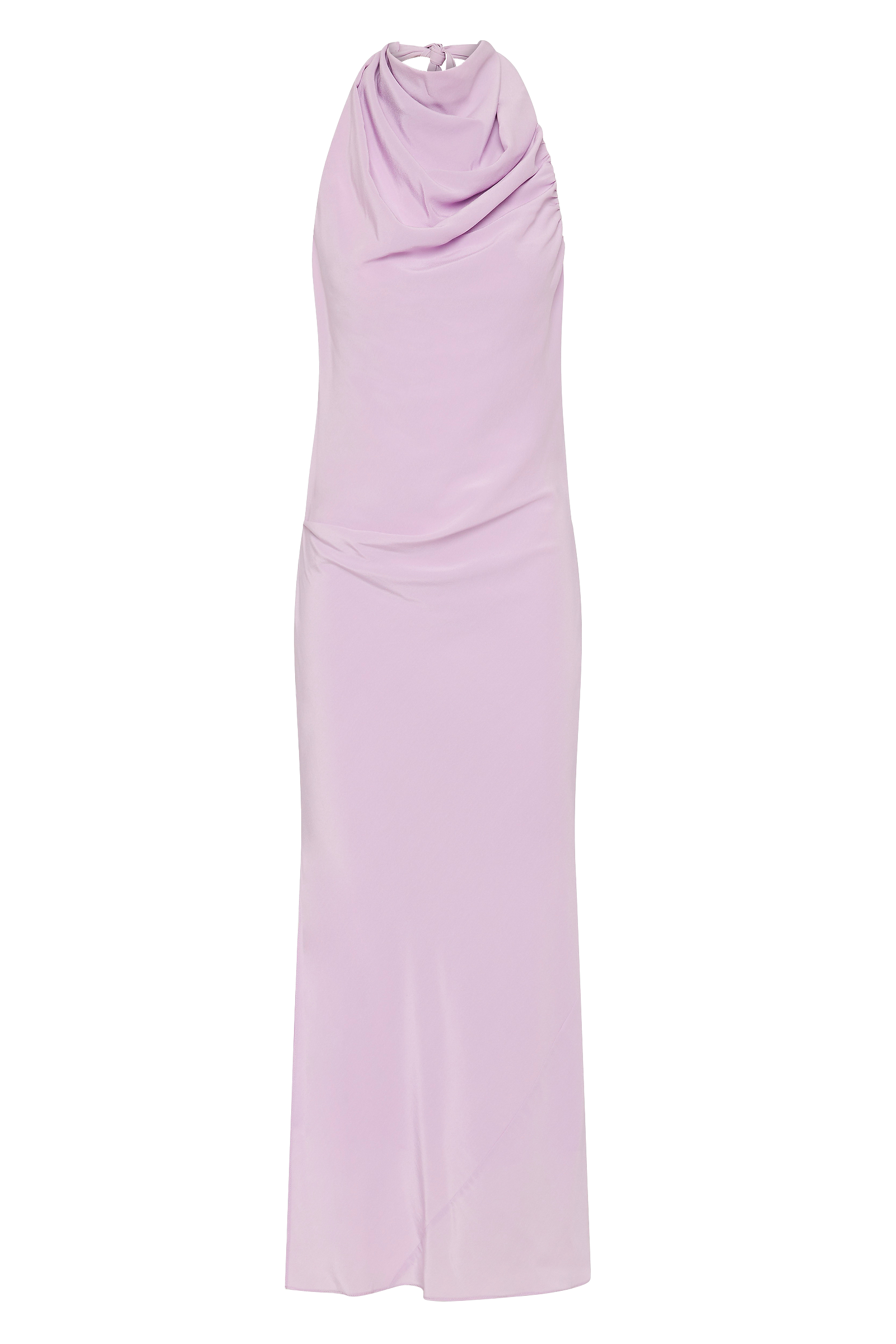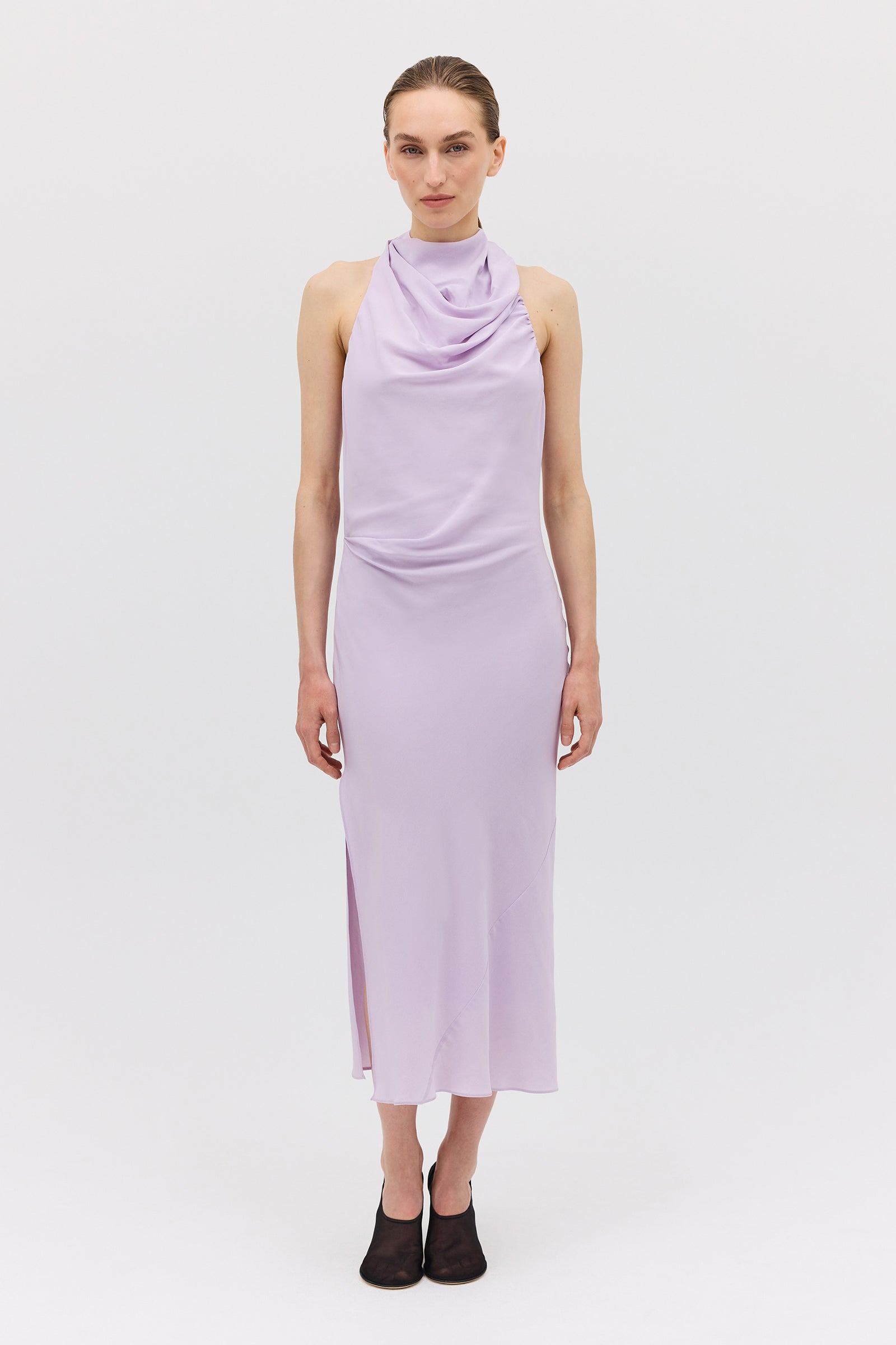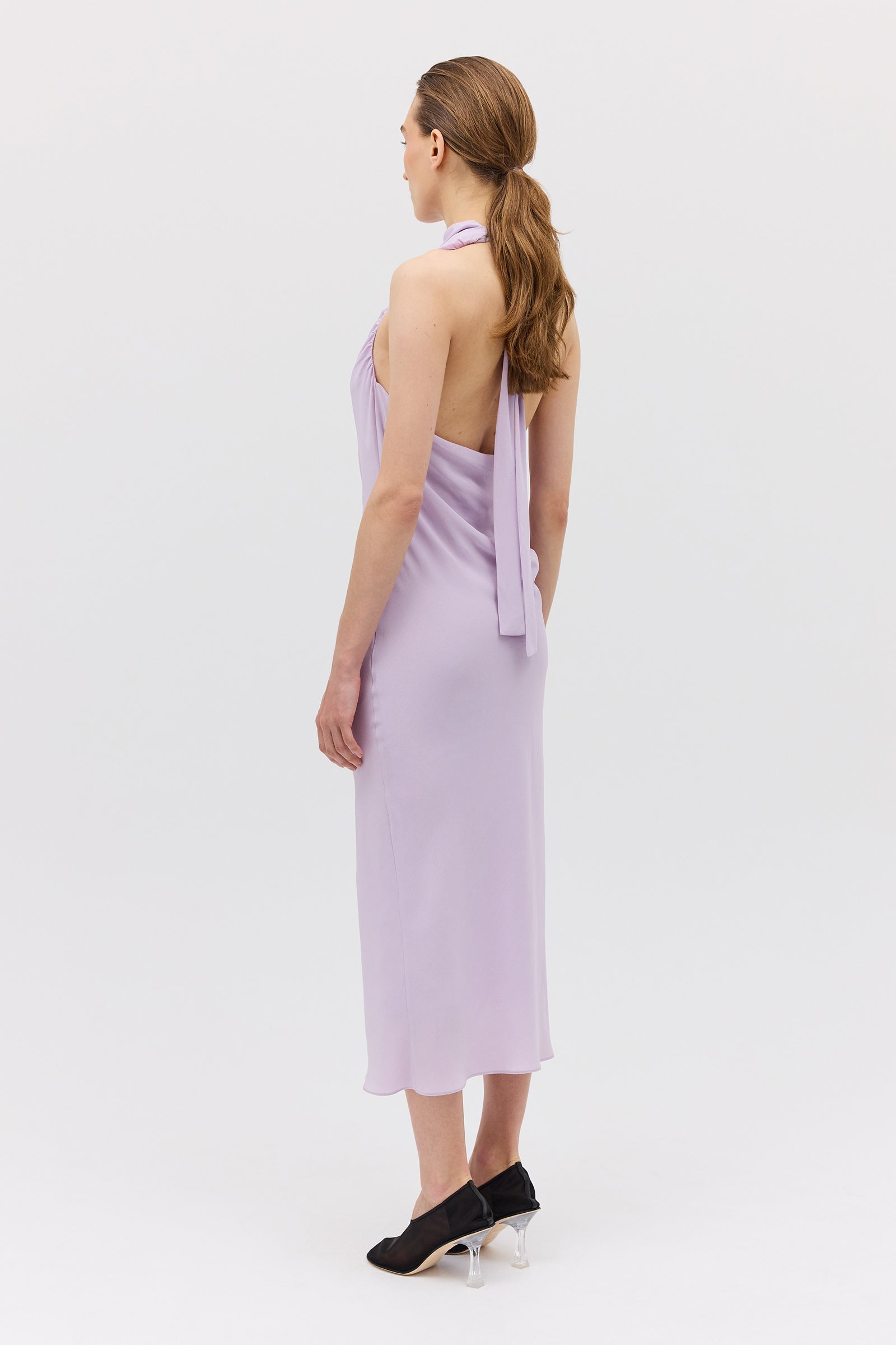 A study in fluidity and form, the Sublimate Dress returns in a new lilac colourway—an ethereal, light-catching hue that celebrates softness. Crafted in pure silk CDC, this silhouette skims the body with a gentle bias cut that creates natural movement. The high draped neckline softly folds across the collarbone, contrasted by a plunging low back that reveals the skin with quiet elegance.