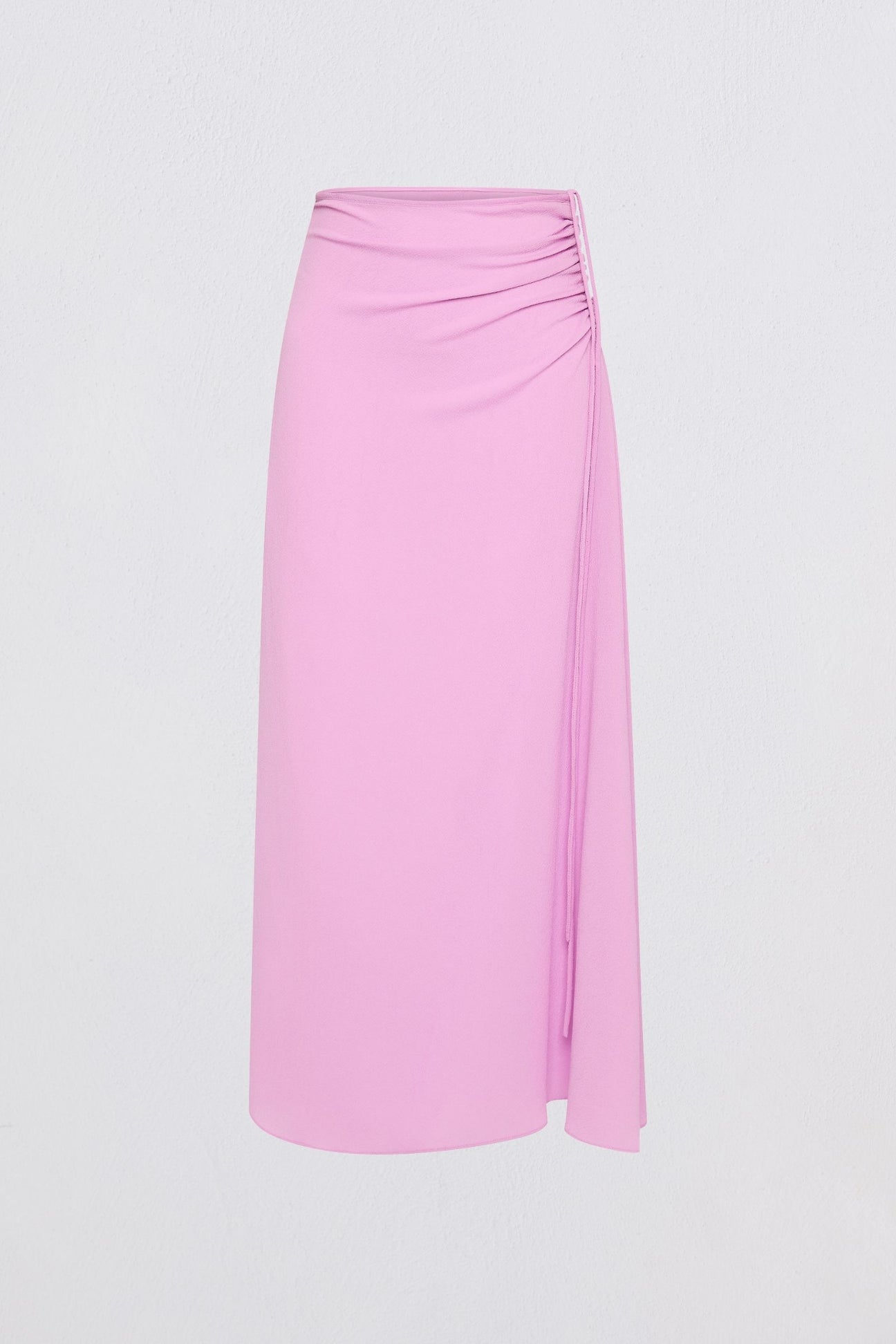 The drawstring detail at the front allows for styling versatility. Wear it ruched or relaxed, to the side, centre or back. A subtle split to the knee reveals movement, while the fluid crinkle fabric lends ease and elegance.