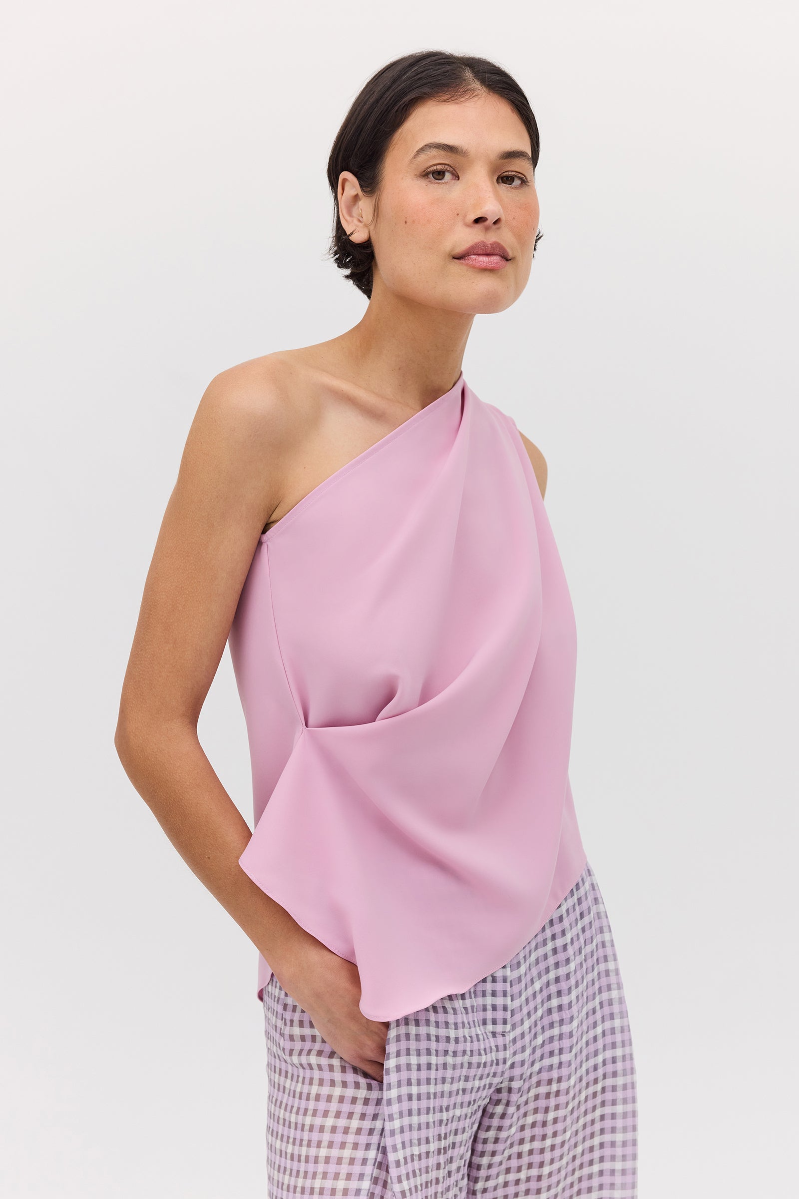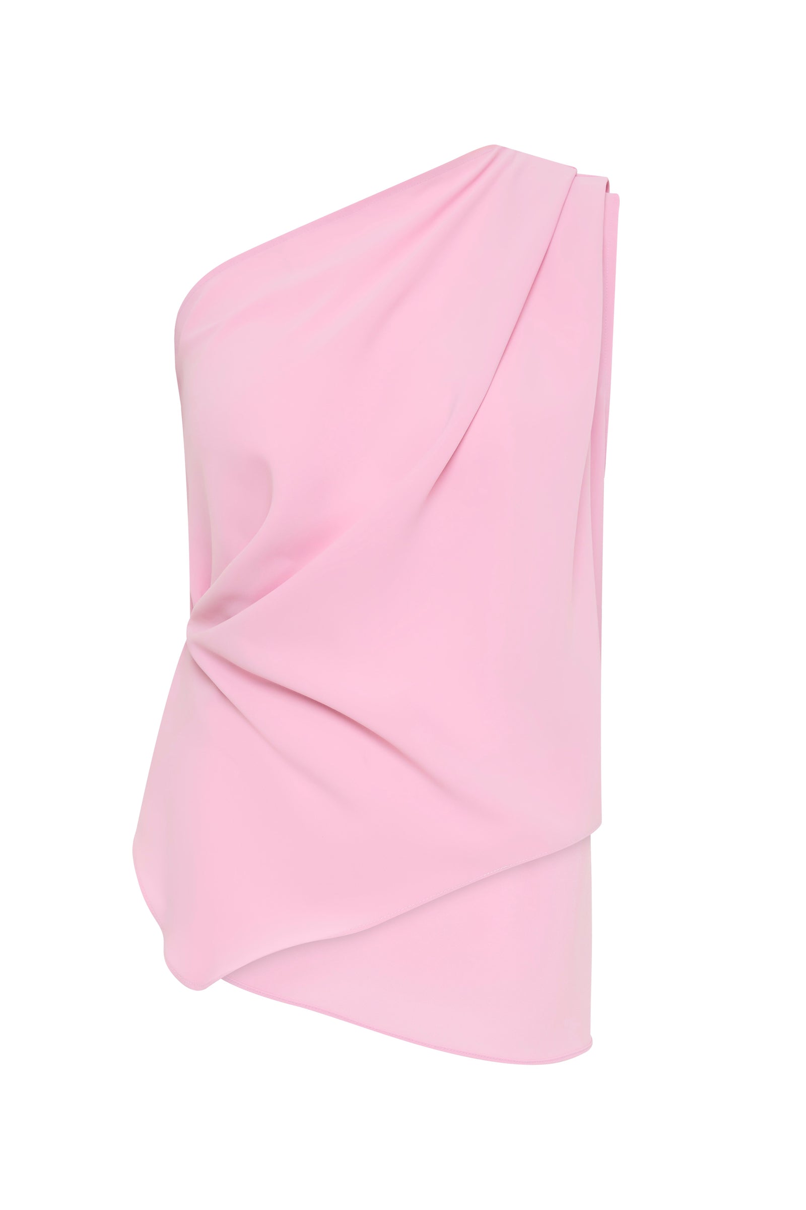 Introducing our Antonia Top. A one-piece drape, signature to Bianca Spender constructed from vibrant Rose Pink Georgette. The one-shoulder design drapes down the body creating an asymmetrical design that explores softness.