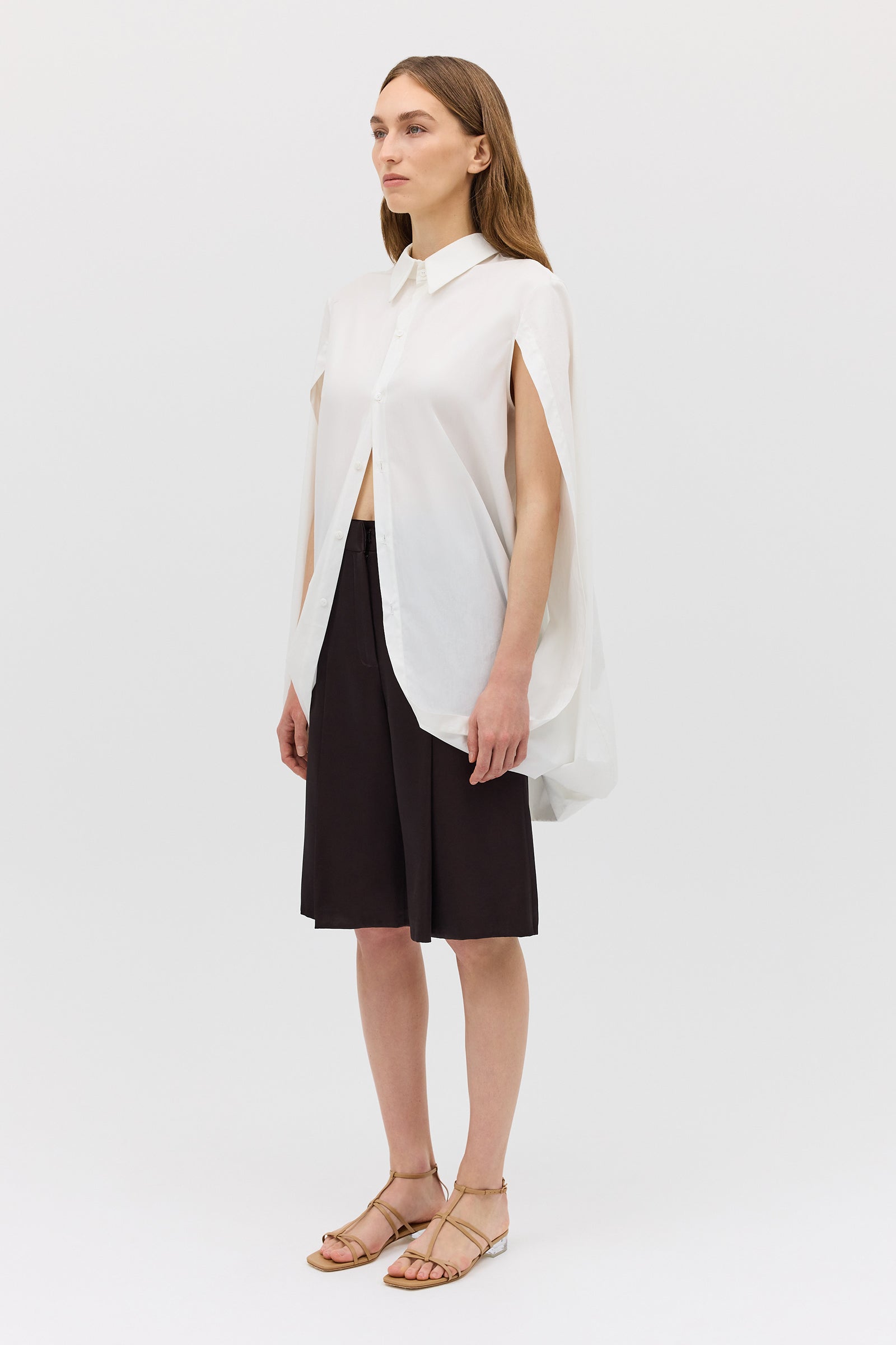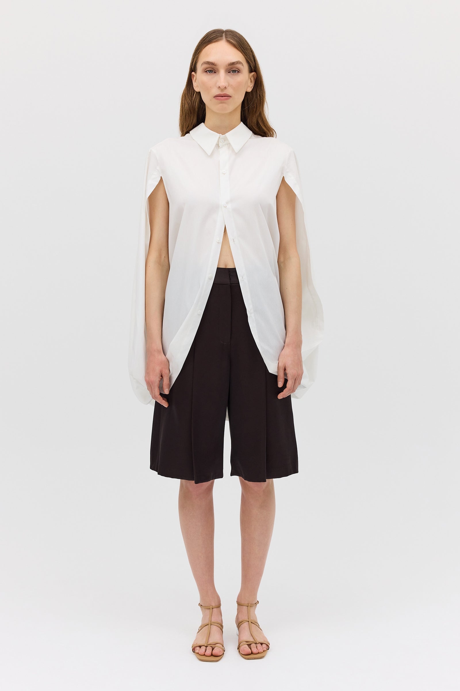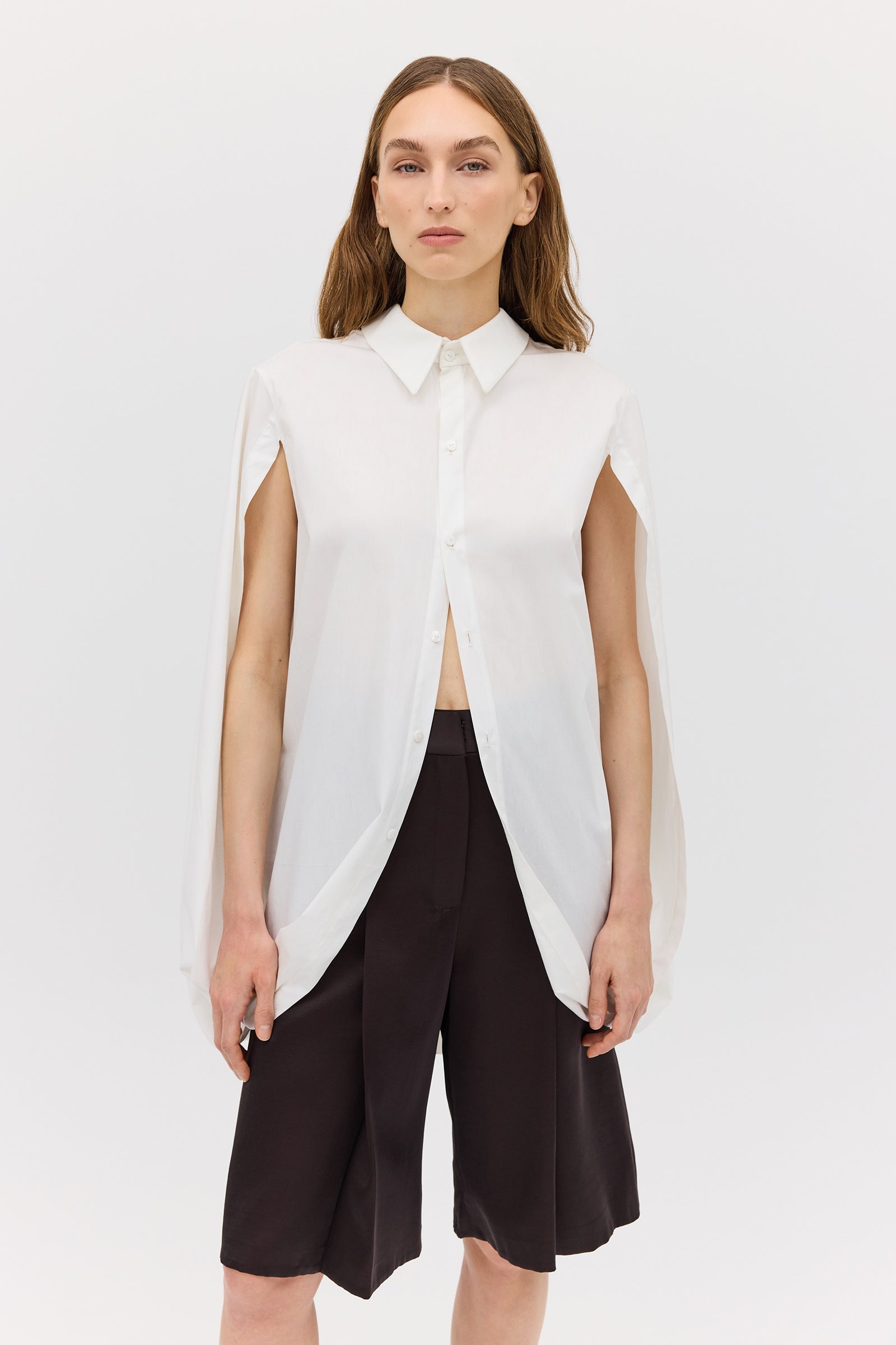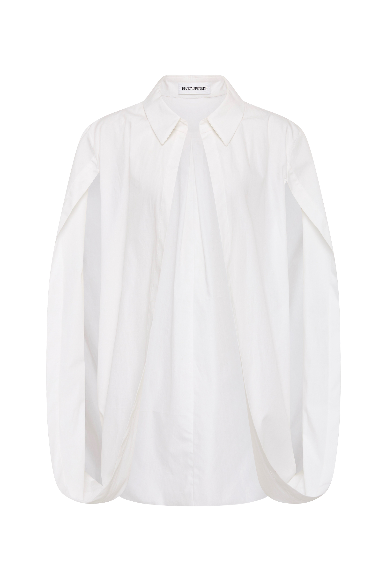 As seen on the AFW runway, the Abandon Shirt is a dramatic reimagining of classic shirting. Cut in crisp white cotton, this resort-ready piece features a structured lapel collar and flowing open sleeves that fall into soft cape-like panels.