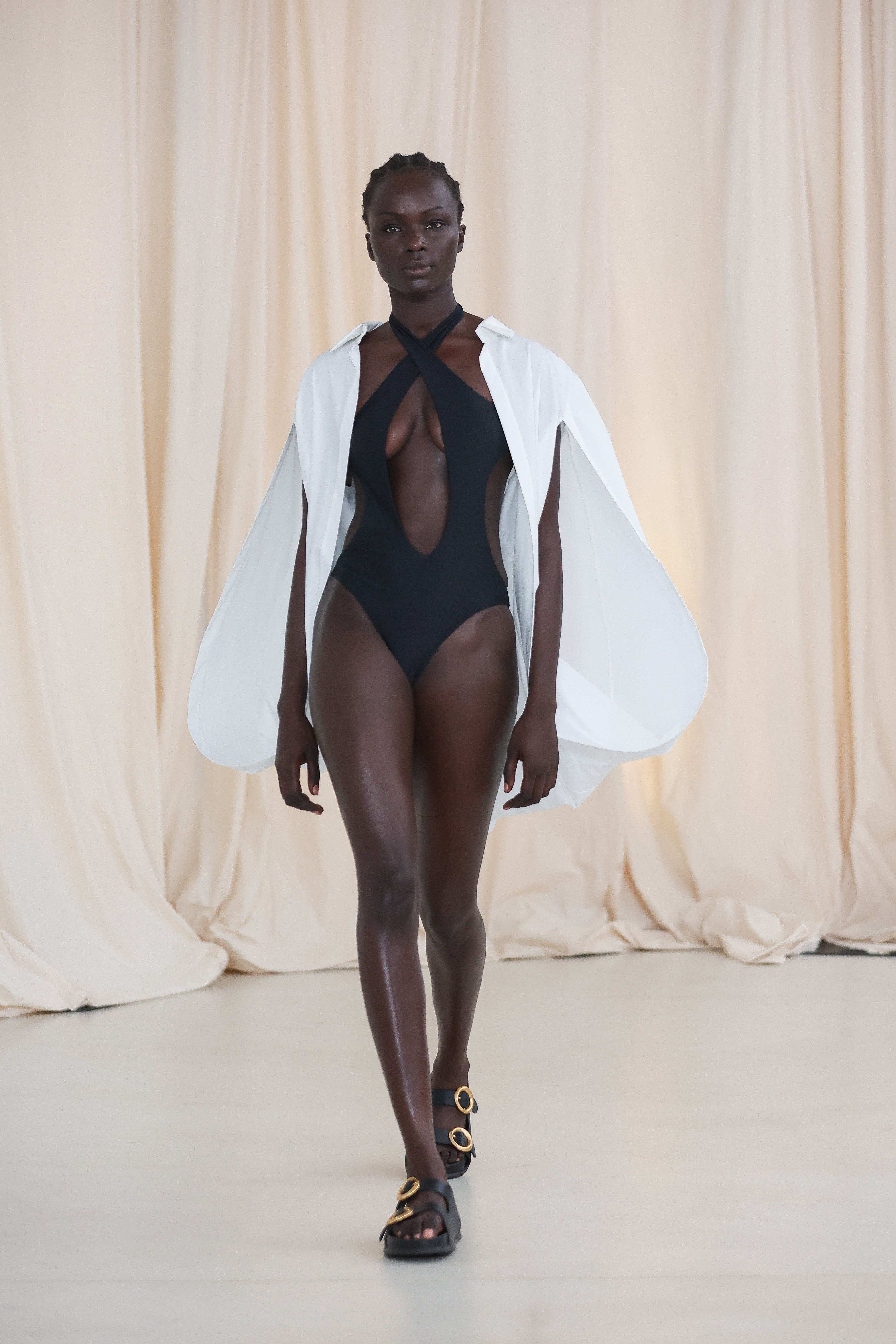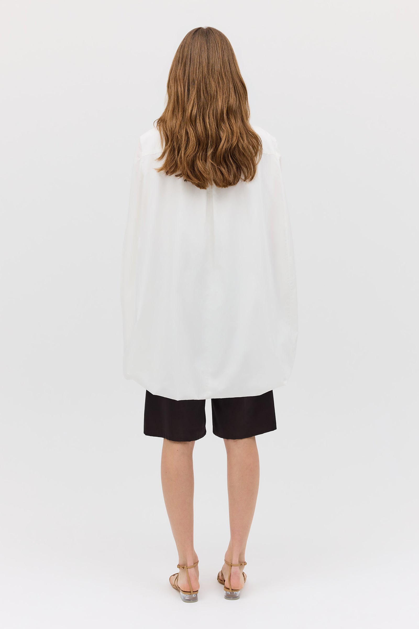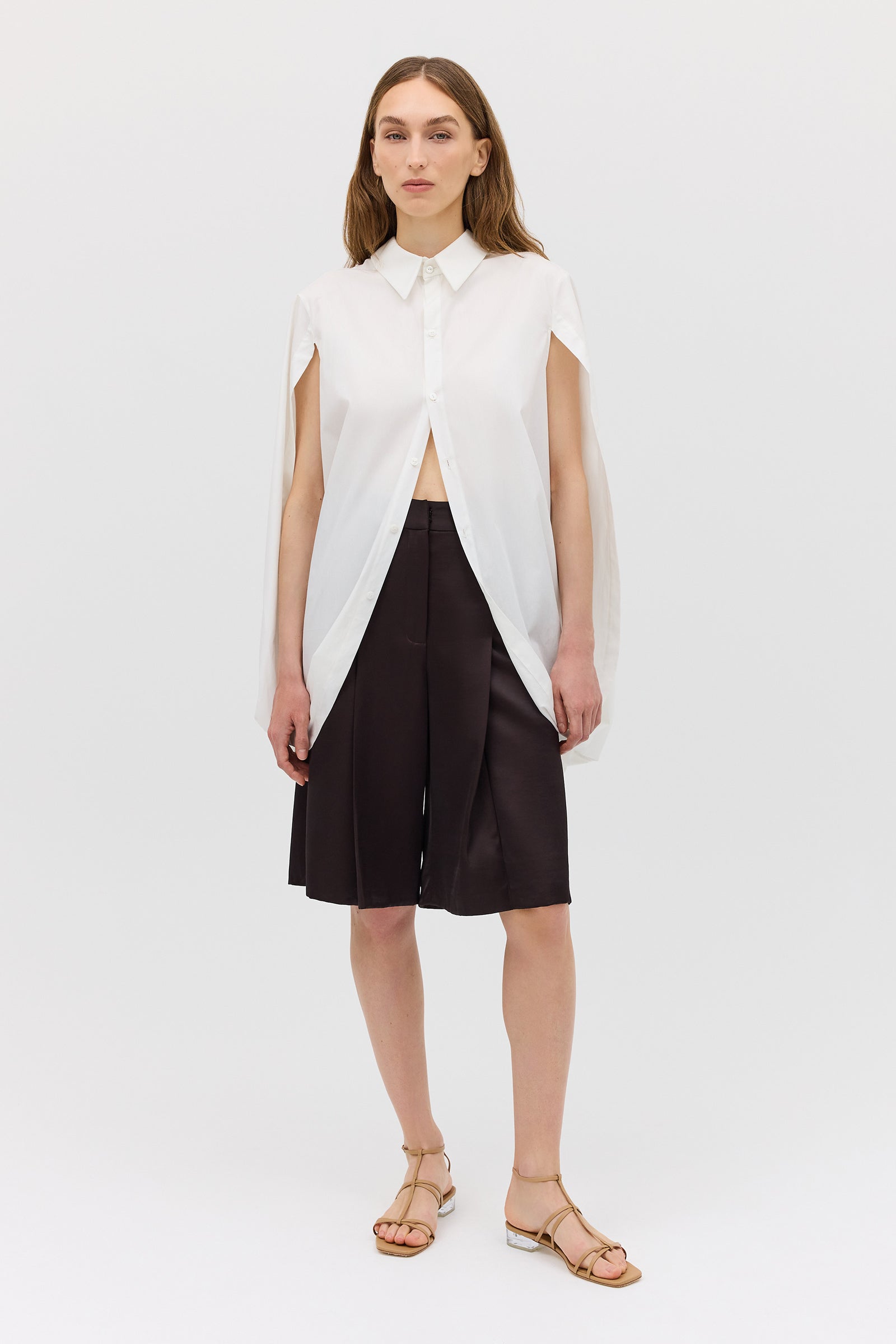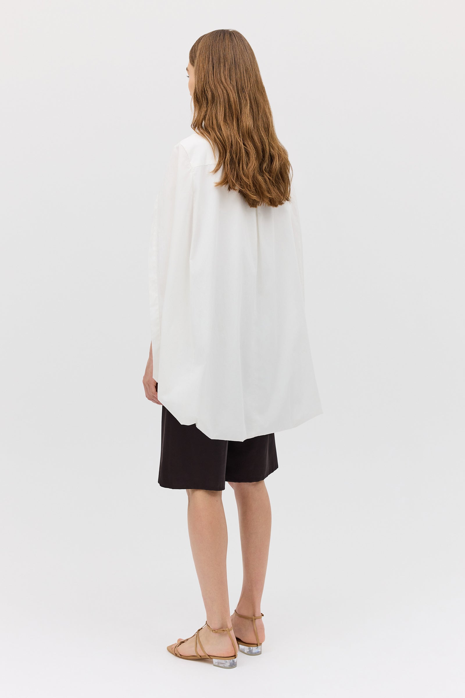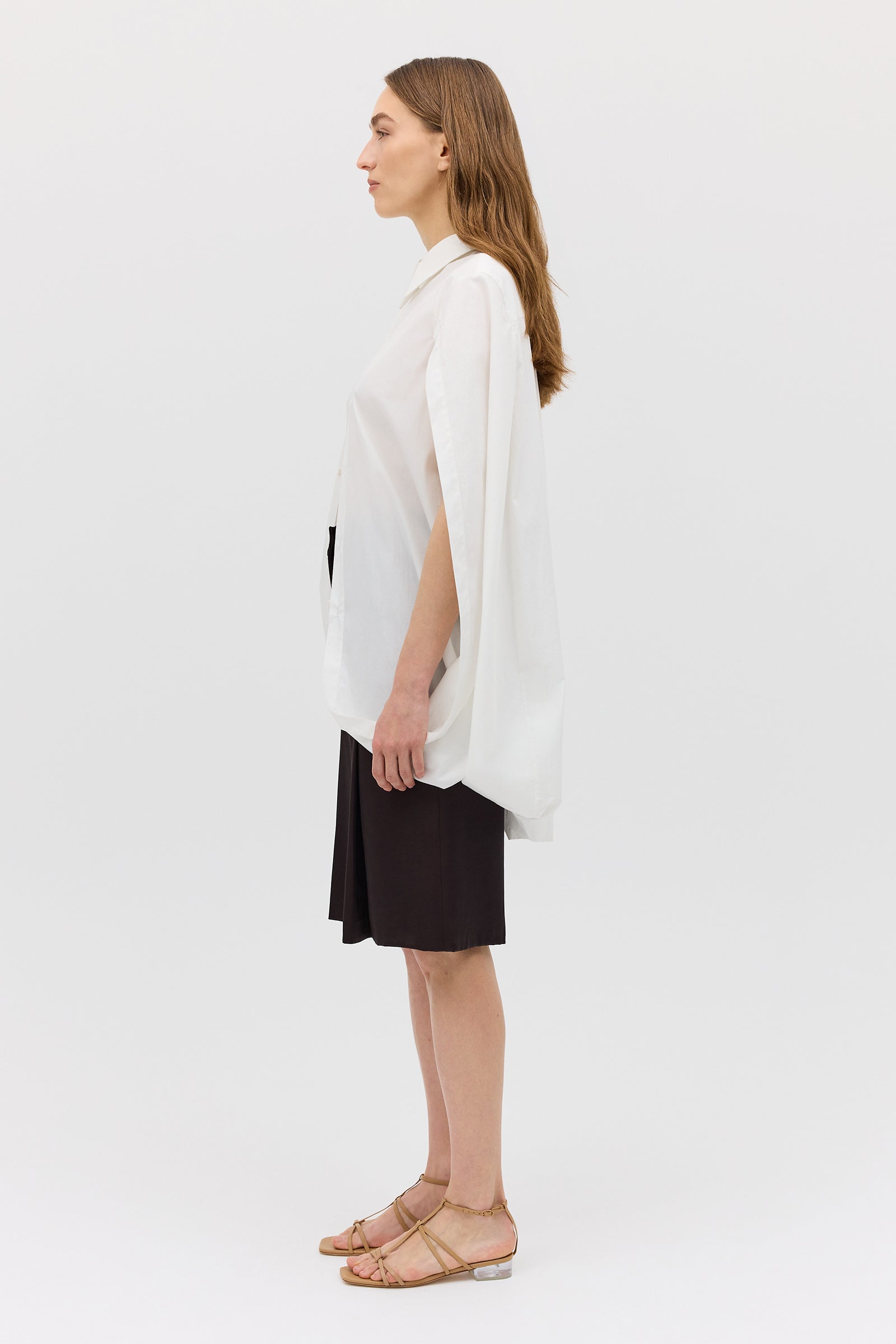 As seen on the AFW runway, the Abandon Shirt is a dramatic reimagining of classic shirting. Cut in crisp white cotton, this resort-ready piece features a structured lapel collar and flowing open sleeves that fall into soft cape-like panels.
