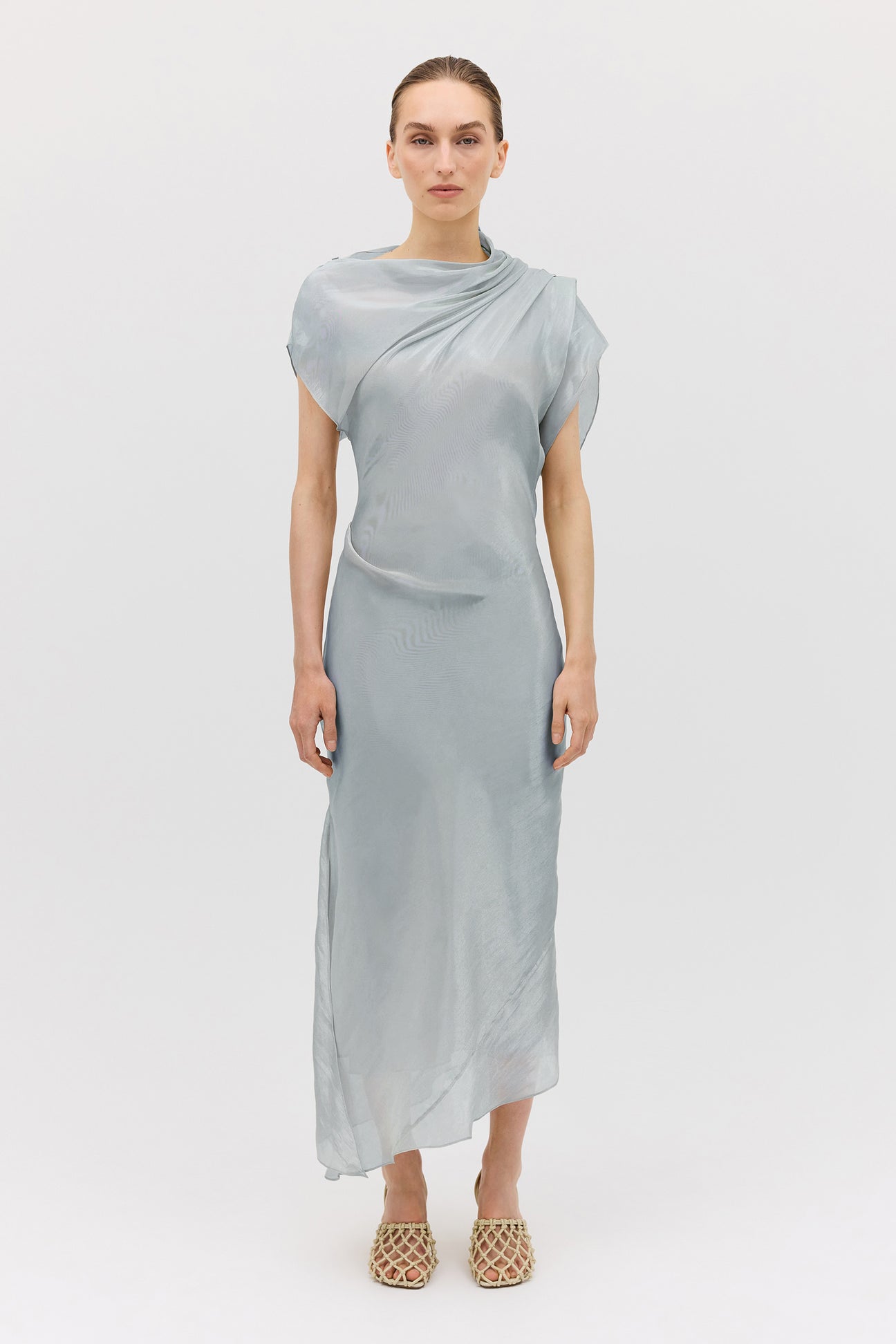 A signature silhouette reimagined for Resort 26, the Decode Dress returns in luminous blue liquid organza. Lightly structured yet fluid in motion, it reflects the collection’s sense of catharsis and release. Cut with Bianca Spender’s signature asymmetrical neckline, the shape drapes softly across the shoulder and contours the frame with ease. A draped sleeve detail adds sculptural dimension, while the subtle shimmer of organza catches the light from every angle.