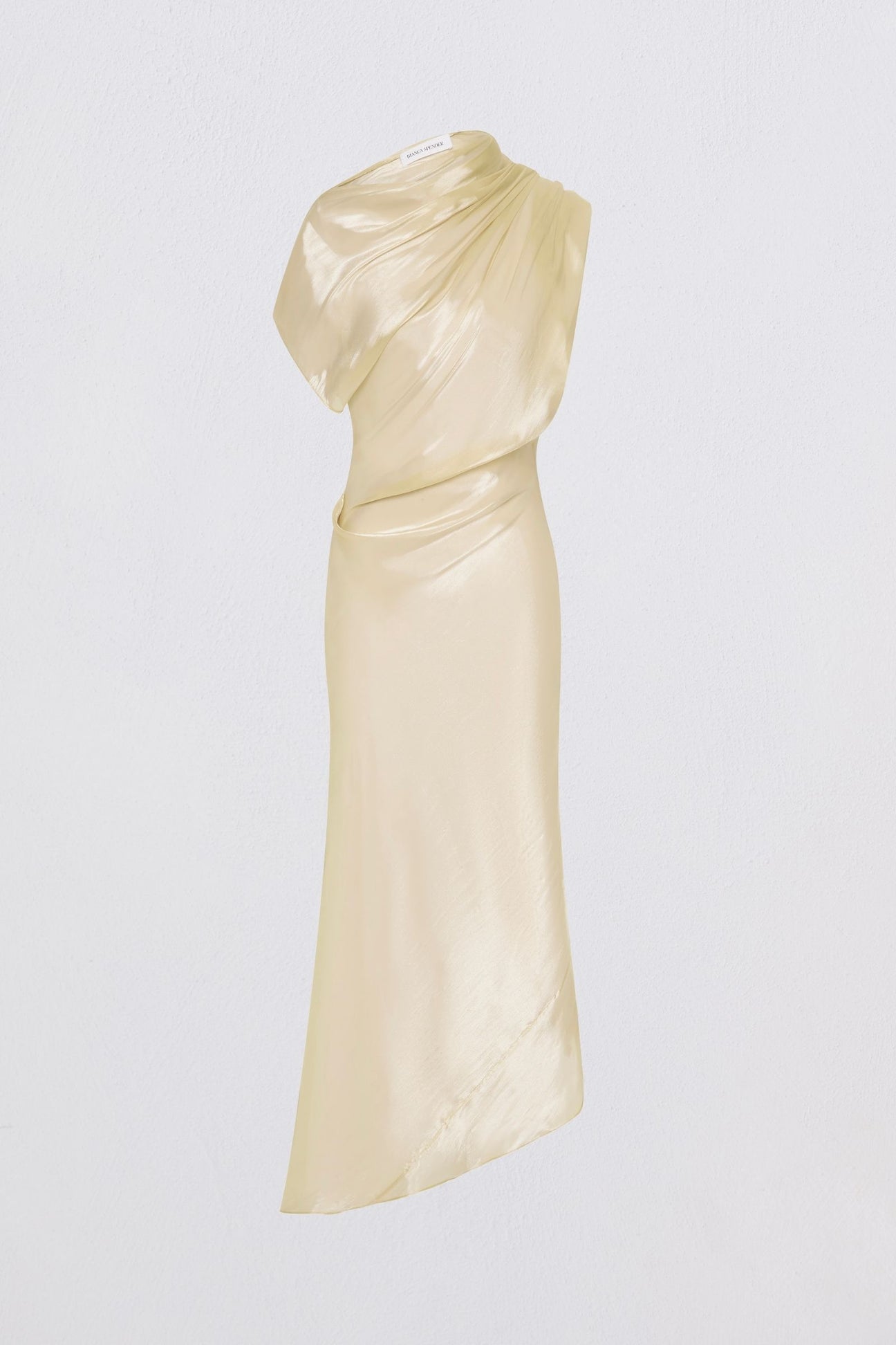 A signature silhouette, reinterpreted in a luminous new light. The Decode Dress returns in a fluid metallic organza, offering a soft shimmer and sculptural drape that glides with movement. Designed with an asymmetrical shoulder that can be adjusted for multi-way styling, this most-loved style is artfully constructed to contour the body with elegance and ease. A draped sleeve detail adds architectural volume, while an invisible zip ensures a seamless finish. A study in form and fluidity, this dress brings new dimension to occasion wear.