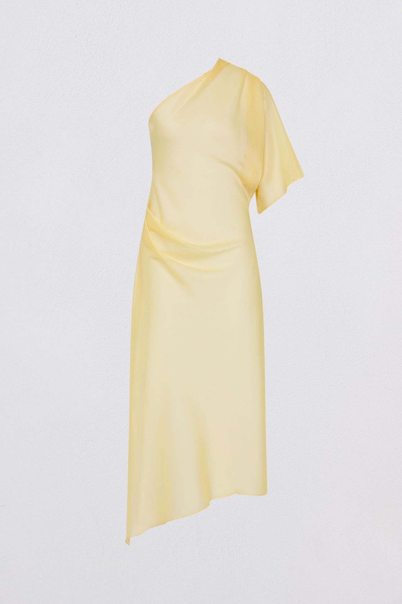 A best-selling silhouette returns in a new sunlit hue. The Valencia Dress is cut from luminous lemon chiffon, its surface gently catching the light to reveal the movement of each draped fold. Designed with an asymmetrical neckline and softly gathered side seam, it balances structure and softness with effortless grace.